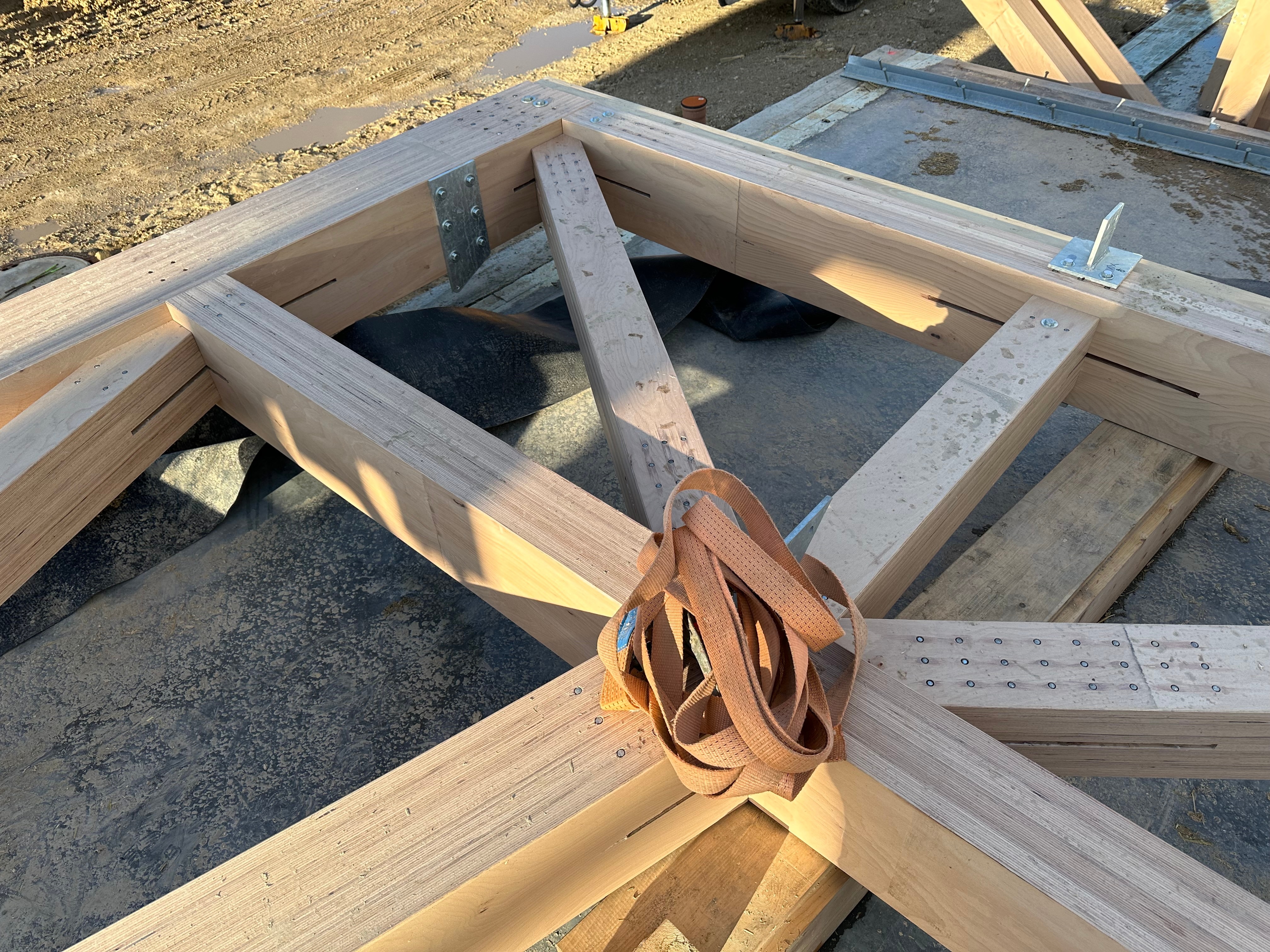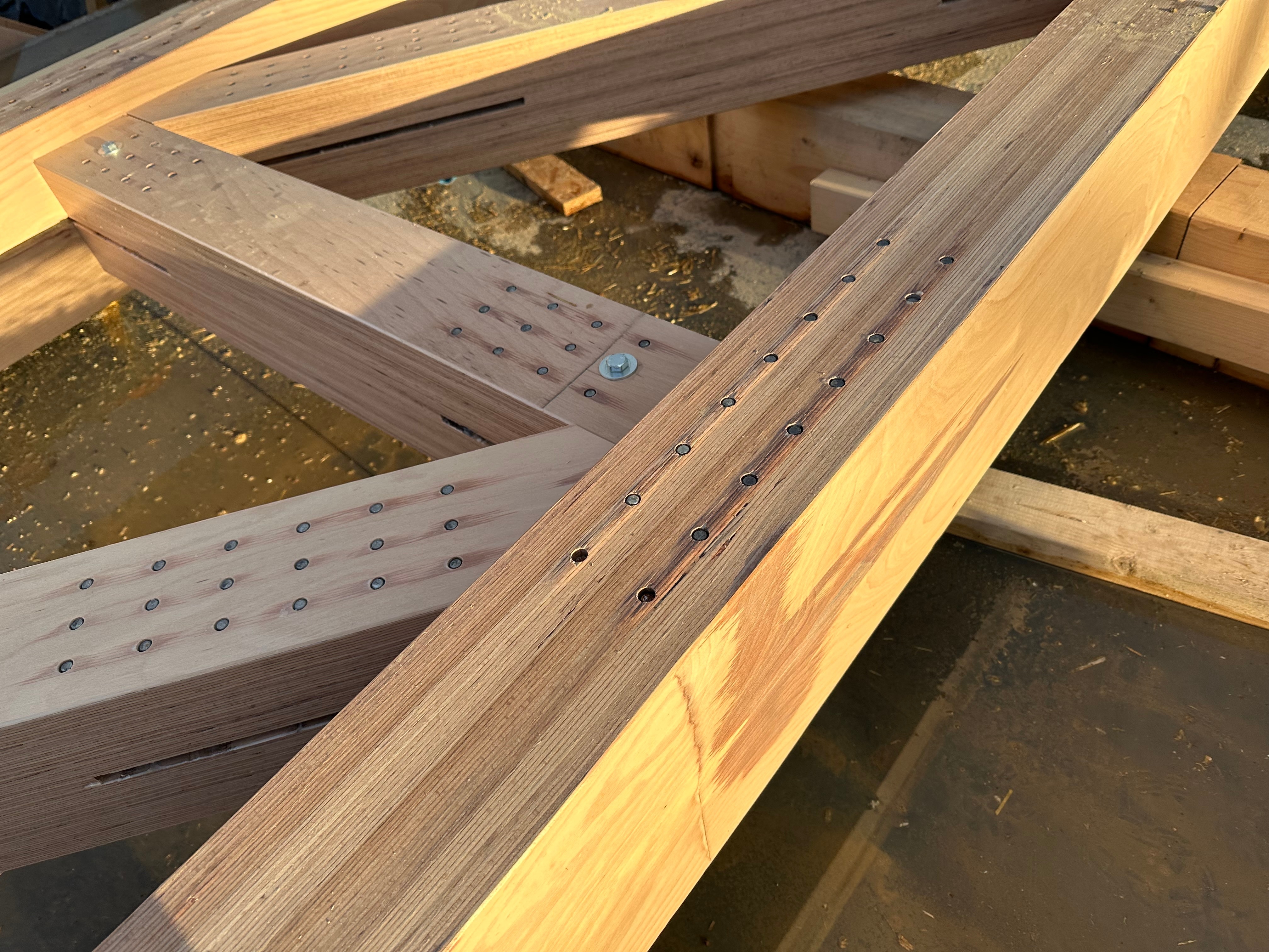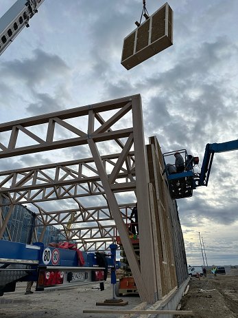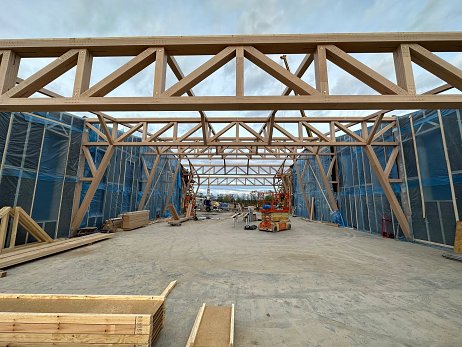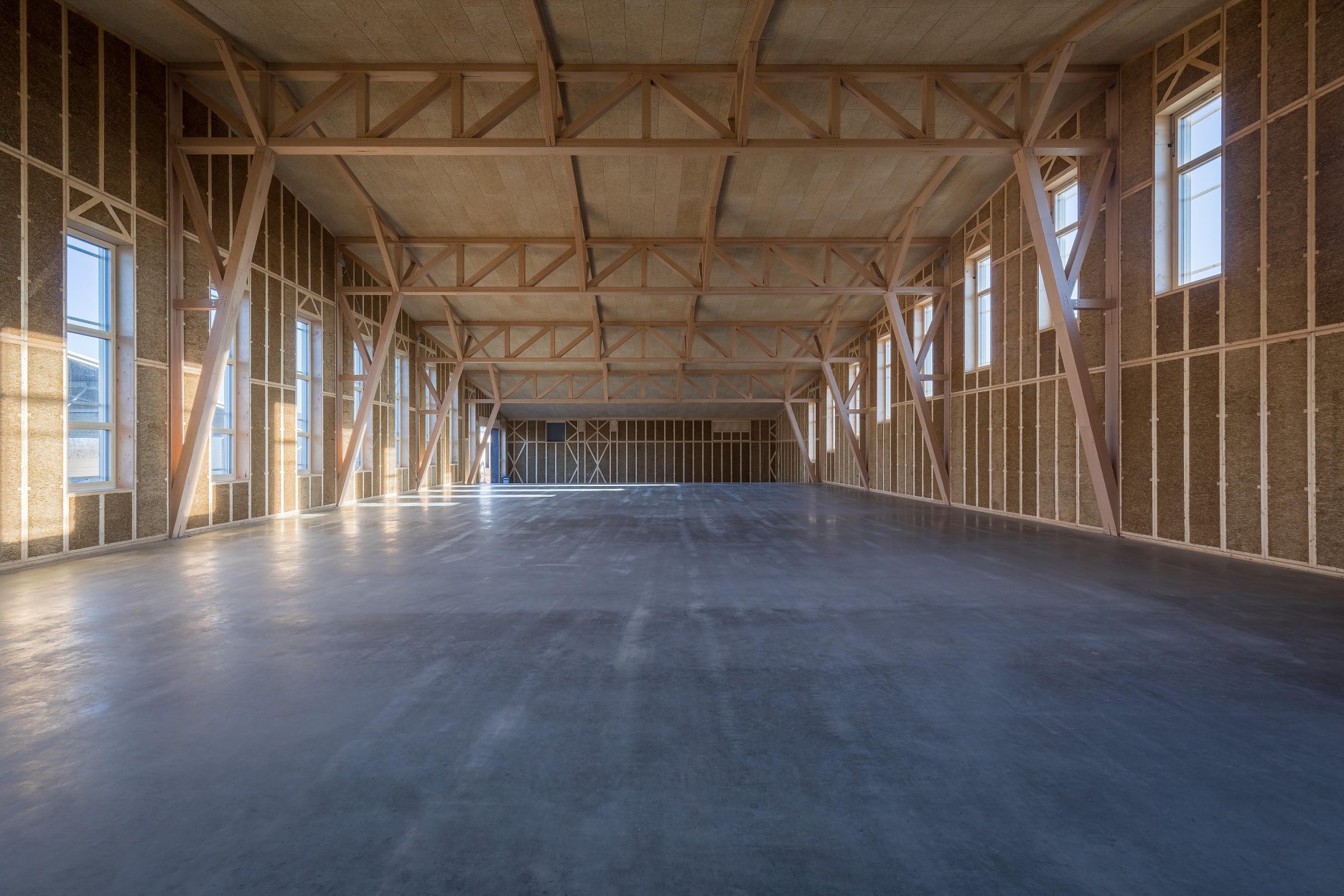 Nosnú konštrukciu haly tvorí rámová sústava z tvrdého vrstveného dreva Baubuche. Rámové nosníky s tuhými rohmi zabezpečujú stabilitu a umožňujú veľkorysé rozpätia bez potreby vnútorných podpier.