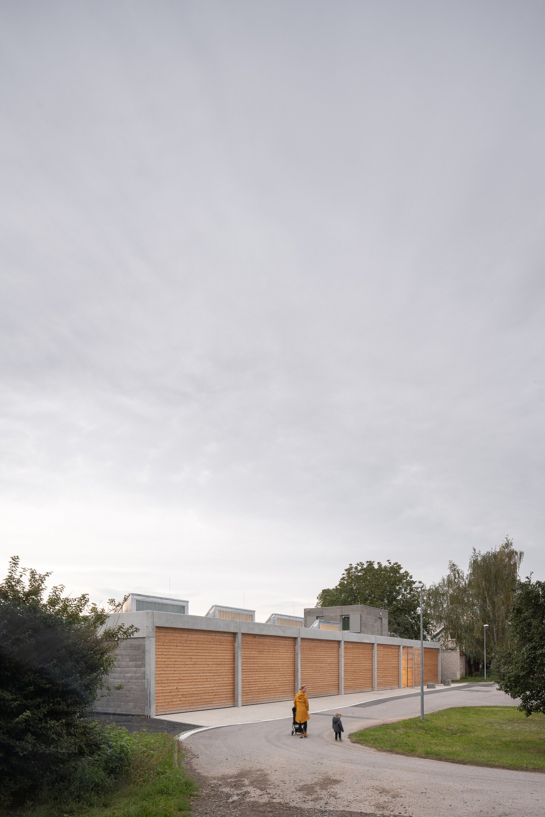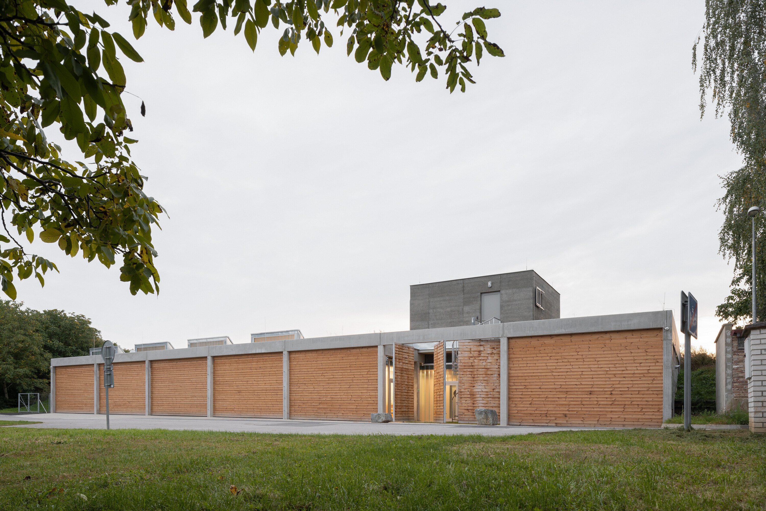 Přirozenému usazení do okolí pomáháme zapuštěním nízké hmoty do svahu. Vztah s okolní obytnou zástavbou navazujeme rytmizací fasád a použitím dřeva na hlavním průčelí. Jeho klidná plocha ožívá při provozu, kdy tep otvírání a zavírání jednotlivých modulů dává stavbě jedinečnou dynamiku.