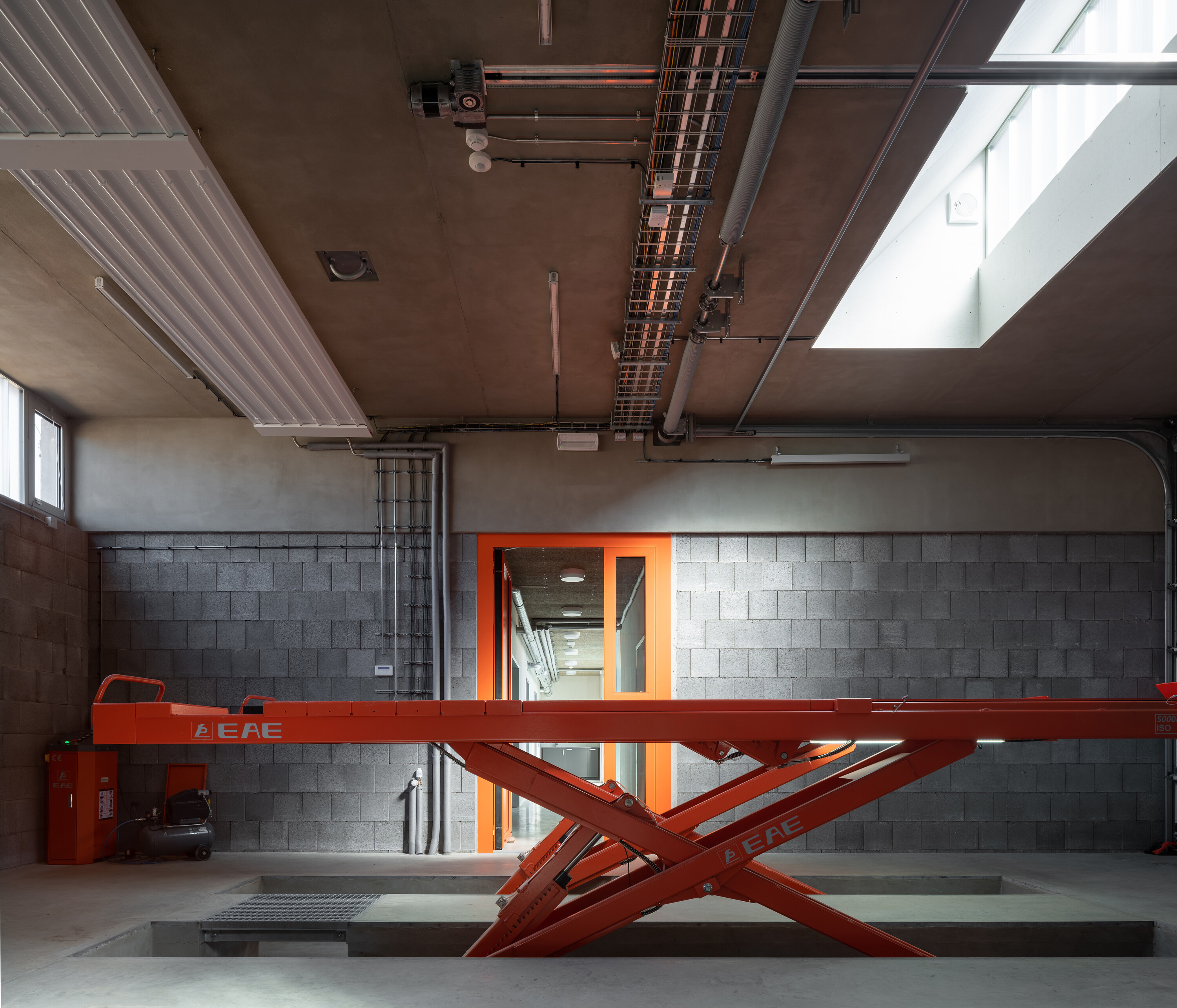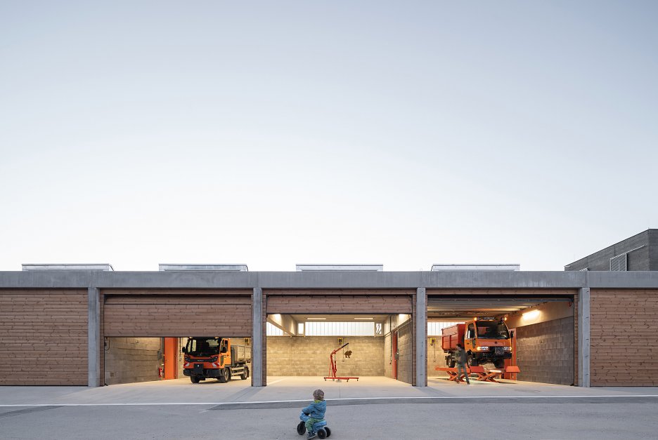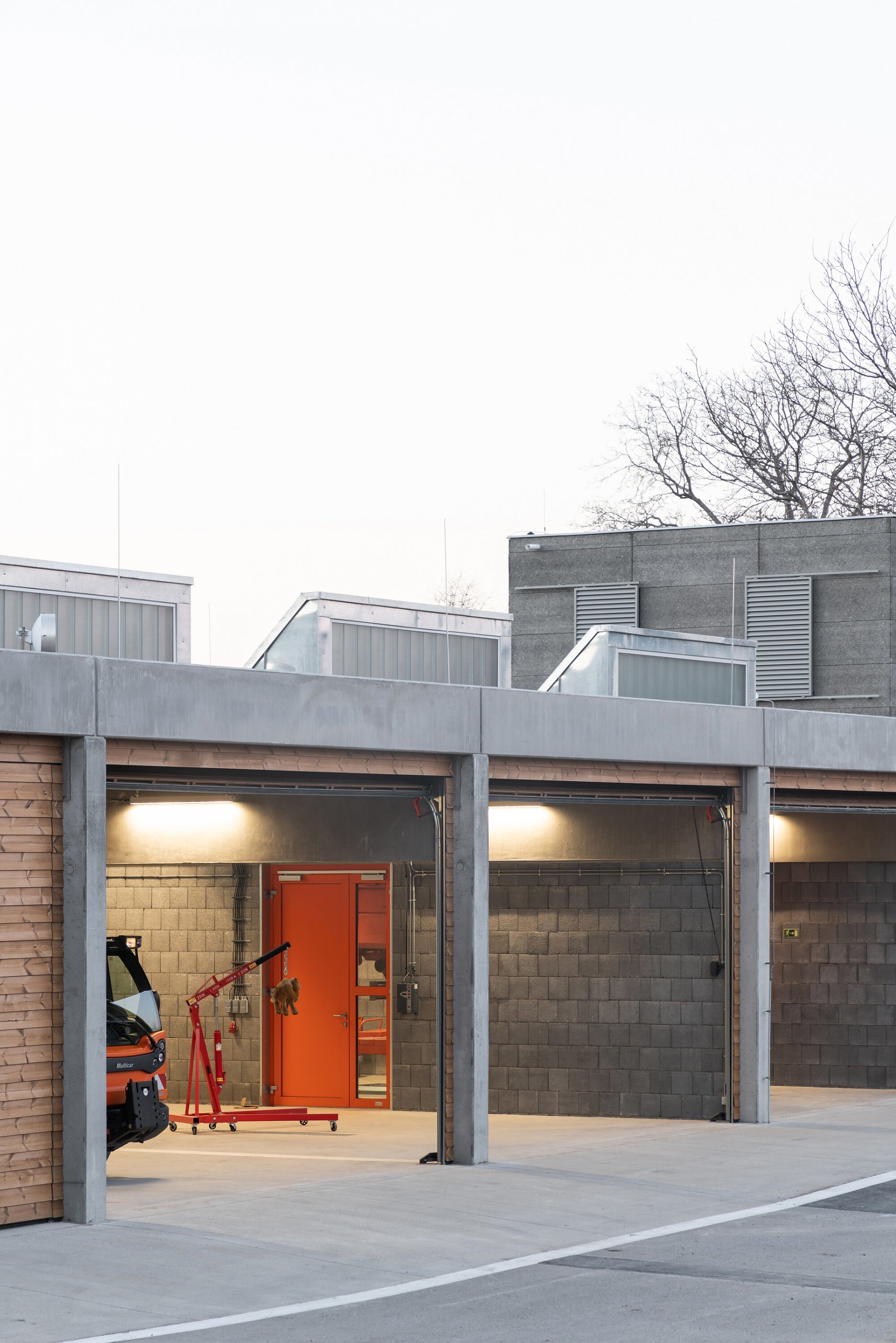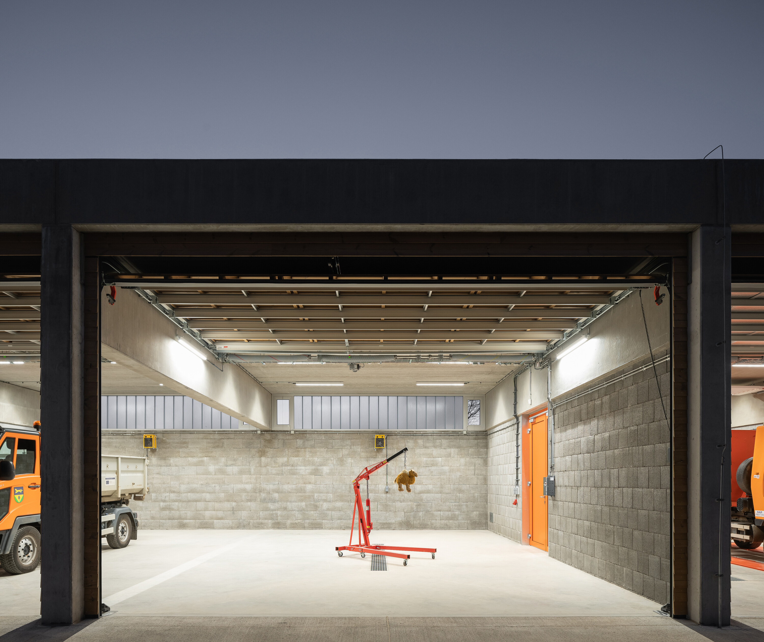 Větší technická část obsahuje garáže pro vozidla údržby, autodílnu, sklad materiálu a krytou deponii.