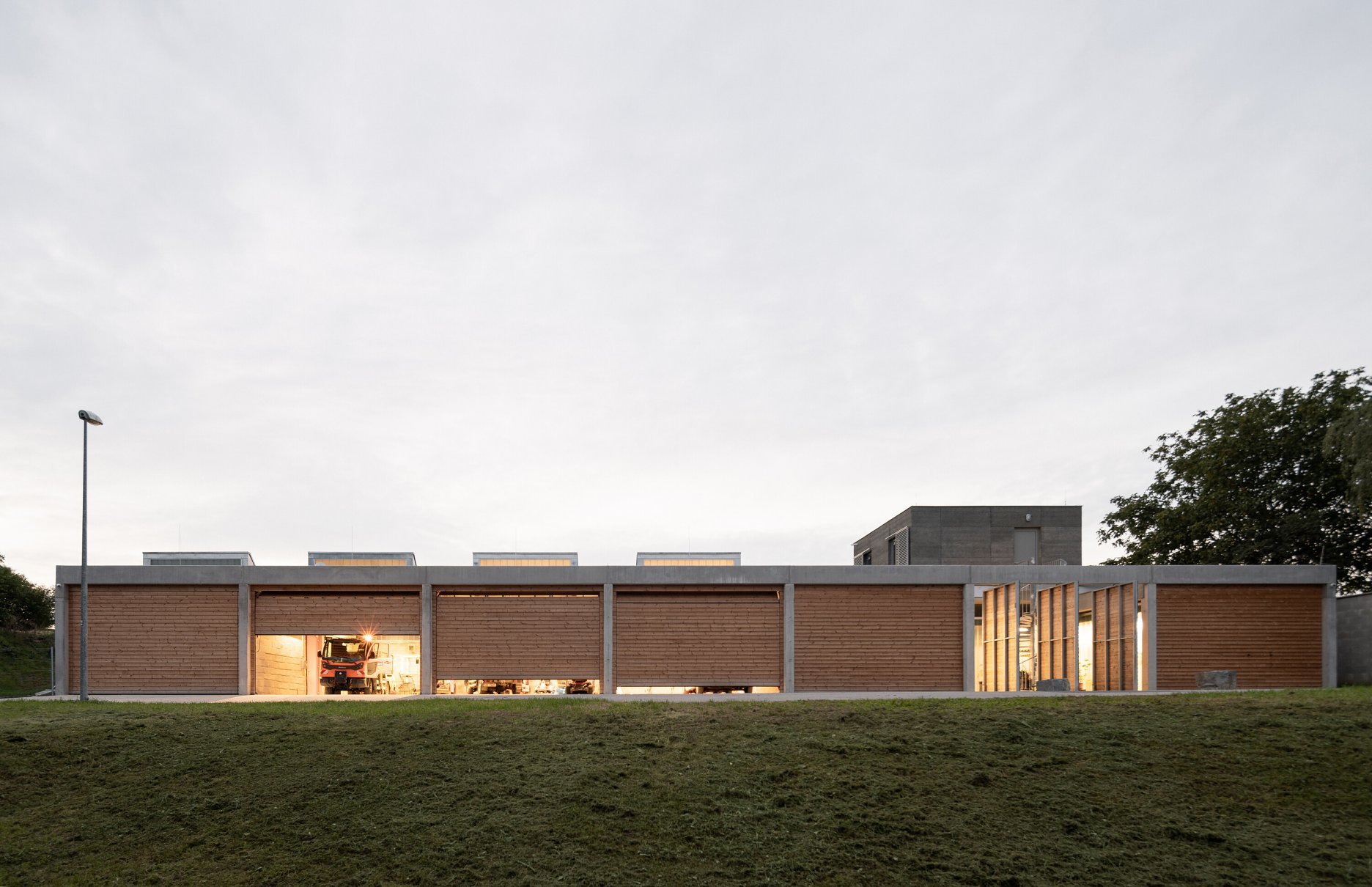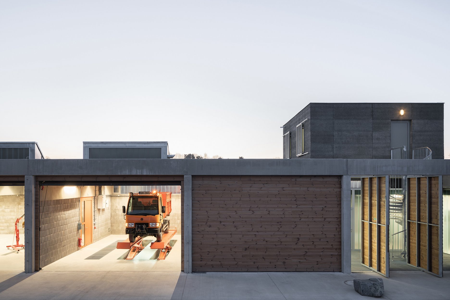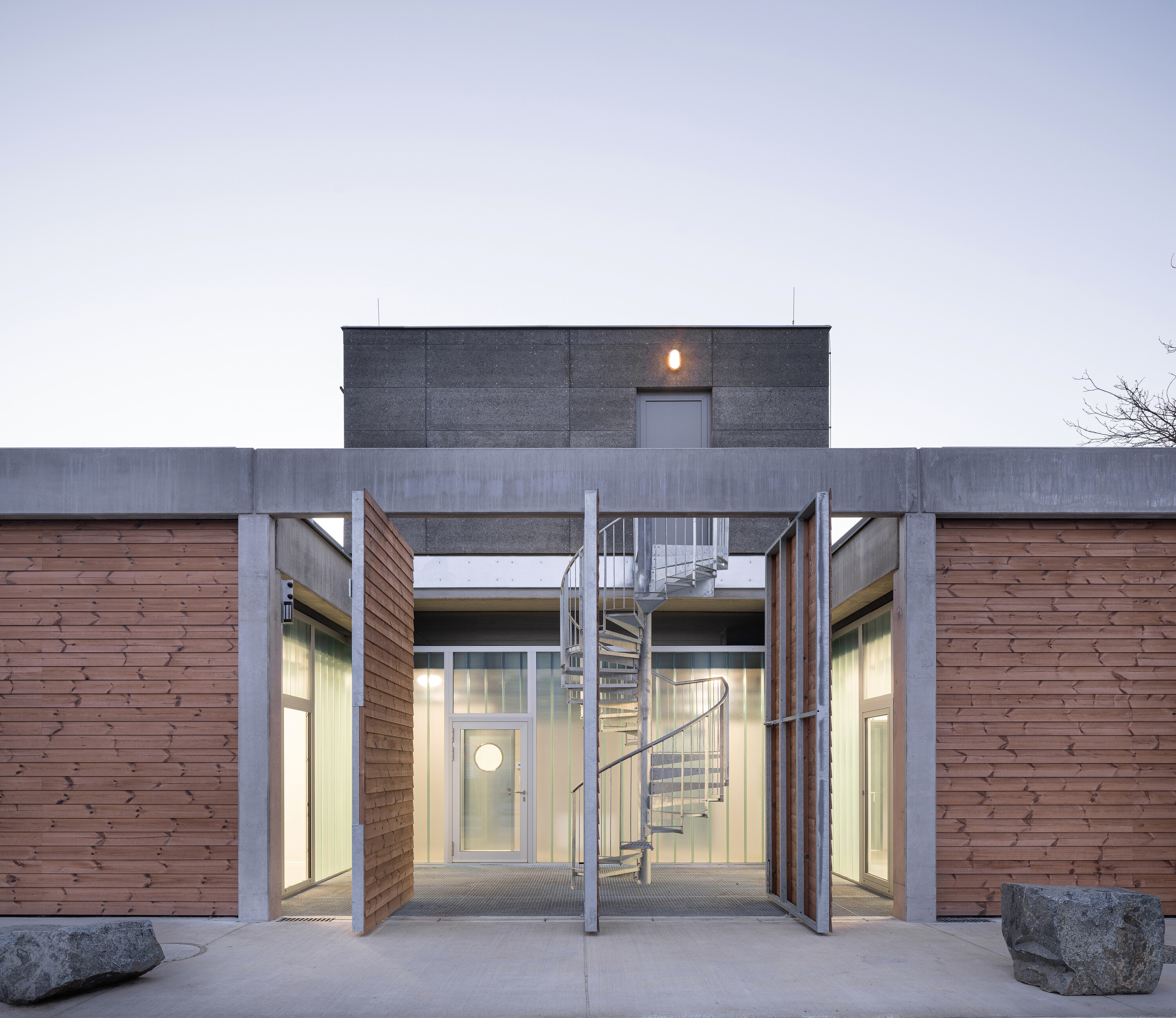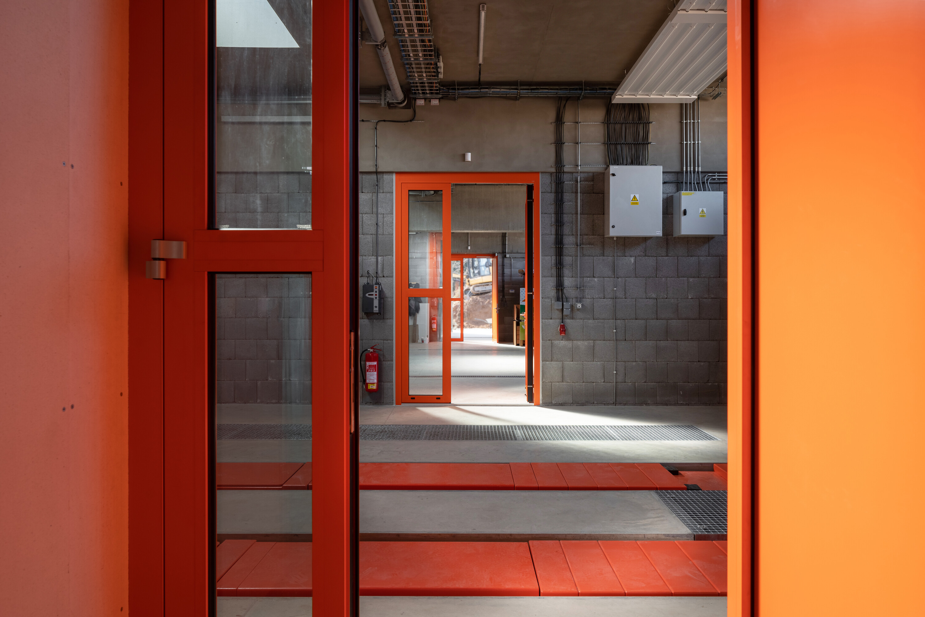 Menší část pro posádku má výrazně odlišné nároky na velikost místností, prosvětlení, akustiku, vnitřní teplotu i výraz. Proto jsme ji koncipovali jako nezávislou vloženou krabičku z lehké montované ocelové konstrukce v pasivním tepelném standardu. Ukrývá v sobě šatny se zázemím, dílnu, kancelář, teplé sklady a společenskou místnost, která slouží i při nočních směnách sněhové pohotovosti.