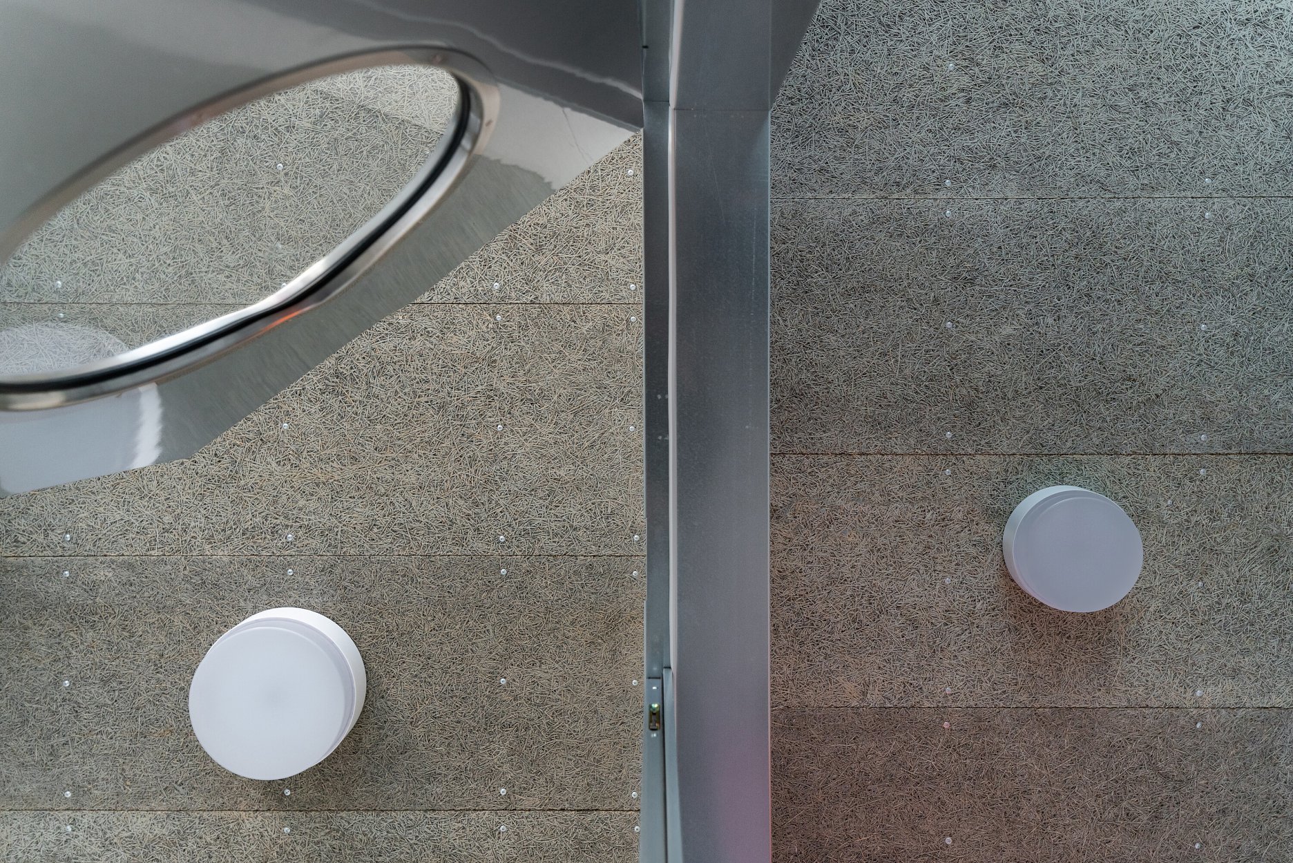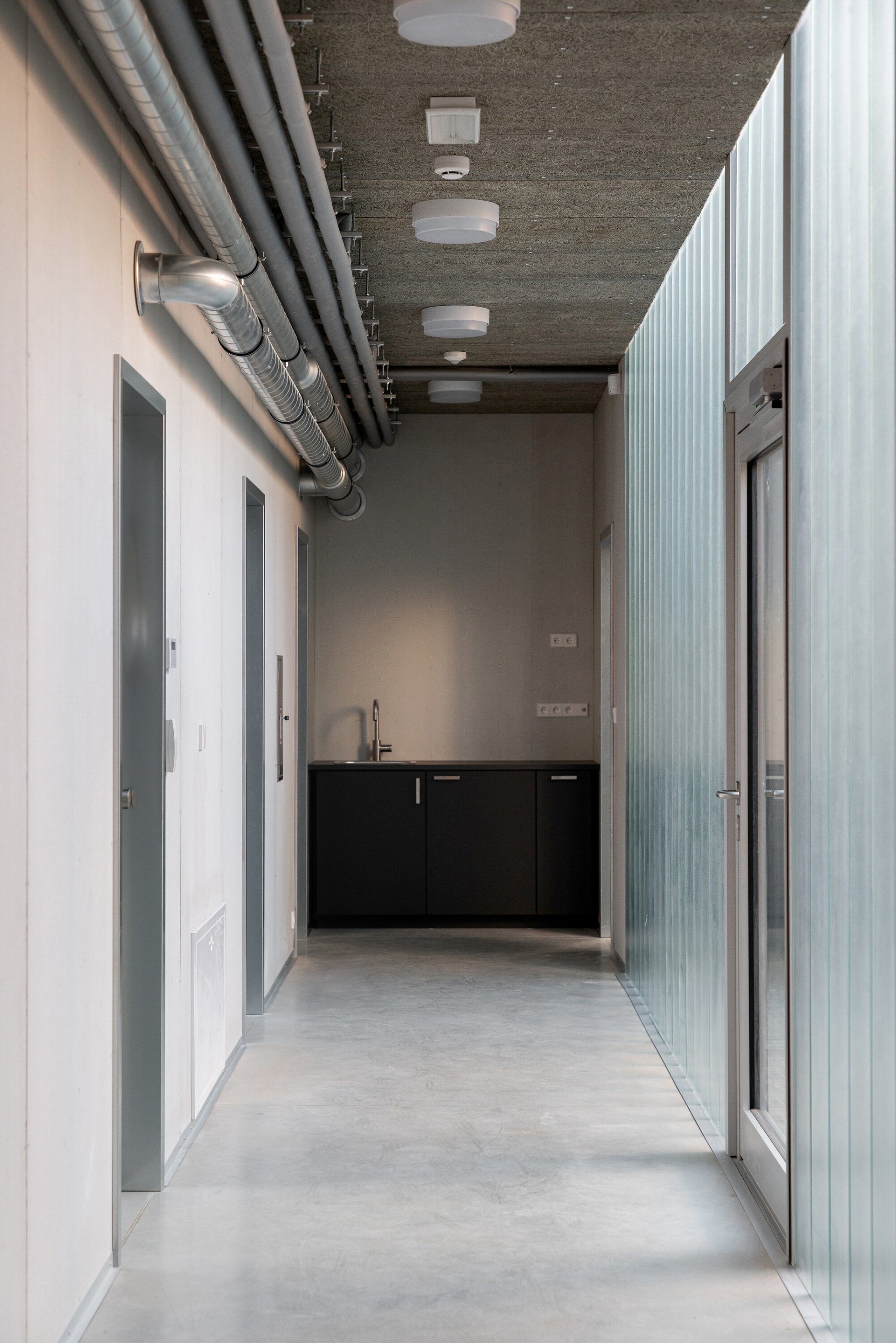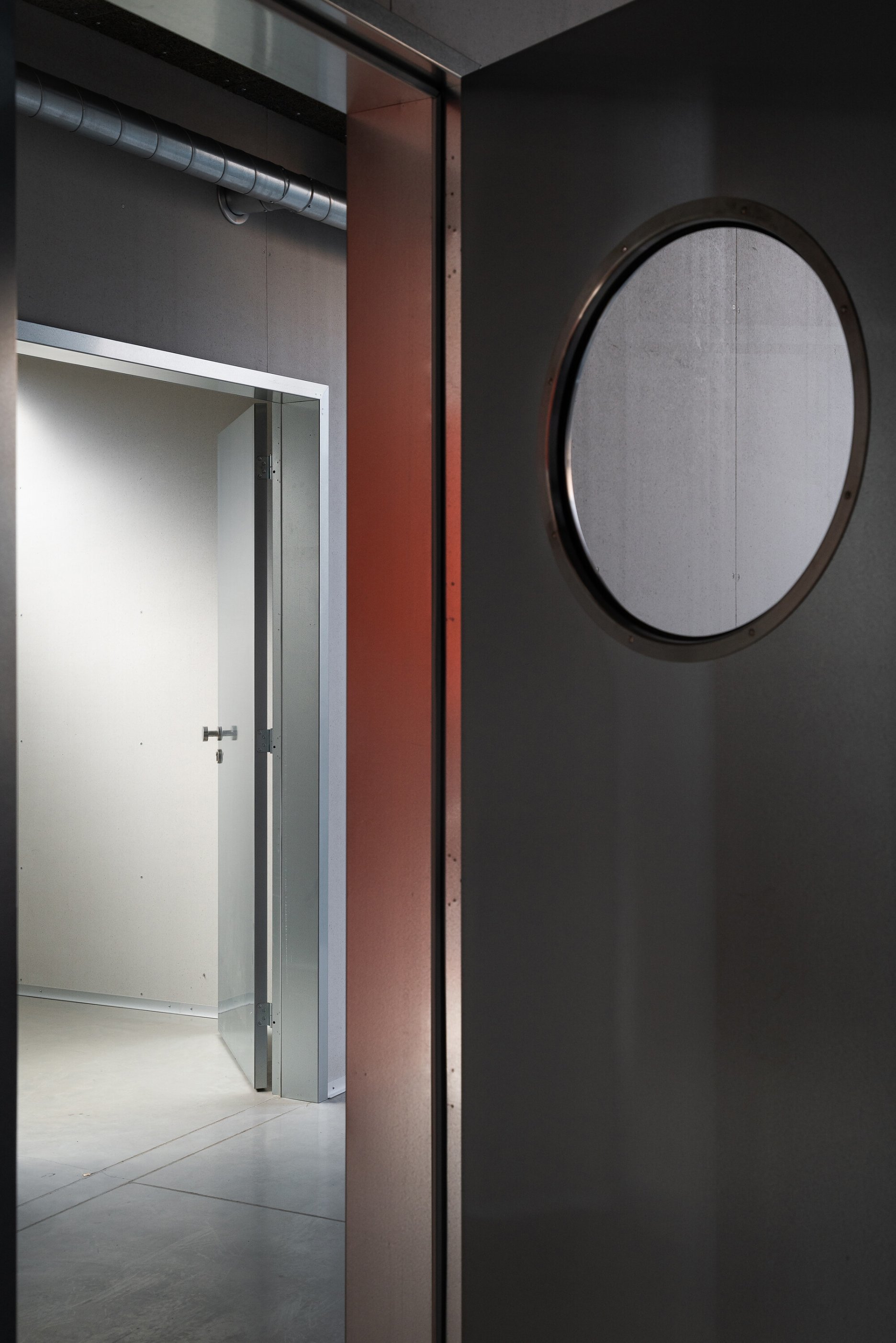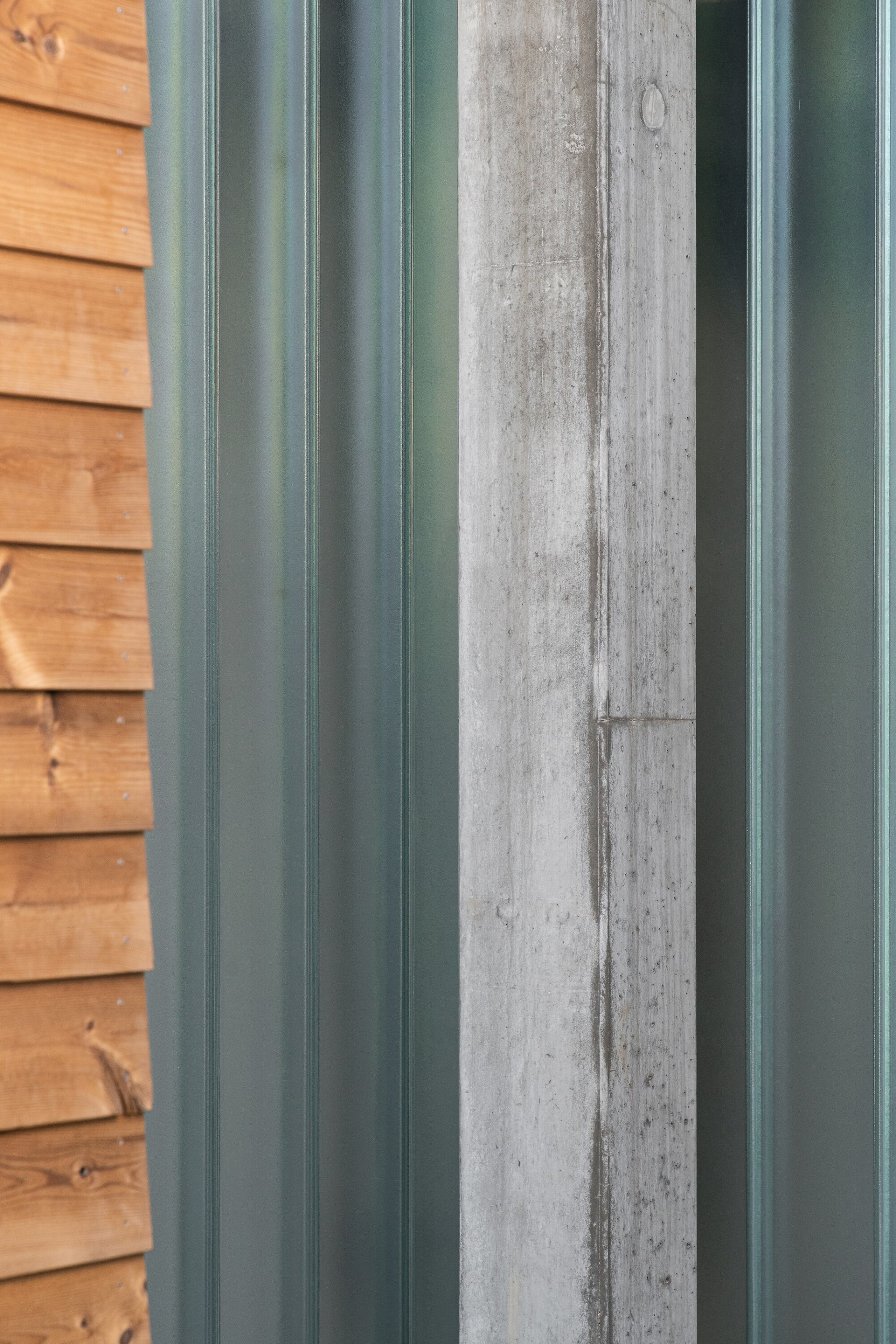 Menší část pro posádku má výrazně odlišné nároky na velikost místností, prosvětlení, akustiku, vnitřní teplotu i výraz. Proto jsme ji koncipovali jako nezávislou vloženou krabičku z lehké montované ocelové konstrukce v pasivním tepelném standardu. Ukrývá v sobě šatny se zázemím, dílnu, kancelář, teplé sklady a společenskou místnost, která slouží i při nočních směnách sněhové pohotovosti.
