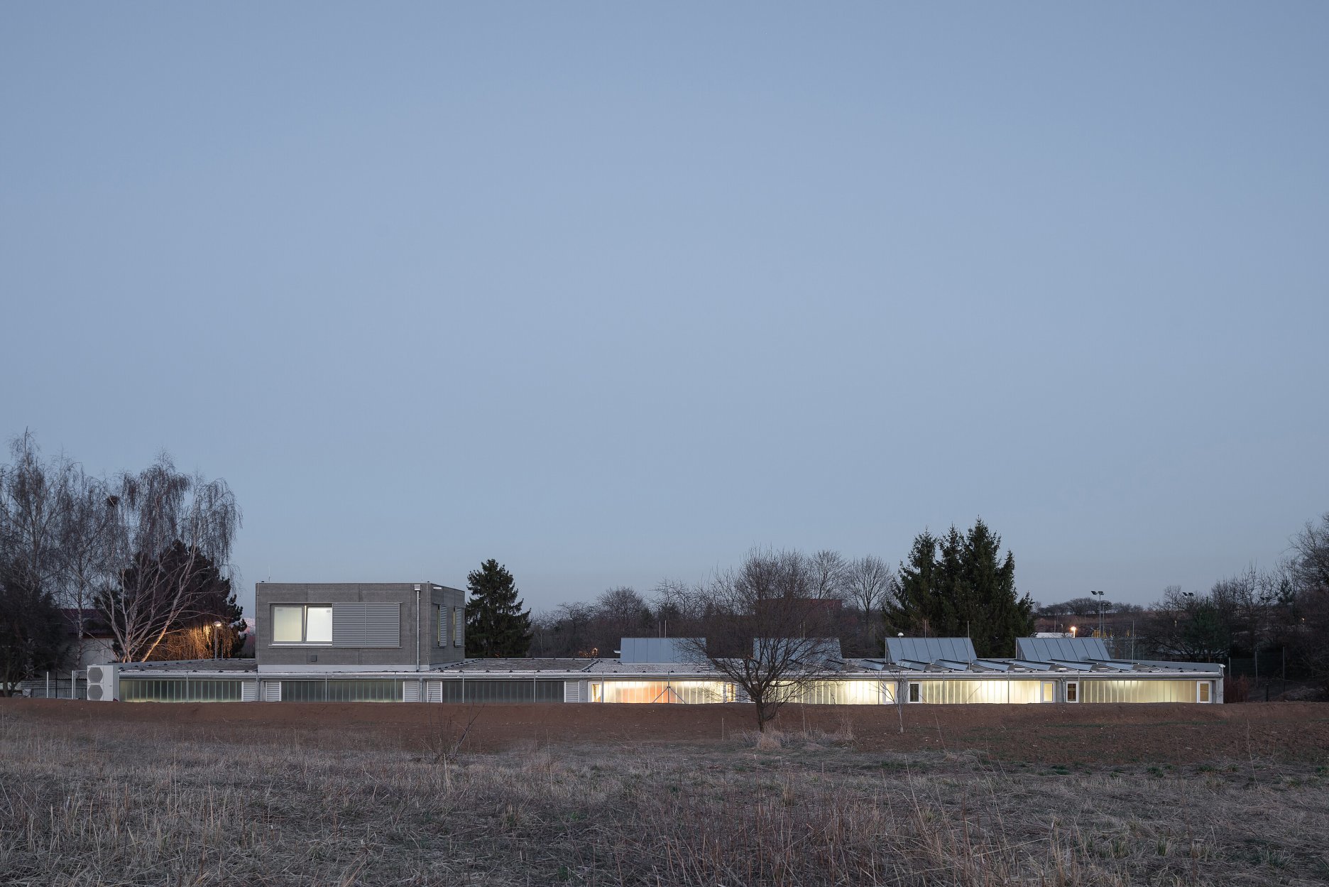 Lehkou konstrukci jsme využili i pro samostatný objem bytu správce ve druhém podlaží, který je i rezervou do budoucna a je možné ho rozšířit nad sousední moduly.