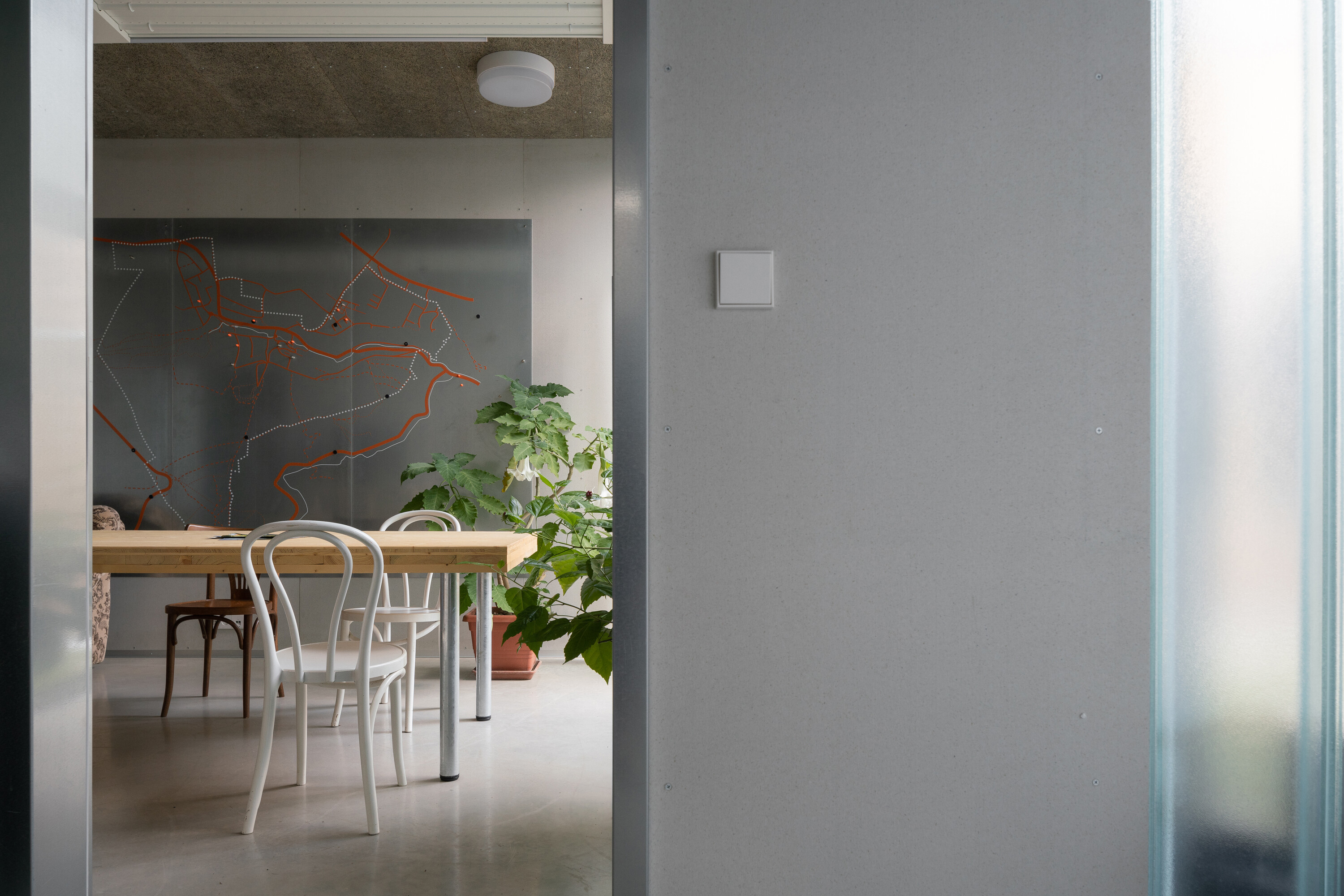 Použití přiznaných konstrukcí a pohledových materiálů bez dalších krycích vrstev podtrhuje celkovou autentickou výpověď.
