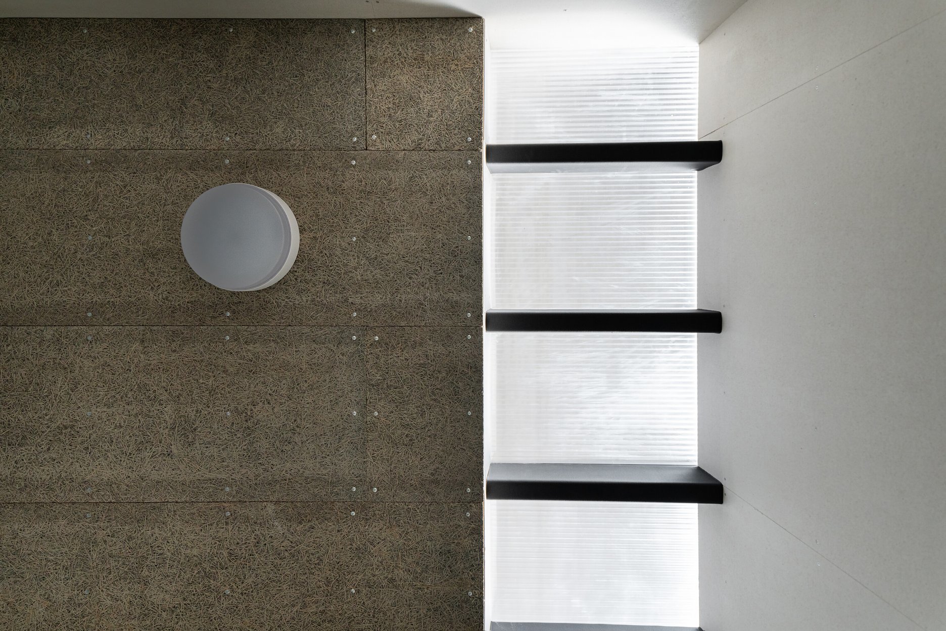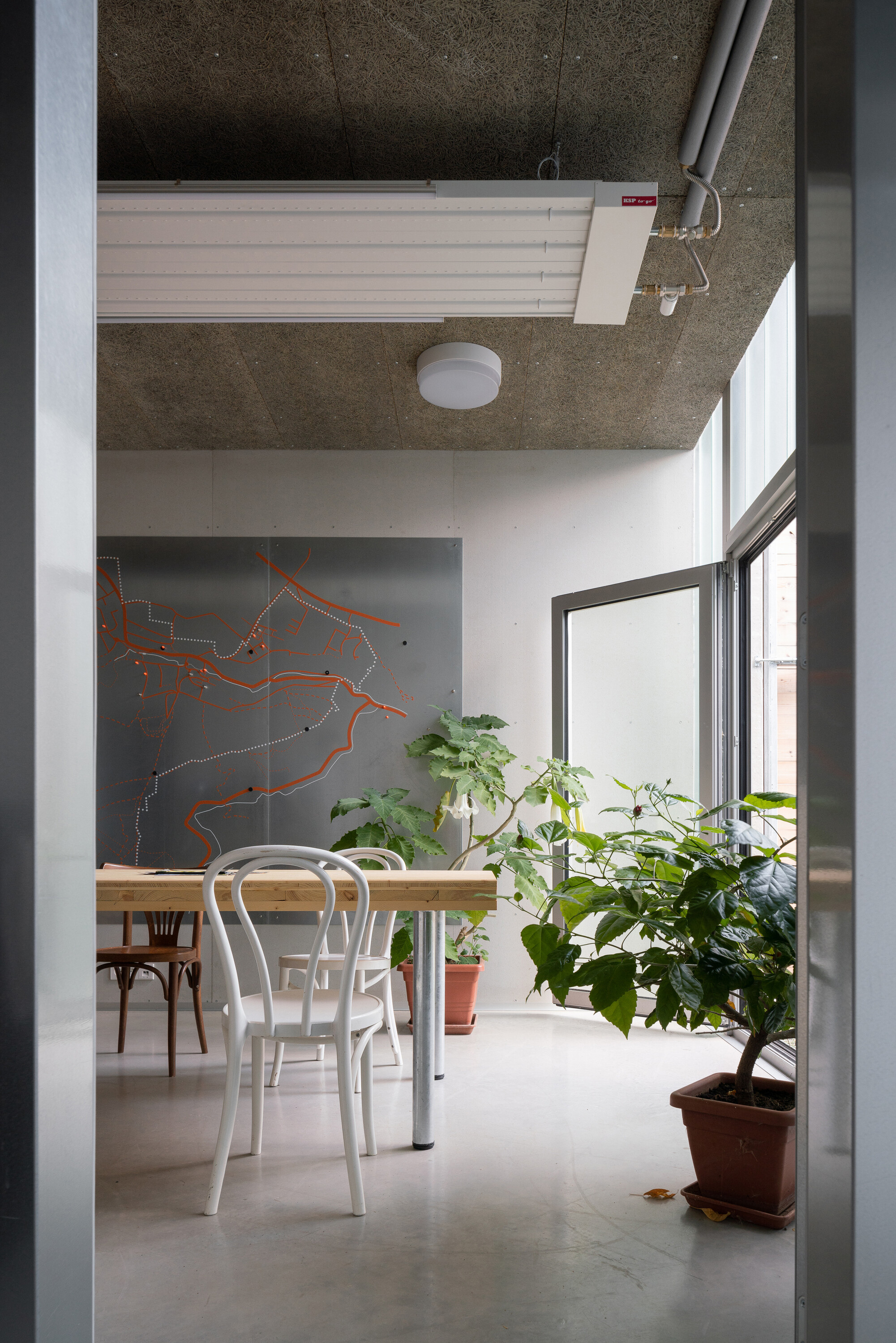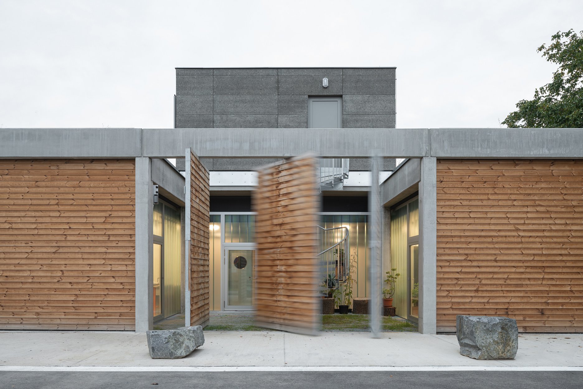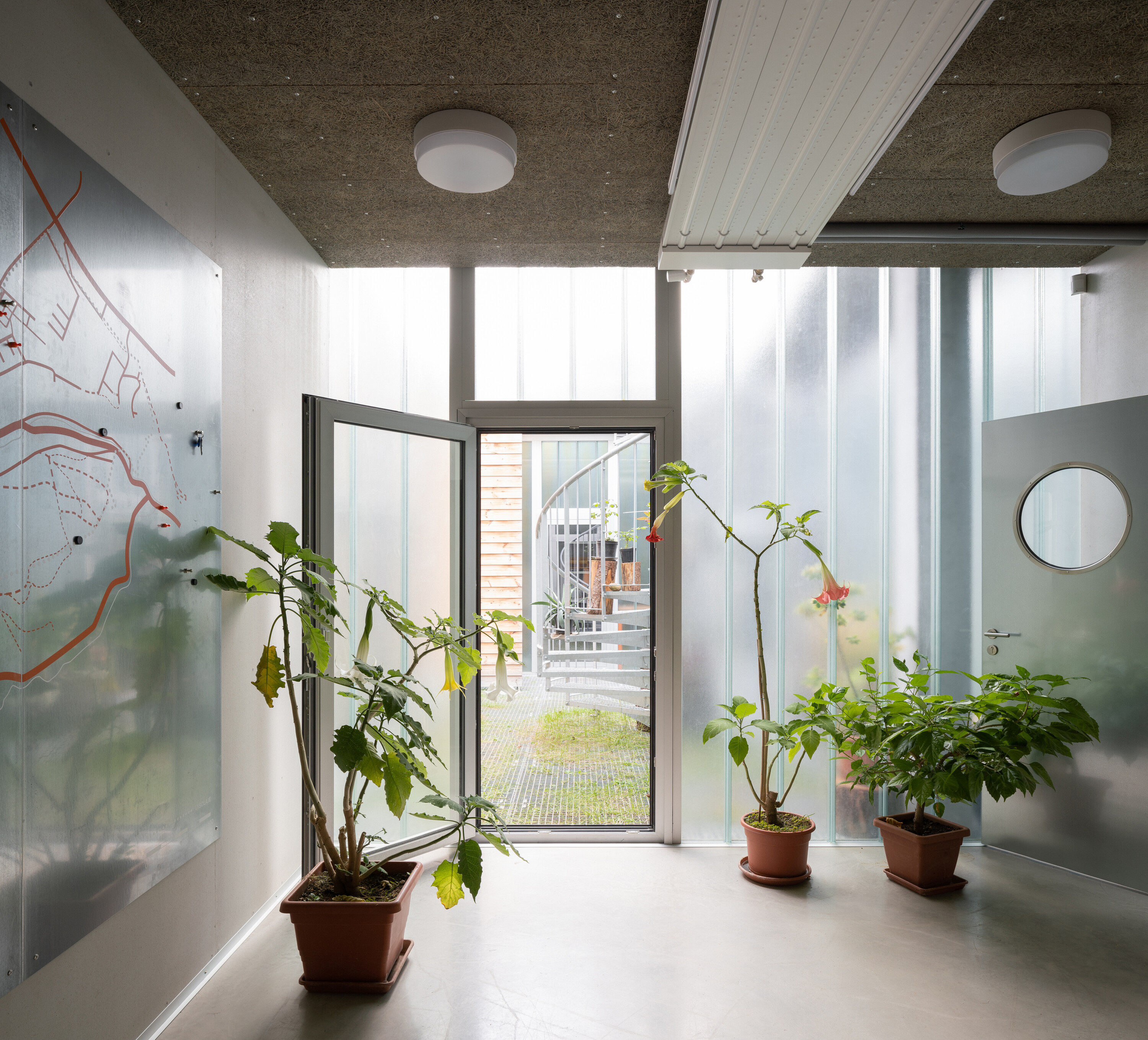 Zásadní roli ve fungování domu hraje prostorové nic - vstupní atrium. Slouží jako propojka s ulicí, hlavní vstup a komunikační uzel, jehož míru otevřenosti lze nastavit velkými otočnými žábrami. Jeho plášť ze skleněných tvarovek prosvětluje interiér jemným rozptýleným světlem. Je to polosoukromé místo setkávání, kde prší, roste tráva a pěstují se rajčata.