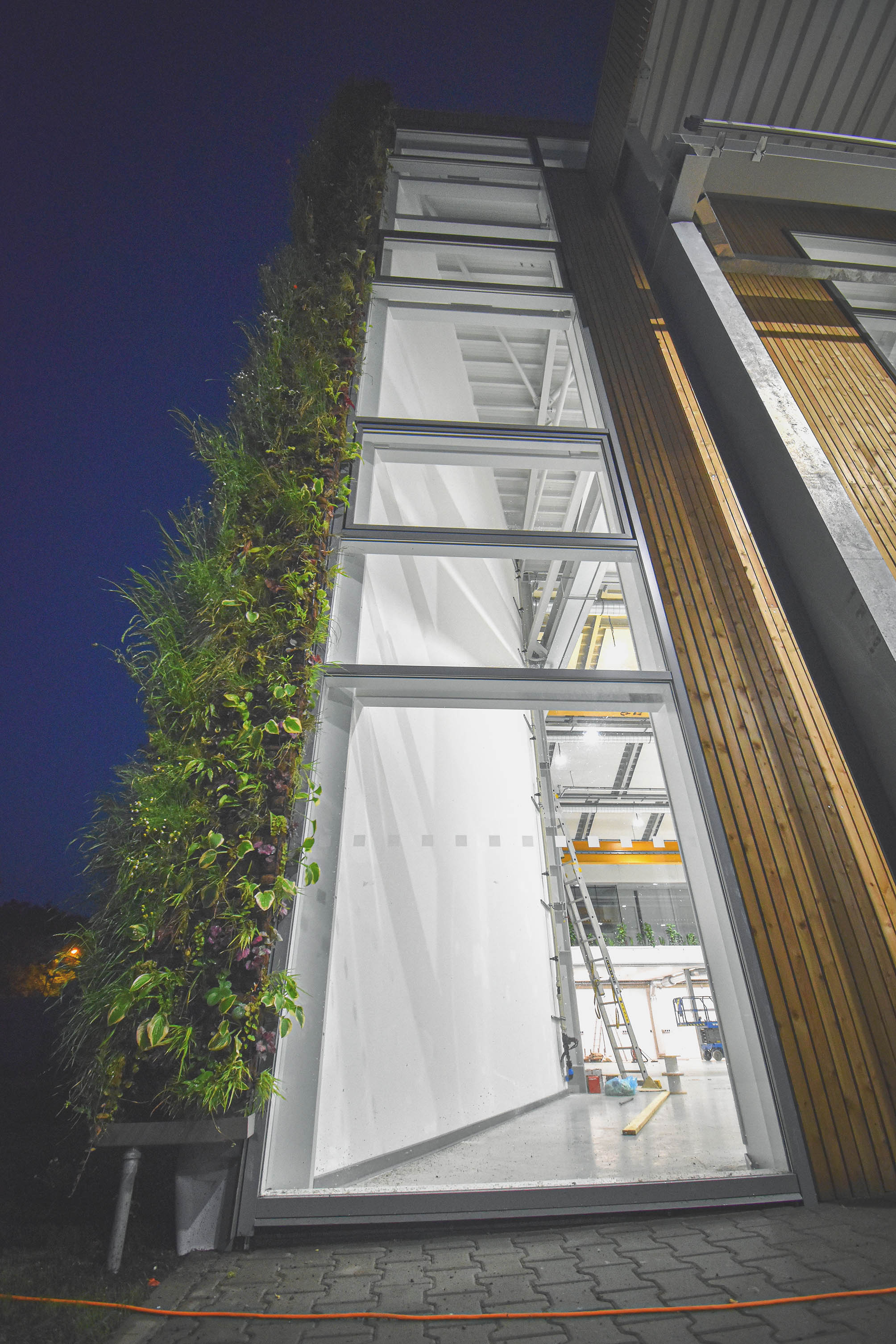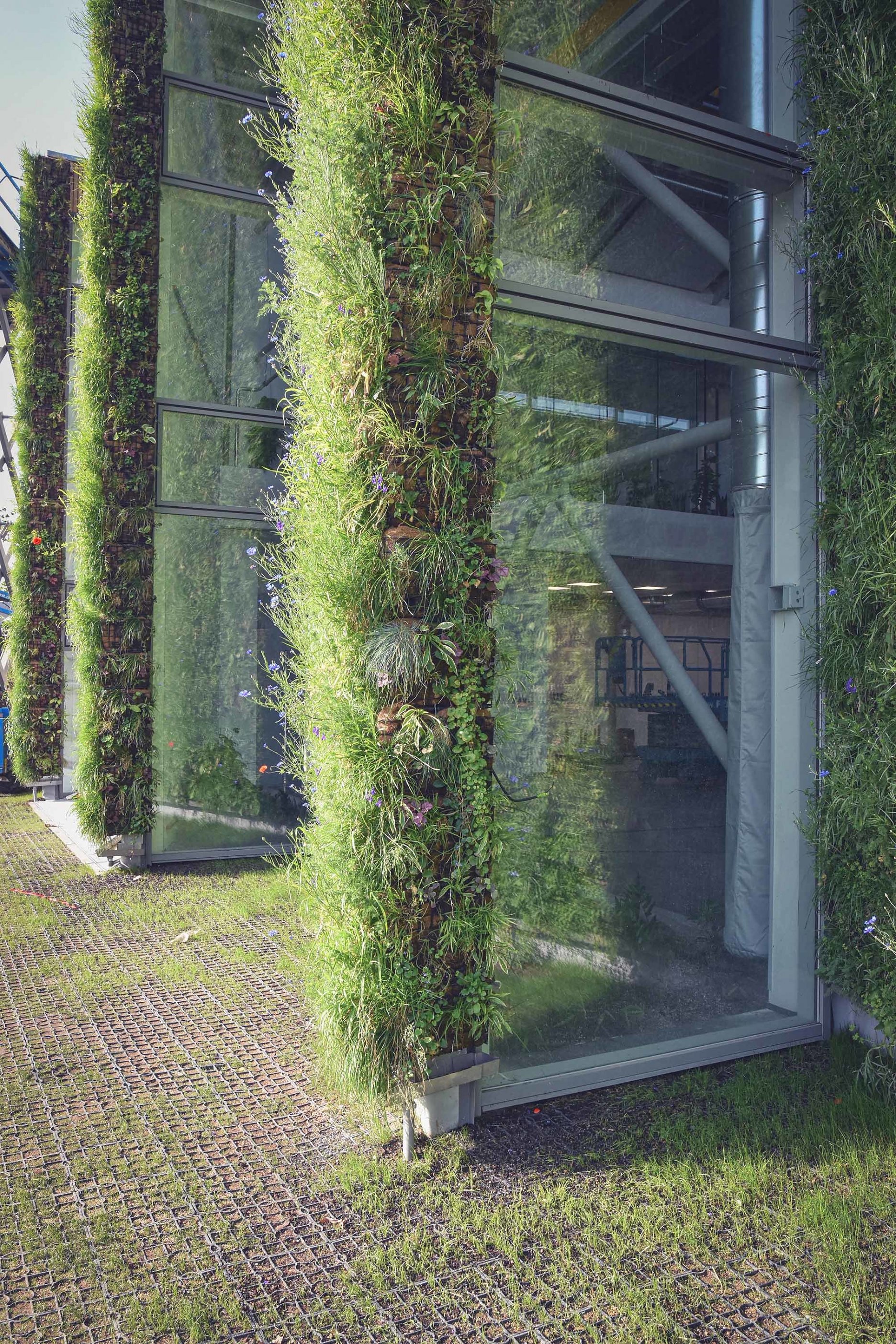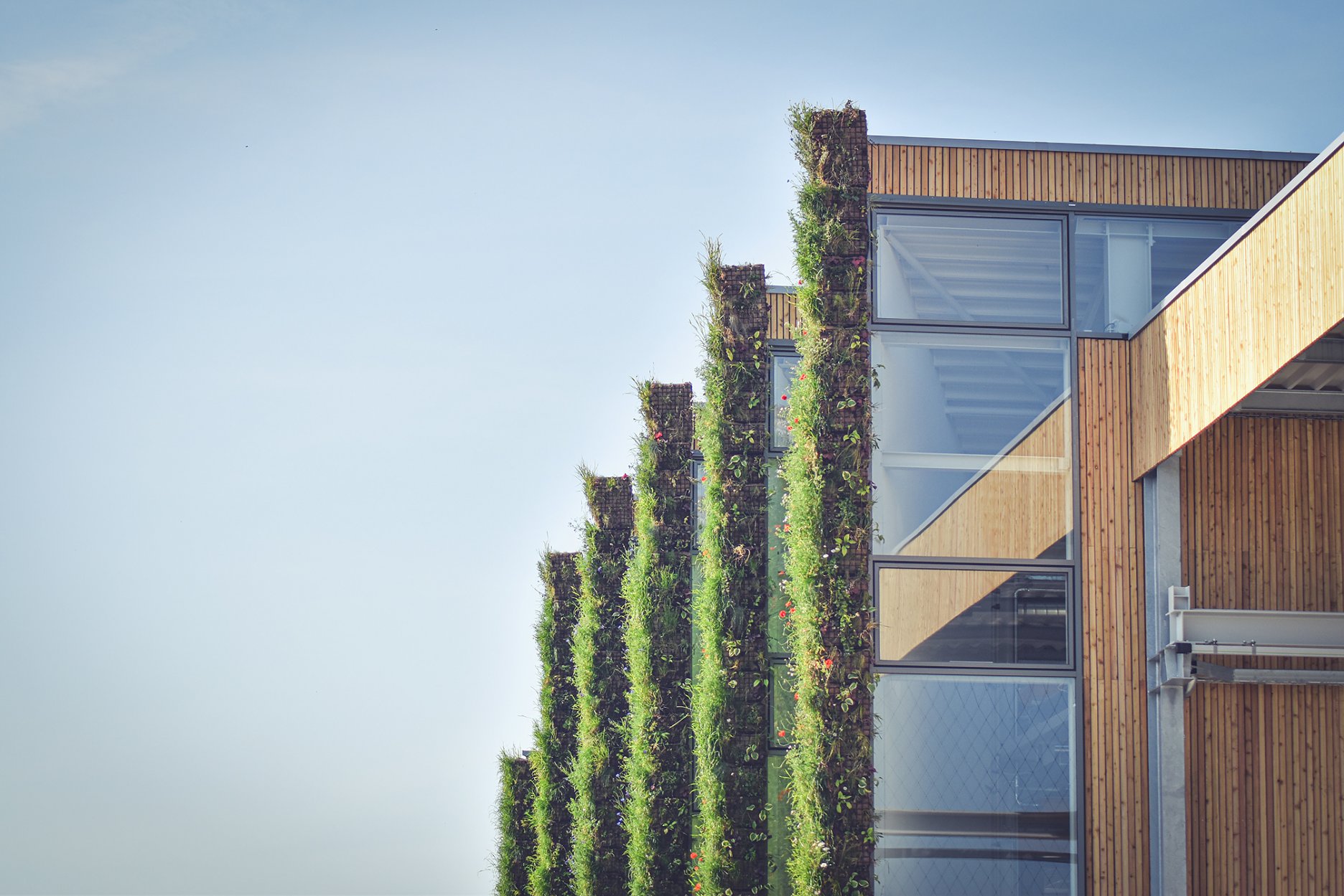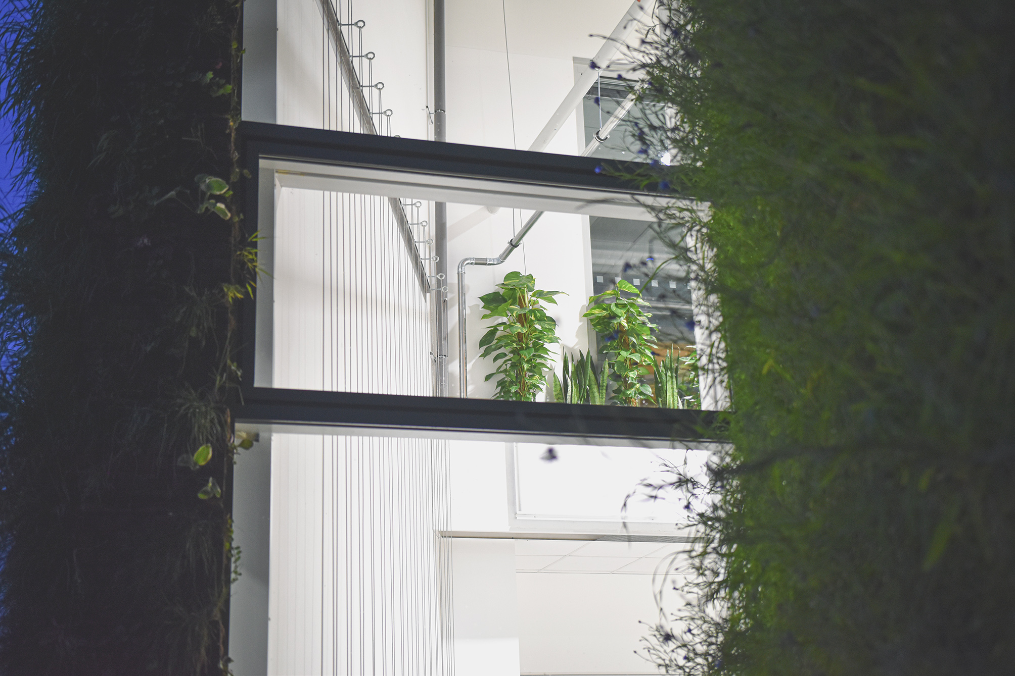 Prelamované steny porastené zeleňou strieda veľkoformátové zasklenie. Severná orientácia rozsiahlych transparentných plôch zabezpečuje dostatok svetla v interiéri, súčasne však bráni jeho prehrievaniu. Teplotu v interiéri pomáha udržiavať tiež čiastočné zapustenie južnej strany objektu. Aj vďaka tomu sa darí docieliť príjemné vnútorné prostredie bez klasického klimatizačného systému.