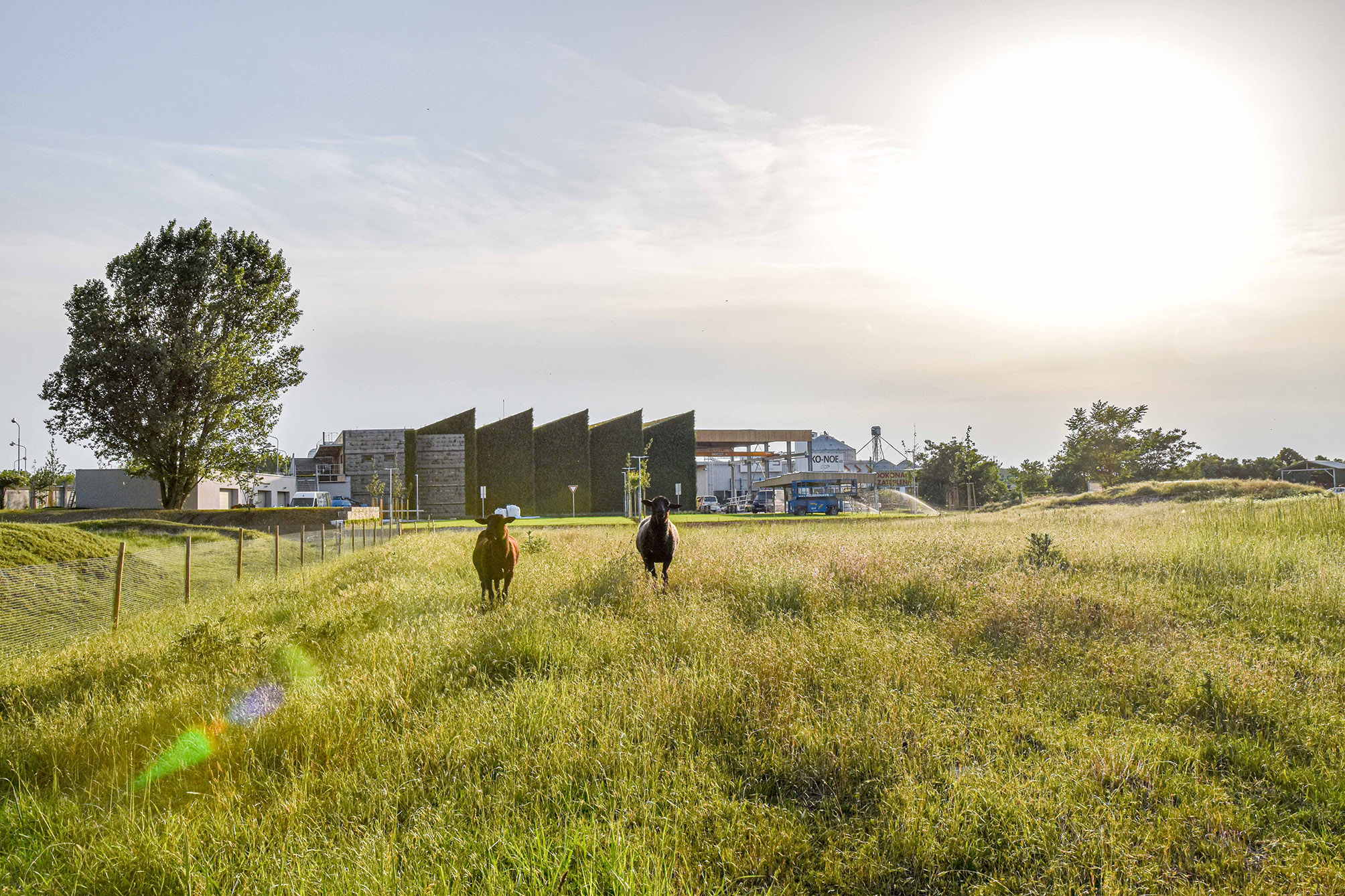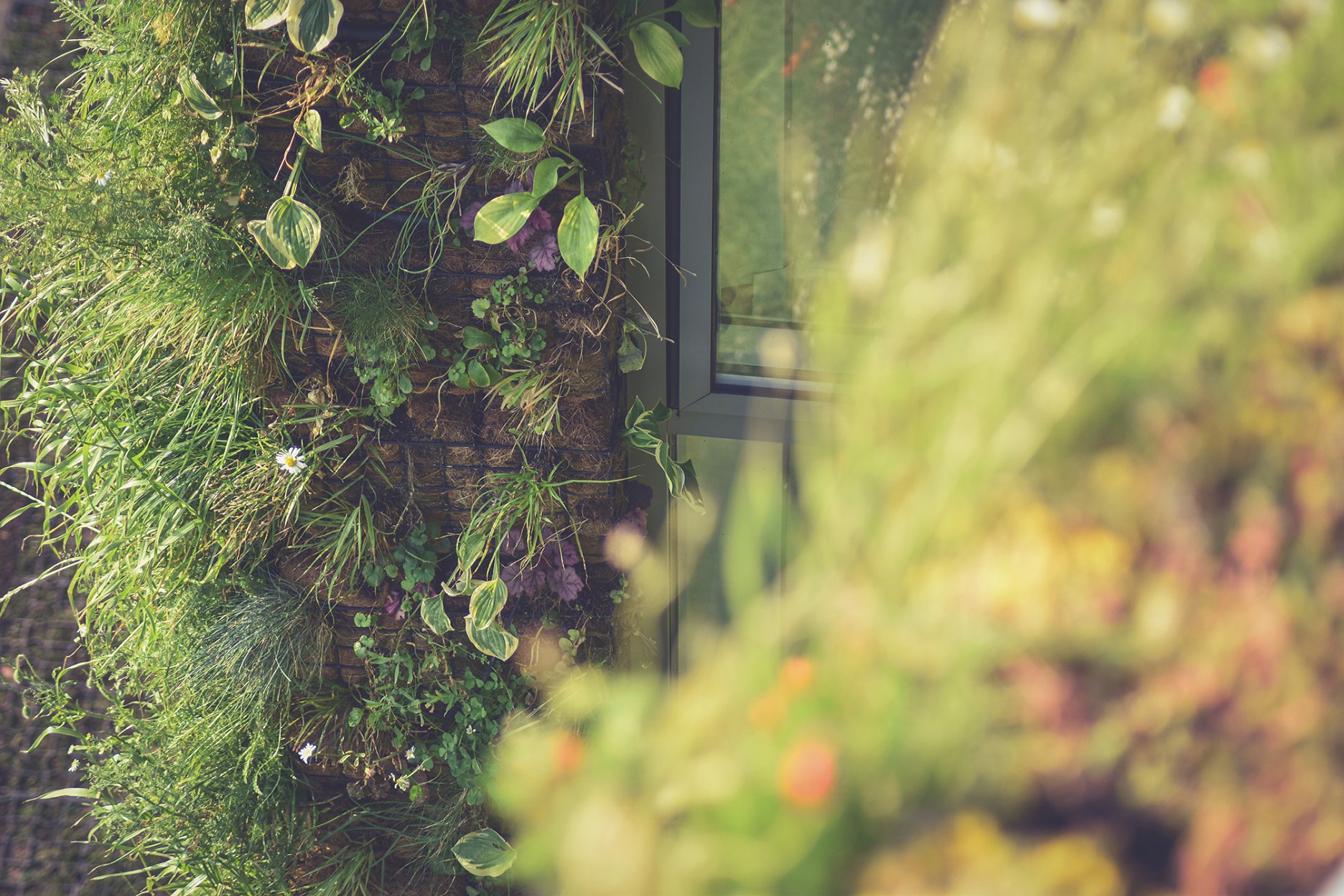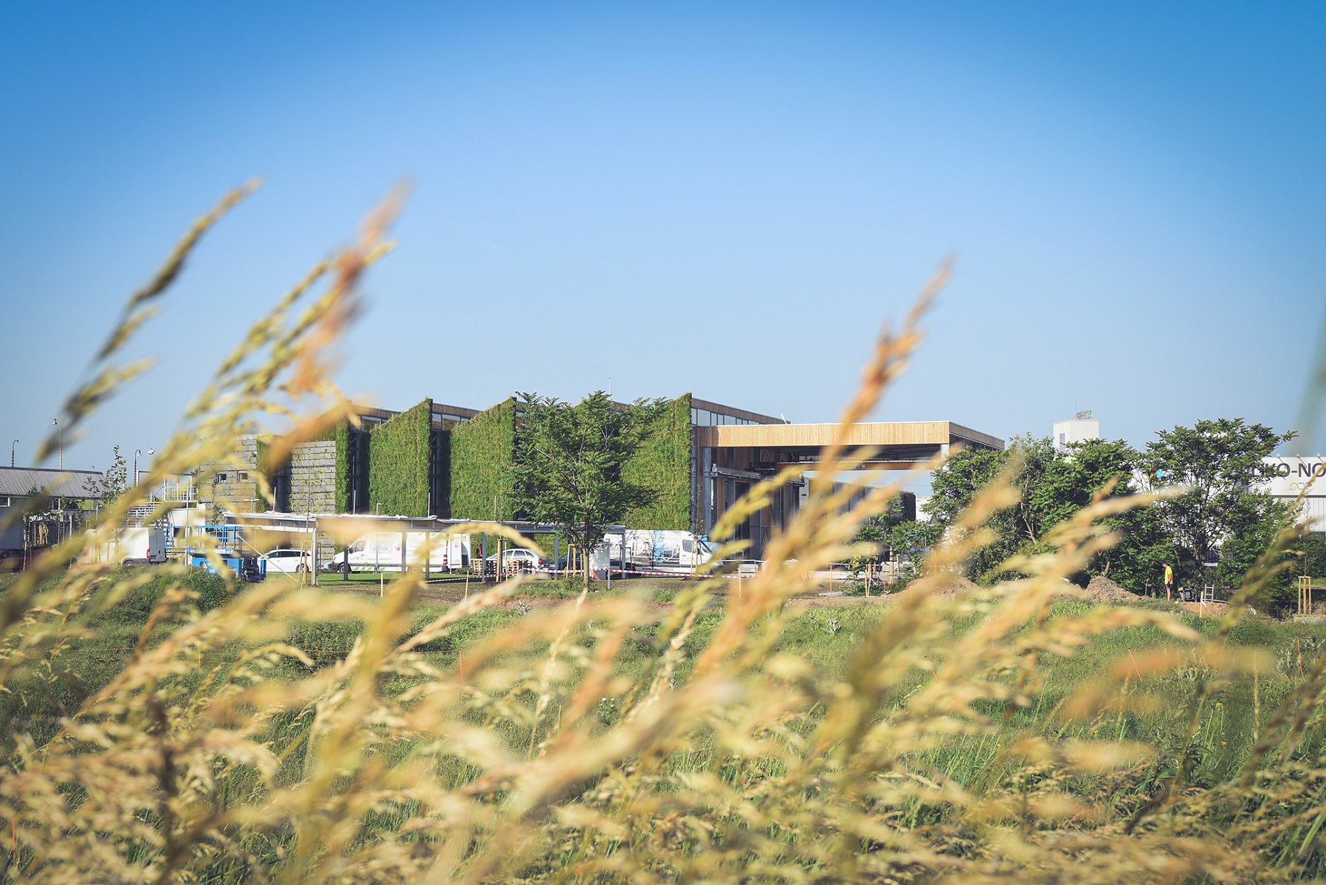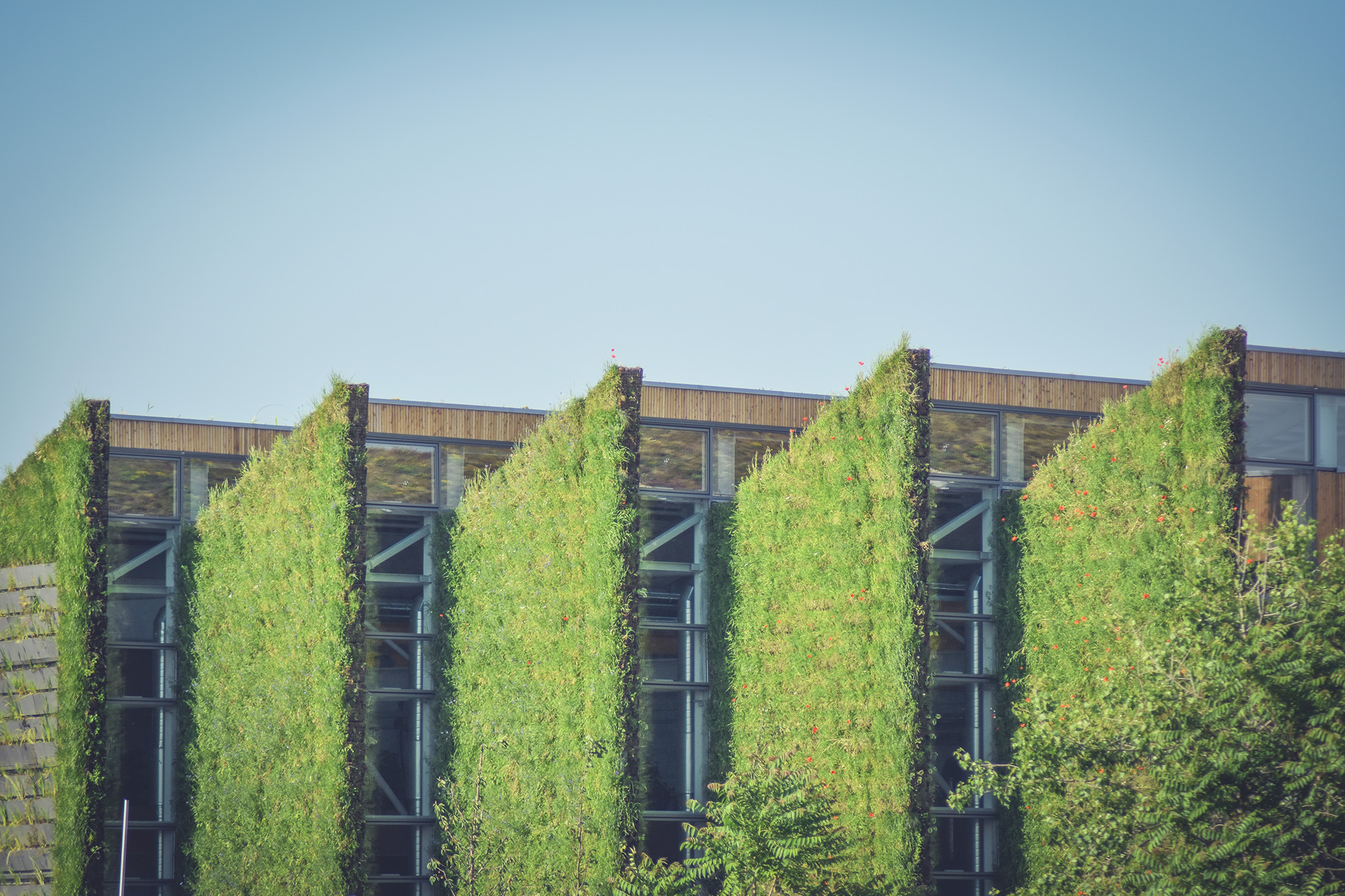 Prelamované steny porastené zeleňou strieda veľkoformátové zasklenie. Severná orientácia rozsiahlych transparentných plôch zabezpečuje dostatok svetla v interiéri, súčasne však bráni jeho prehrievaniu. Teplotu v interiéri pomáha udržiavať tiež čiastočné zapustenie južnej strany objektu. Aj vďaka tomu sa darí docieliť príjemné vnútorné prostredie bez klasického klimatizačného systému.