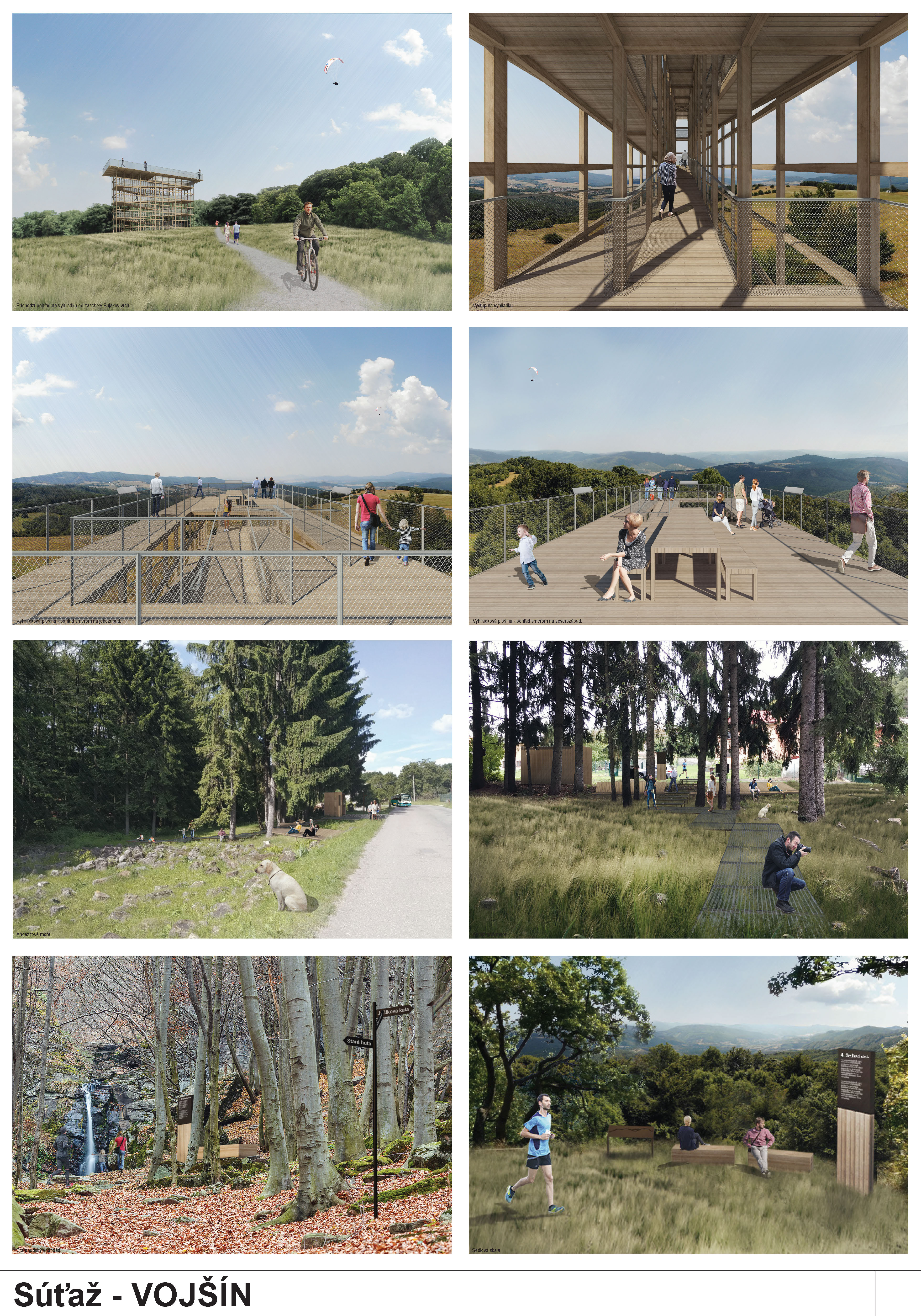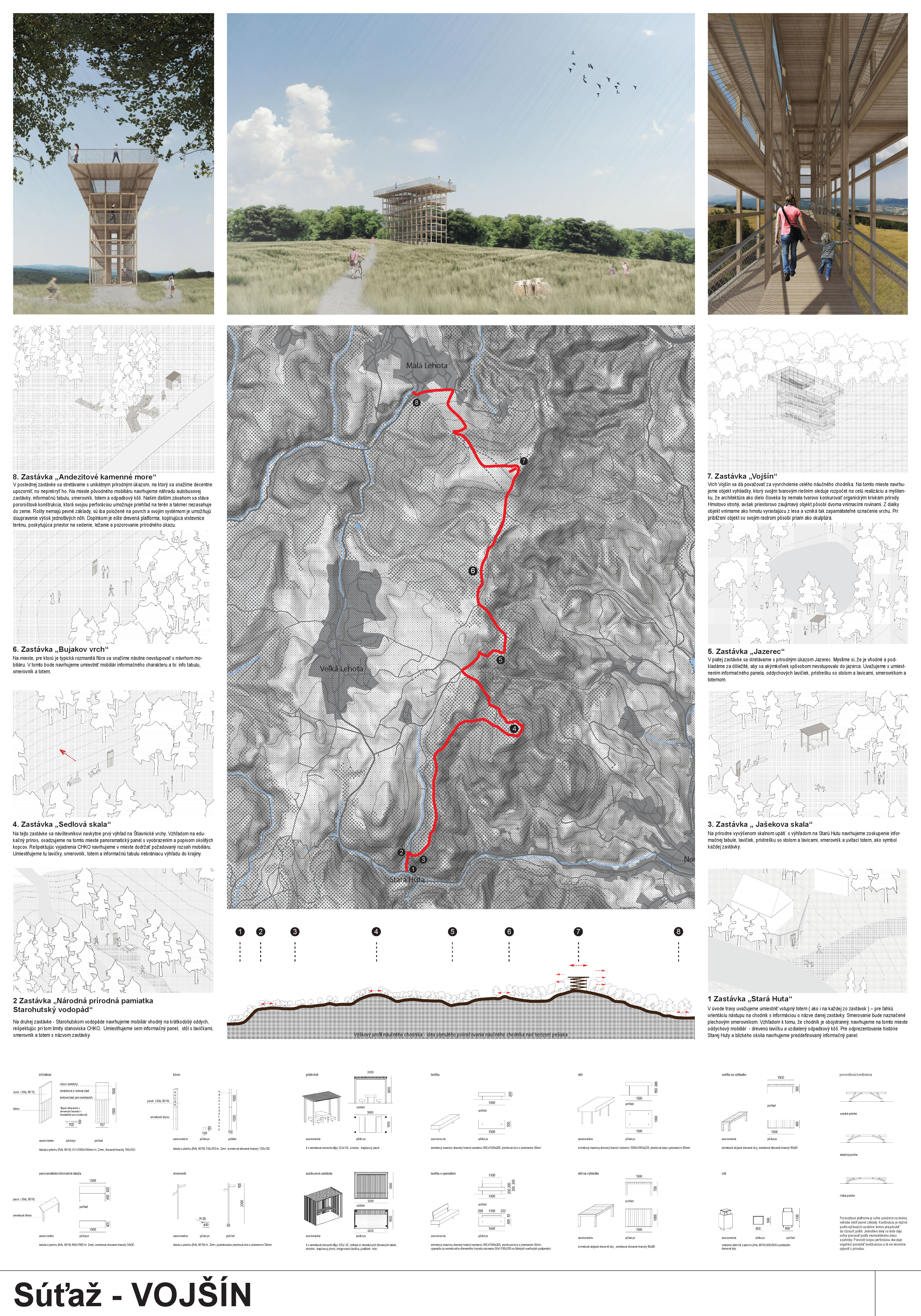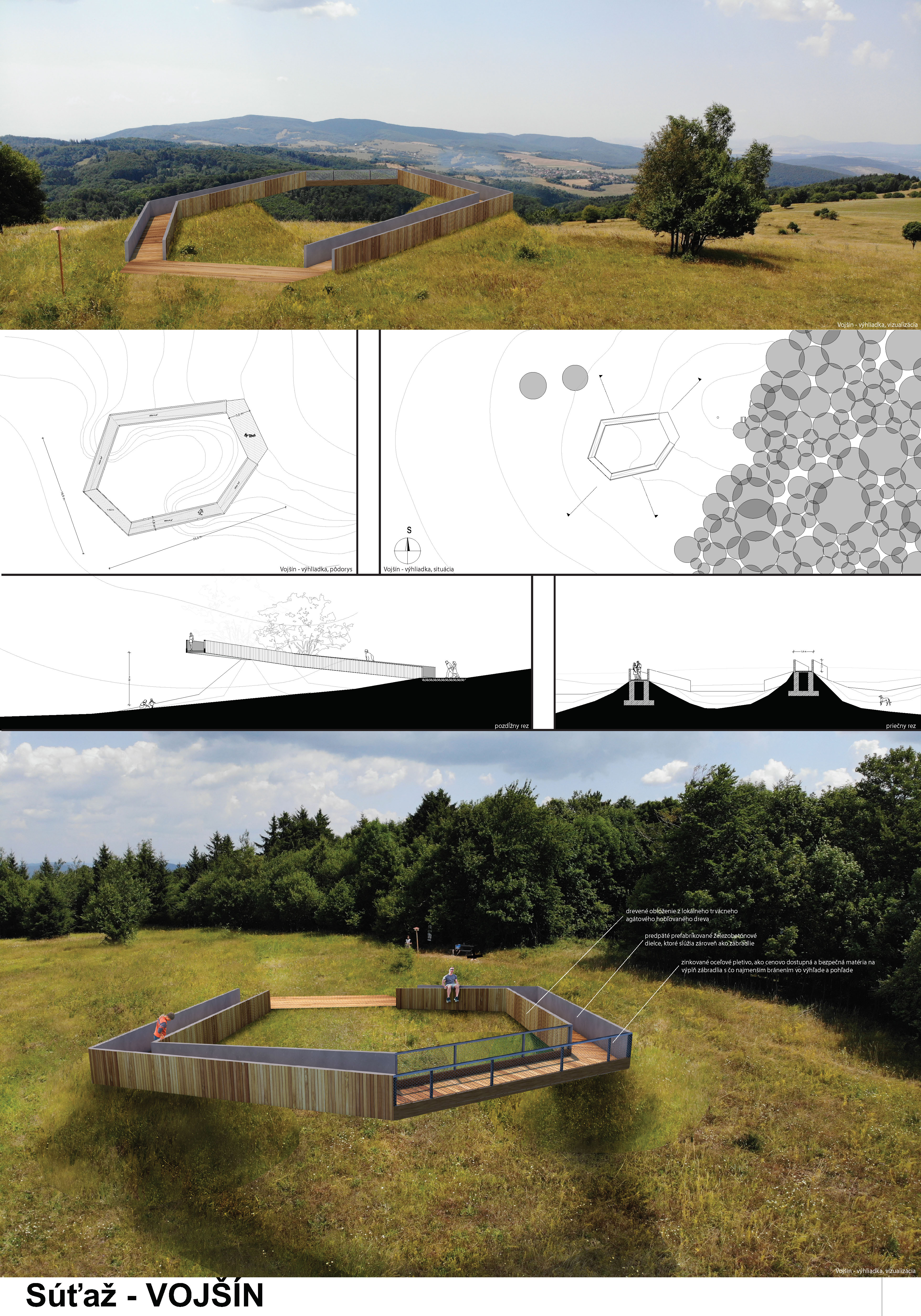 Objekt pôsobí ako veža. Napriek tomu relatívne zaujímavé. Z hľadiska finančného sa javí ako nerealizovateľné. Škoda, že na vrchol veže sa nevôjde viac ľudí (v prípade špičiek hrozia na rampe kolízie). Zastávka pri kamennom mori je riešená ako “senník” - to je dobrá typológia do tohto prostredia, ale nekomunikuje to s navrhnutou architektúrou vyhliadky na vrchu Vojšín, čo je na škodu. Dizajn by mal byť jednotný, inak sa to javí ako hendikep. Vyhliadka vhodná skôr na “kúpalisko”. Nepôsobí to ľahkosťou.