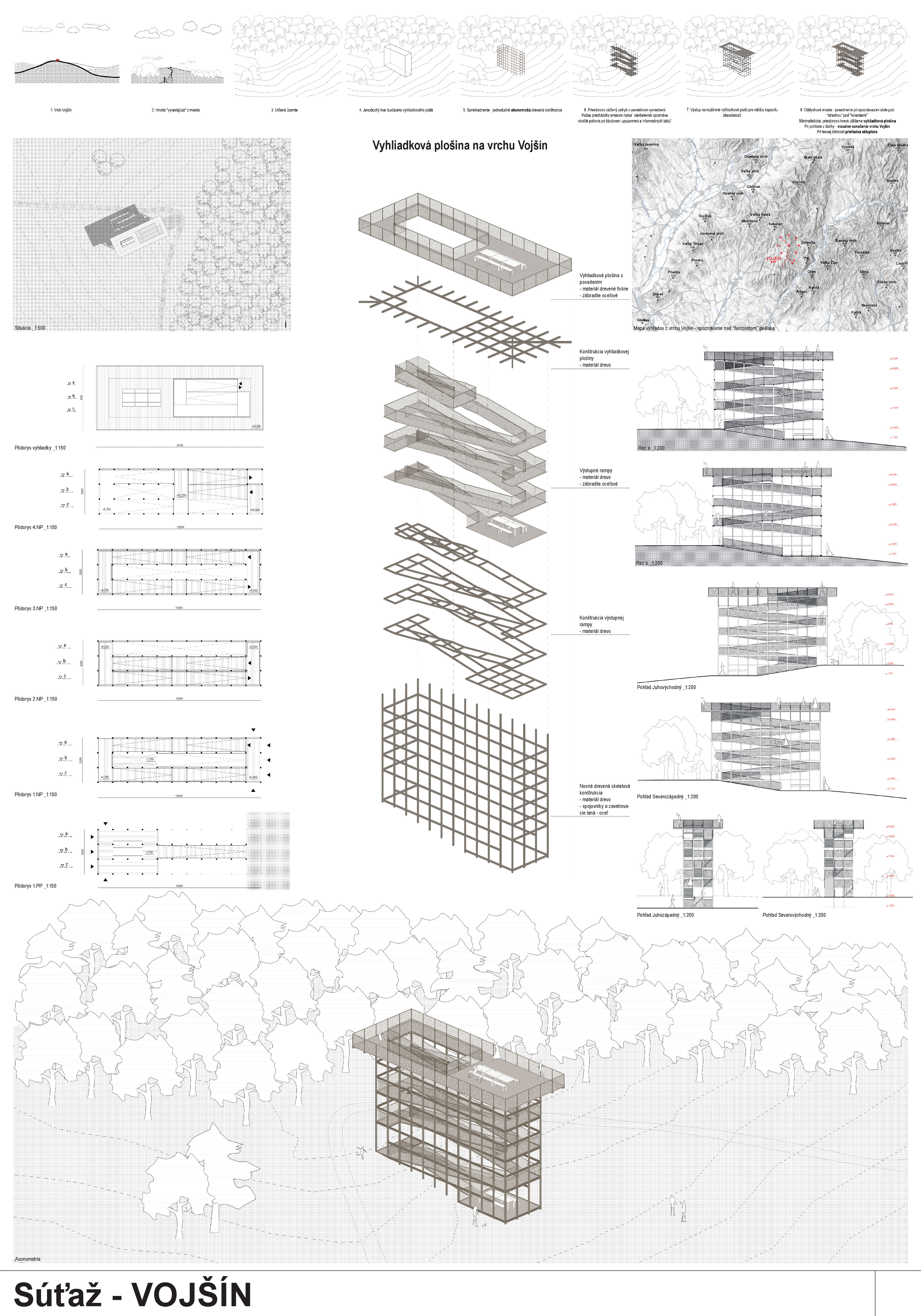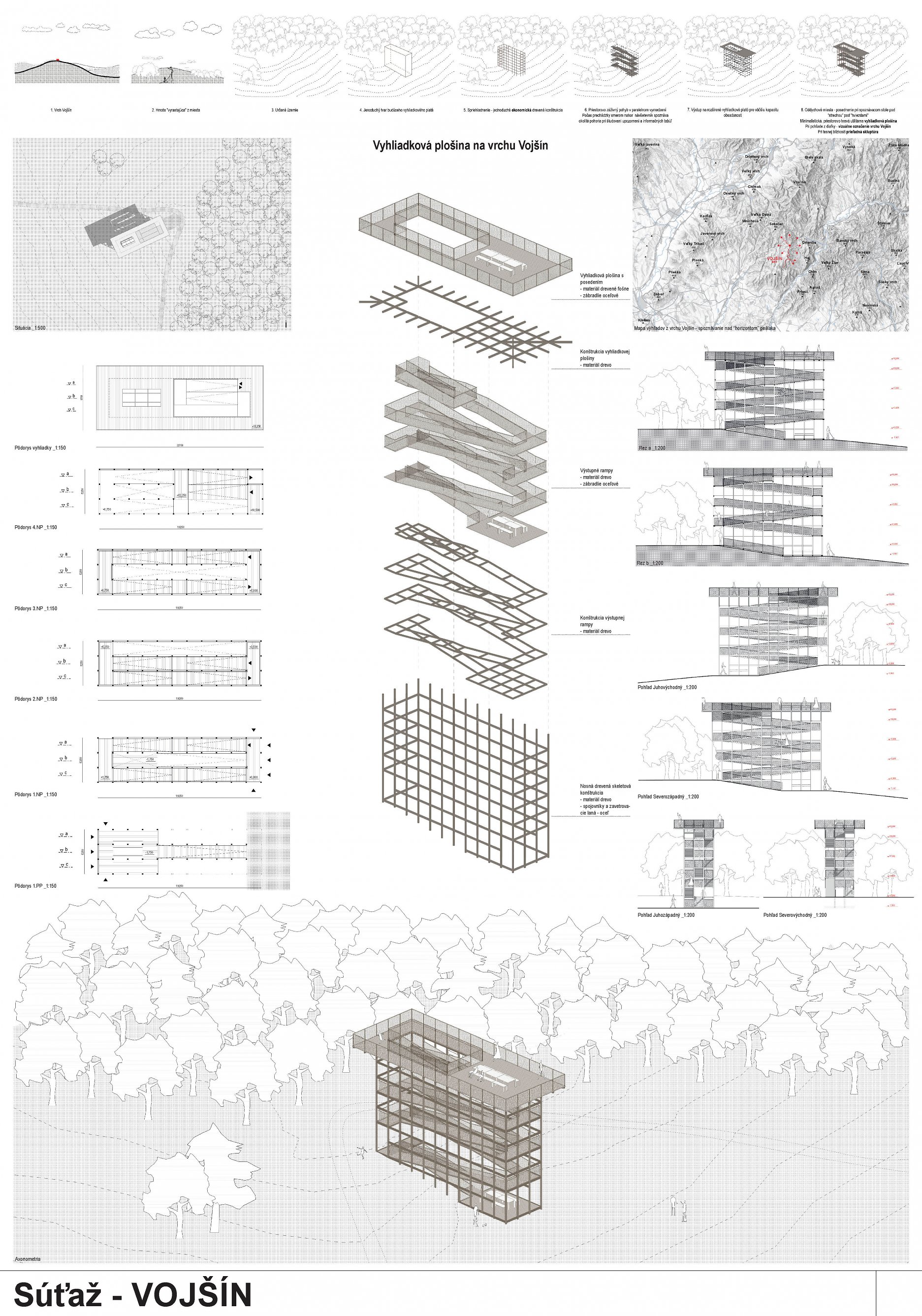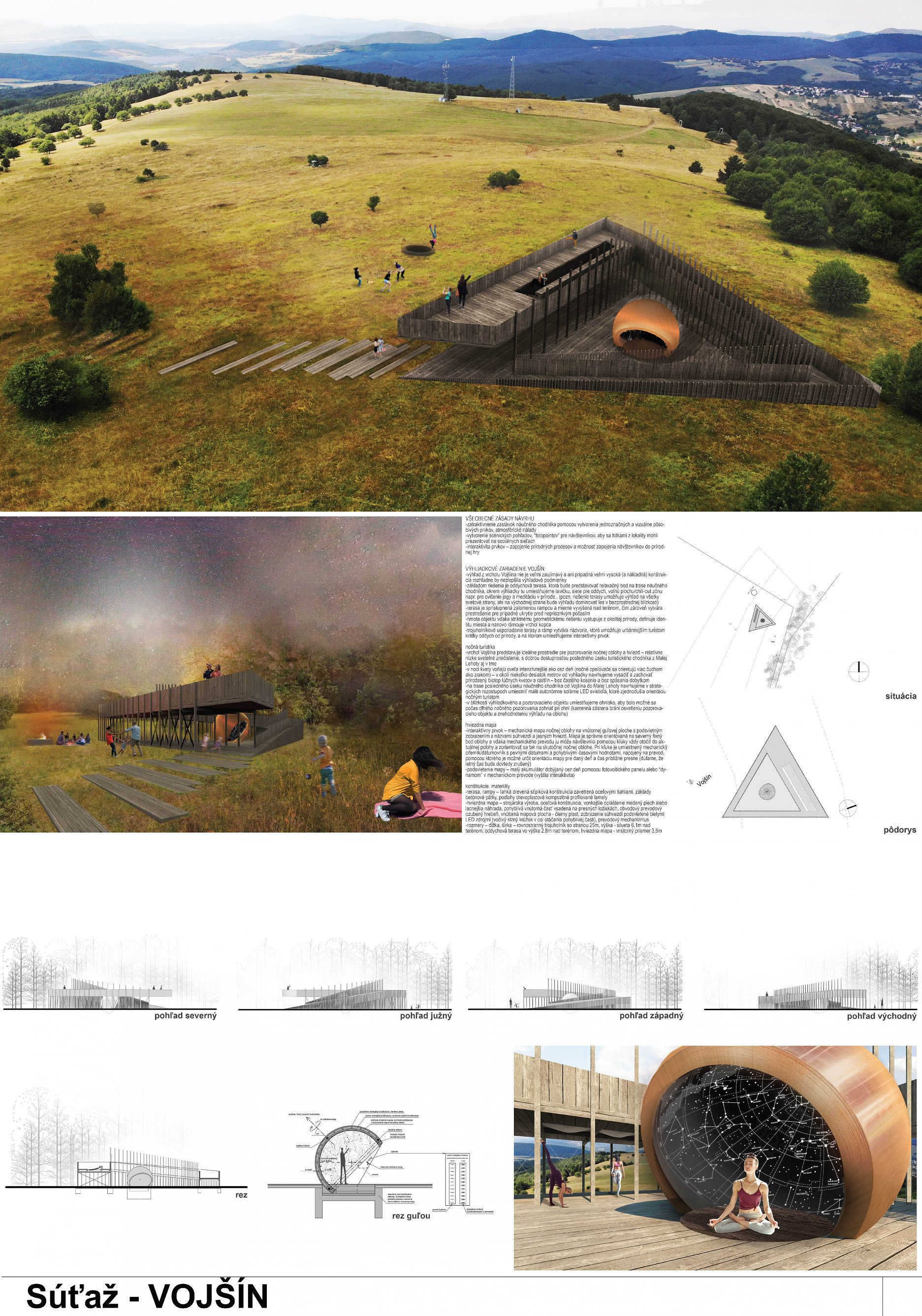 Objekt pôsobí ako veža. Napriek tomu relatívne zaujímavé. Z hľadiska finančného sa javí ako nerealizovateľné. Škoda, že na vrchol veže sa nevôjde viac ľudí (v prípade špičiek hrozia na rampe kolízie). Zastávka pri kamennom mori je riešená ako “senník” - to je dobrá typológia do tohto prostredia, ale nekomunikuje to s navrhnutou architektúrou vyhliadky na vrchu Vojšín, čo je na škodu. Dizajn by mal byť jednotný, inak sa to javí ako hendikep. Vyhliadka vhodná skôr na “kúpalisko”. Nepôsobí to ľahkosťou.