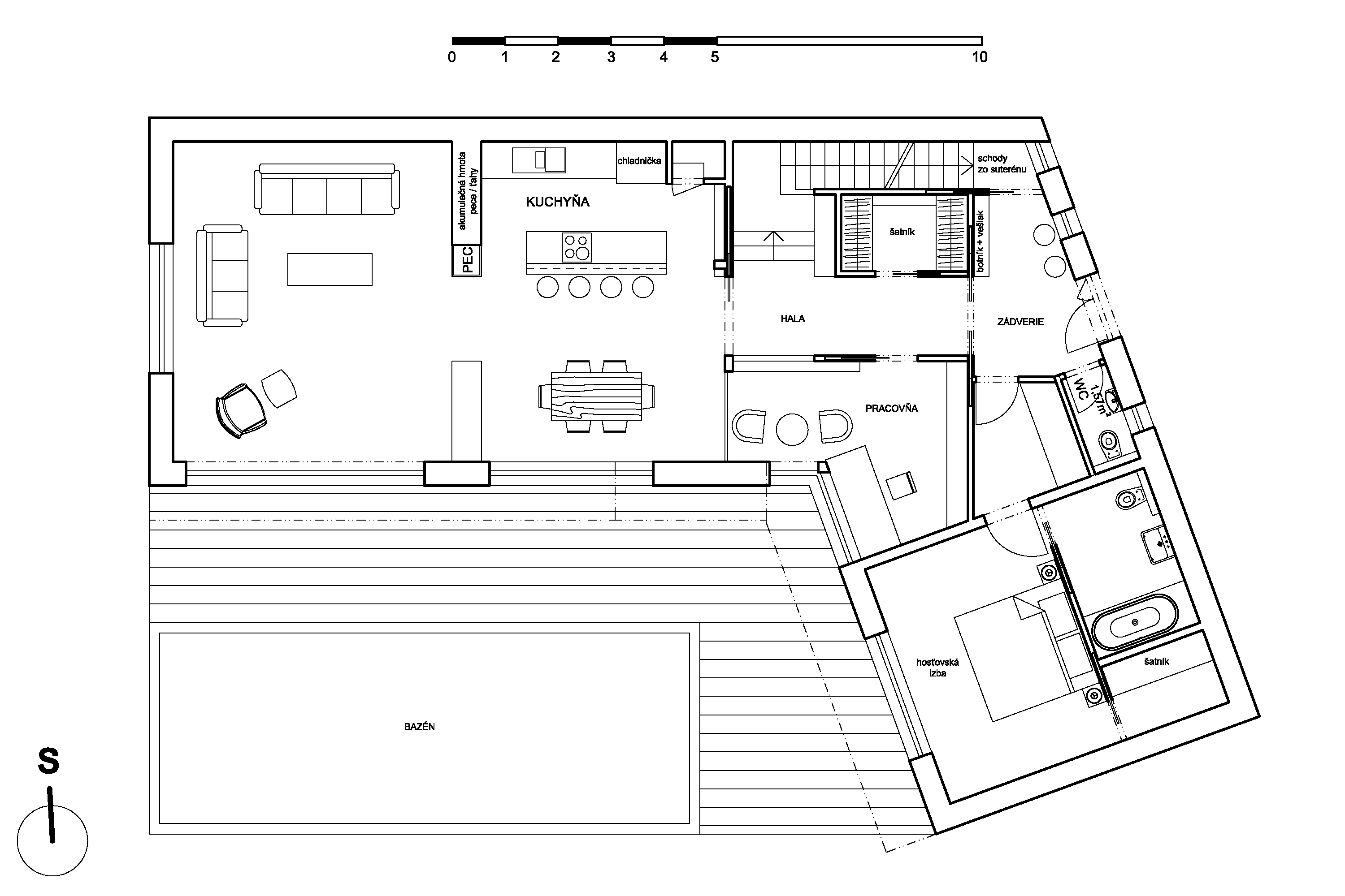 Vykurovanie dennej časti domu je zabezpečené ohniskom s akumulačnou stenou, ohnisko zabezpečuje príjemnú atmosféru v pobytovom a reprezentačnom priestore domu.