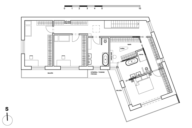 Rodinný dom - vila na neštandardnom svahovitom pozemku - svojím riešením maximálne využíva danosti parcely a reaguje na okolitú zástavbu; tvarom domu vytvára súkromie a zároveň nerušený pobytový priestor, pričom netieni výhľad ani nebráni preslneniu okolitej zástavby ani pozemkov. Prízemie obsahuje okrem dennej časti aj samostatnú bytovú jednotku a pracovňu, poschodie poskytuje nadštandardný priestor pre investorov a ich deti.