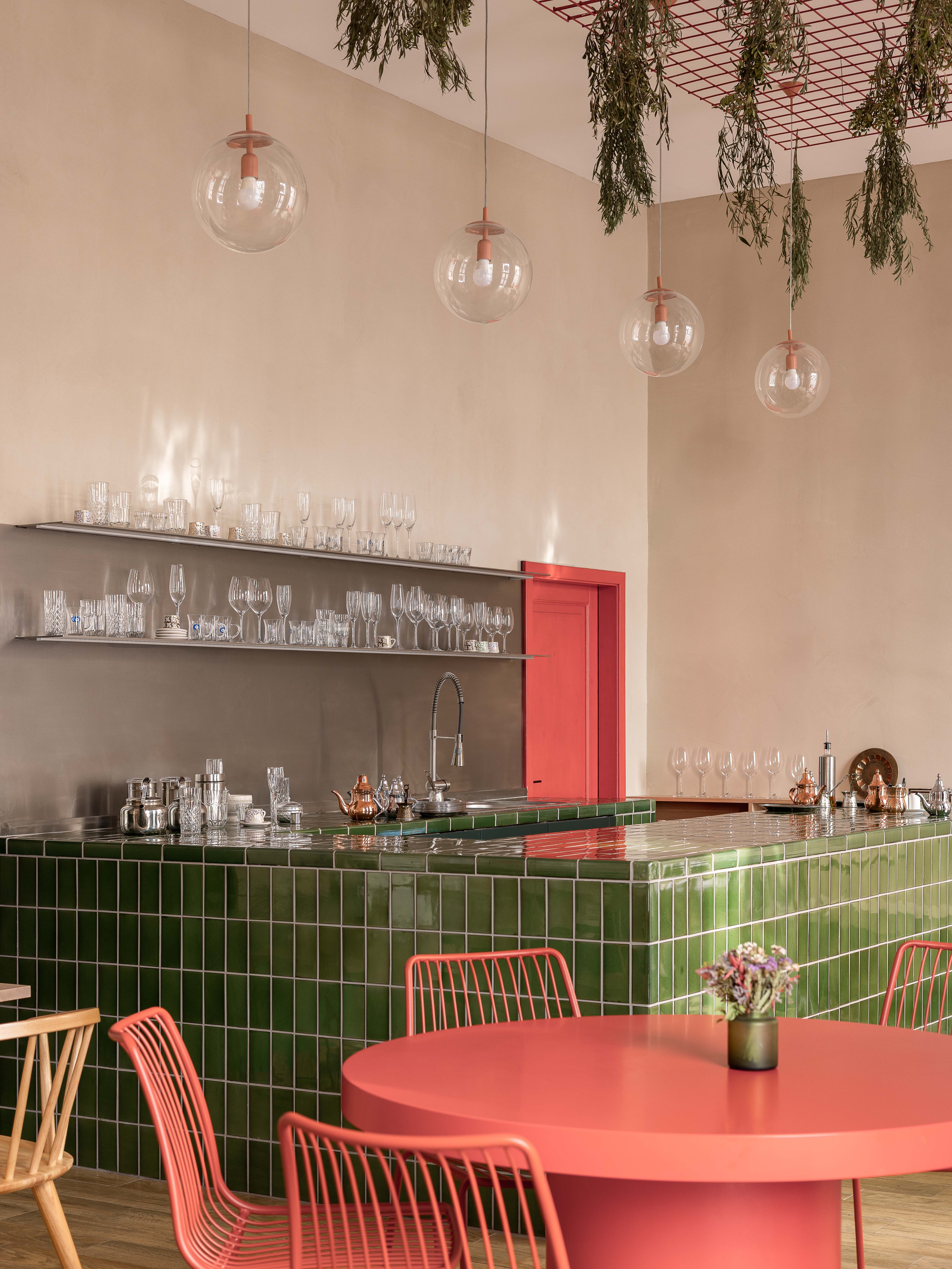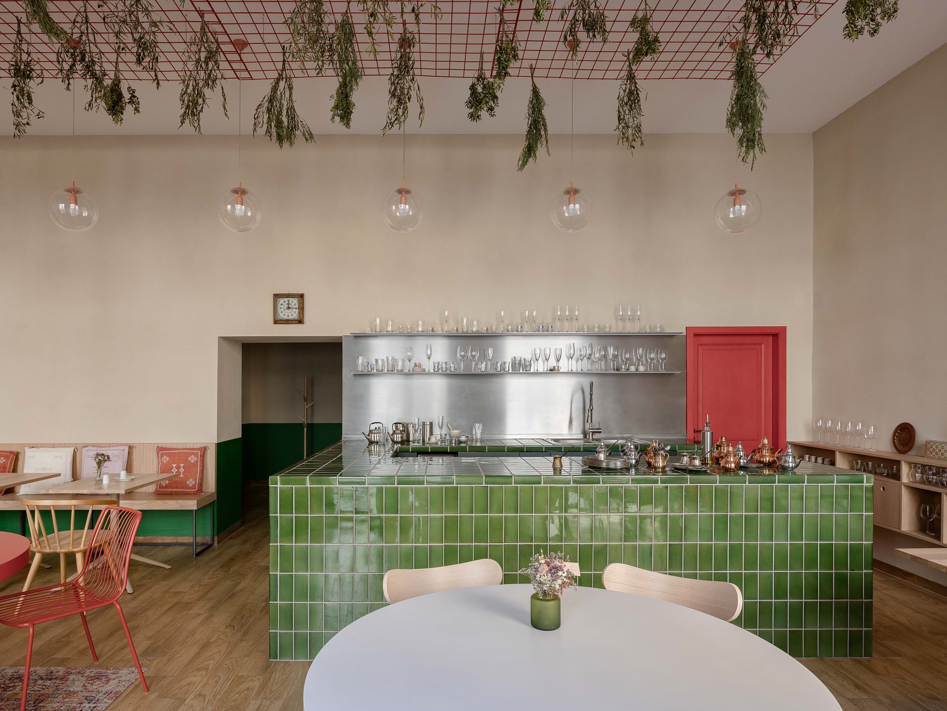 Priestorové jadro – centrálny zelený bar – je chápaný nielen ako technický prvok, ale aj ako centrum sociálnej interakcie. Jeho robustná, no zároveň jemne modelovaná hmota vytvára horizontálnu os, ktorá organizuje pohyb v priestore. Nad týmto horizontom sa vznáša filigránová stropná mriežka – reinterpretácia tradičnej mashrabiyi, archetypu svetelnej filtrácie a ochrany súkromia. Mashrabiya v Arabeske prehodnocuje tradičný pojem hranice — nie ako pevný predel, ale ako priepustnú membránu medzi súkromným a verejným, medzi svetlom a tieňom, a vytvára tak priestorovú dynamiku.