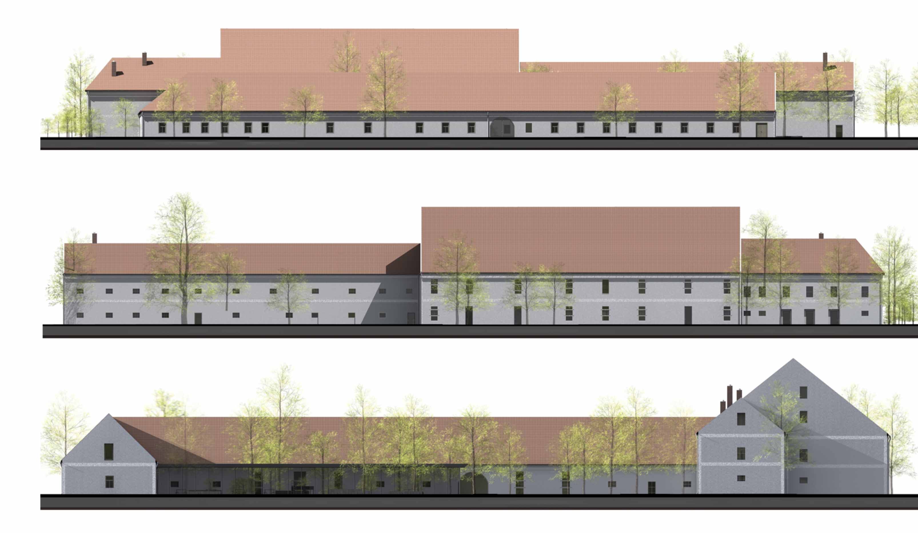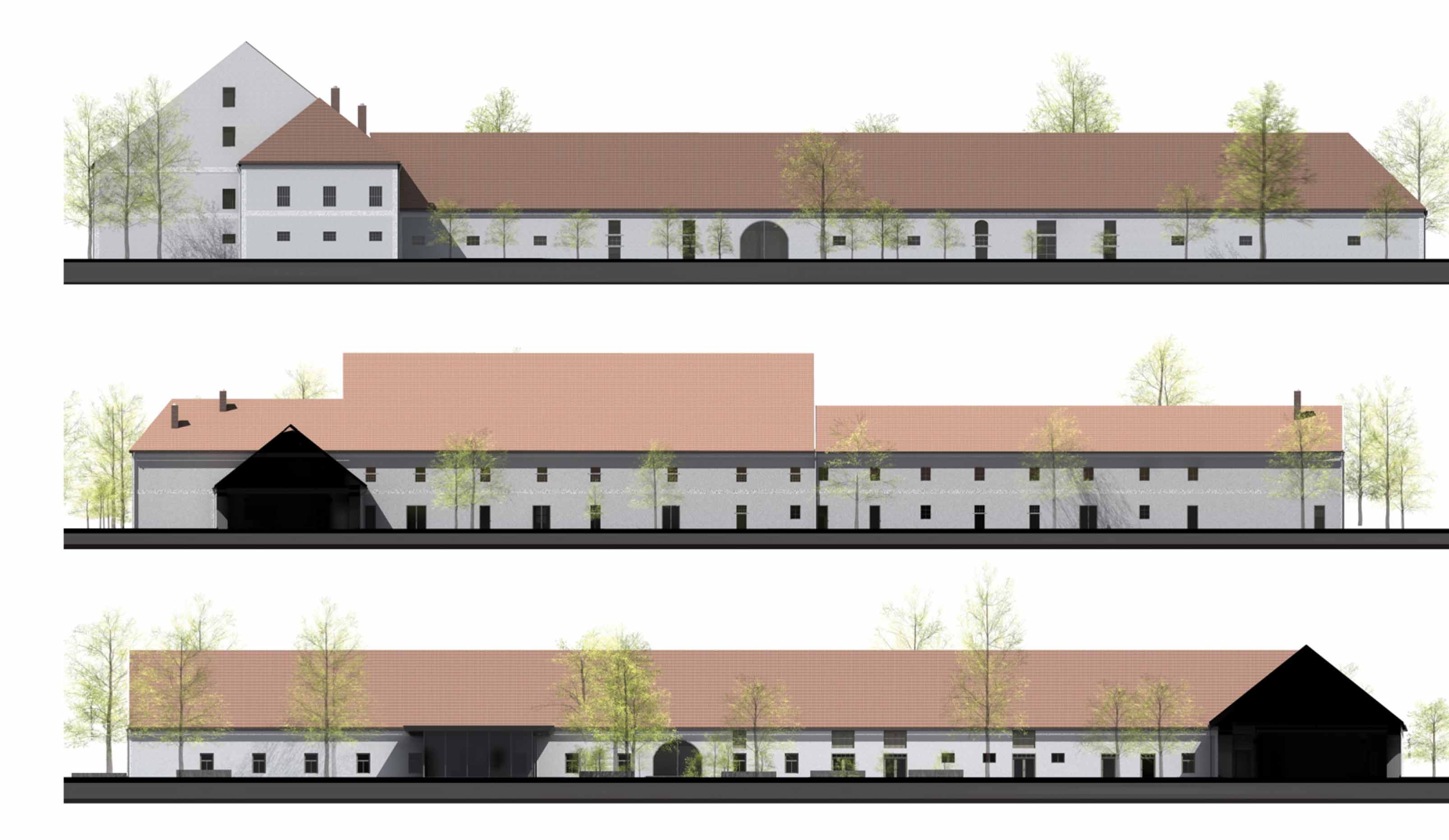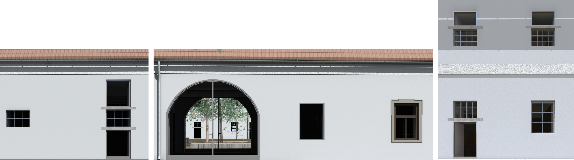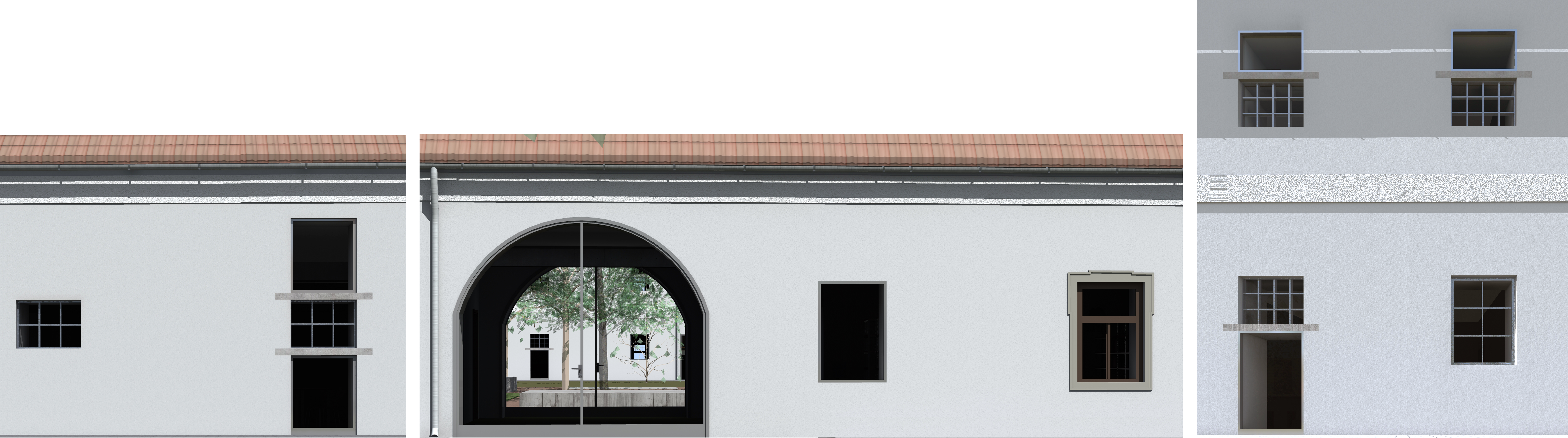 Celá fasáda pamiatky bude farebne kopírovať svoj pôvodný stav – biela omietka a červená keramická krytina. Pôvodne otvorené prechody cez južné a západné krídlo budú celoplošne zatvorené sklenenou bránou, pretož tento novovytvorený uzatvorený priestor tvorí súčasne aj zádverie jednotlivých navrchovaných prevádzok v priľahlých krídlach.