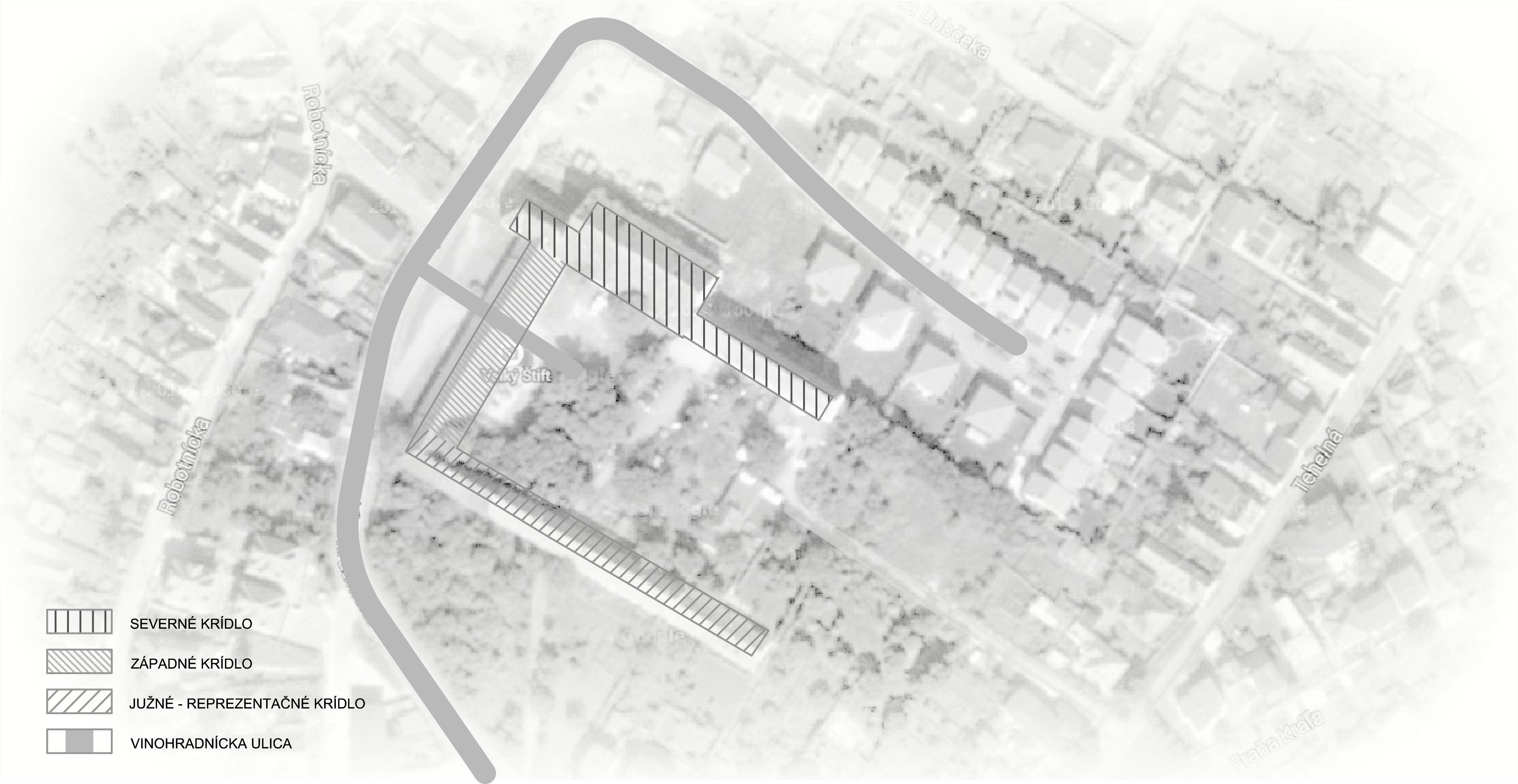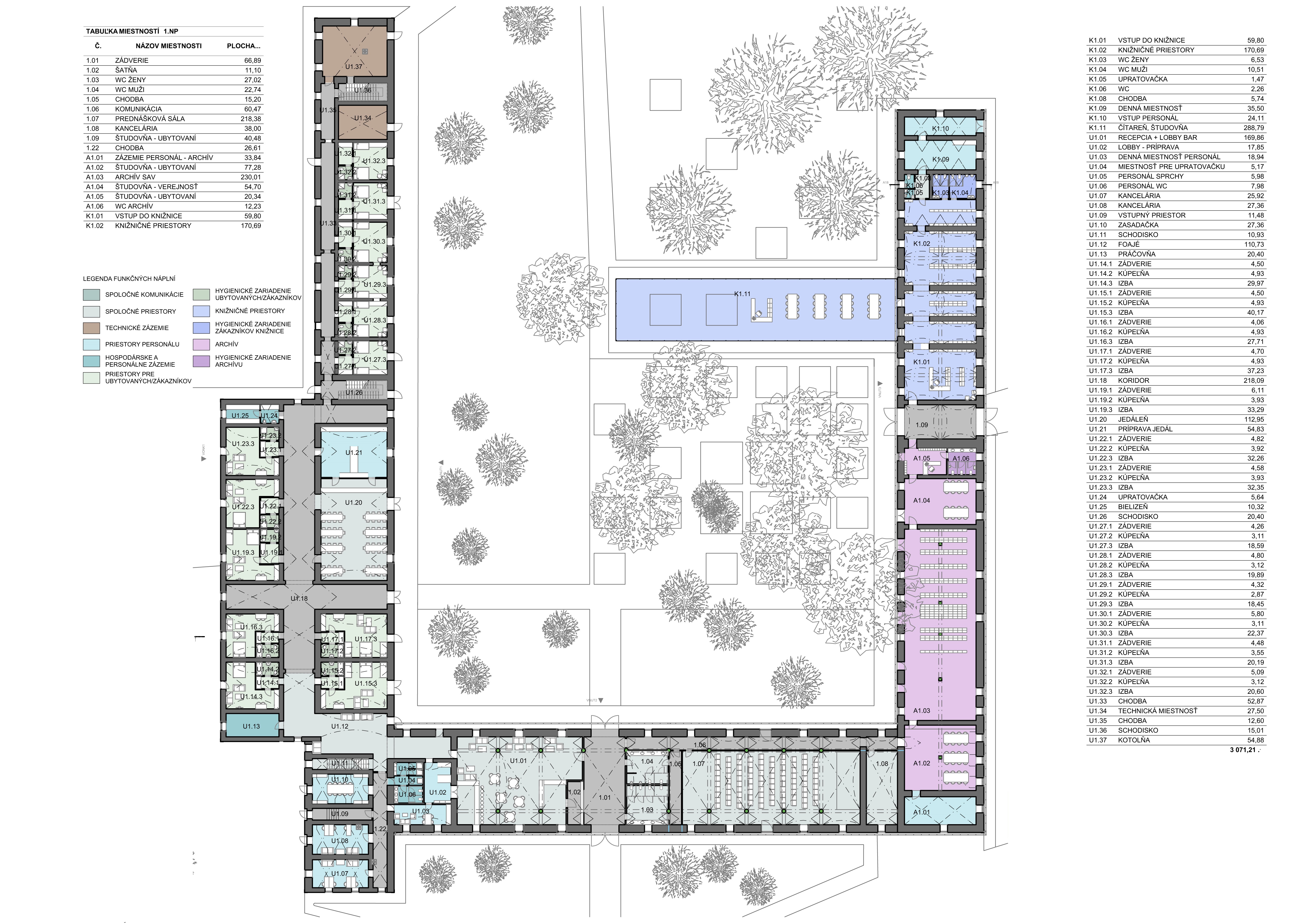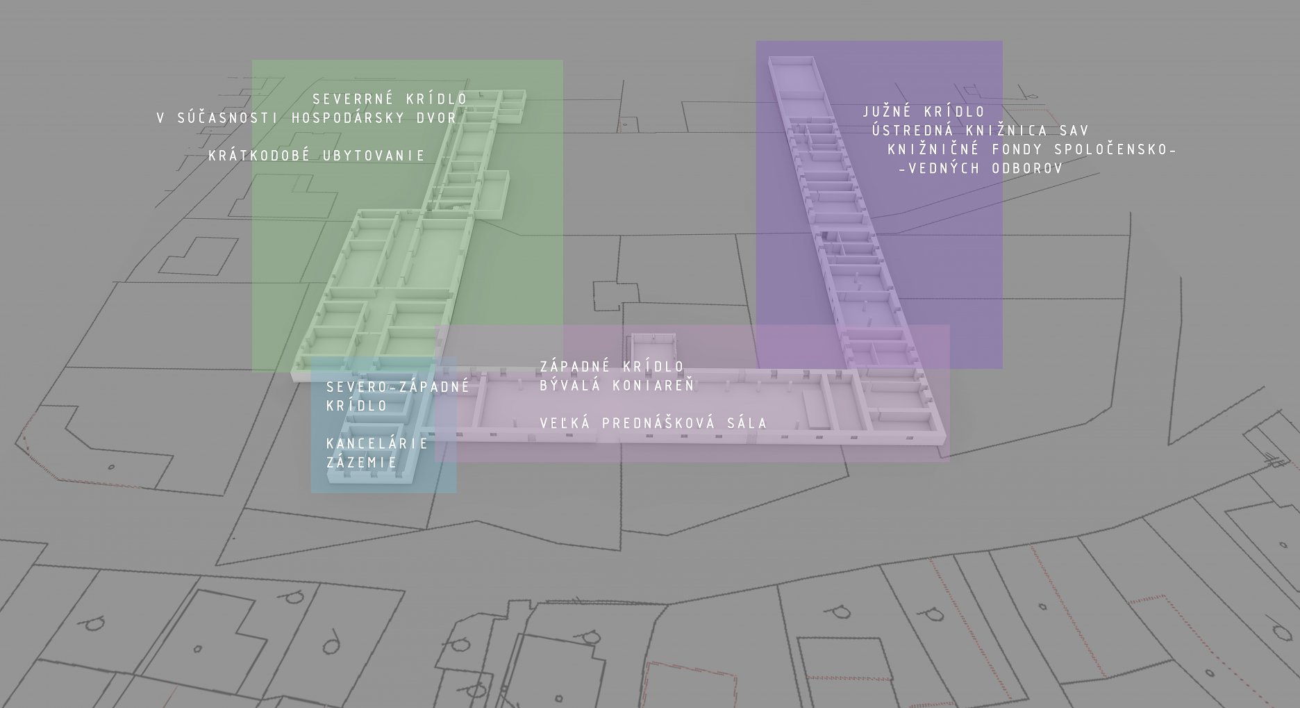 Pôvodné funkčné využitie (ako jazdecká škola) bude nahradené funkciou ústrednej knižnice SAV, kde sa budú nachádzať knižničné fondy spoločensko-vedných odborov. Okrem toho sa v komplexe bude nachádzať krátkodobé ubytovanie pre návštevníkov archívu, ktoré bude umiestnené v terajšej hospodárskej časti – v severnom krídle. Je to jediné dvojpodlažné krídlo, ubytovanie sa bude nacházdať na oboch podlažiach. Navrhovaná kapacita lôžok teda umožňnuje v obejkte organizovať okrem pracovných a študijných ciet aj iné spoločenské udalosti. Samotný archív a knižničné priestory budú orientované v južnom krídle. V priestoroch bývalej koniarne v západnom krídle je navrchovaná veľká prednášková sála, ktorá vďaka svojej čistej dispozícii dovoľuje variabilnosť jej alternatívneho využitia. V severo-západnom vysunutom krídle sa budú nachádzať kancelárie a zázemie pre personál. K západnému krídlu je pristavaný novotvar, ktorý bude využívaný ako čítareň a detská knižnica a zároven svojou polohou z časti uzatvára vnútorné nádvorie, na ktorom budú prebiehať exteriérové letné aktivity /letné čítarne a pod./. V návrhu nádvoria, ako verejného priestoru, je príznačné, že vytvára priestor pre ľudí, kde sa bude dať čítať, relaxovať, stretávať a tráviť voľný čas mimo mestského ruchu. Aj preto je zachované maximálne množstvo existujúcej zelene a nové zásahy ju rešpektujú v maximálnej miere.