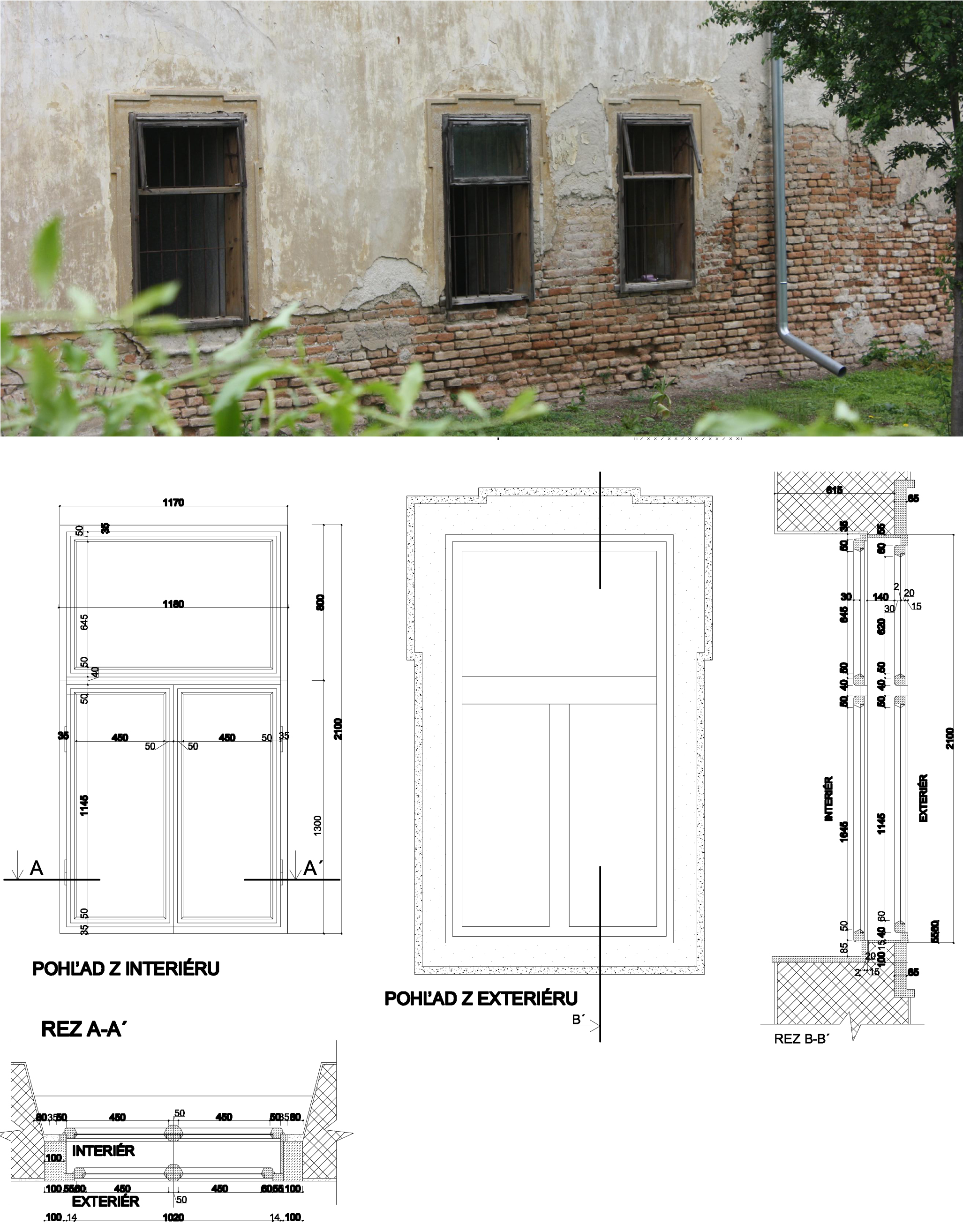 Kedže okenné a dverné otvory sa z veľkej miery nepodarilo zachovať, návrh ich obnovy prebieha vo veľkom rozsahu. V závislosti od pamiatkového zámeru, v návrhu sa v severnom krídle nachádzajú ubytovacie jednotky, pri ktorých okenné otvory museli byť zväčsené. Tento zásah však nezotiera pôvodné rozmery okien – z výtvarného riešenia je zrejmé, ktoré časti presklenia boli dodatočne pridané. Pôvodné okná preberajú pôvodné rastrové členie zasklenia, pridané otvory sú oddelené betónovými prekladmi a majú jednoduché zasklenie vložené do kovových rámov.