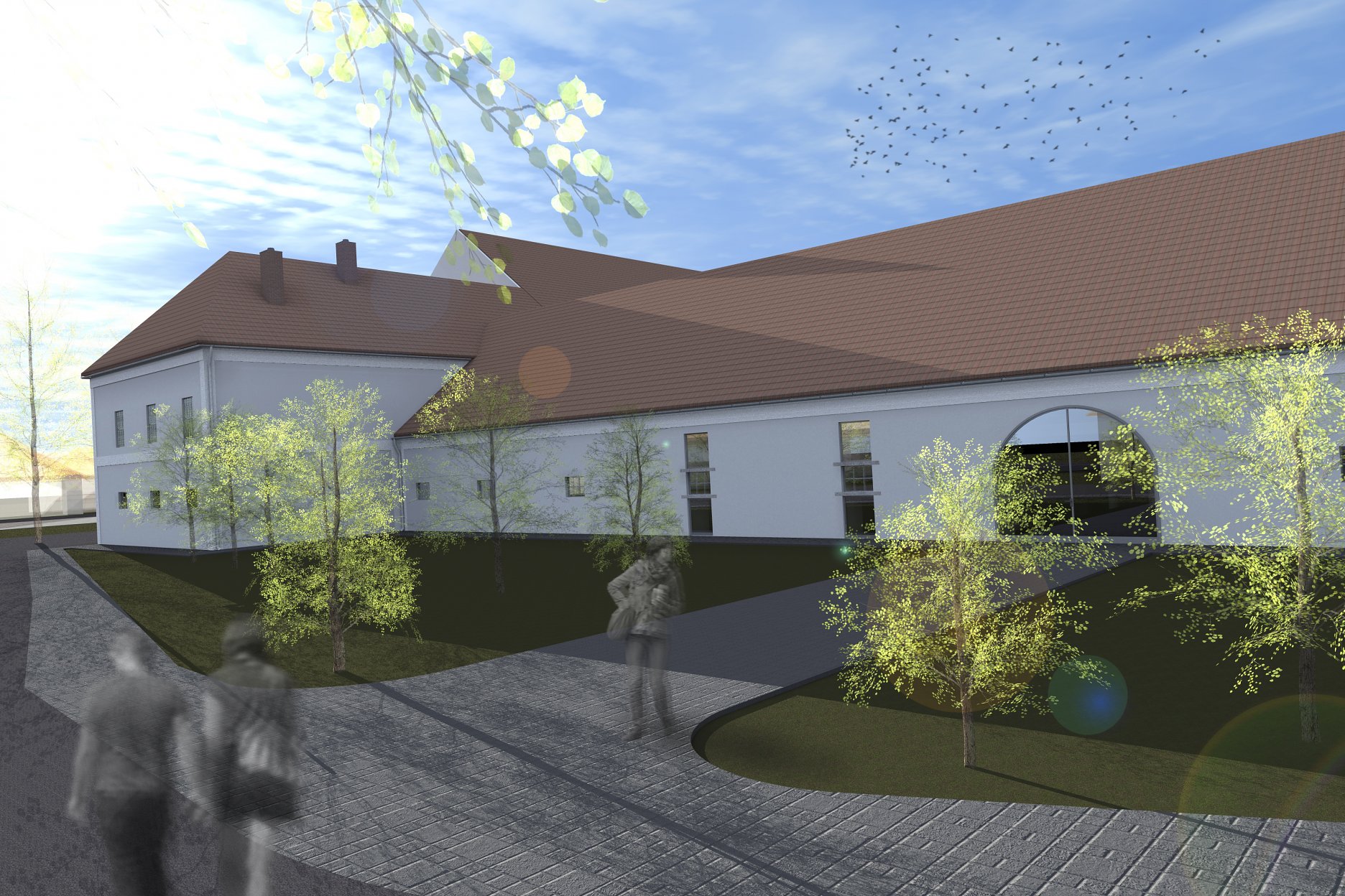 Hmotová kompozícia stavby vychádza z pamiatkového zámeru, takže pri návrhu nedošlo ku hmotovým zmenám pamiatky. Keďže na severnej strane došlo ku zrúteniu jedného krídla, toto krídlo sa nám vo forme novotvaru objaví ako uzatvárací prvok nádvoria, s funkciou čítarne a detskej knižnice. Svojou materialitou ani hmotou sa nesnaží napodobňovať formu pamiatky – práve naopak – súčasným jazykom dáva jasne najavo, že v pôvodnej koncepcii sa nenachádzal a vďaka svojej transparentnej konštrukcíi nepôsobí rušivo.