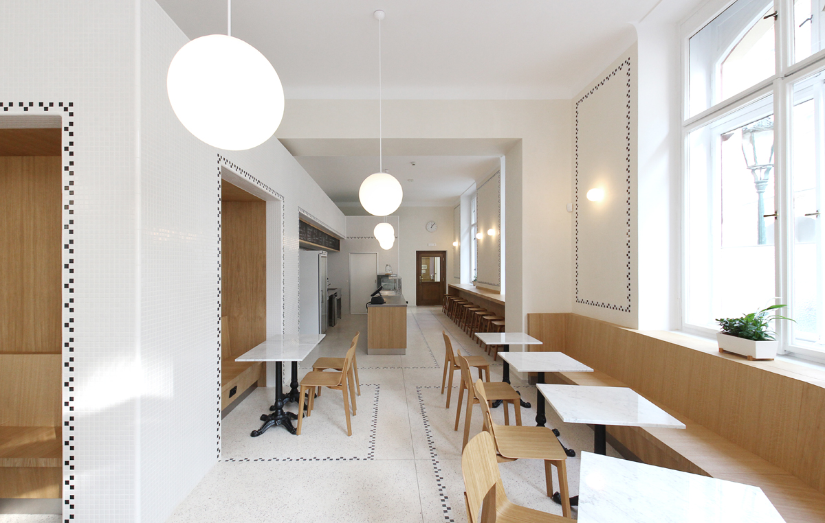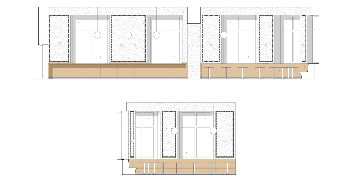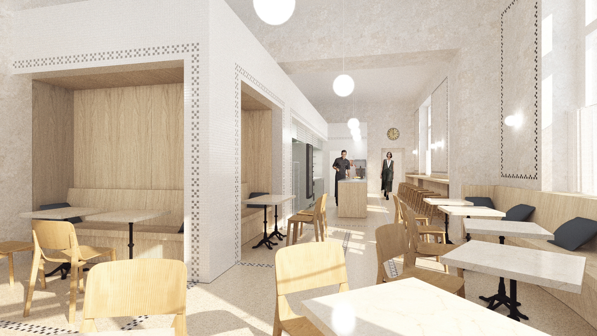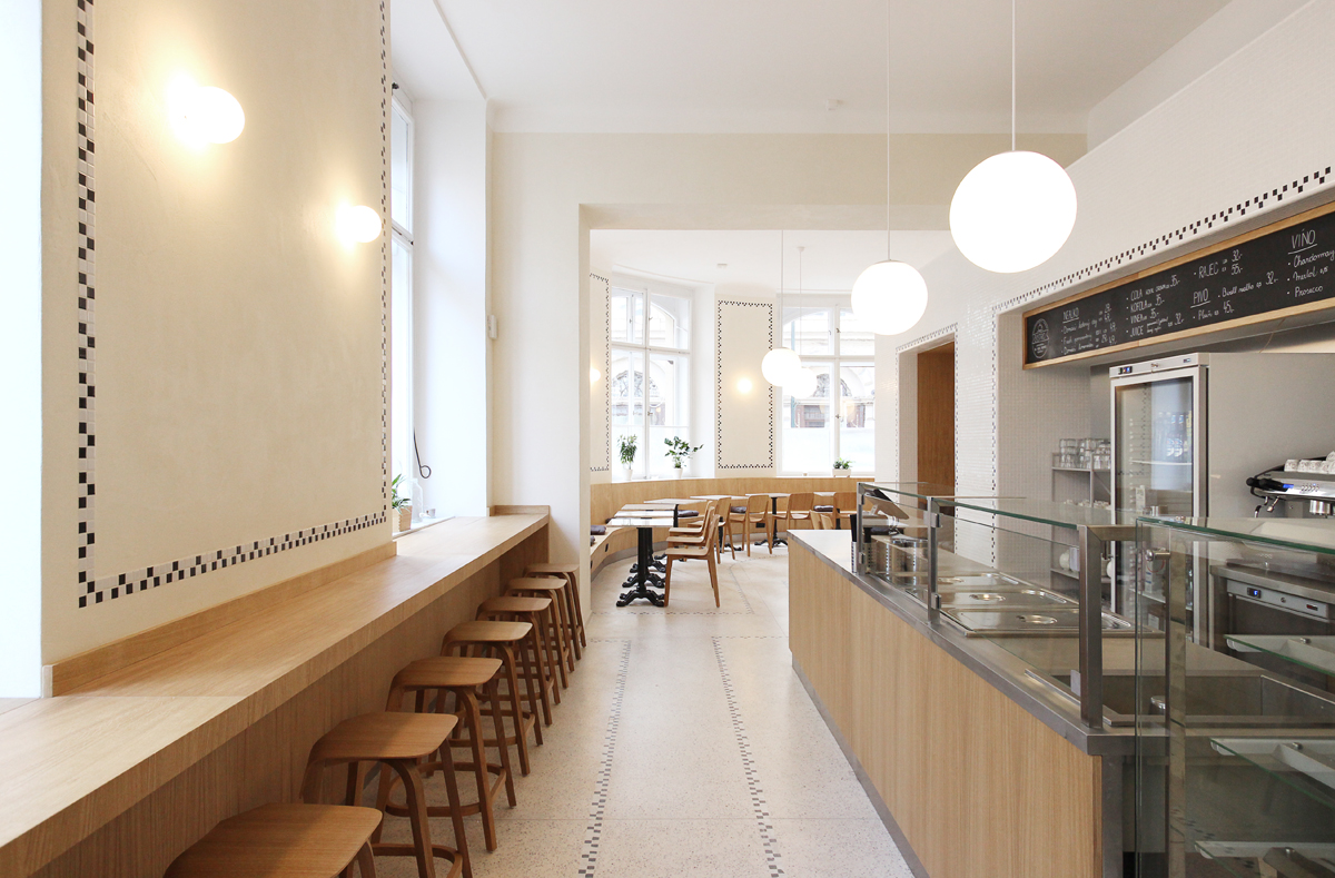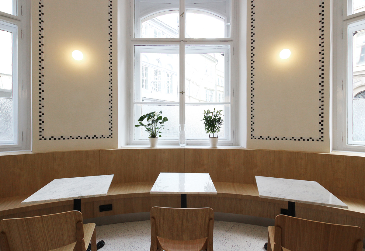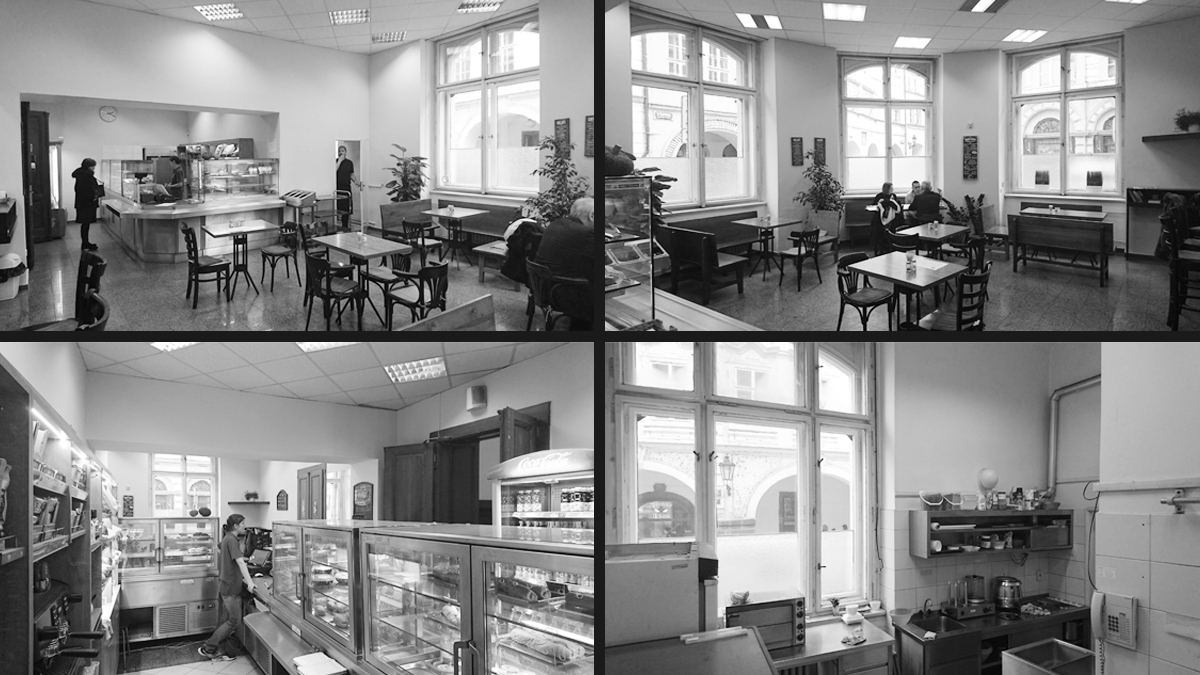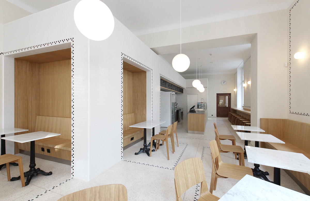 Architekti navrhli renováciu verejne prístupných častí výdajne a sedenia. V interiéri pracujú s keramickou mozaikou, ktorá lemovaním akcentuje výklenky pre sedenie a výdaj jedla. Lemovanie plynule prechádza do podlahy zo svetlého terazza.