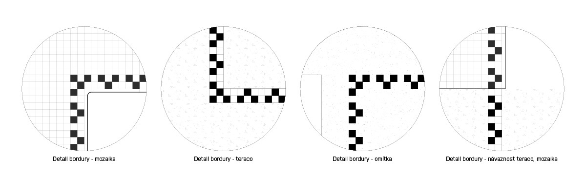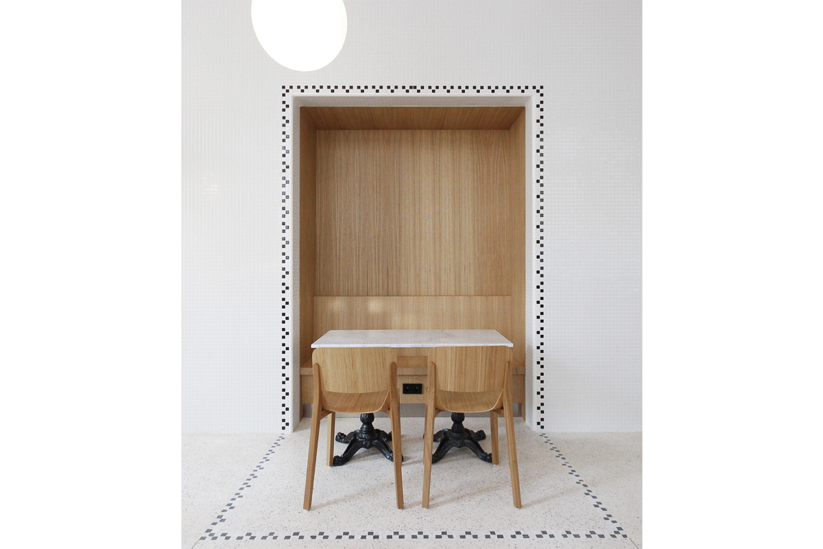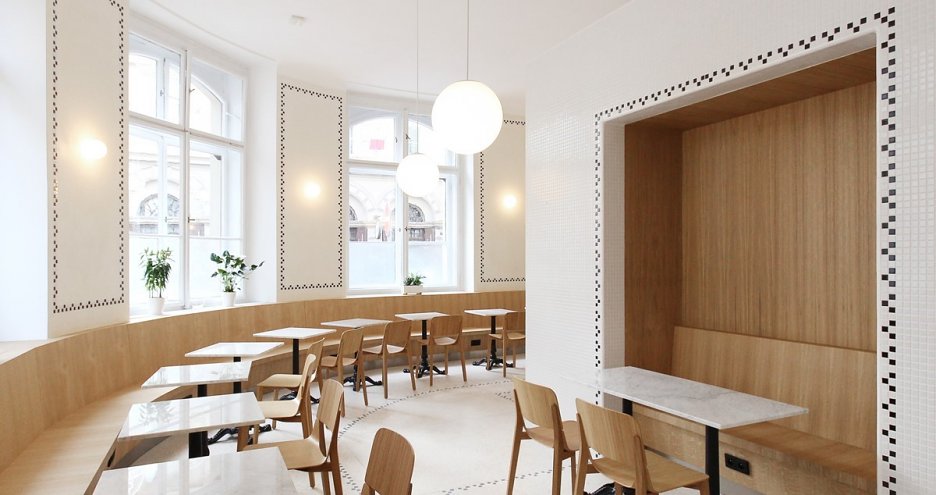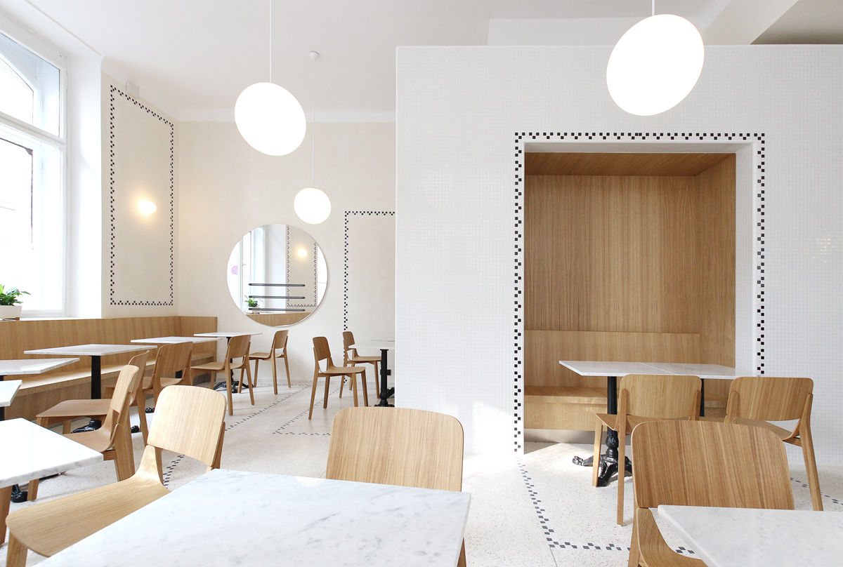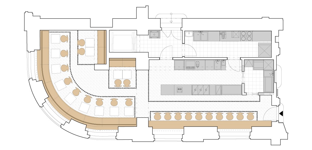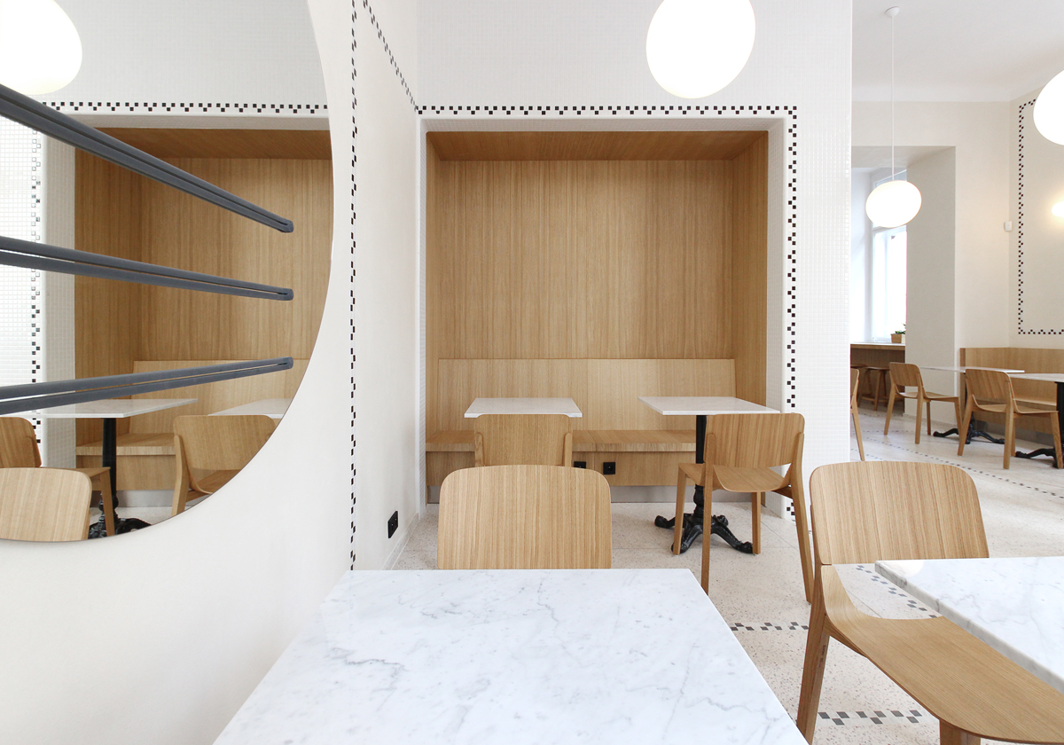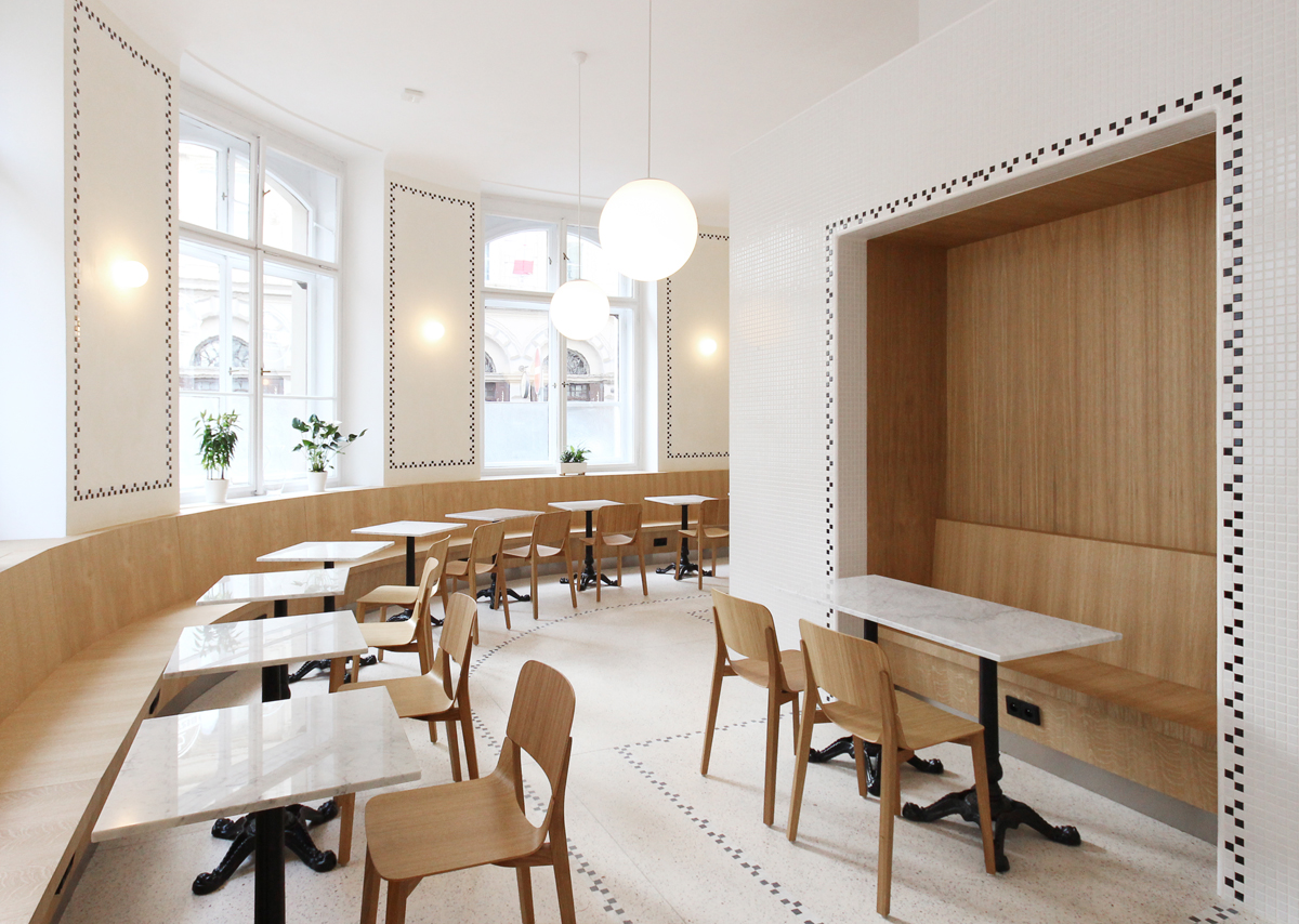Architekti navrhli renováciu verejne prístupných častí výdajne a sedenia. V interiéri pracujú s keramickou mozaikou, ktorá lemovaním akcentuje výklenky pre sedenie a výdaj jedla. Lemovanie plynule prechádza do podlahy zo svetlého terazza.