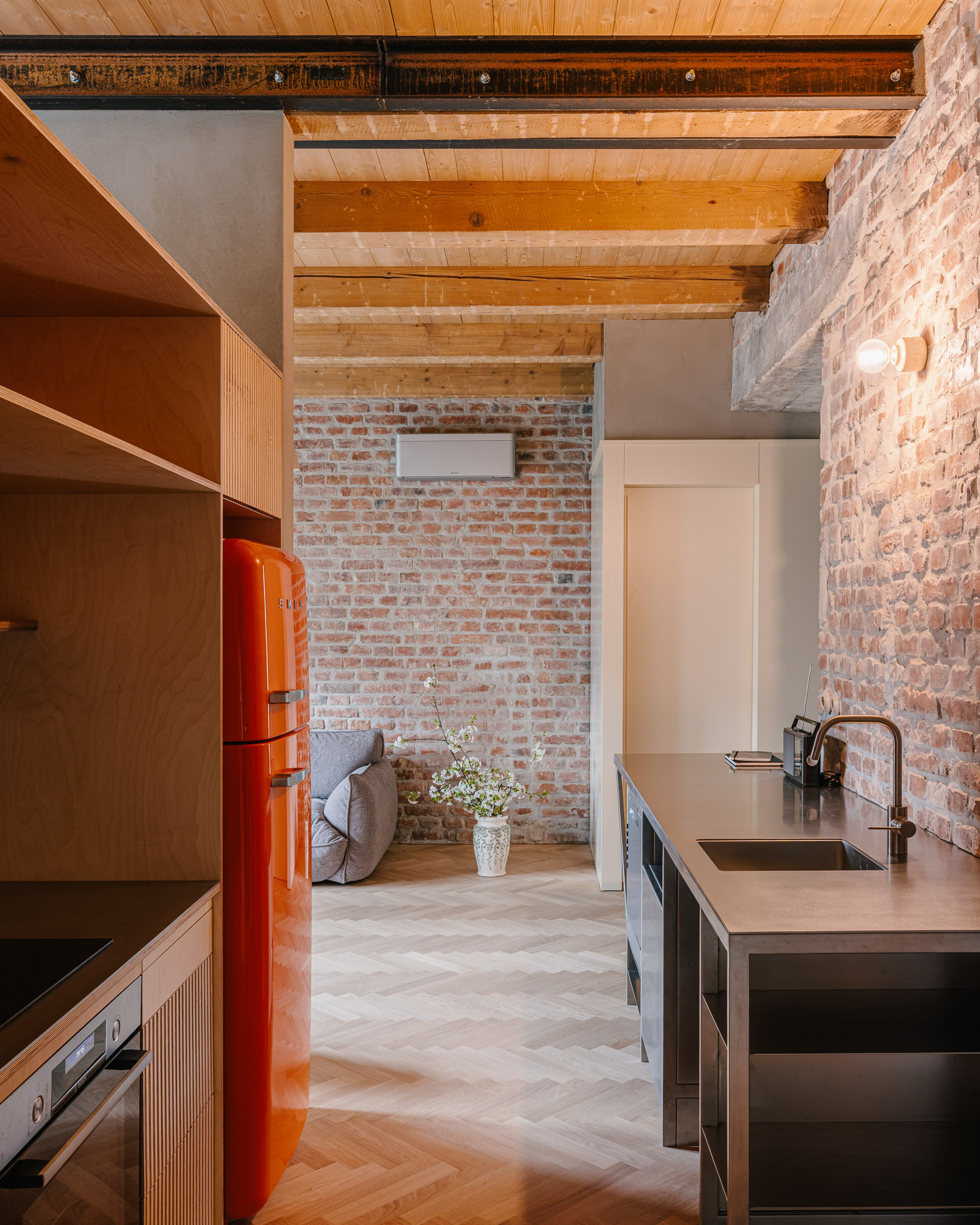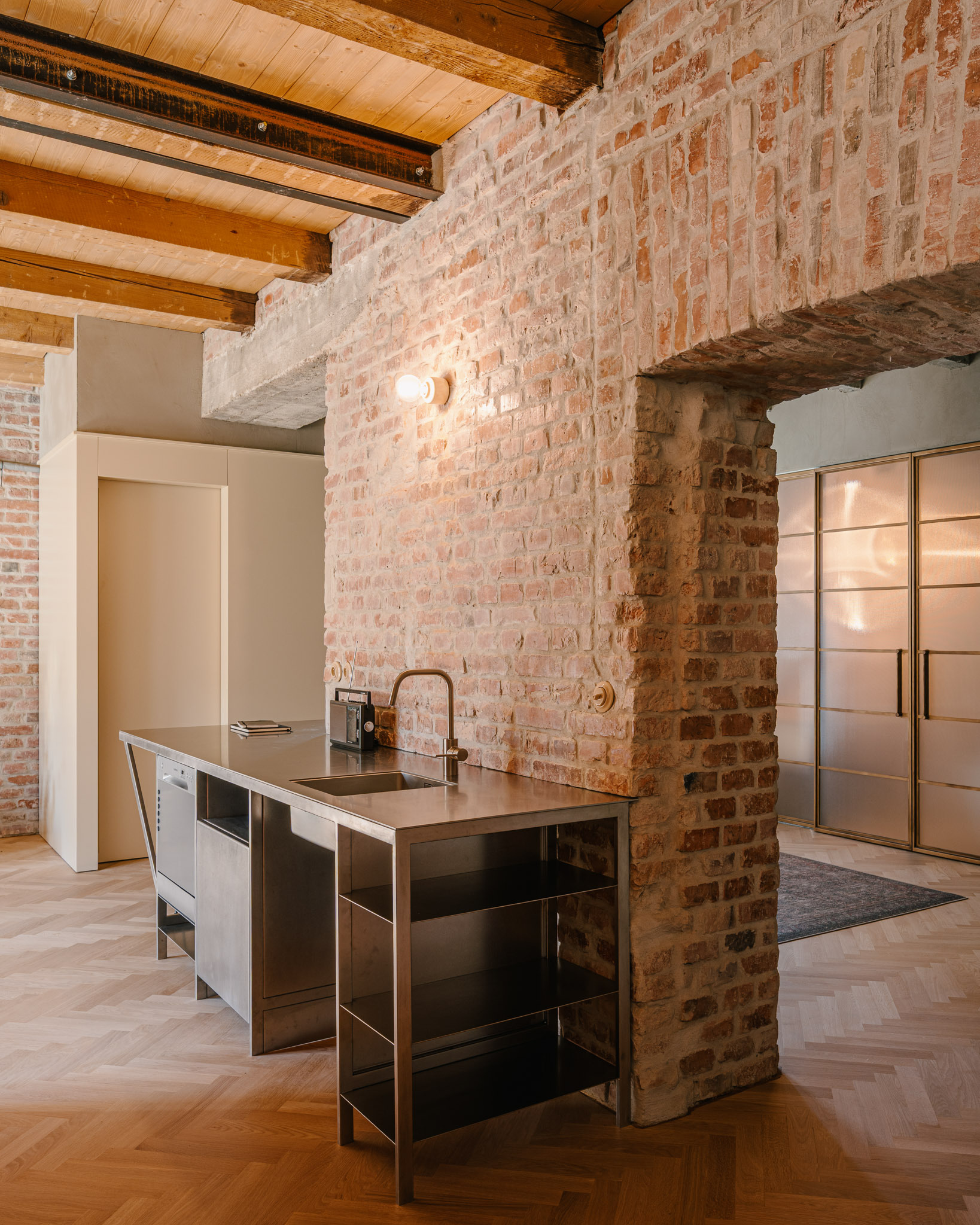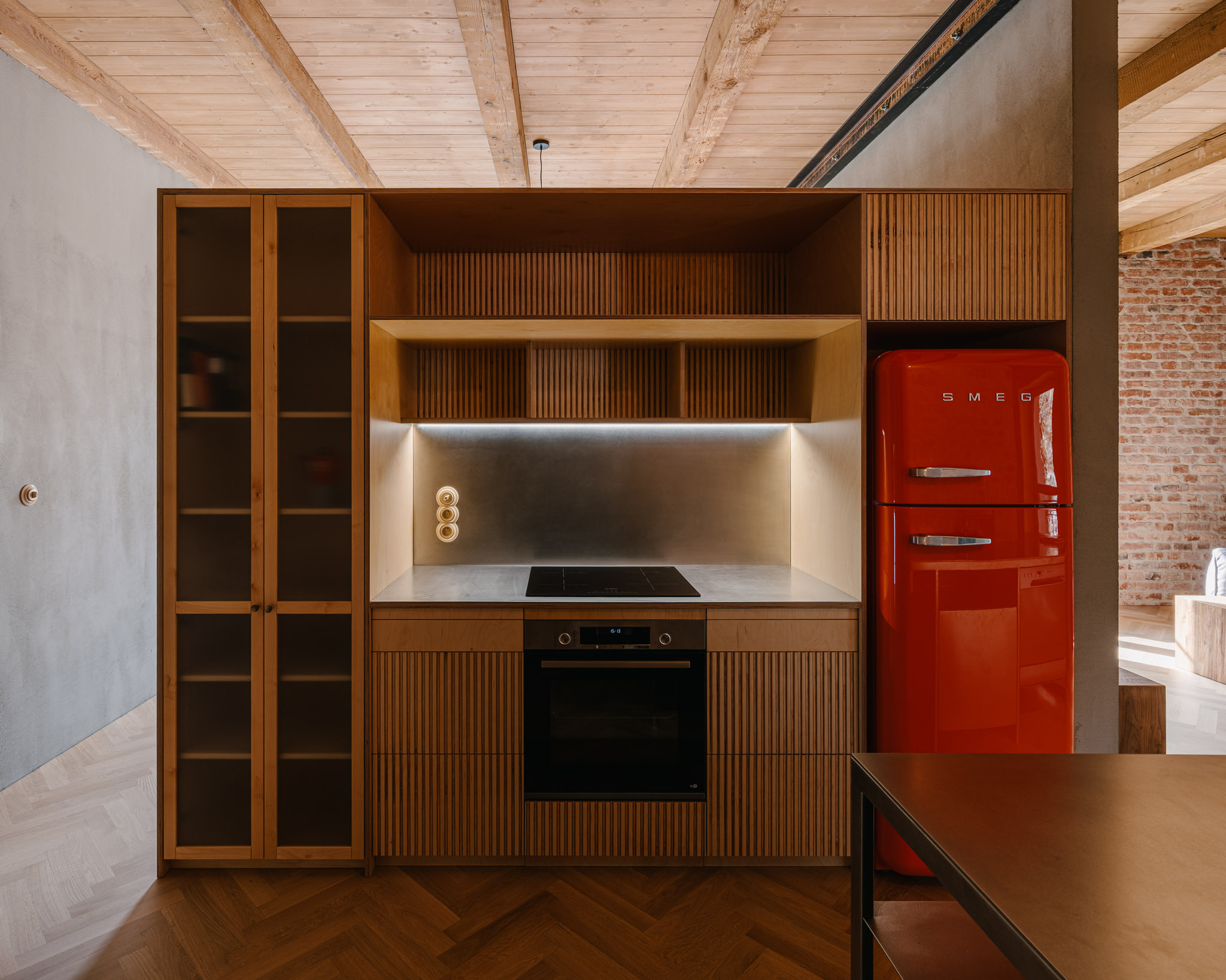 Celý priestor je poctou remeslu a pravdivosti materiálov – bez zbytočného prikrášľovania, zato s dôrazom na detail, autenticitu a architektonickú úprimnosť.