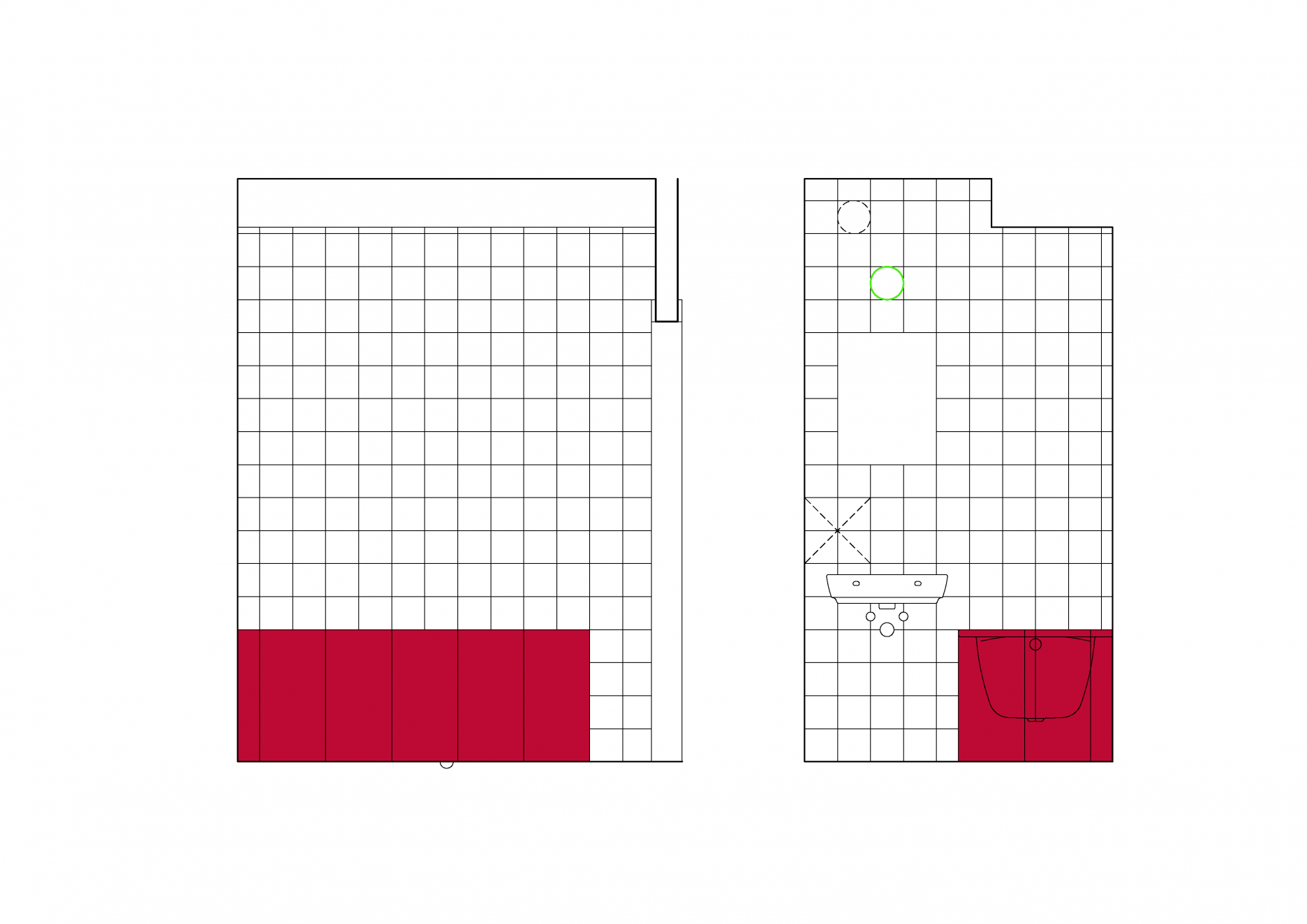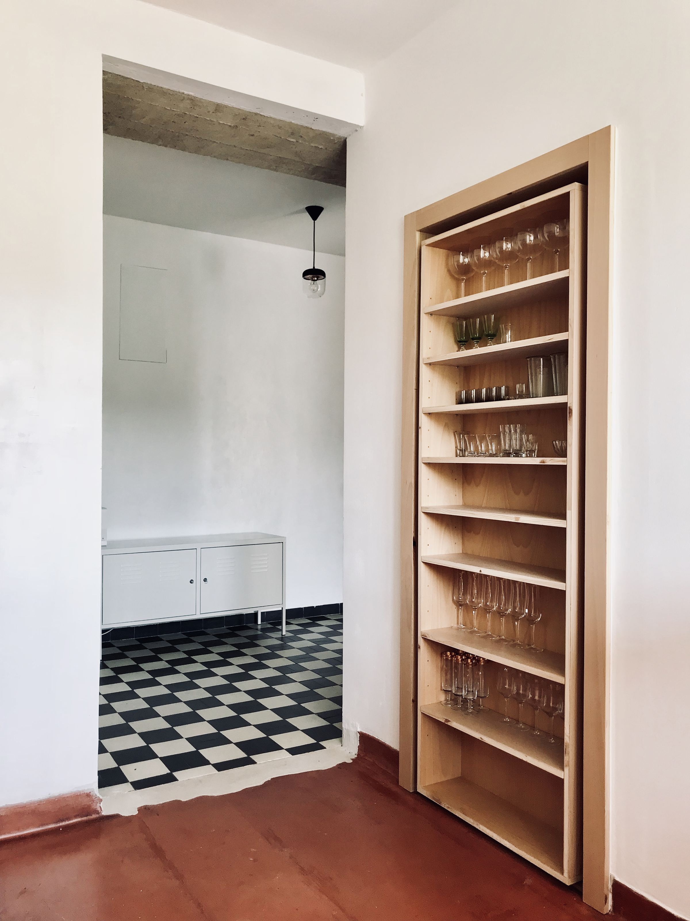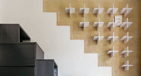 ZS: Je to dôsledok odstránenia pôvodnej oceľovej zárubne, odkaz na pôvodné dvere. Pokračuje aj v nátere pôvodnej steny, jednoducho sme túto trhlinu zaliali aby bola v jednej rovine s podlahou chodby. Priznali sme jej povrchovú a tvarovú nedokonalosť, ktorá je súčasťou priestoru.