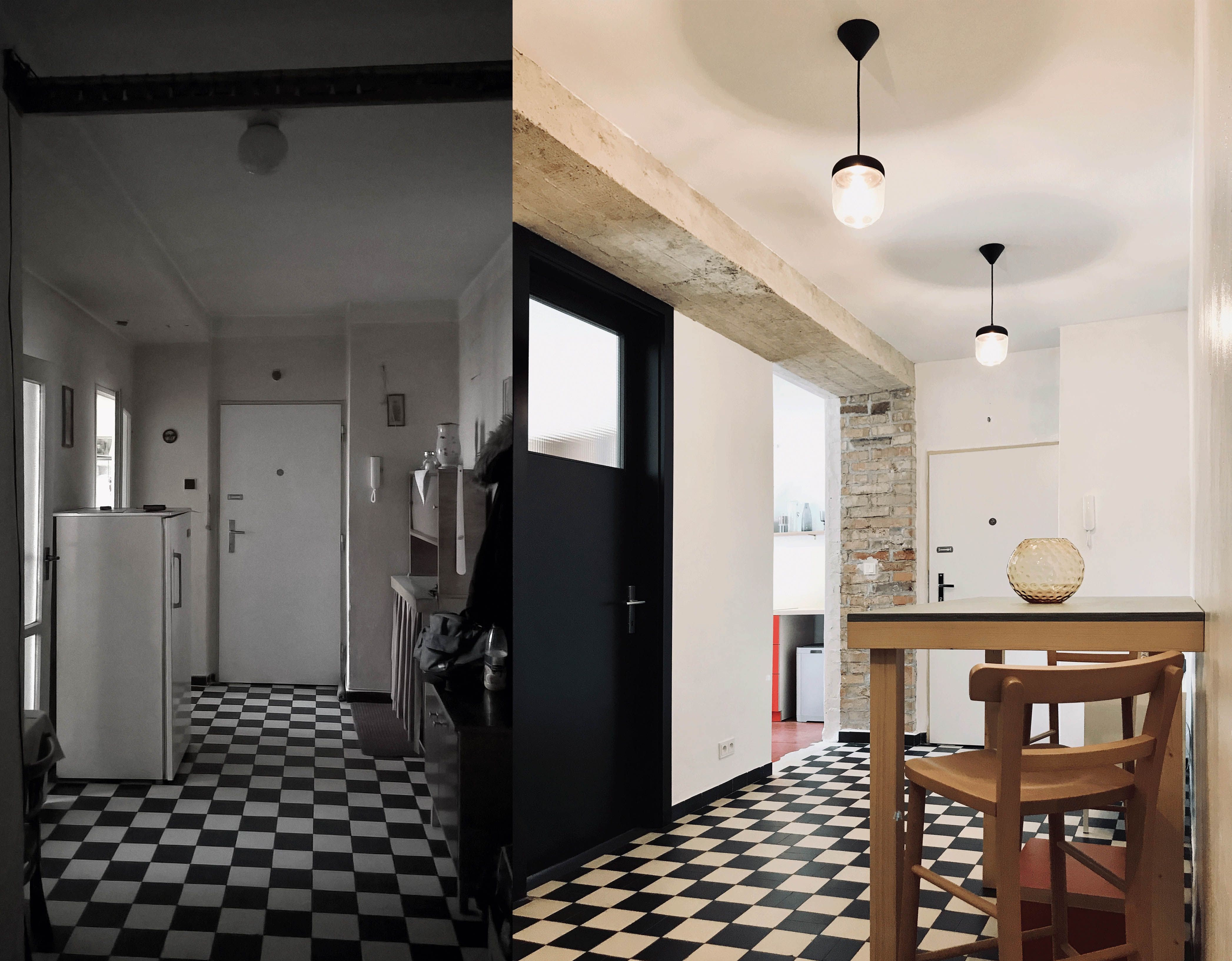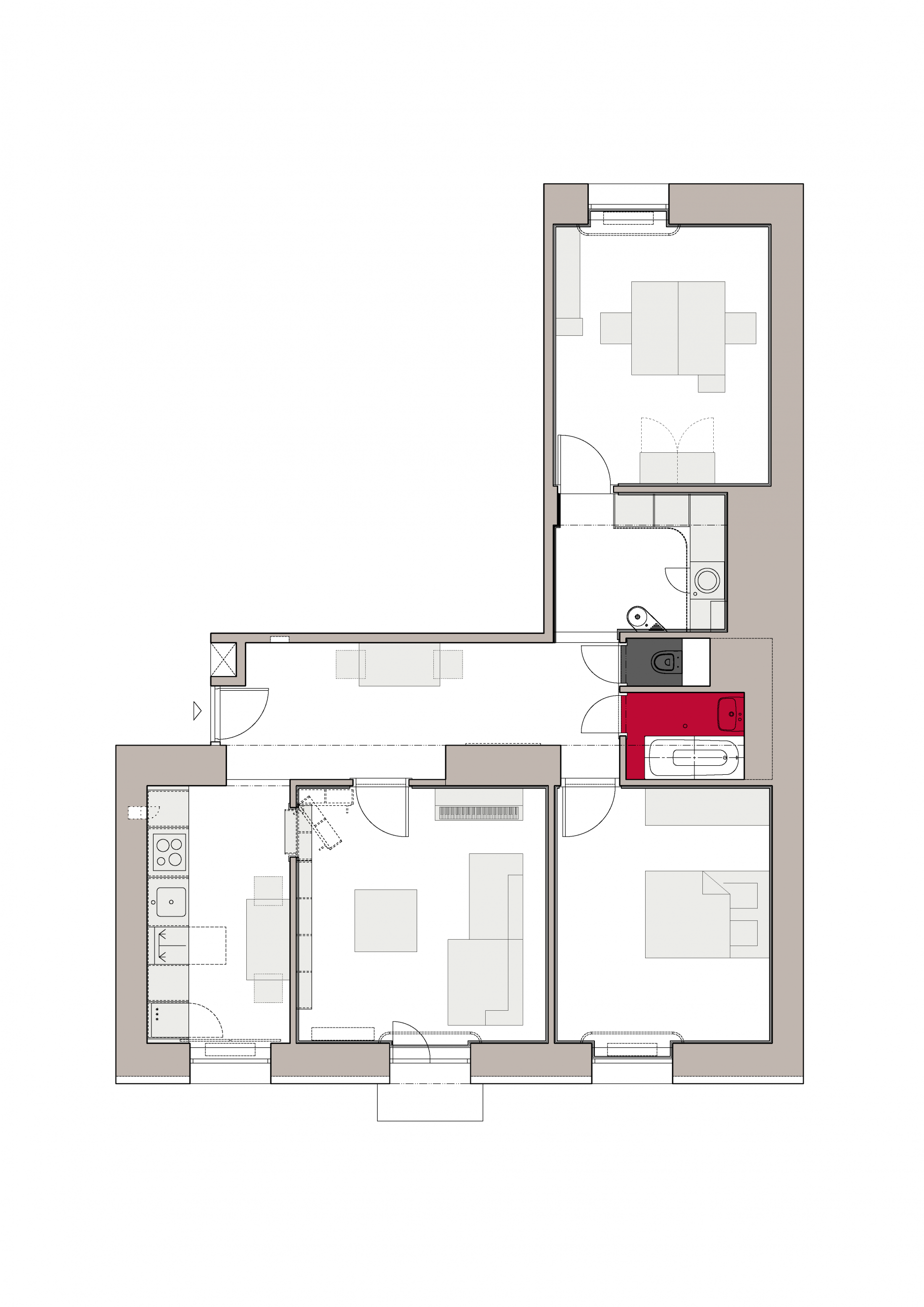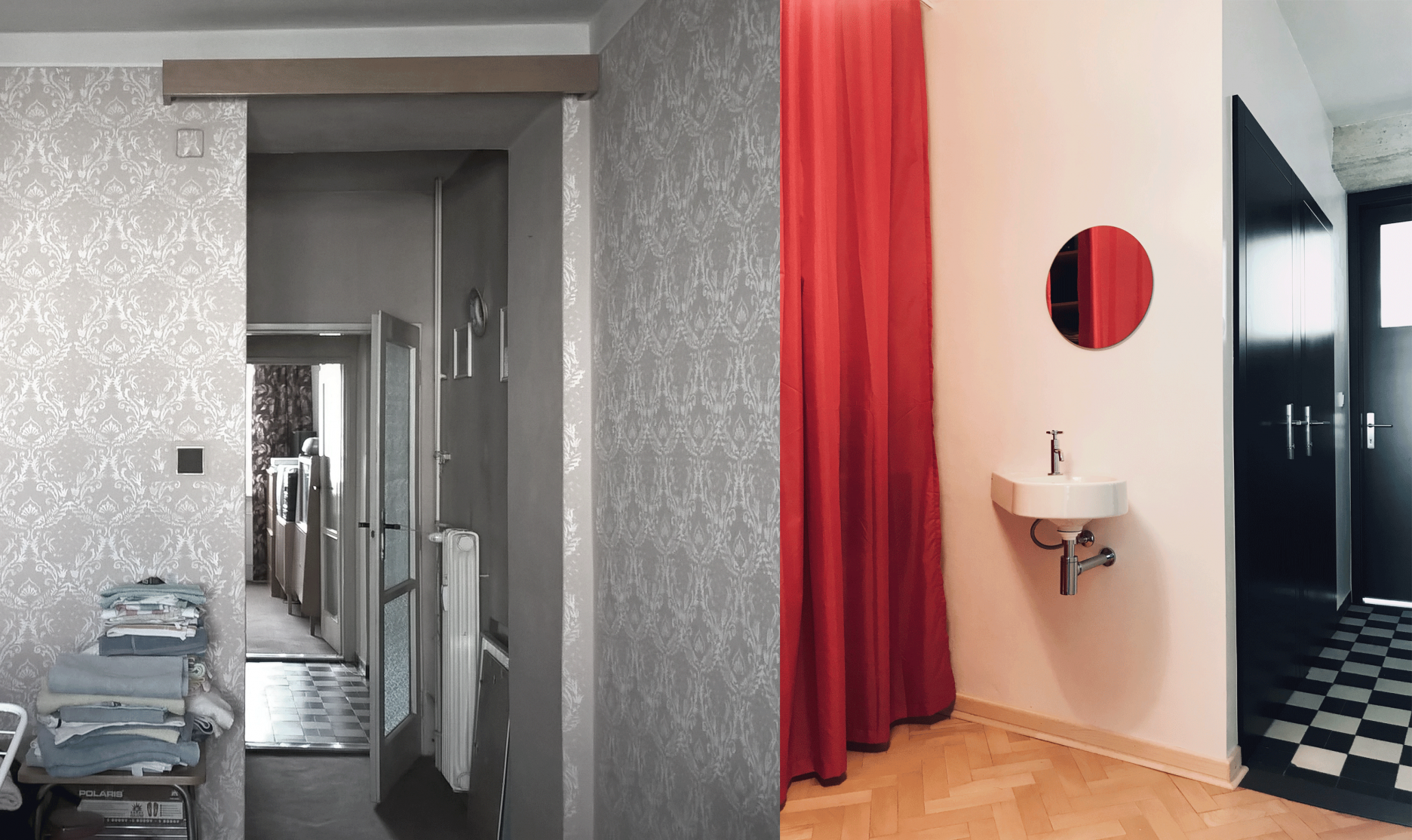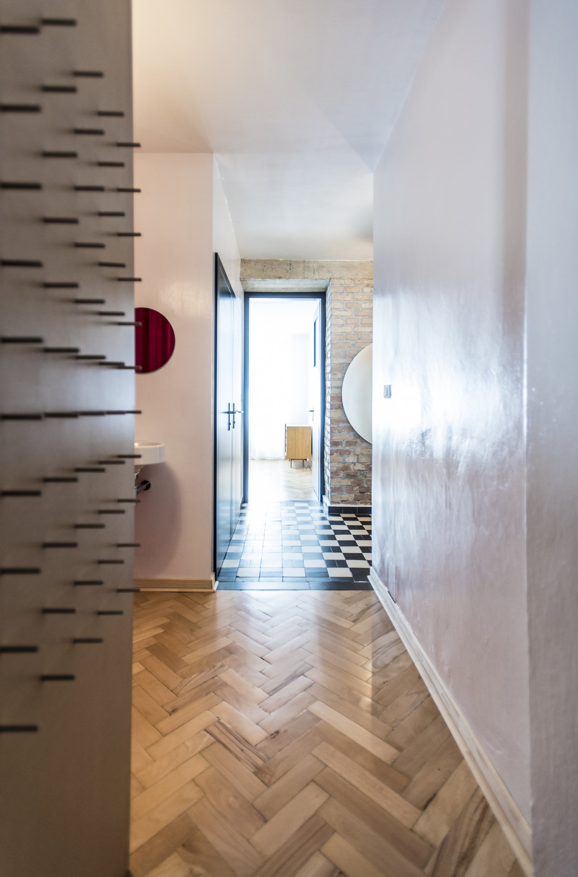 Interiér v staršom dome, v blízkosti rušného dopravného uzla, si zachováva svoj ráz a zároveň spĺňa požiadavky na komfortné súdobé bývanie. Stavebnými úpravami sa podarilo výraznejšie “otvoriť” dispozíciu preplávajúceho bytu. Pôvodná stavebná esencia s priznanými povrchmi a materiálmi vytvára nevšednú kulisu každodenného života.