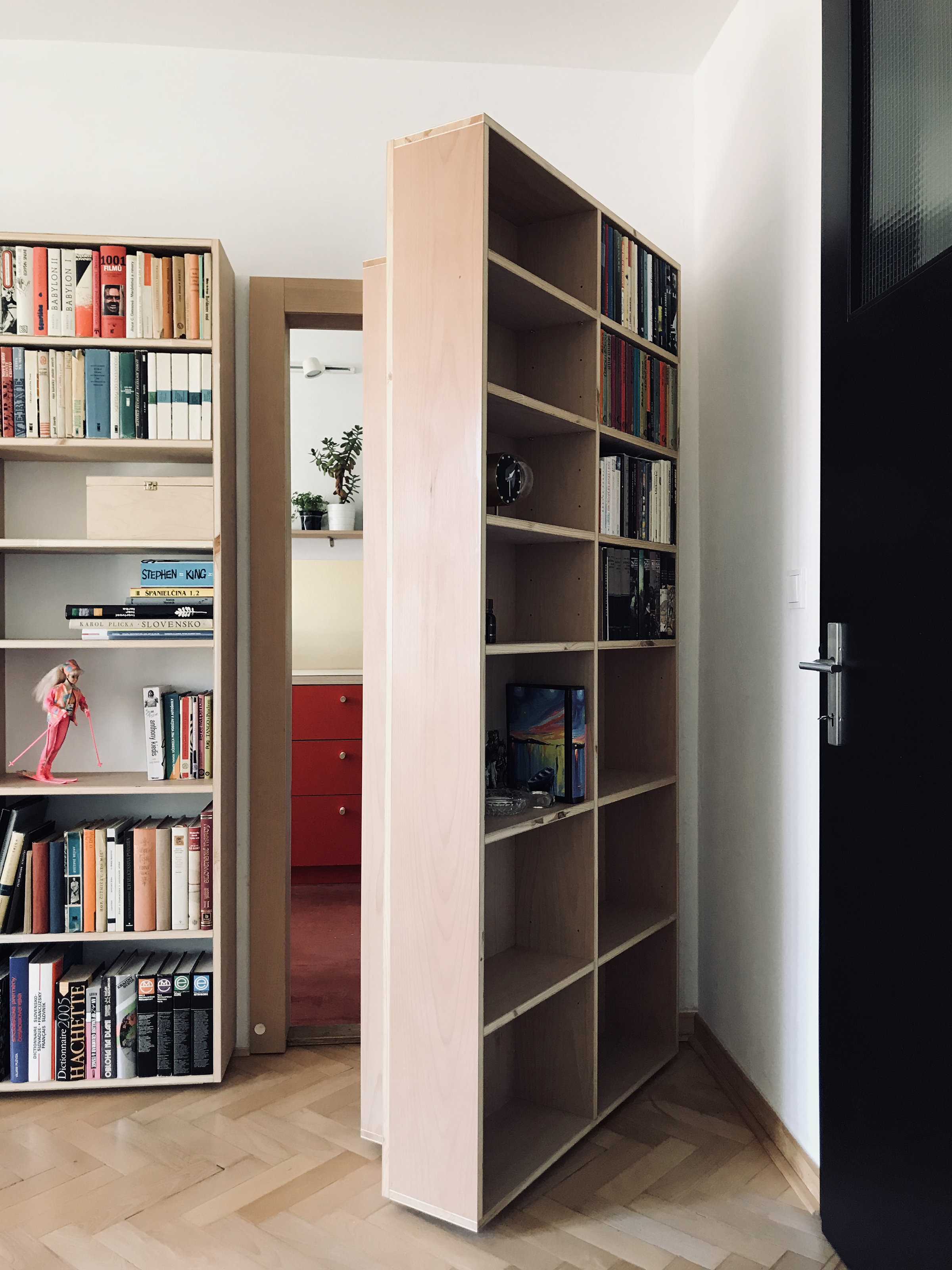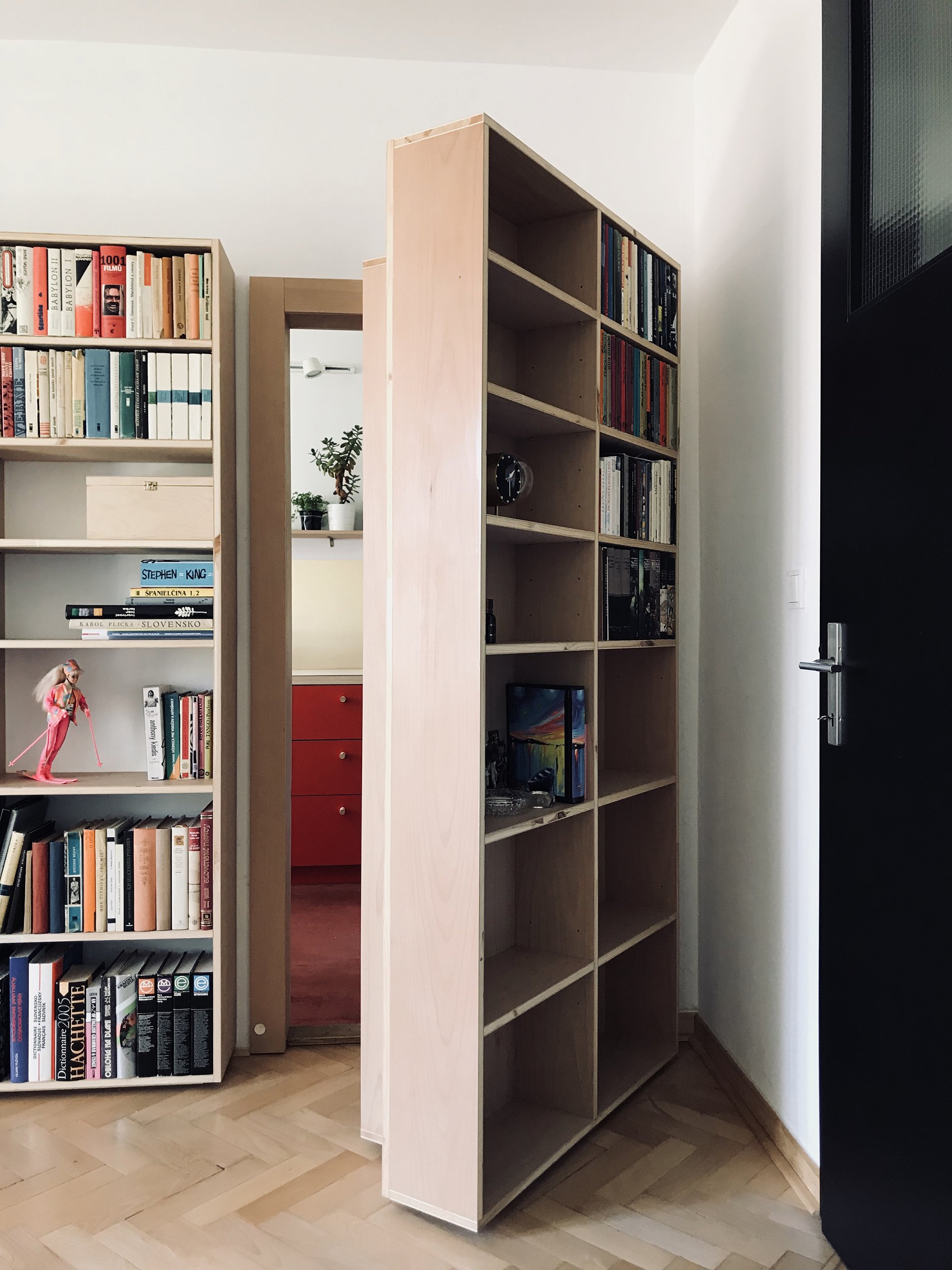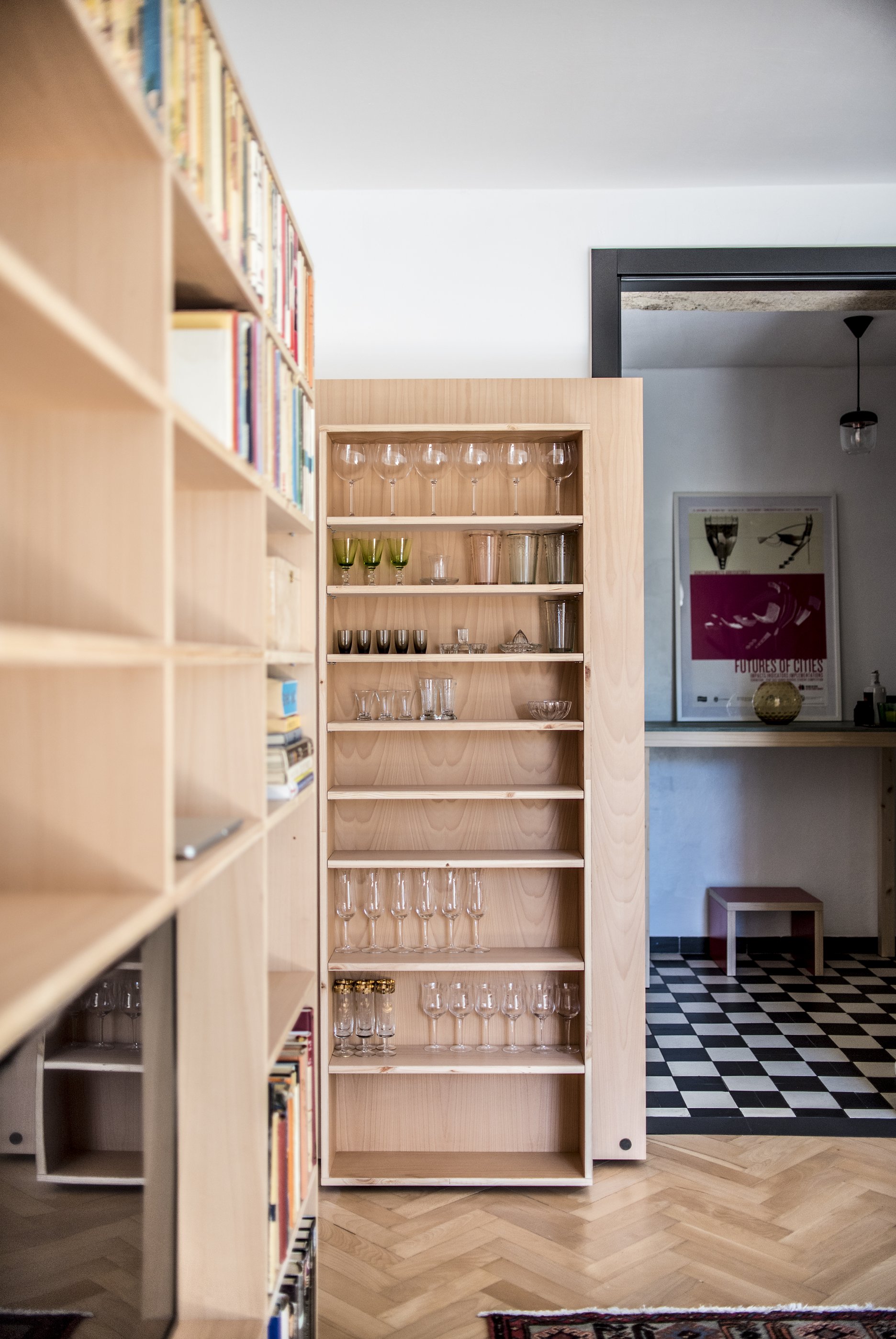 Doplňujúcim prvkom sa stalo drevo v dvoch prevedeniach. V nadväznosti na pôvodné bukové parkety architekt zvolil biodosku z tej istej dreviny, ktorá je použitá na “stratených dverách” do kuchyne. Na mieste pôvodného priechodu je osadený otvárateľný policový systém, ktorý slúži ako knižnica zo strany obývačky a praktický odkladací systém zo strany kuchyne.