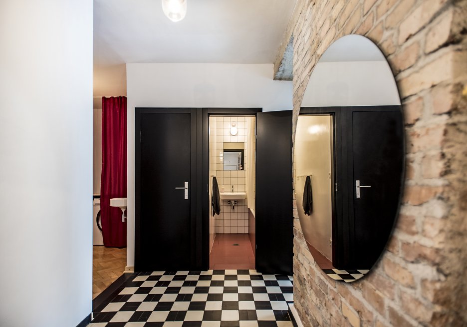Nerovnosti na stenách v chodbe a šatníku ostali zámerne zachované. Steny sú pre zvýraznenie pôvodného povrchu v týchto miestach natreté lesklou farbou.