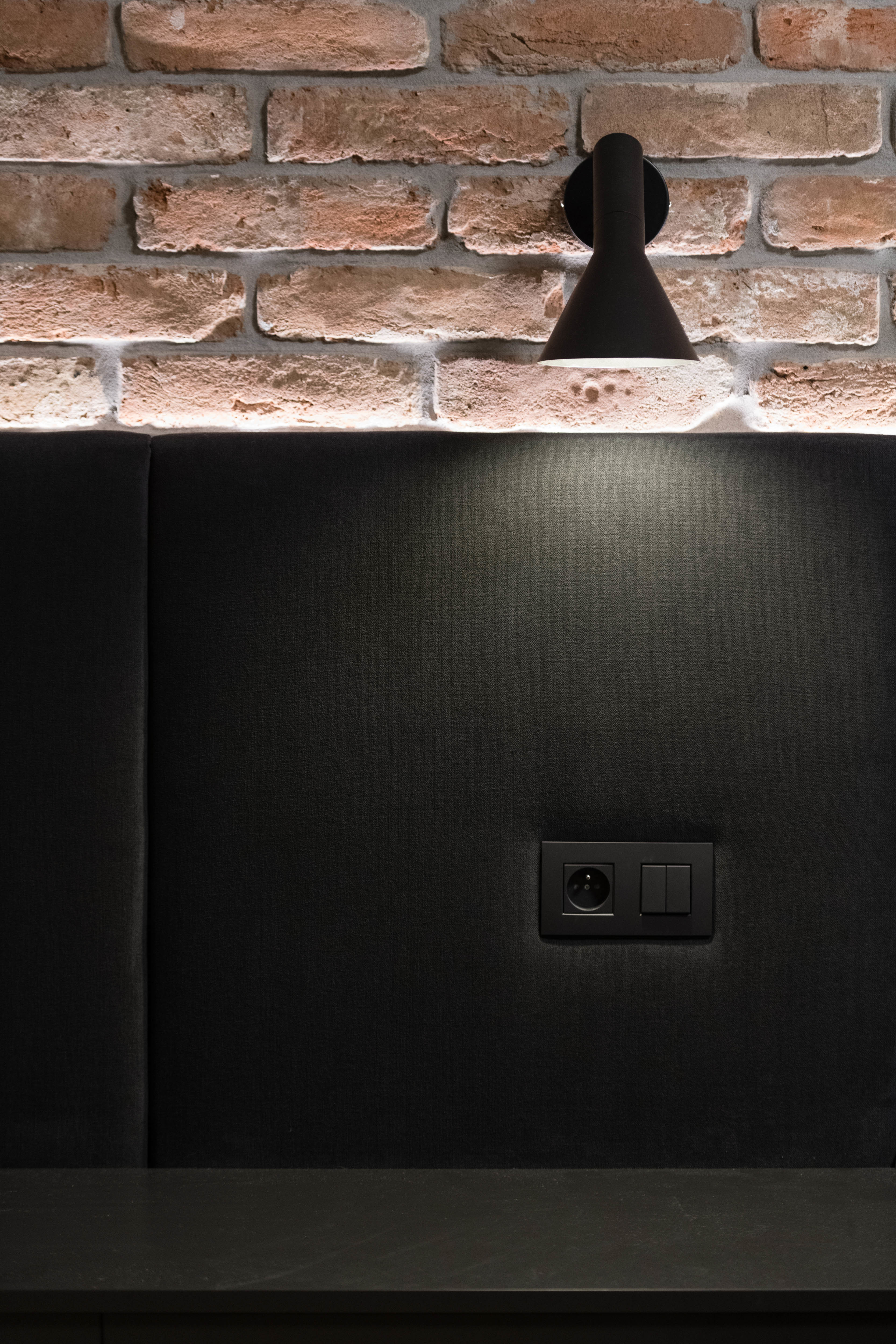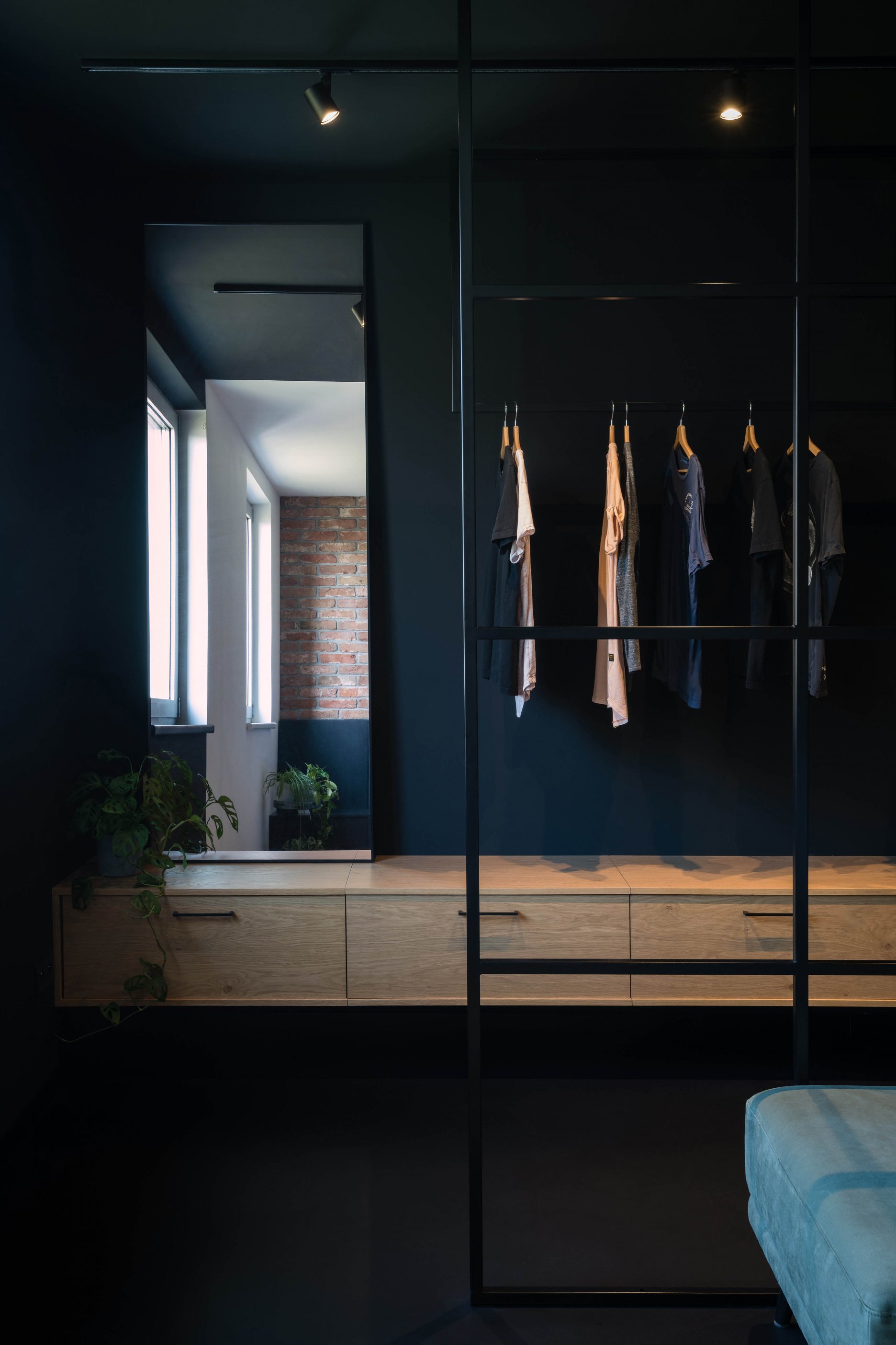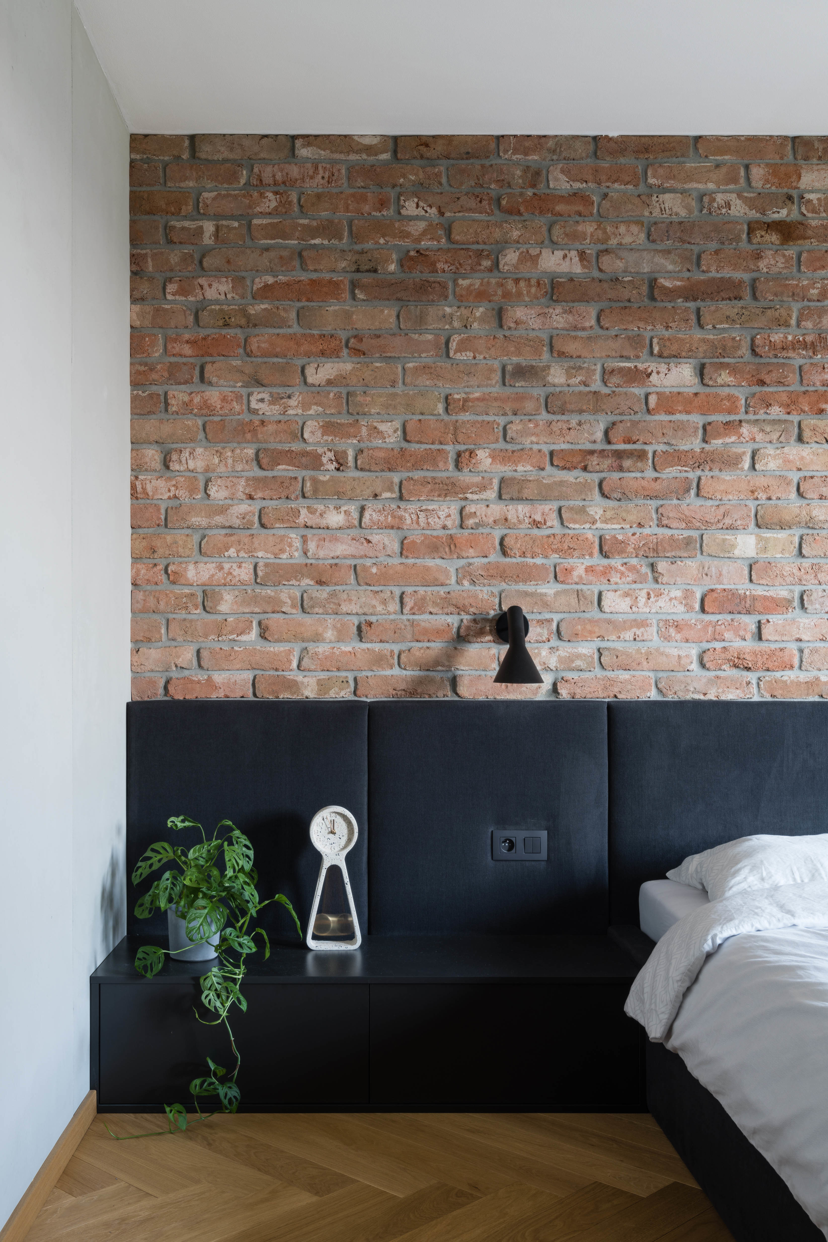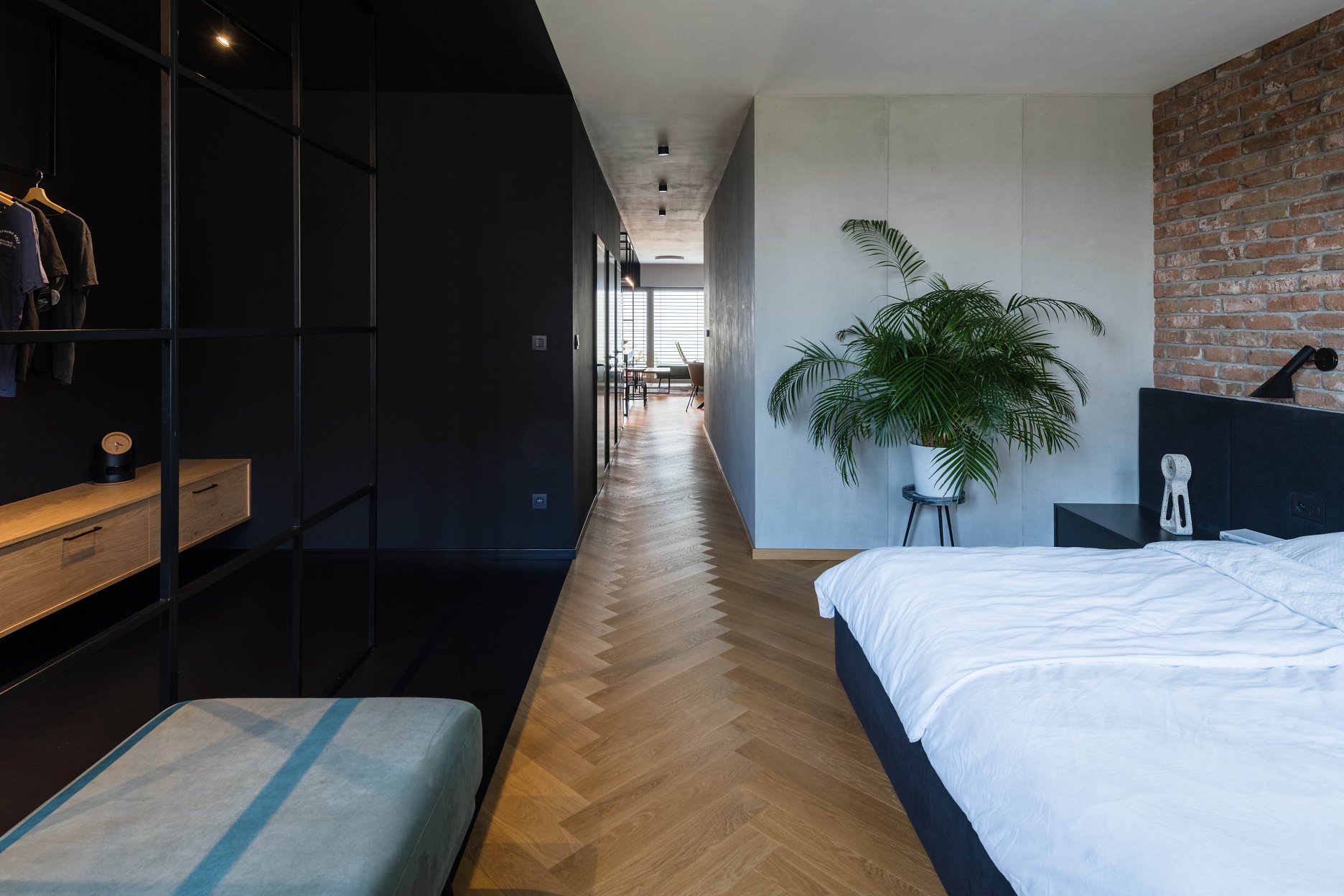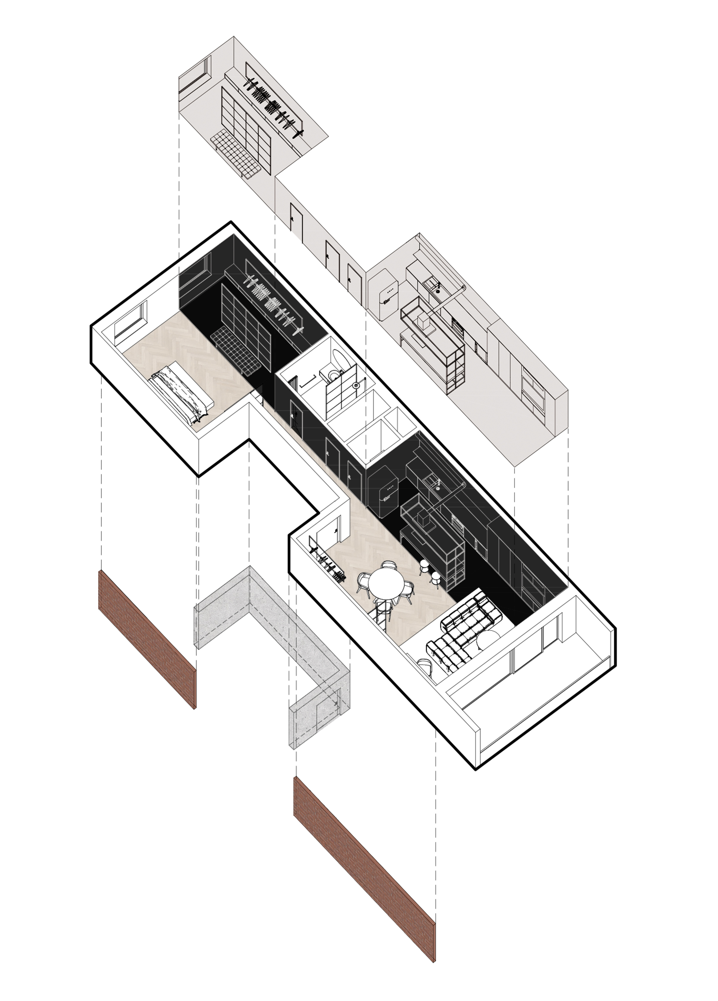 V úvodnej časti návrhu sme byt oslobodili od takmer všetkých existujúcich priečok. Následne sme vytvorili jasný koncept otvorenej dispozície, kde sú hlavné obytné priestory, bez oddelenia priečkami doplnené "obslužnými" funkciami, vizuálne spojenými do tmavého "boxu". Spálňa je doplnená otvoreným šatníkom, nasleduje blok hygieny a hlavný obytný priestor spojený s kuchyňou. Protiľahlá strana bytu pracuje s materialitou surového betónu a červenej pálenej tehly, ako kontrastnej štruktúry k jednoliatemu čiernemu náprotivku.