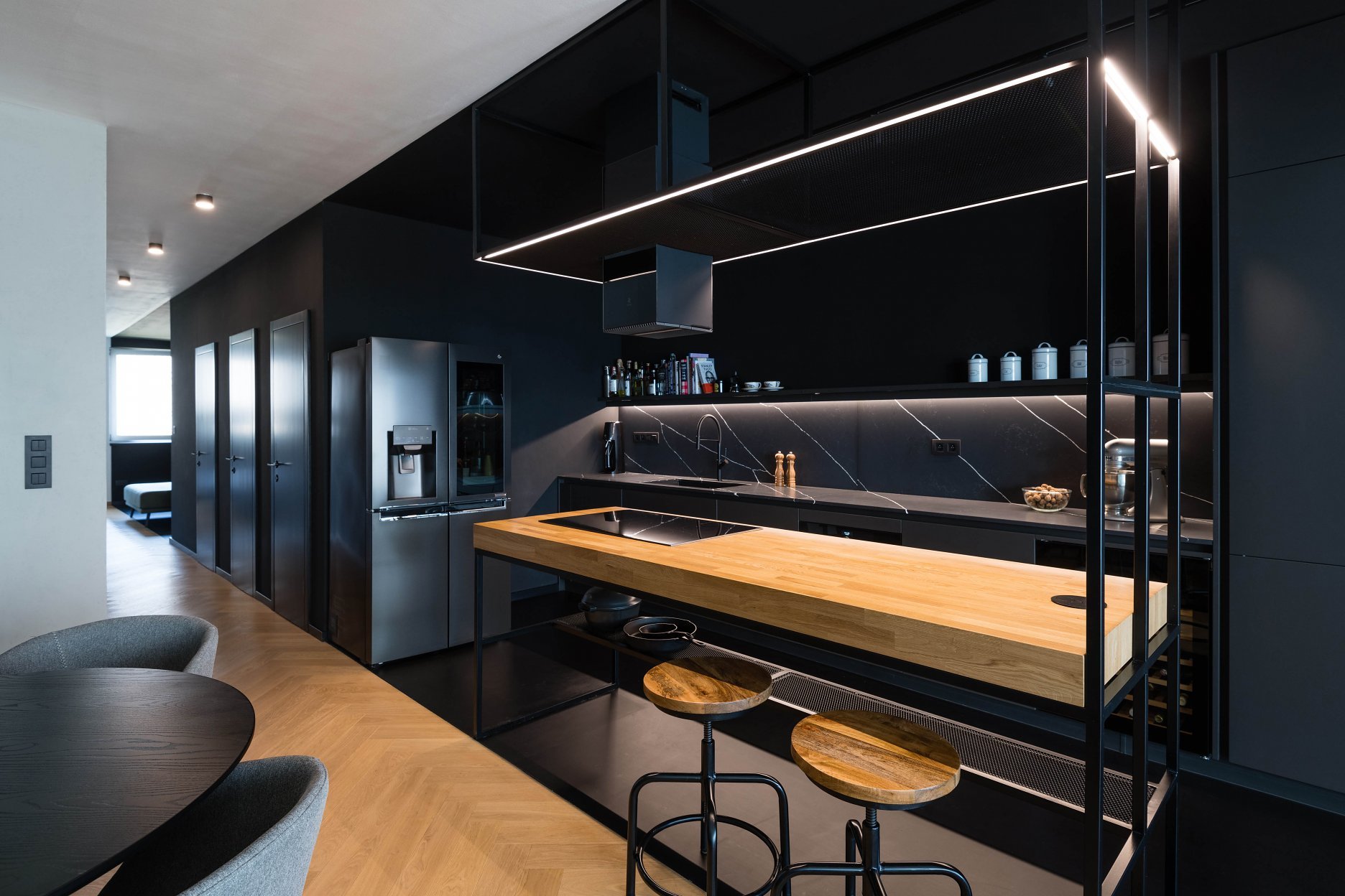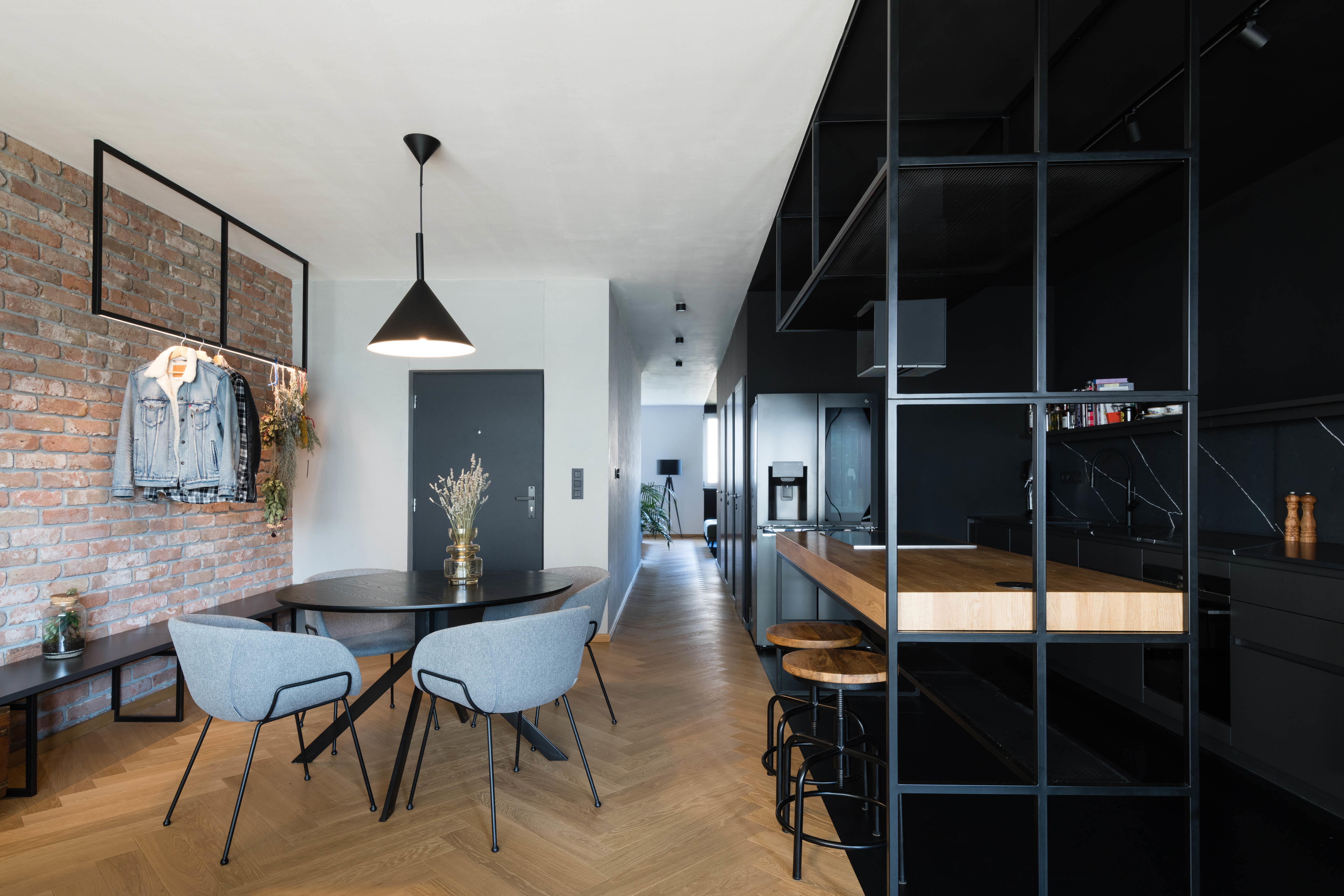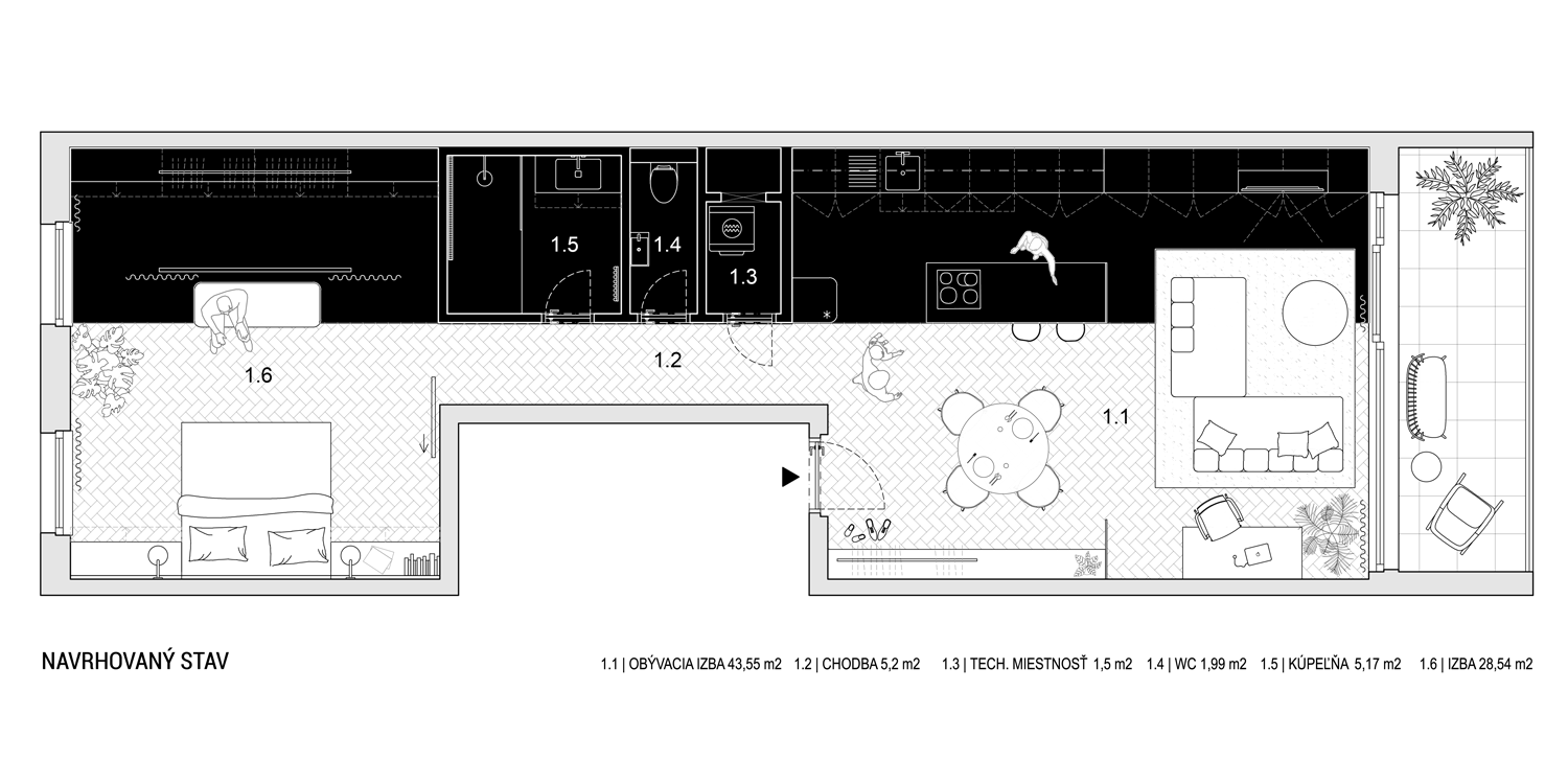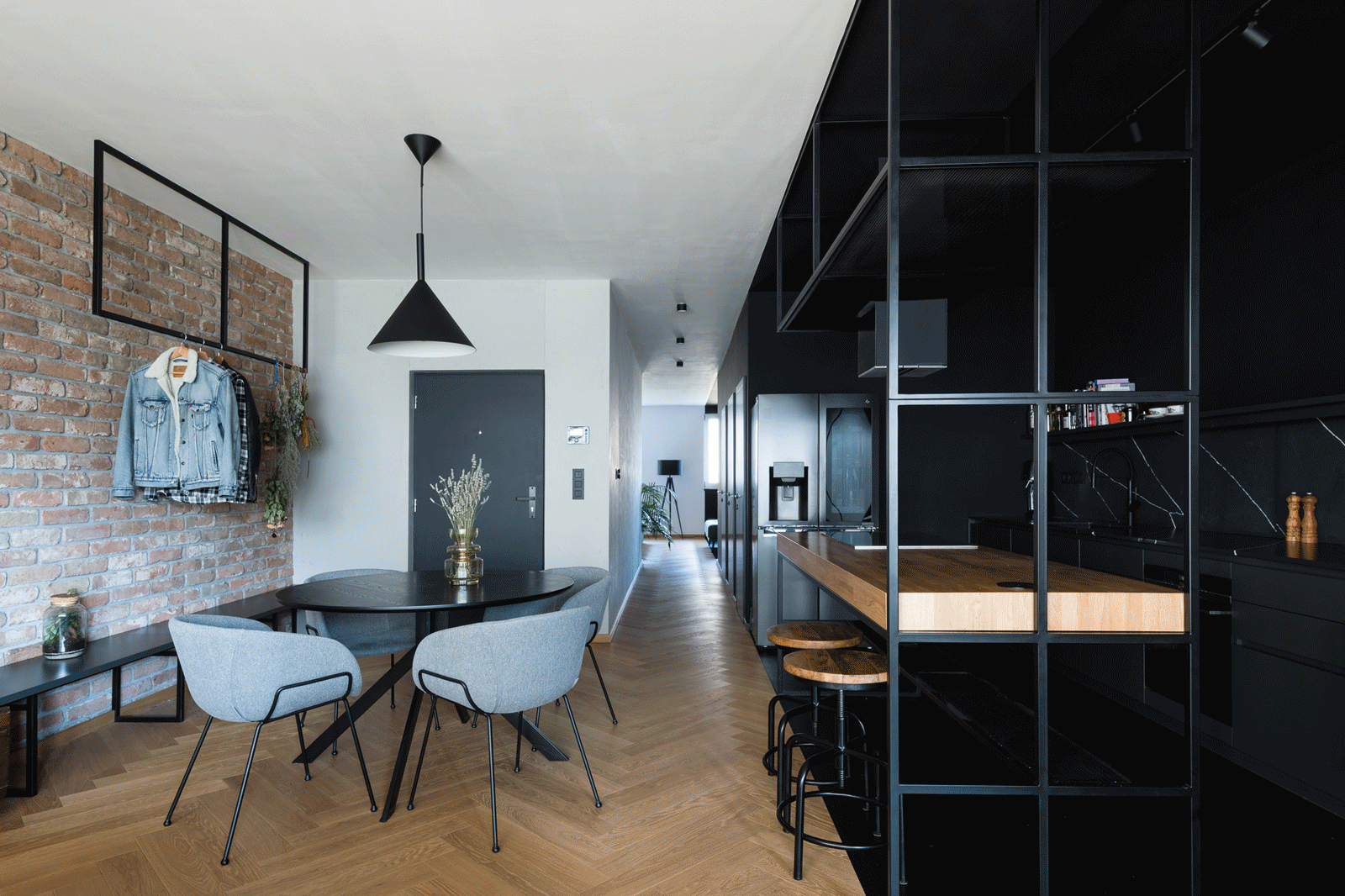 Zriedkavo sa deje, že by sme dispozične menili byt z trojizbového na dvojizbový. Navyše s požiadavkou otvorenej dispozície plynúceho priestoru od obývacej až po spaciu časť. Pri tomto novom delení priestoru sme vytvorili pôdorys s jasným členením obytnej a obslužnej časti, čo sme podporili aj vizuálnym odčlenením plynúceho čierneho boxu celým bytom.