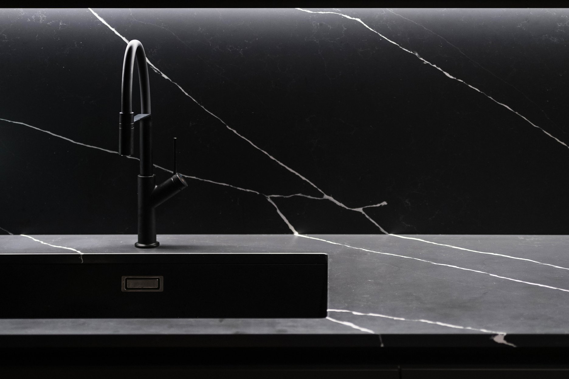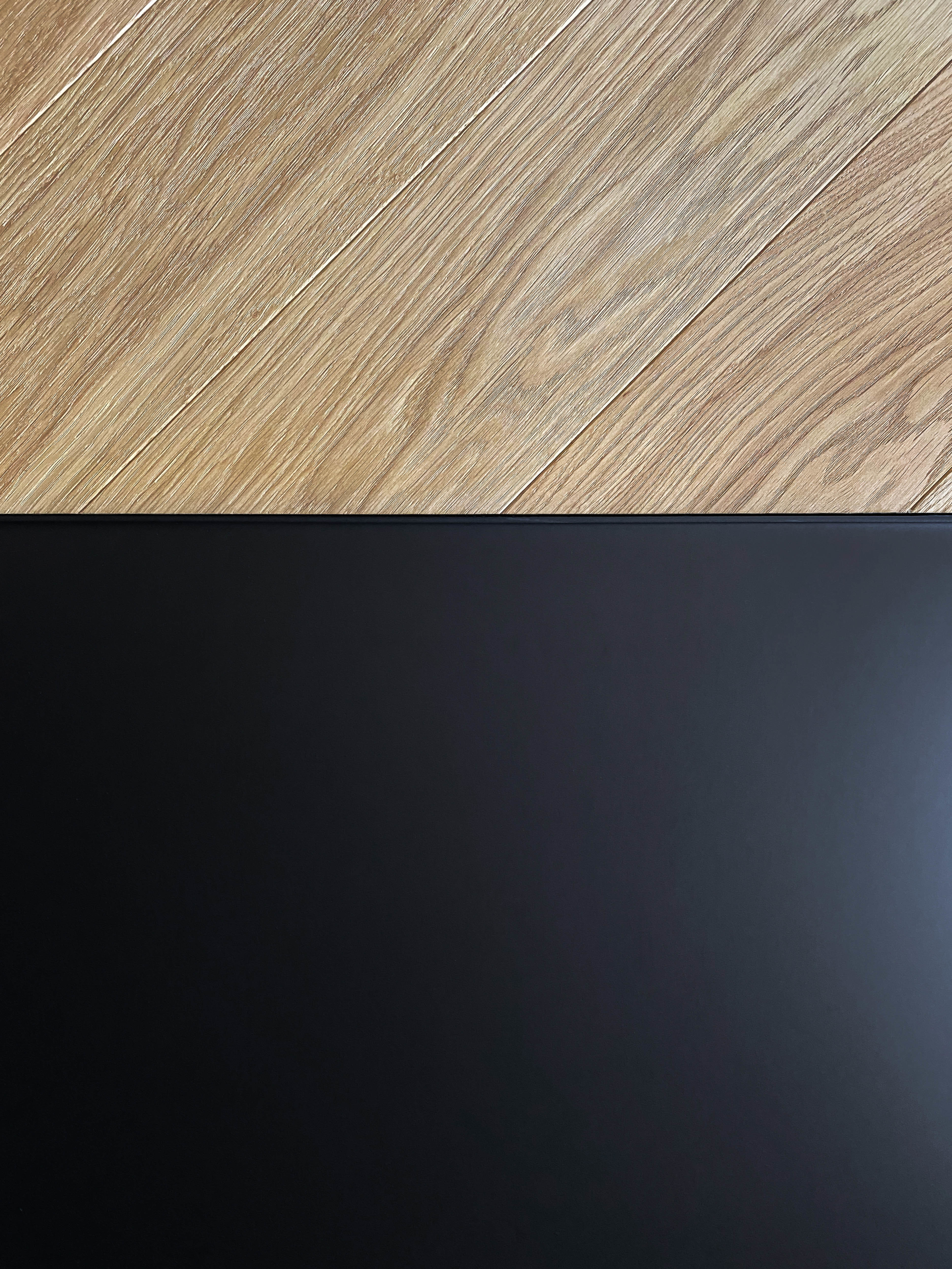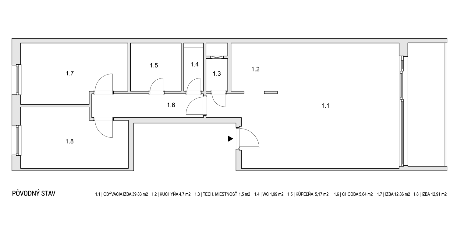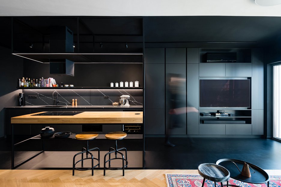 Zriedkavo sa deje, že by sme dispozične menili byt z trojizbového na dvojizbový. Navyše s požiadavkou otvorenej dispozície plynúceho priestoru od obývacej až po spaciu časť. Pri tomto novom delení priestoru sme vytvorili pôdorys s jasným členením obytnej a obslužnej časti, čo sme podporili aj vizuálnym odčlenením plynúceho čierneho boxu celým bytom.