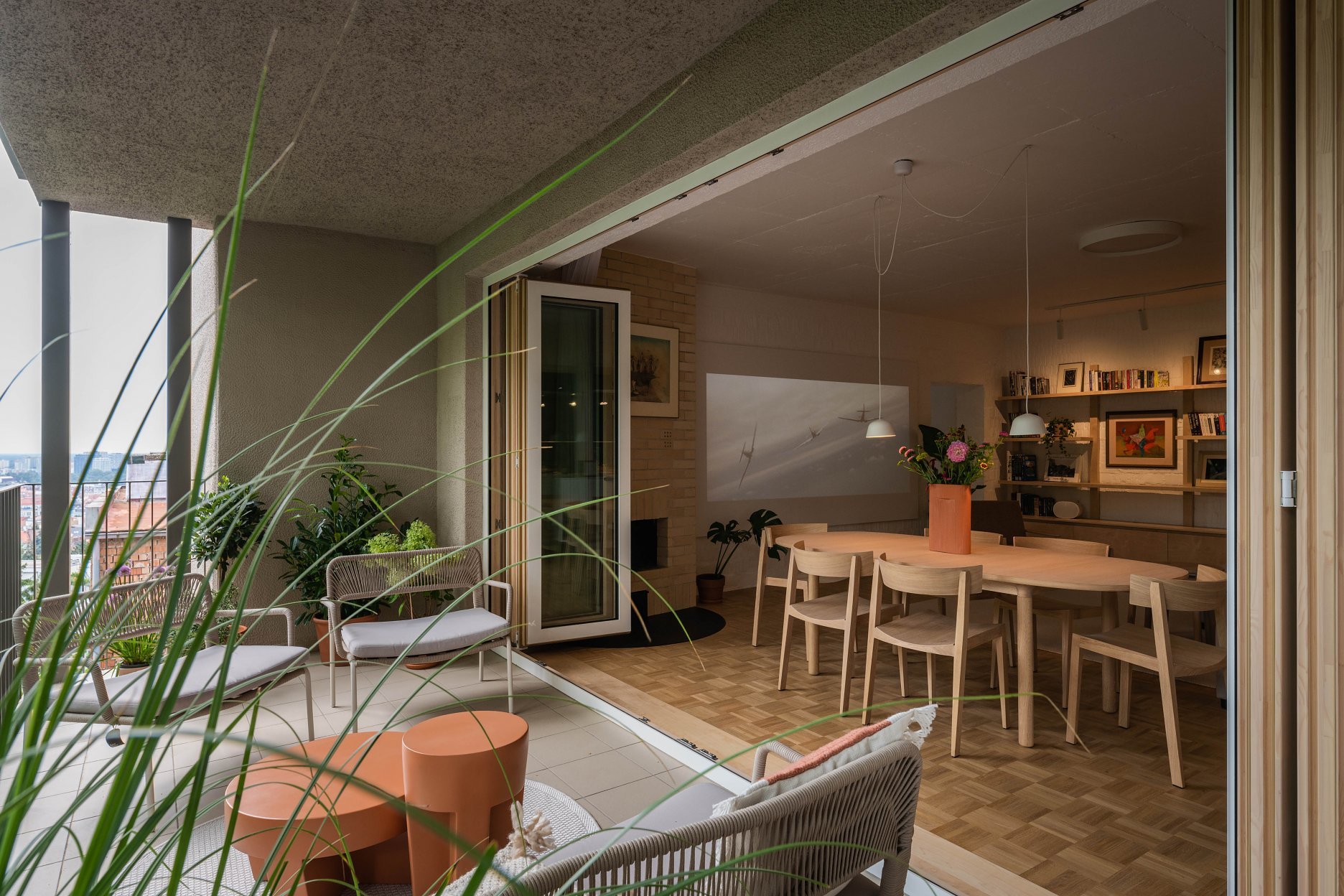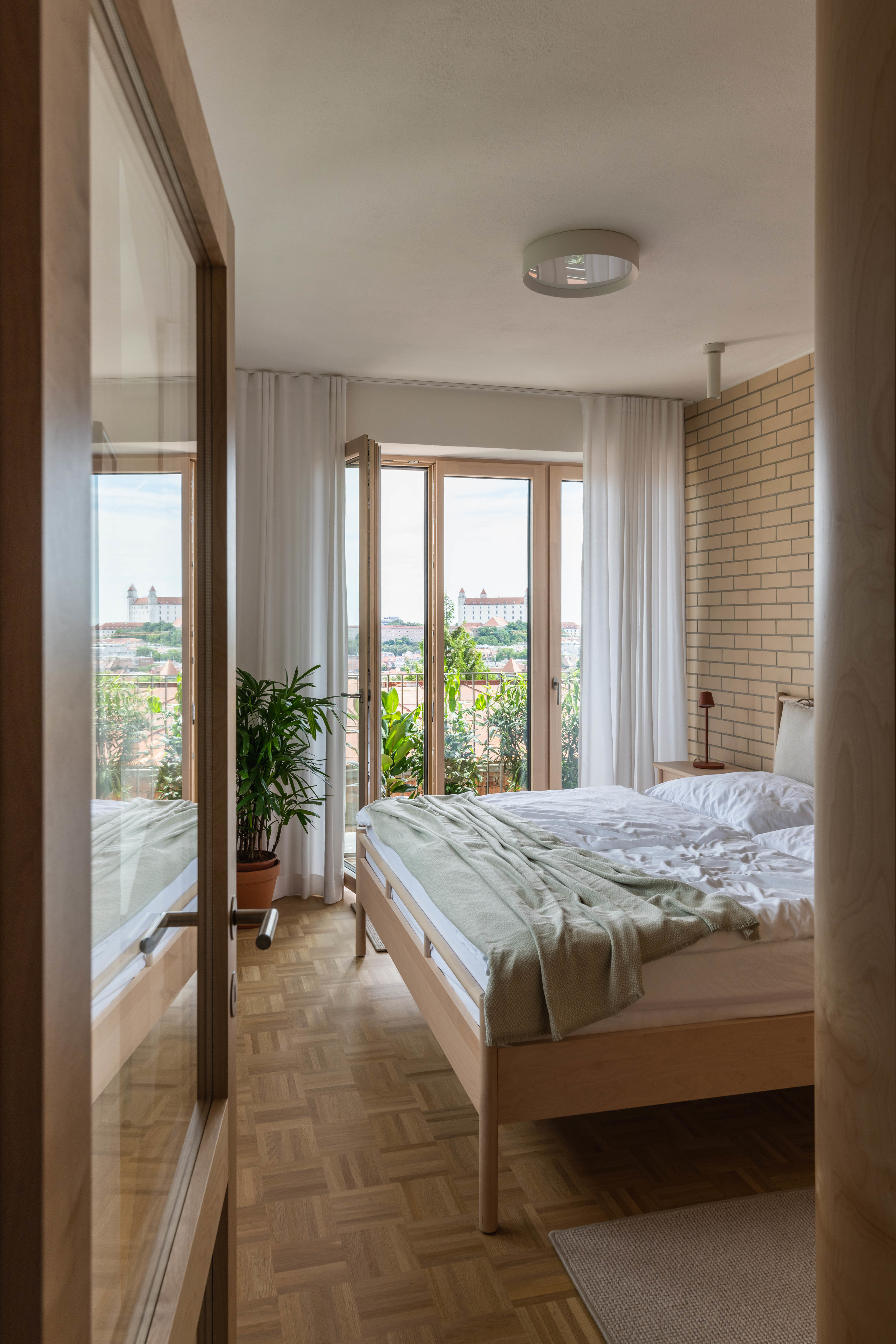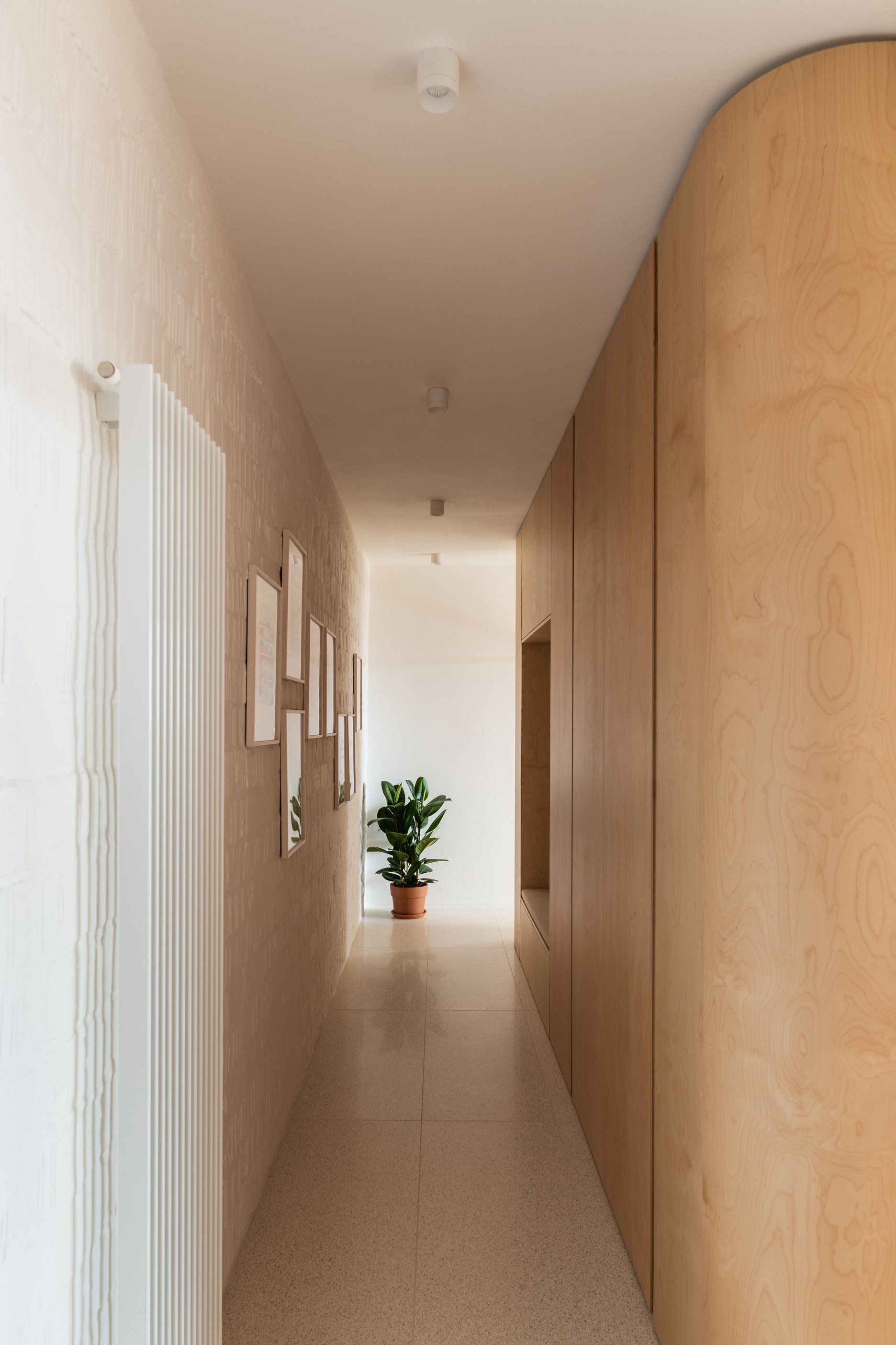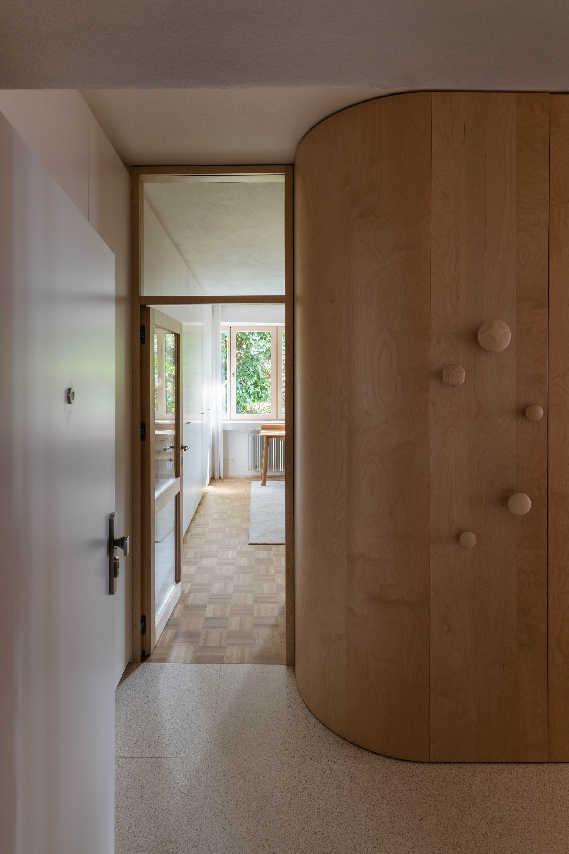 Terasa vystupujúca z východnej loggie sa po zložení FS portálu stane súčasťou centrálneho traktu - človek má pocit, že sa ocitá priamo v korunách stromov. Znížené parapety na južnej fasáde zas prinášajú viac svetla do nočnej zóny a cez translucentné dvere s nadsvetlíkmi putuje svetlo ďalej do chodby. Oblúkové nárožia vstavaných nábytkov z brezovej preglejky zmäkčujú pohyb po byte.