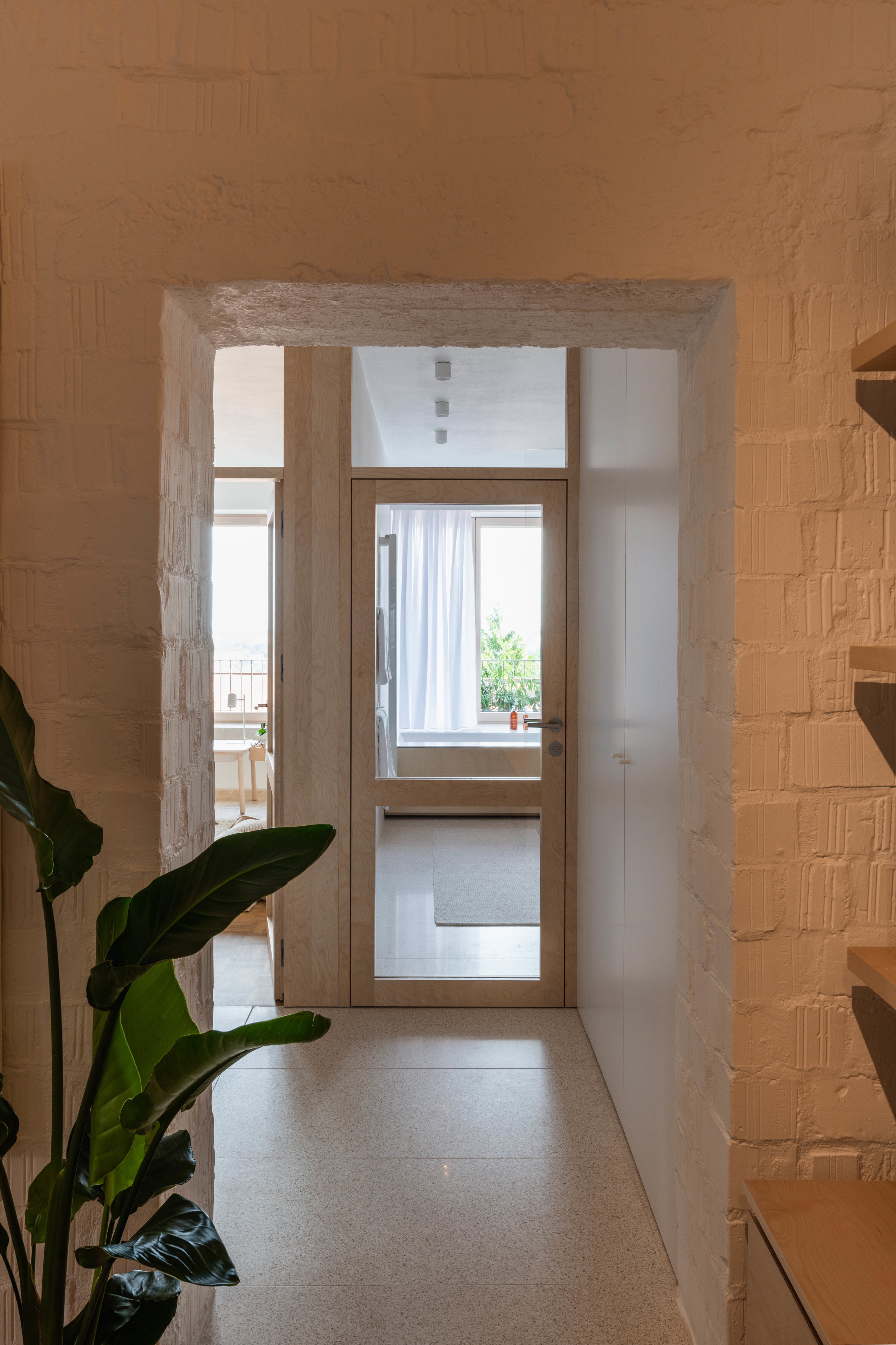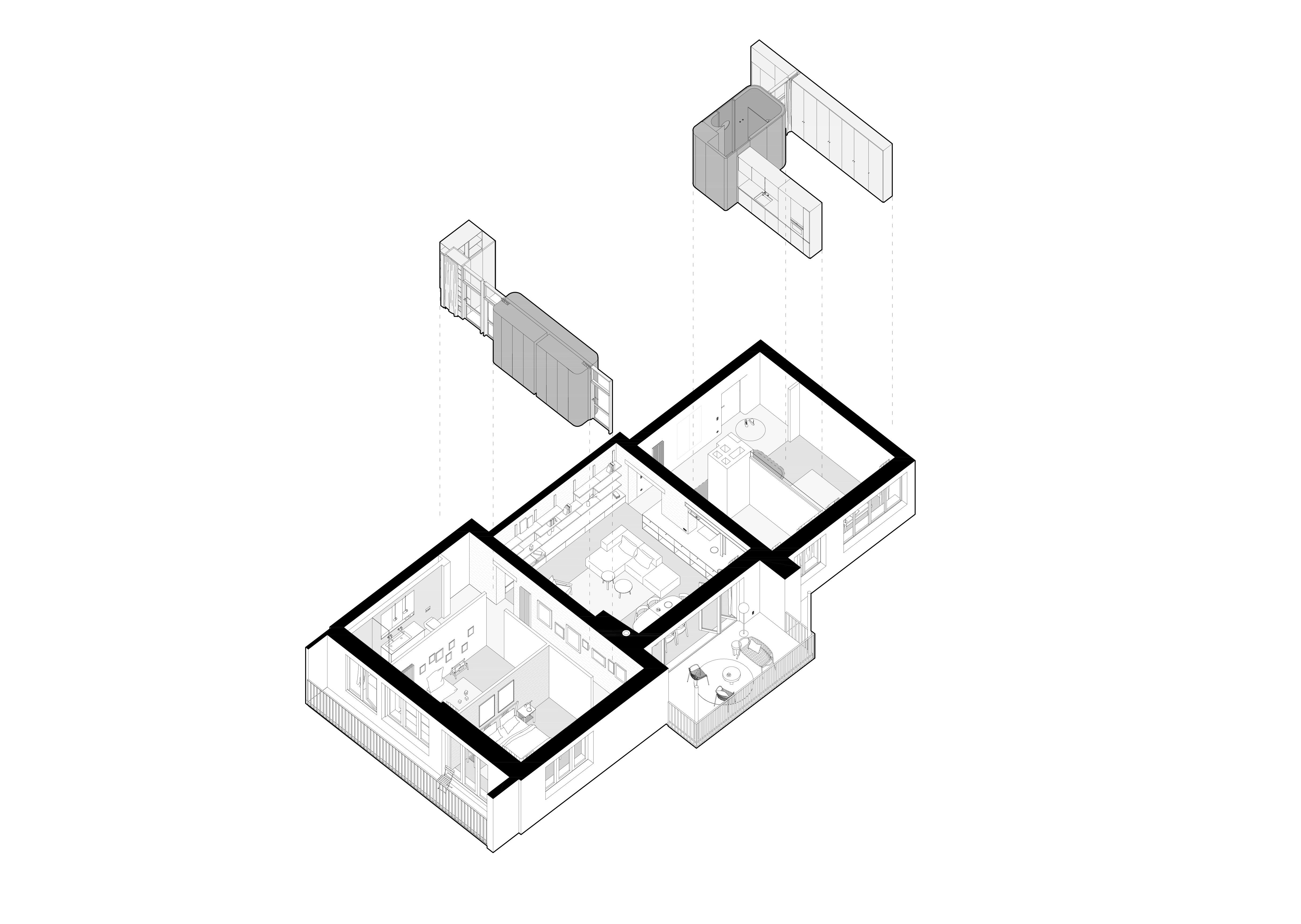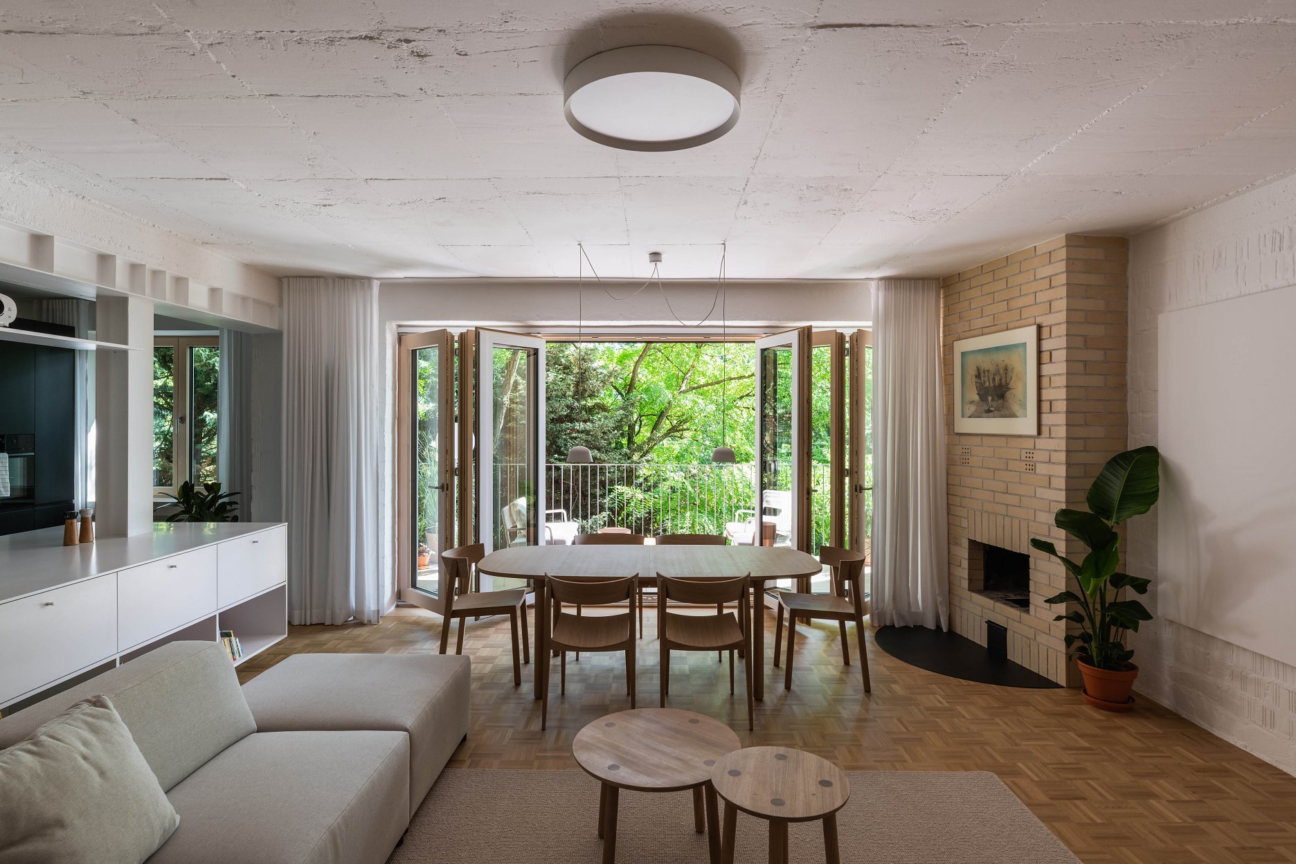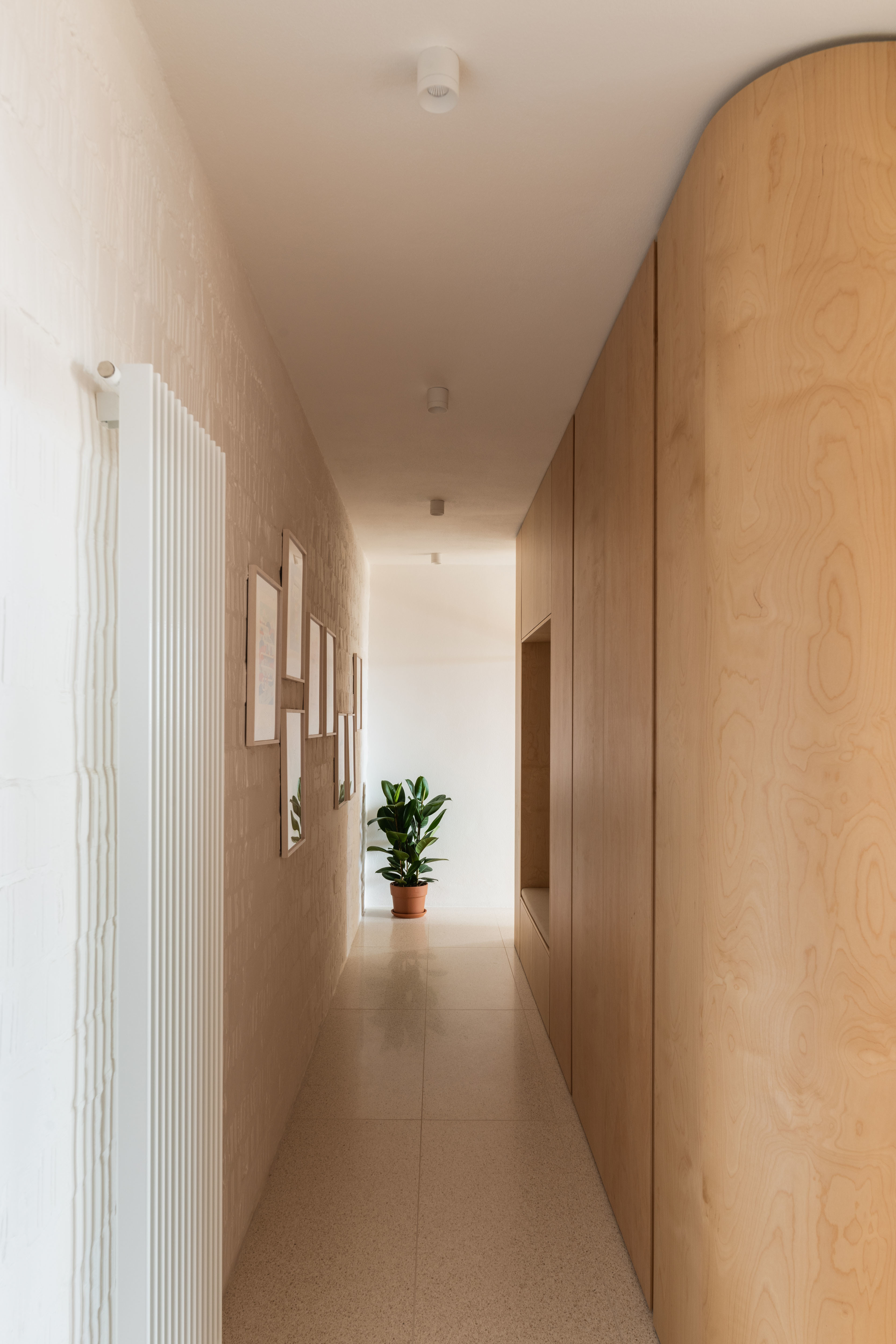 Terasa vystupujúca z východnej loggie sa po zložení FS portálu stane súčasťou centrálneho traktu - človek má pocit, že sa ocitá priamo v korunách stromov. Znížené parapety na južnej fasáde zas prinášajú viac svetla do nočnej zóny a cez translucentné dvere s nadsvetlíkmi putuje svetlo ďalej do chodby. Oblúkové nárožia vstavaných nábytkov z brezovej preglejky zmäkčujú pohyb po byte.
