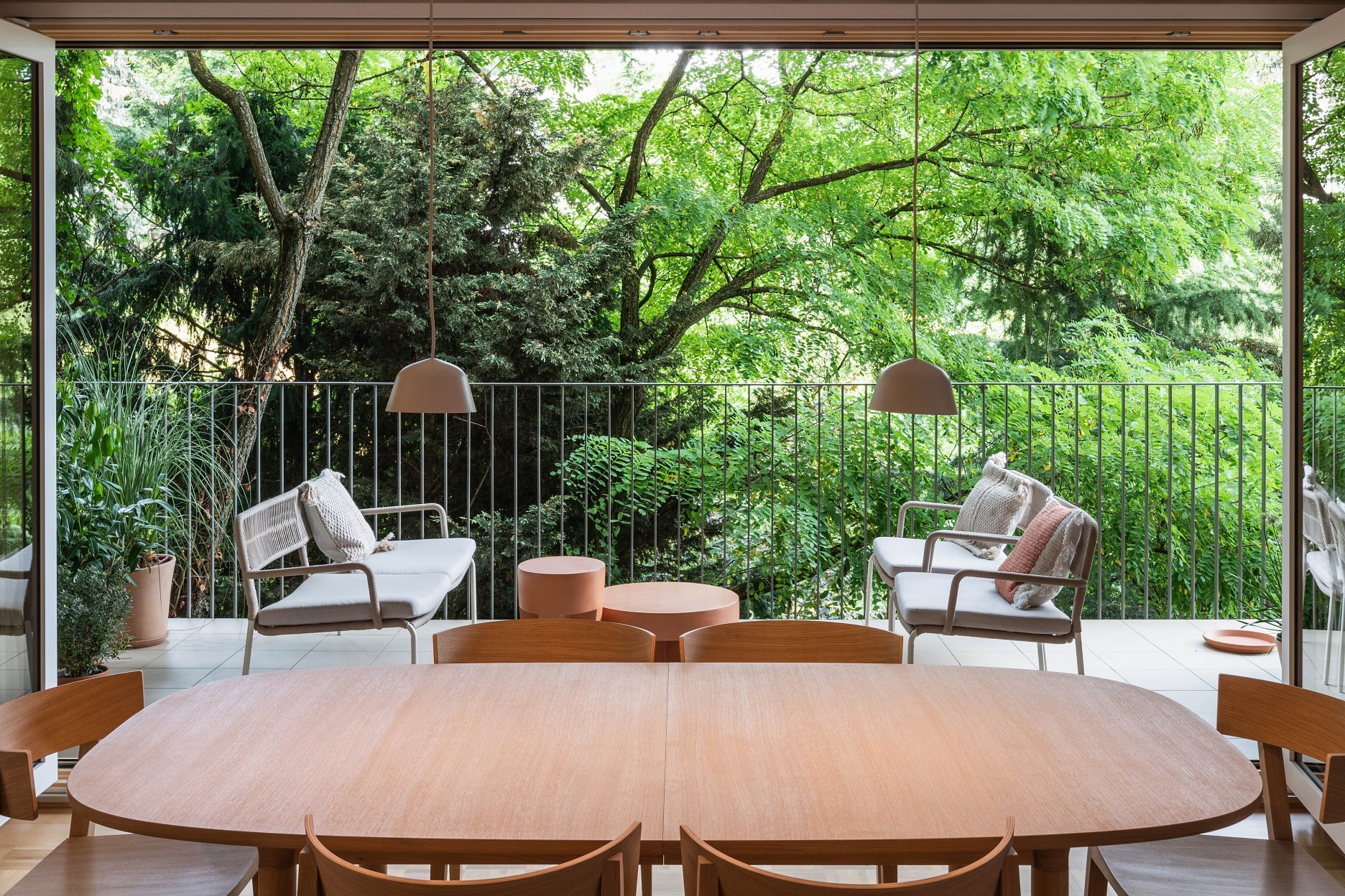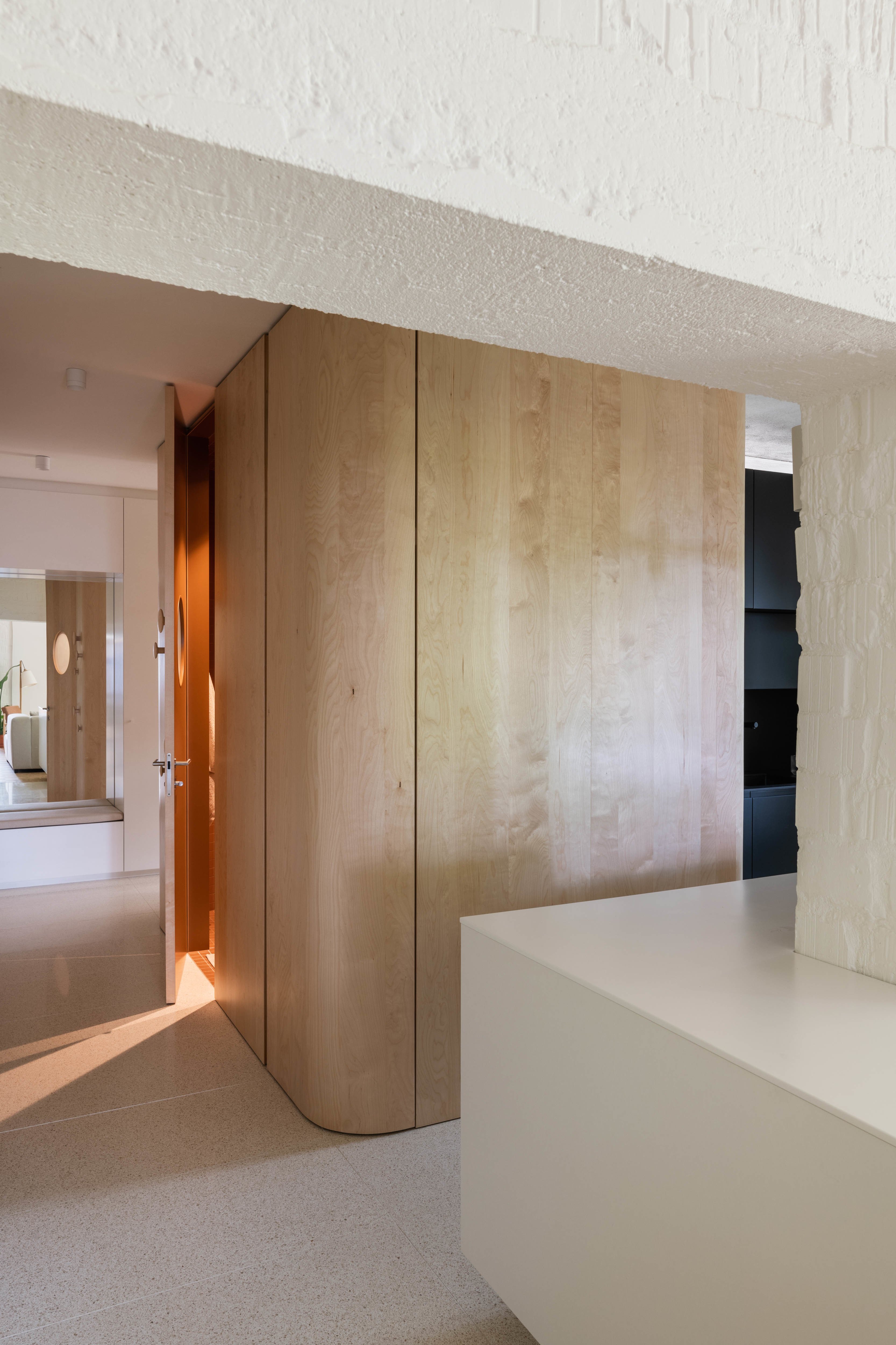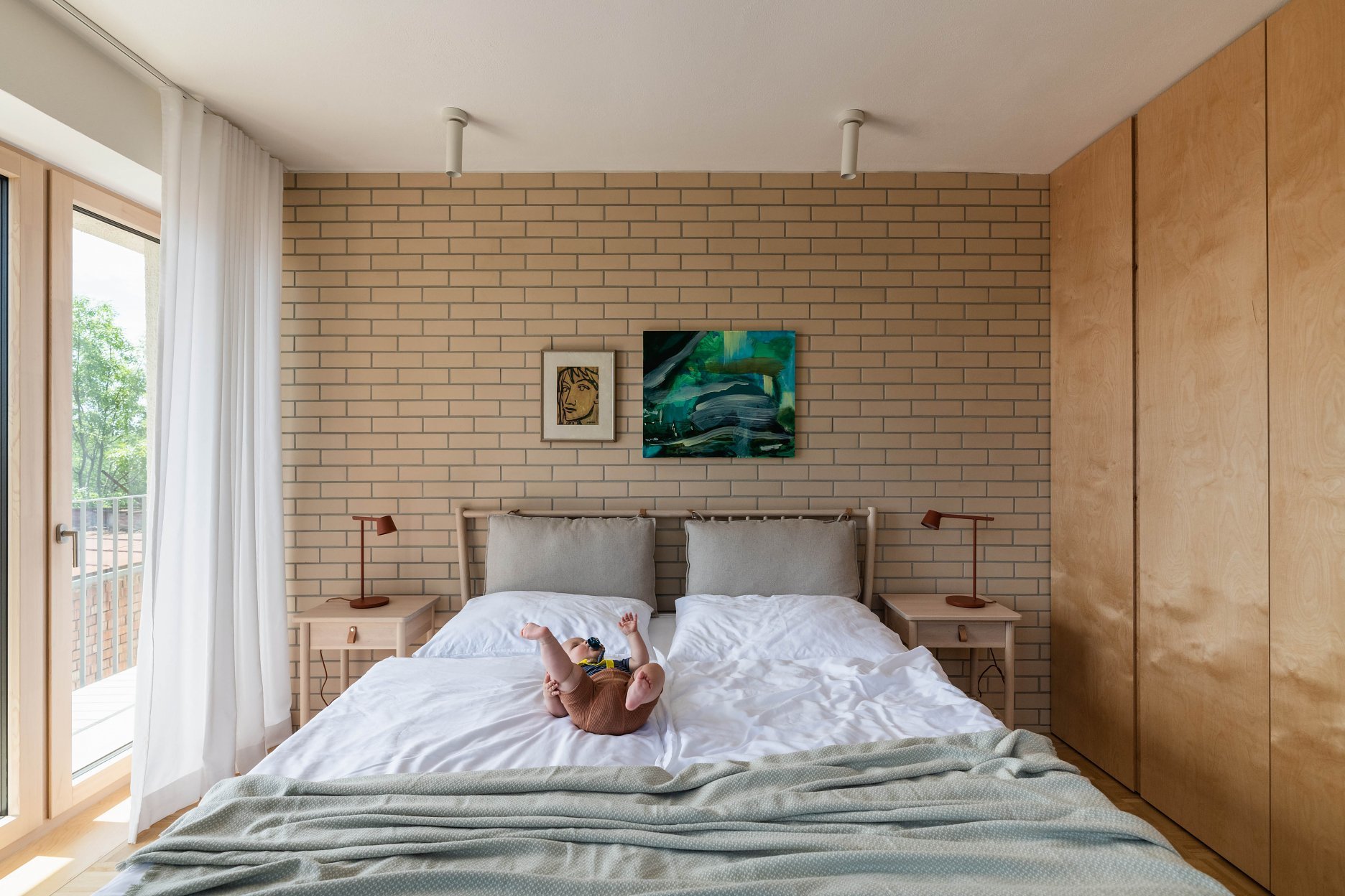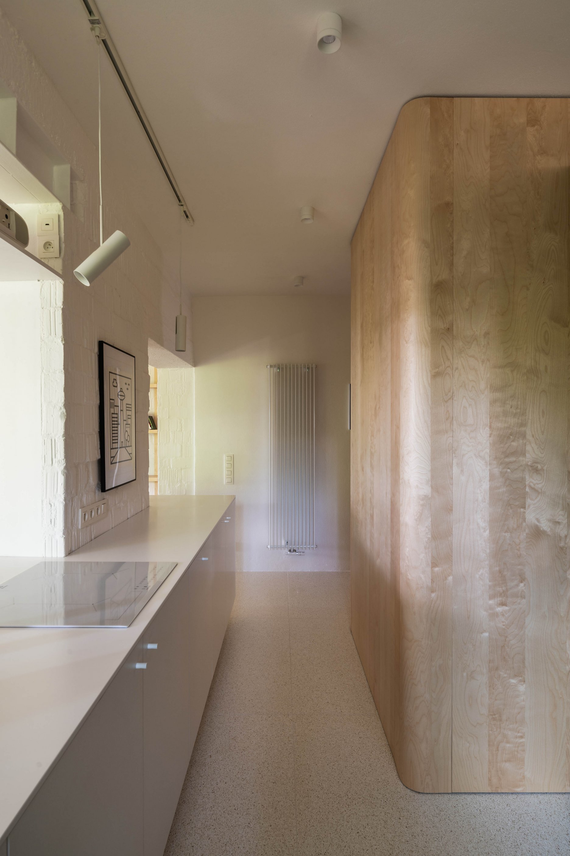 Terasa vystupujúca z východnej loggie sa po zložení FS portálu stane súčasťou centrálneho traktu - človek má pocit, že sa ocitá priamo v korunách stromov. Znížené parapety na južnej fasáde zas prinášajú viac svetla do nočnej zóny a cez translucentné dvere s nadsvetlíkmi putuje svetlo ďalej do chodby. Oblúkové nárožia vstavaných nábytkov z brezovej preglejky zmäkčujú pohyb po byte.