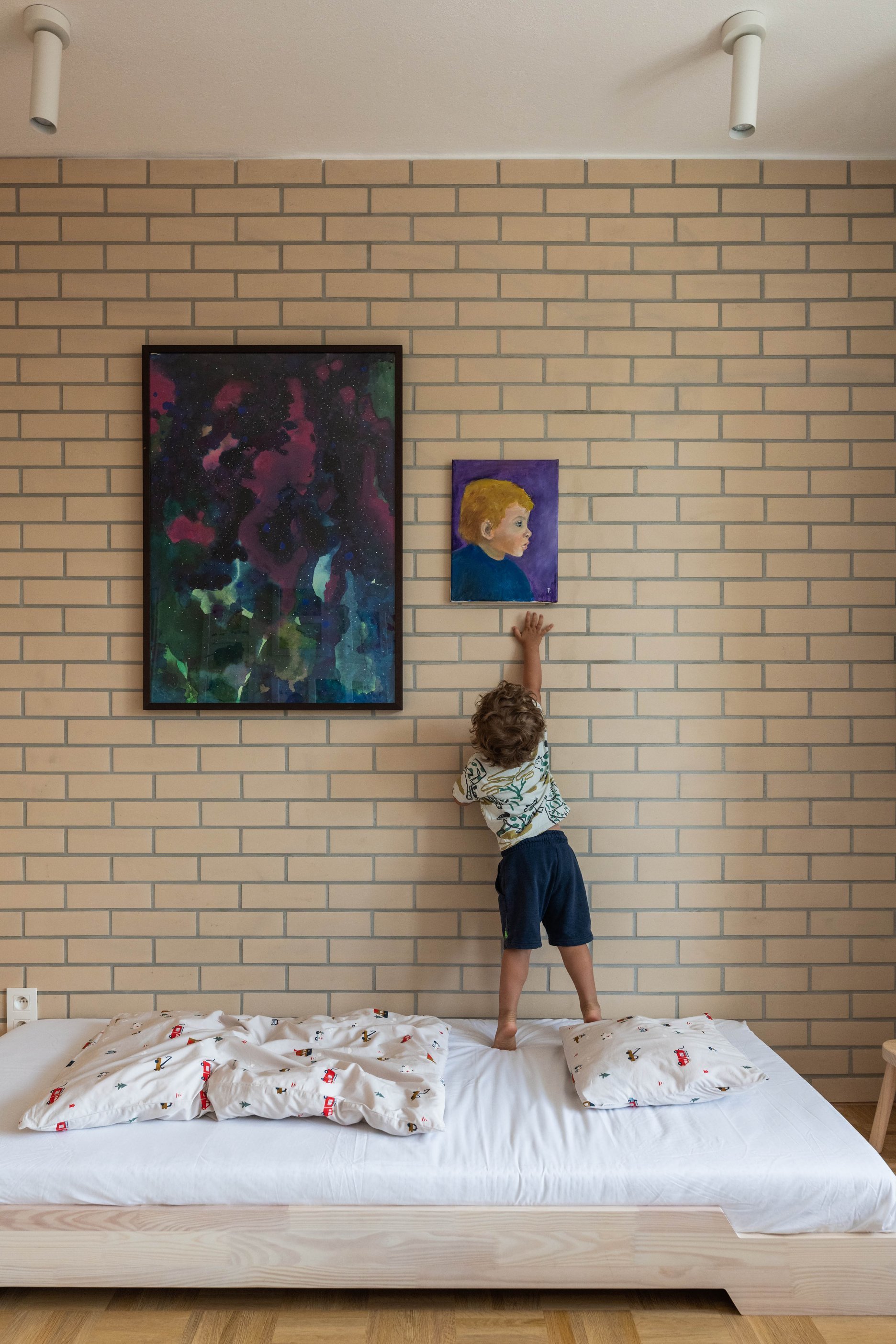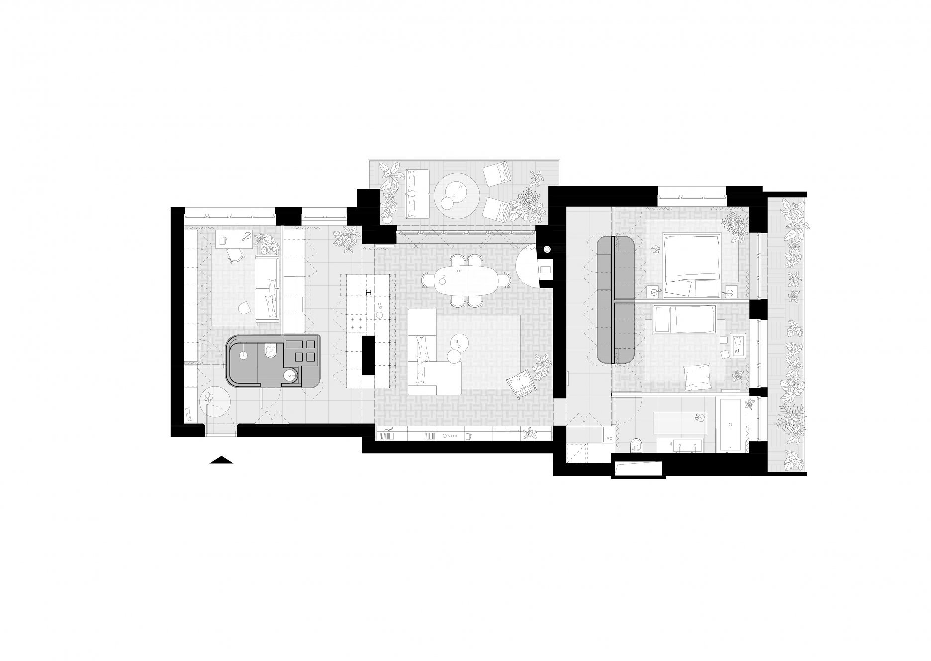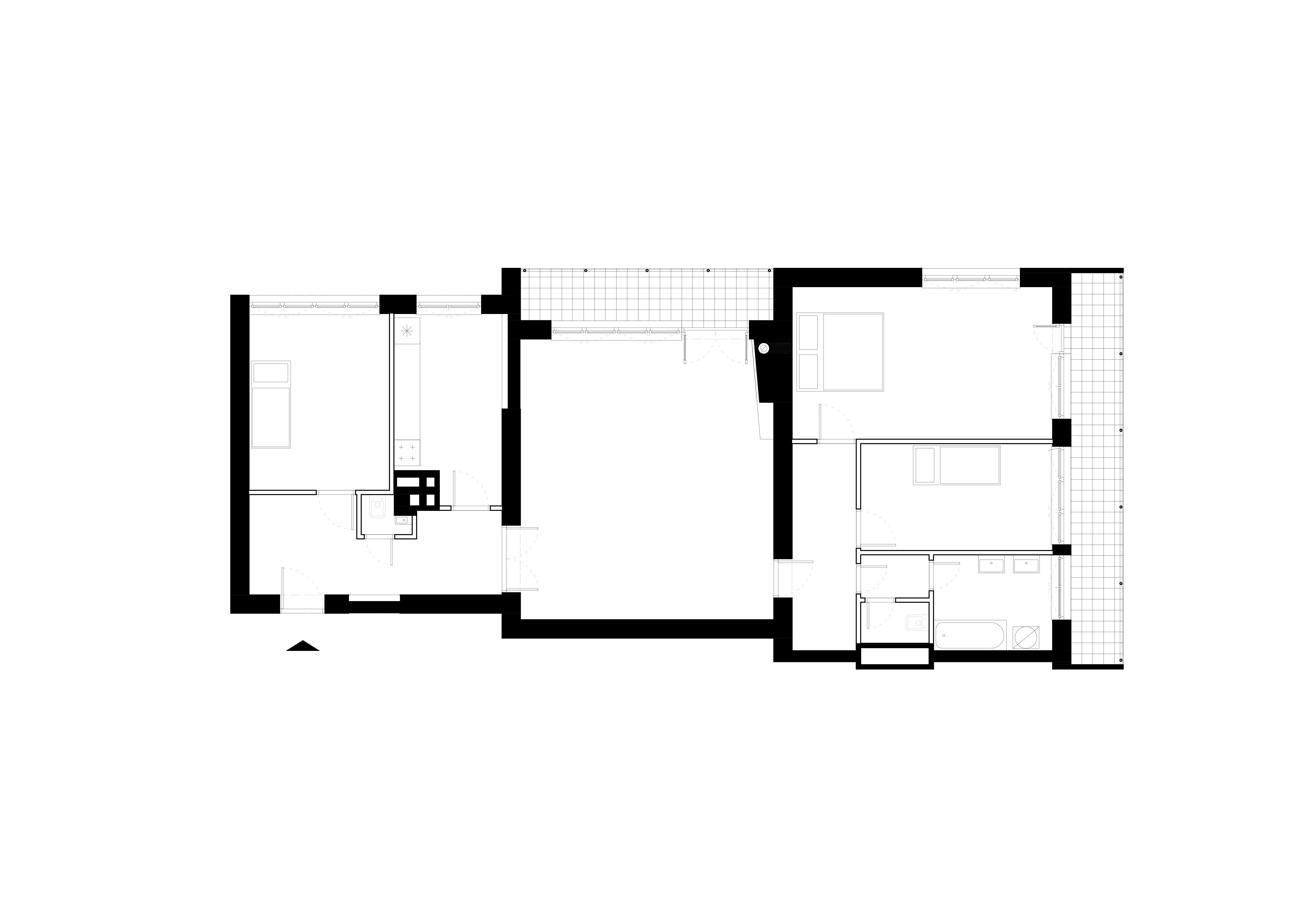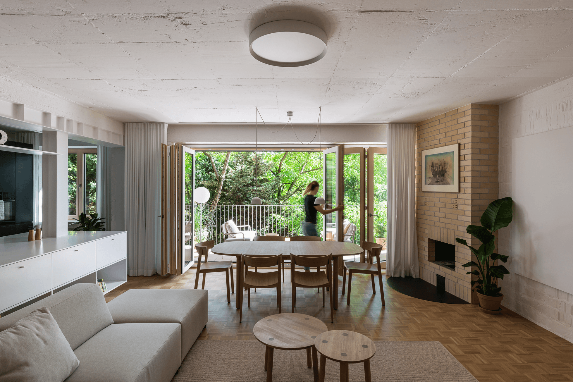 Terasa vystupujúca z východnej loggie sa po zložení FS portálu stane súčasťou centrálneho traktu - človek má pocit, že sa ocitá priamo v korunách stromov. Znížené parapety na južnej fasáde zas prinášajú viac svetla do nočnej zóny a cez translucentné dvere s nadsvetlíkmi putuje svetlo ďalej do chodby. Oblúkové nárožia vstavaných nábytkov z brezovej preglejky zmäkčujú pohyb po byte.