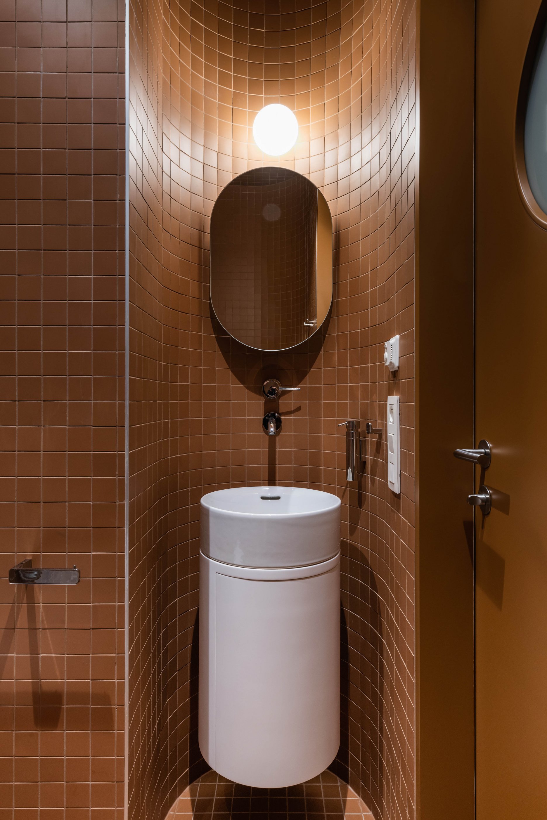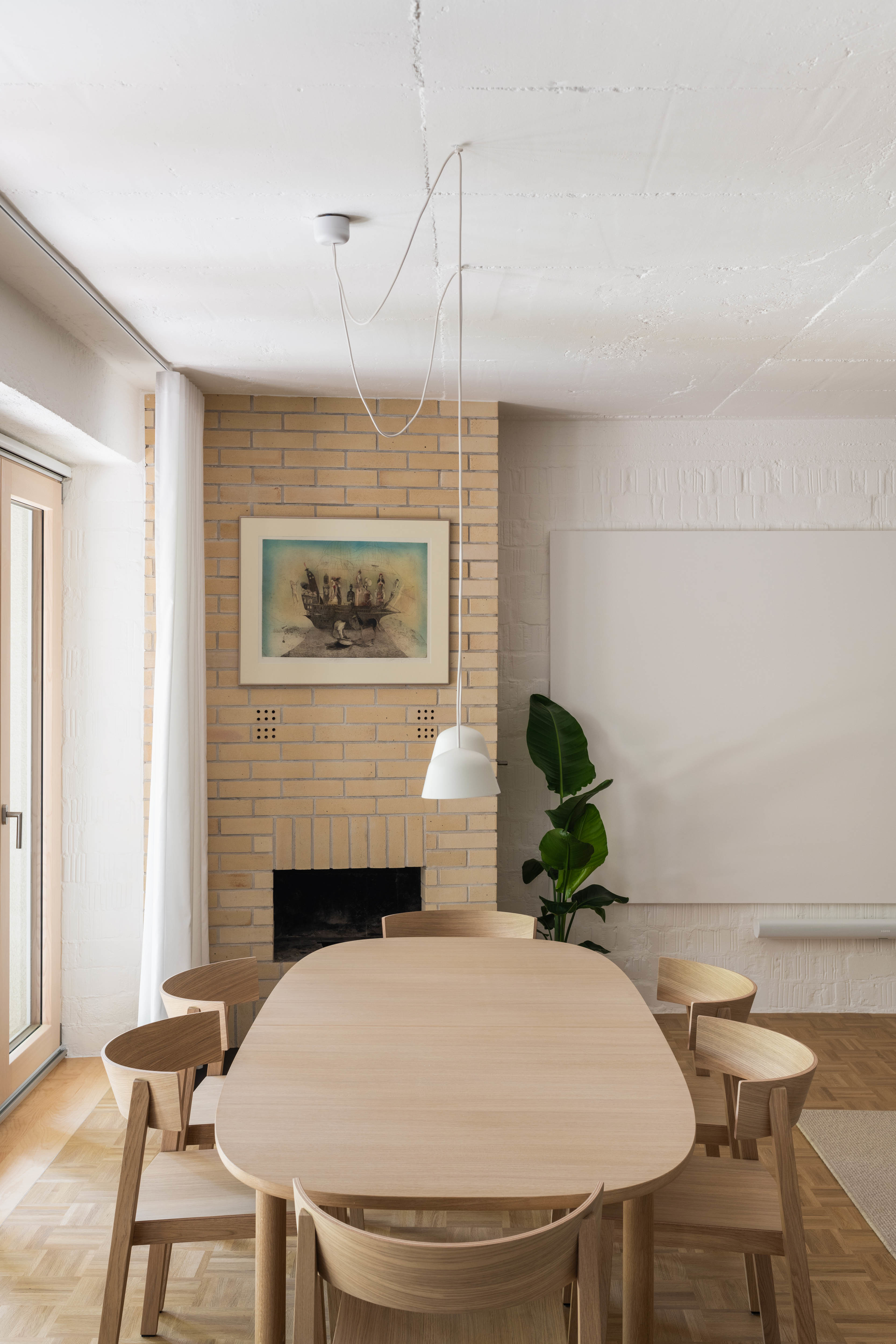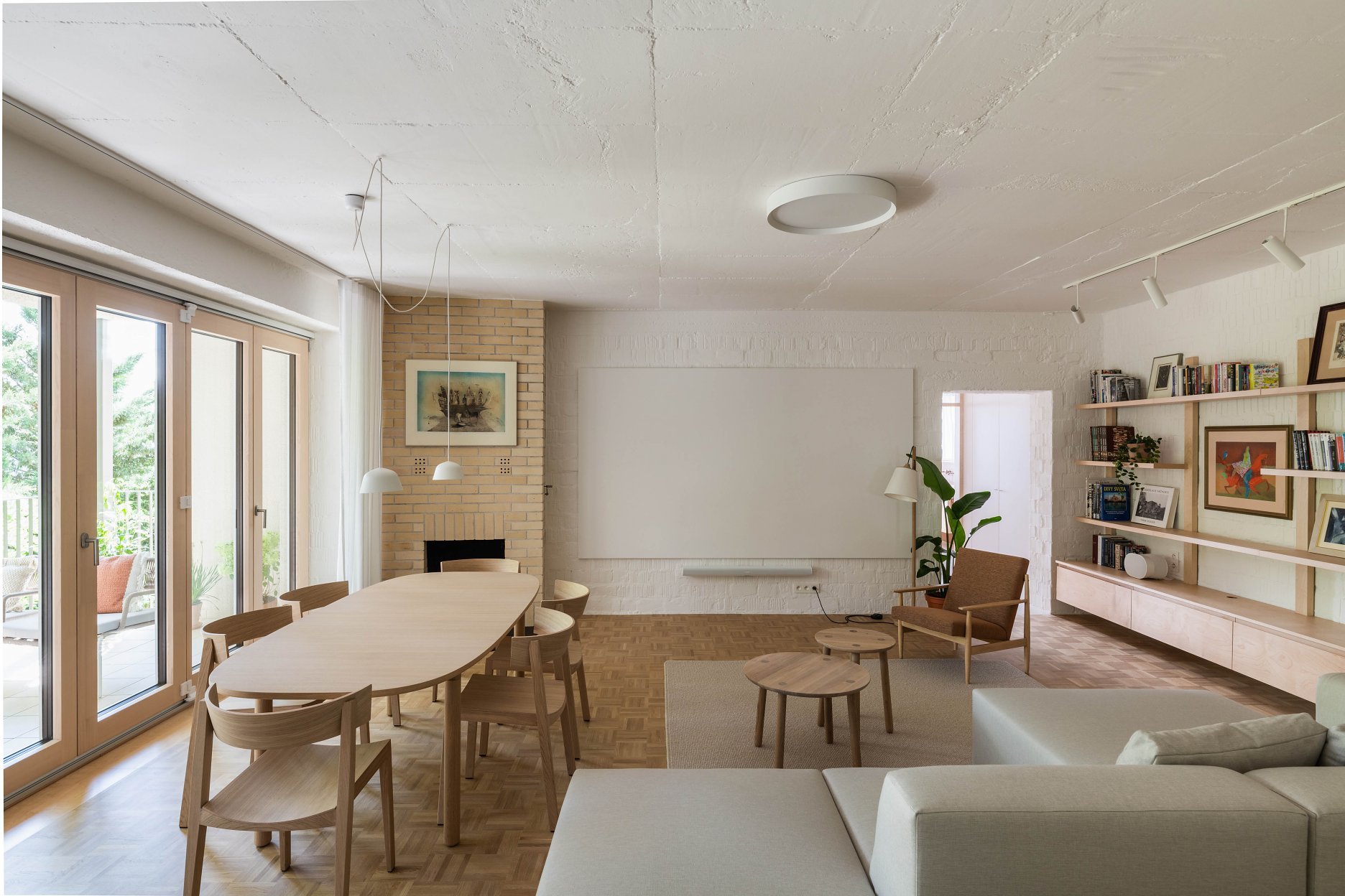 Nielen priestorové, ale aj materiálové a farebné riešenie interiéru nadväzuje na pôvodnú architektúru bytového domu. V centrálnej obývačke odkrývame pôvodné CDM murivo spolu so stropom z pohľadového betónu, ktoré pripomínajú vek domu. Obytné miestnosti sú rovnako ako exteriérová fasáda obložené “tapetou” z režných šamotových tehál, podlahy tvoria repasované pôvodné mozaikové dubové parkety. Sekundárne podlahy s vyššími nárokmi na údržbu sú pokryté terrazzovou dlažbou, ktorá sa objavuje v spoločných priestoroch bytového domu. Pri výhľadoch na strechy domov dominuje pálená škridla, čo reflektujeme použitím terakotových obkladov v oboch kúpeľniach. Nová podoba interiéru sa tak nesnaží prepísať priestorovo-výtvarnú koncepciu pôvodnej architektúry, ale novým spôsobom rozvíjať jej existujúce kvality.