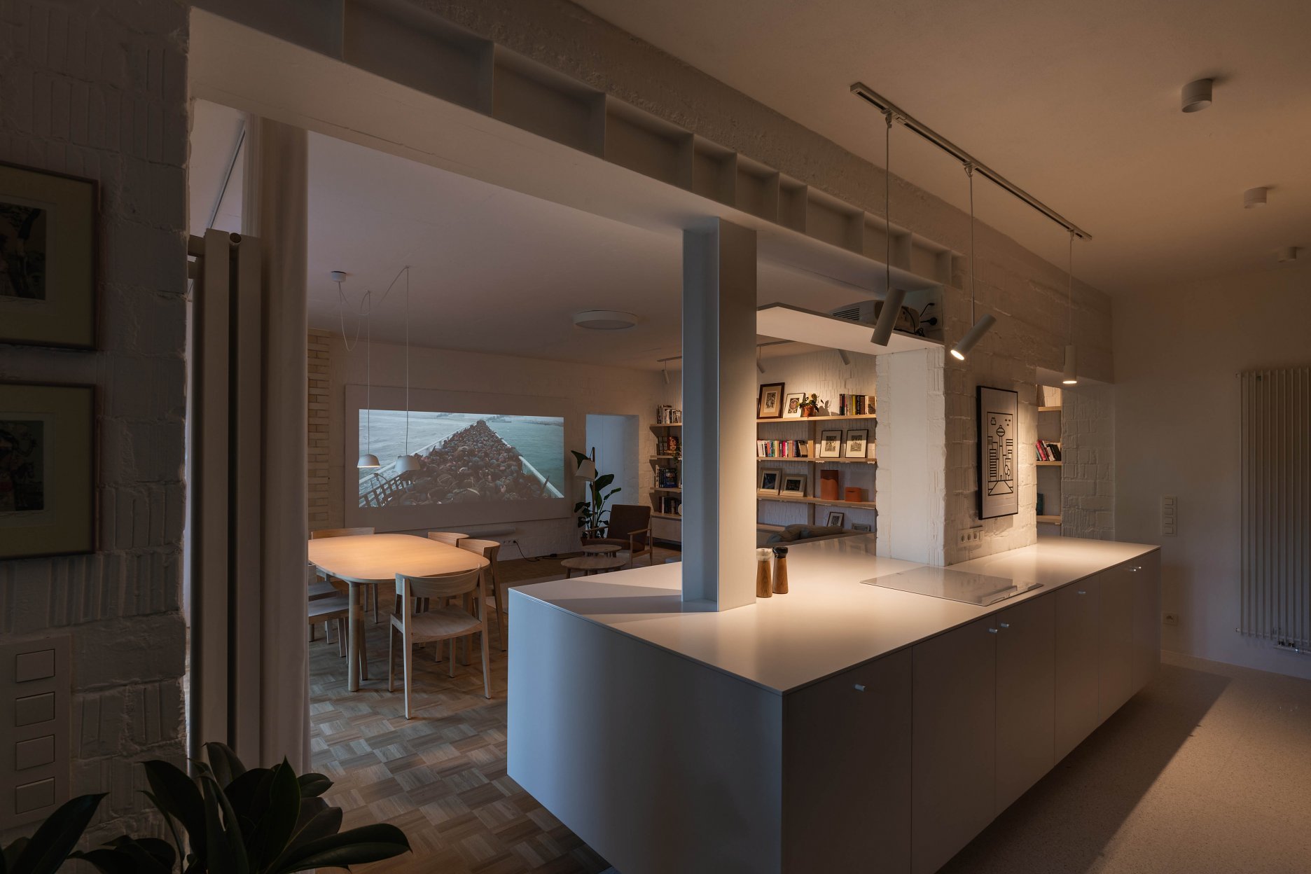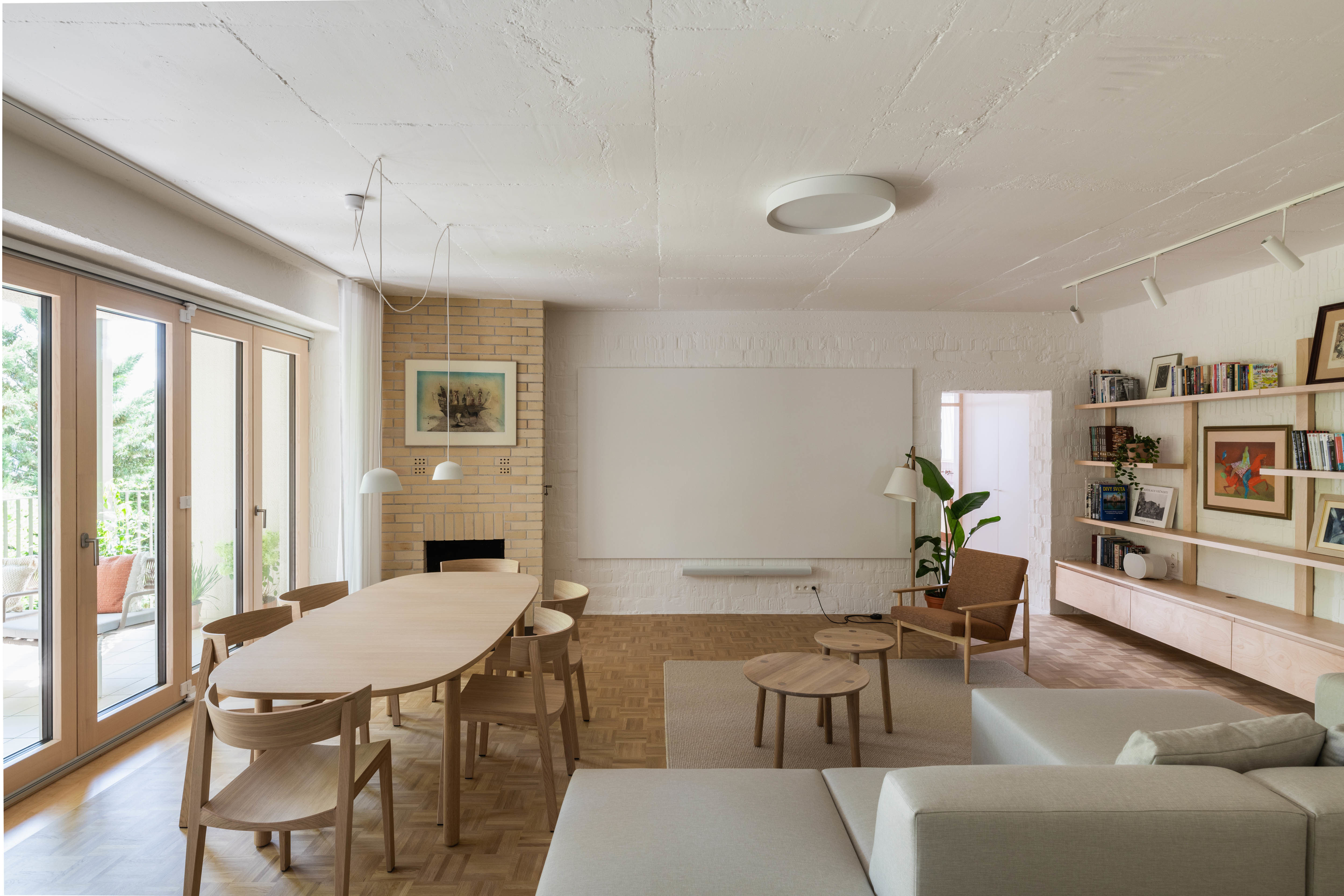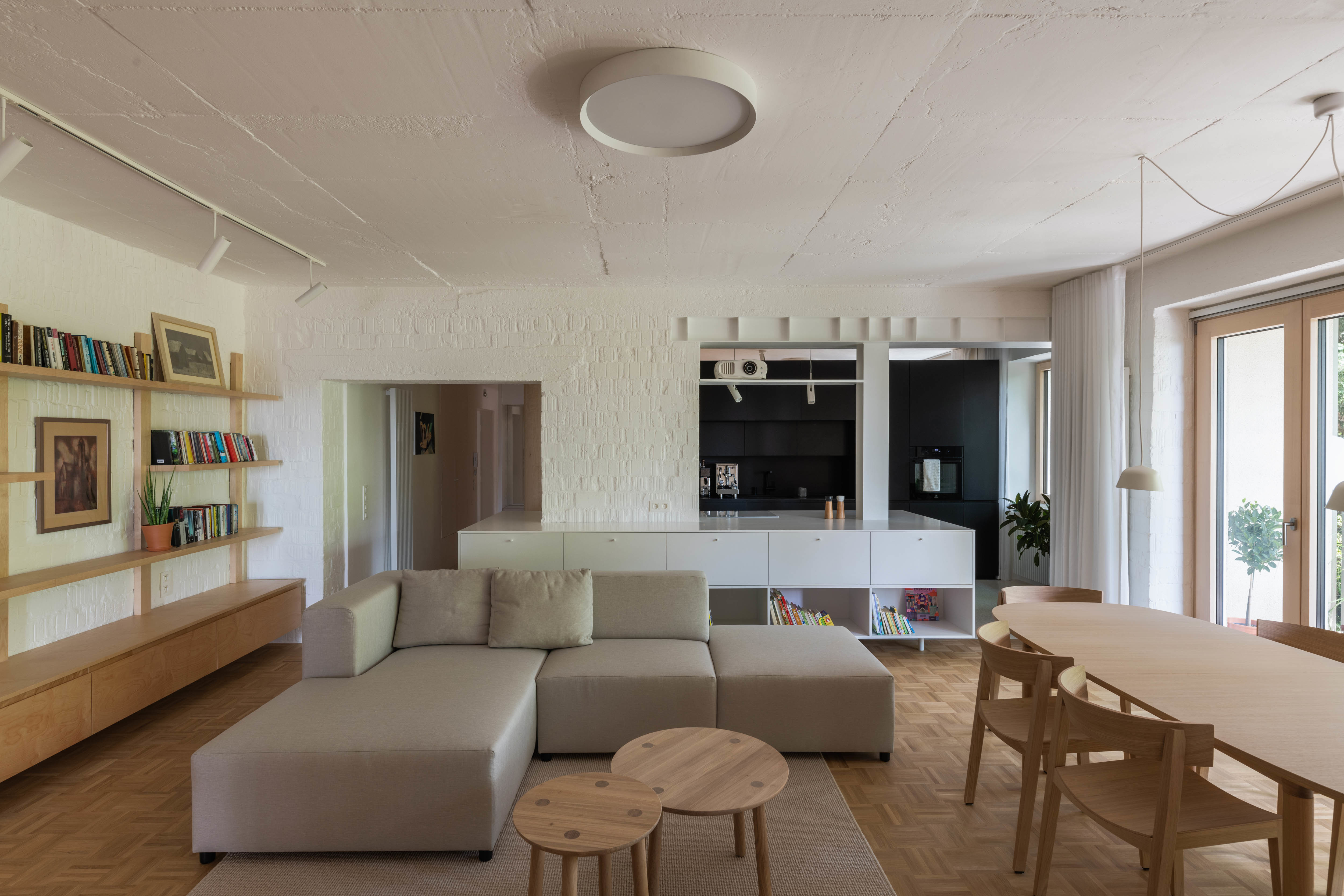 Priestorný štvorizbový byt prešiel rozsiahlou rekonštrukciou, ktorá sa snaží v maximálnej miere využiť a optimalizovať pôvodnú dispozičnú schému. Zníženie parapetov (pri zachovaní pôvodného rastru okien a výrazu obnovenej bytovky), alebo otvorenie nových priehľadov v rámci interiéru zvýrazňuje priestorové kvality bytu a jeho prepojenie s výhľadmi na panorámu Bratislavy a vysokú zeleň. Repasovaný krb a mozaikové dubové parkety, obklad zo šamotových tehál, alebo terrazzová dlažba... To všetko dotvára mozaiku bývania s špecifickým charakterom, ktoré sa zaraďuje medzi vydarené rekonštrukcie bratislavského ateliéru (viď. súvisiace články v závere textu).