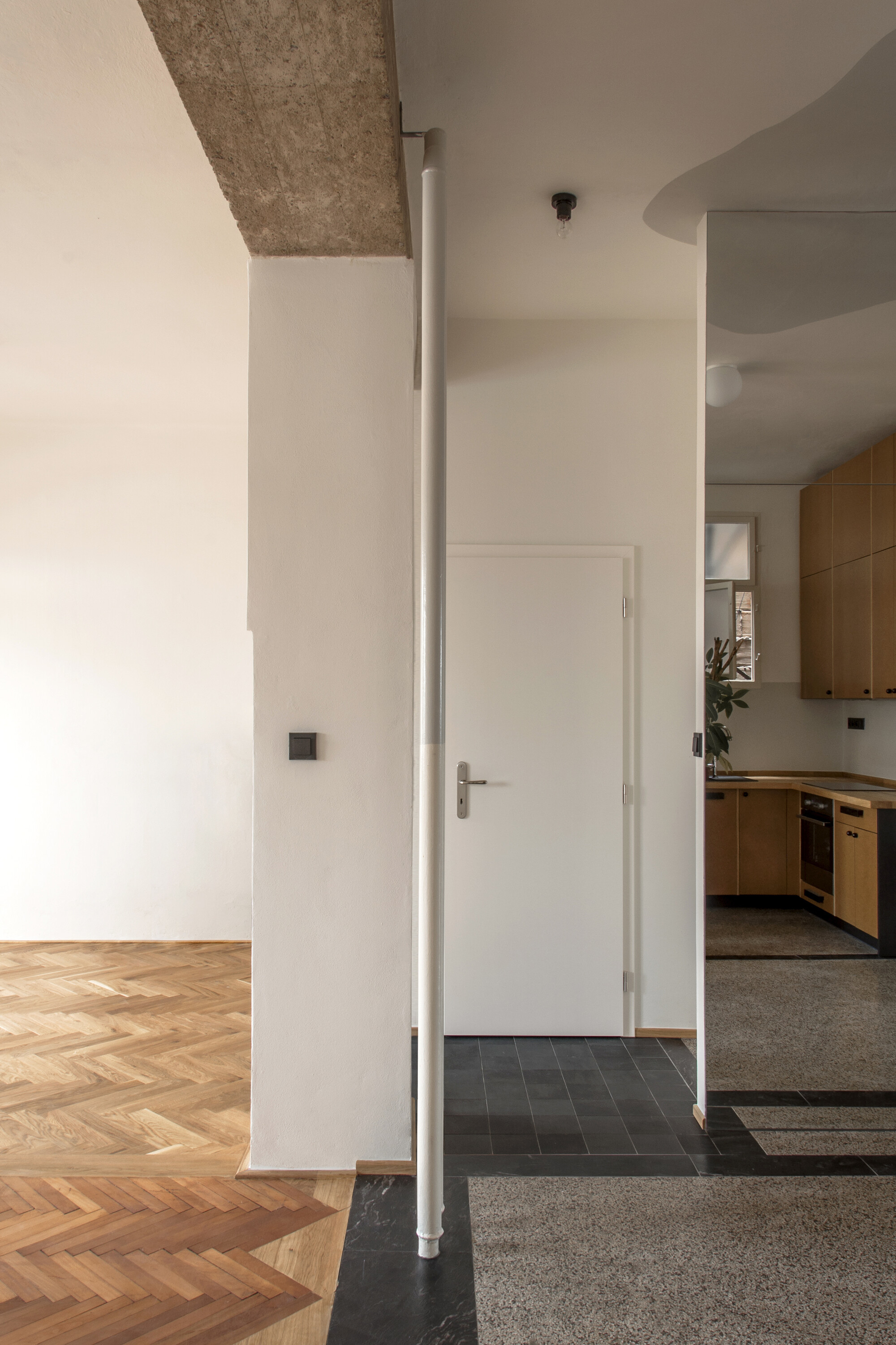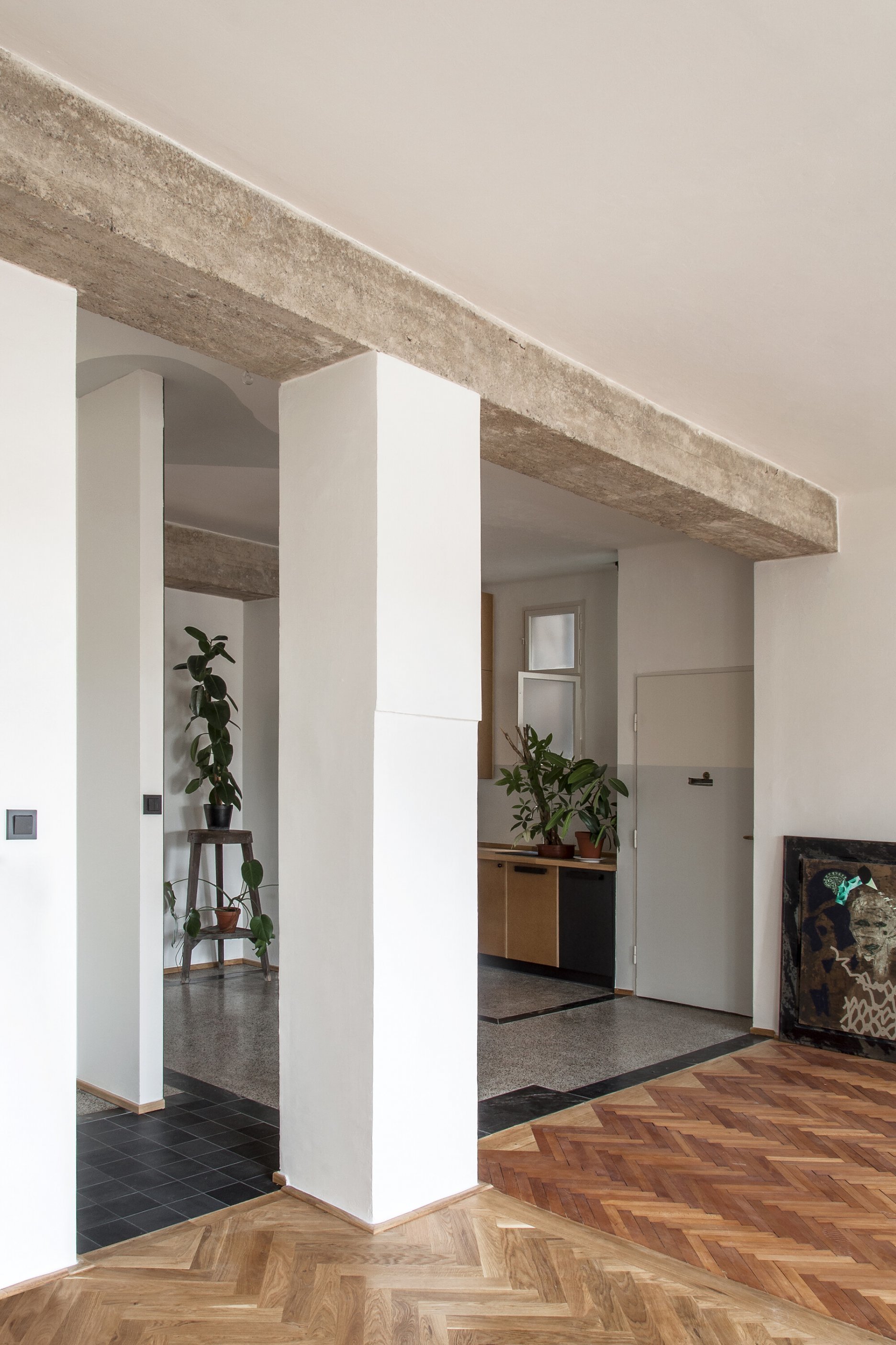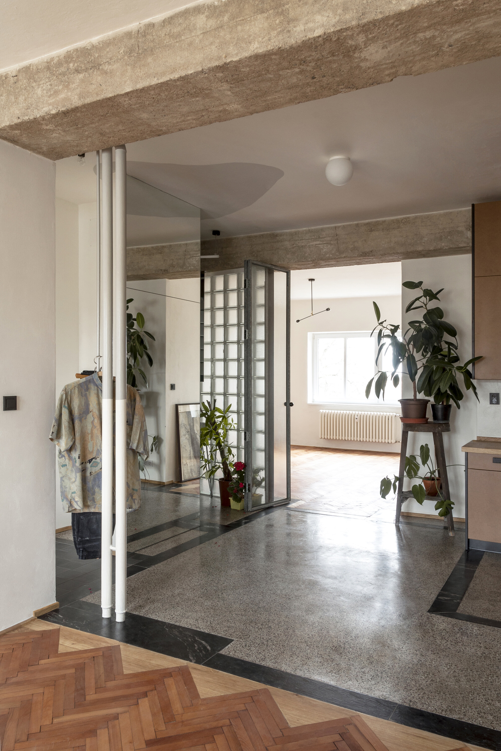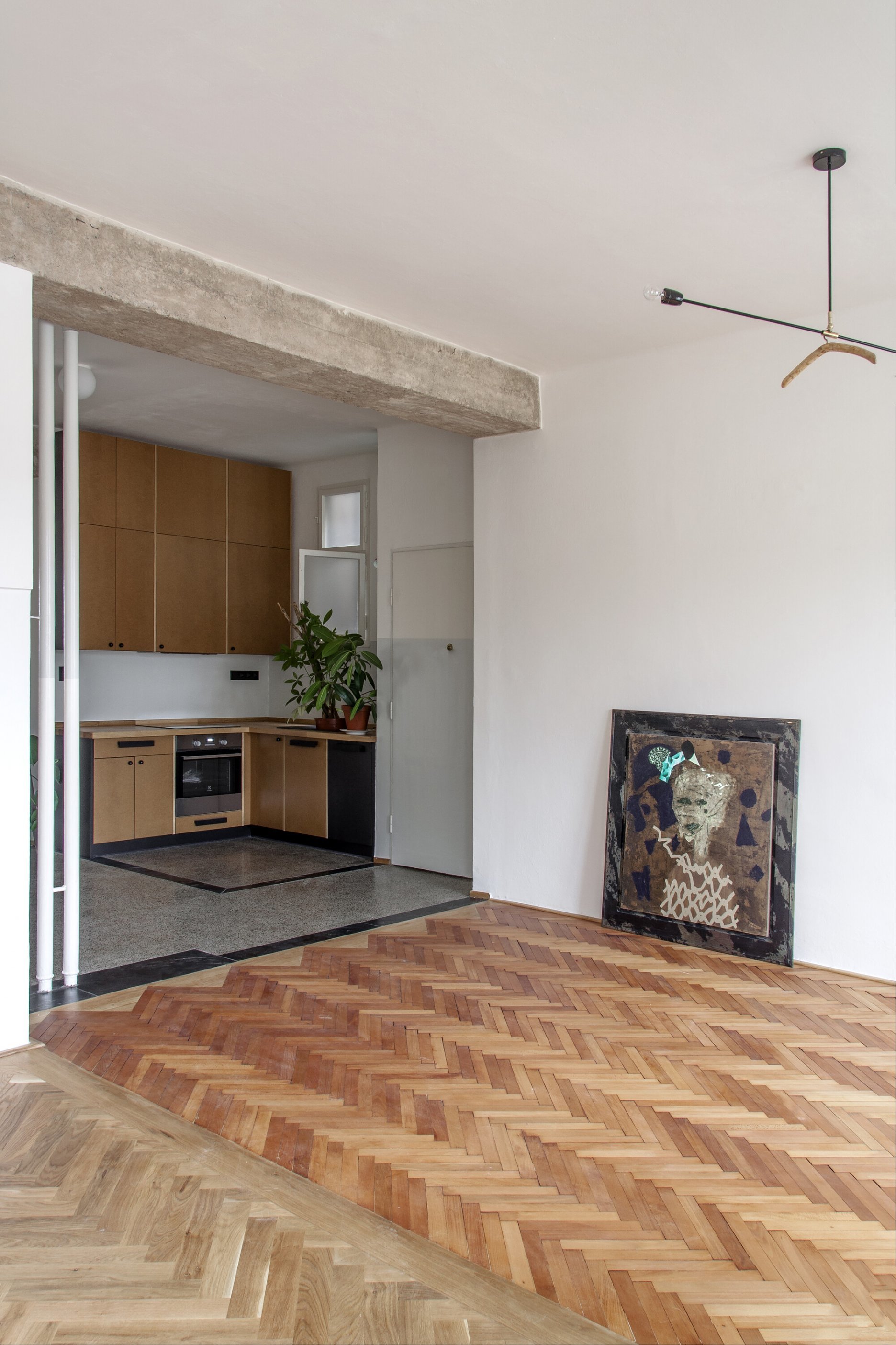 Úspešný repas pôvodných bukových parkiet a terazza, ktoré odolali nánosu nalepenej dlažby, alebo vinylu pomohli presvedčiť klienta k investícii do podobne trvanlivých materiálov. Projekt sa tak odklonil od počiatočnej voľby lacných materiálov do priestorov určených na prenájom, ako je laminát, alebo vinylové podlahy. Škáry v podlahe po vybúraných priečkach tak zacelili kamenné pásy, ktoré boli následne prebrúsené spoločne s terazzom. Pôvodné parené bukové parkety doplnili nové dubové vlysy, napojené na kameň prostredníctvom vložených trojuholníkov s vyfrézovaným zámkom. Výsledná kresba podporuje pocitové delenie interiéru na jednotlivé miestnosti a zóny.