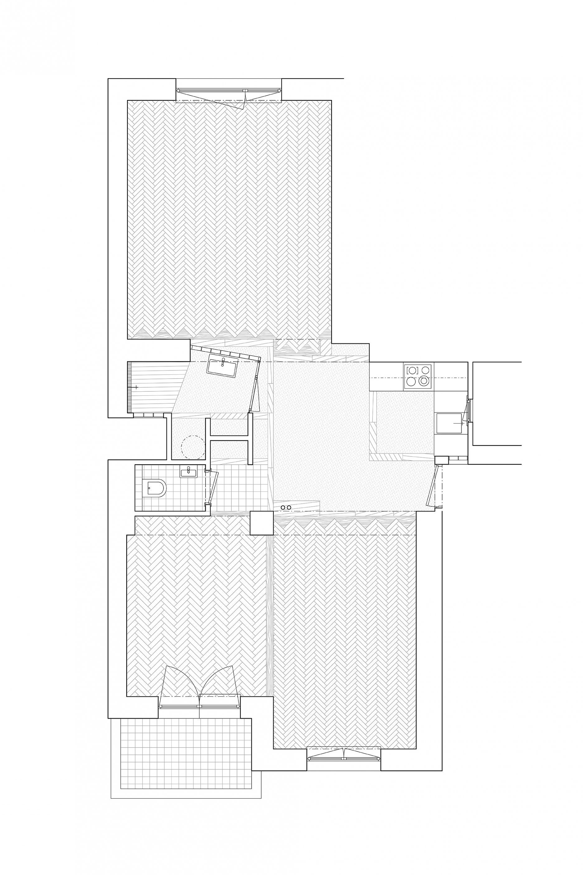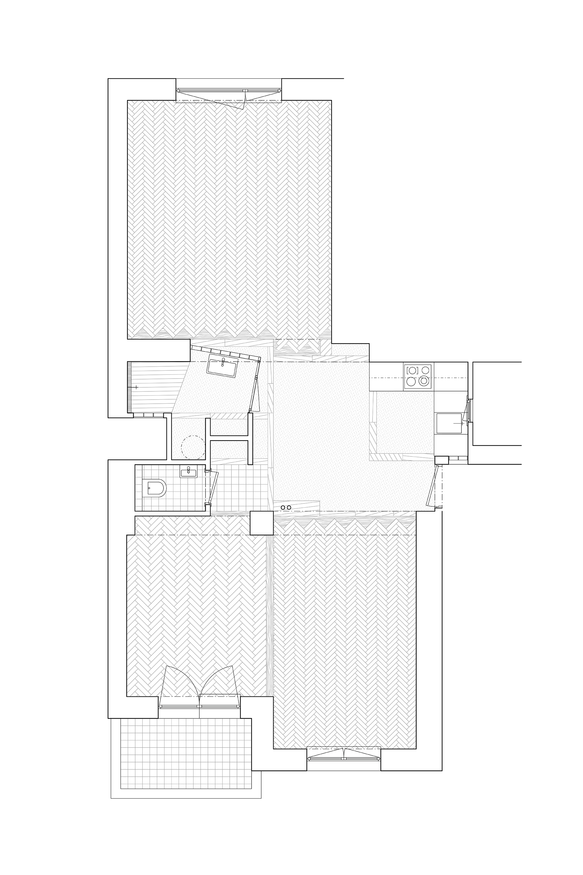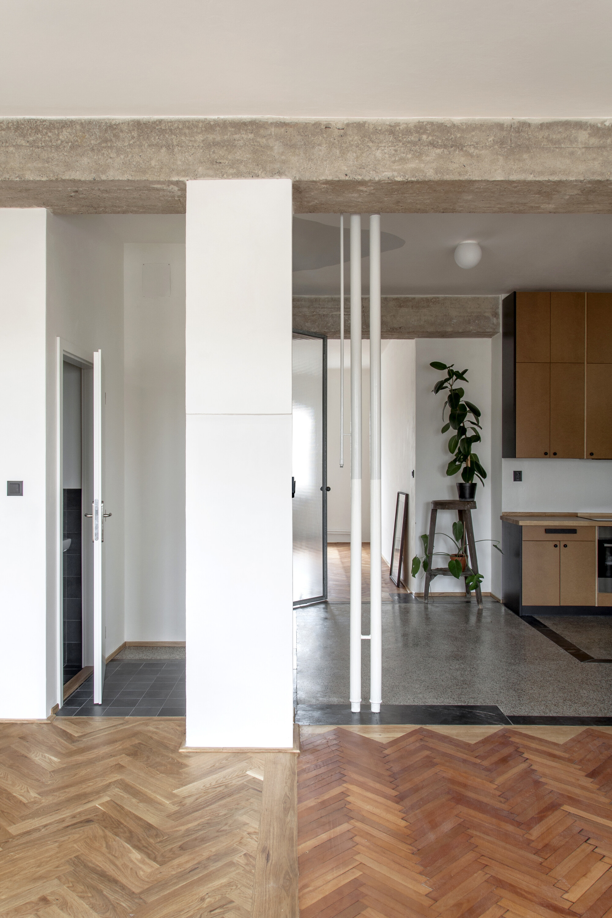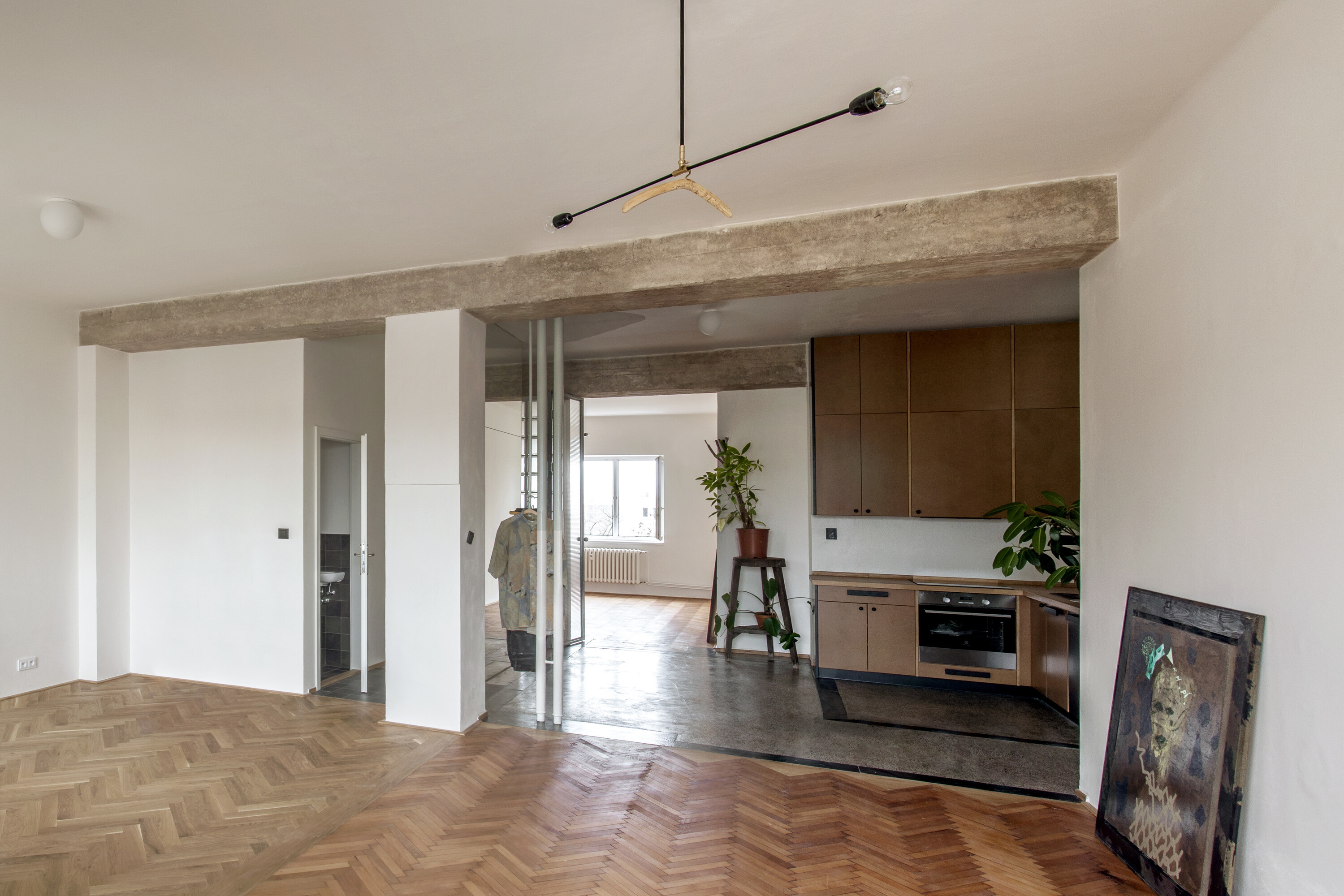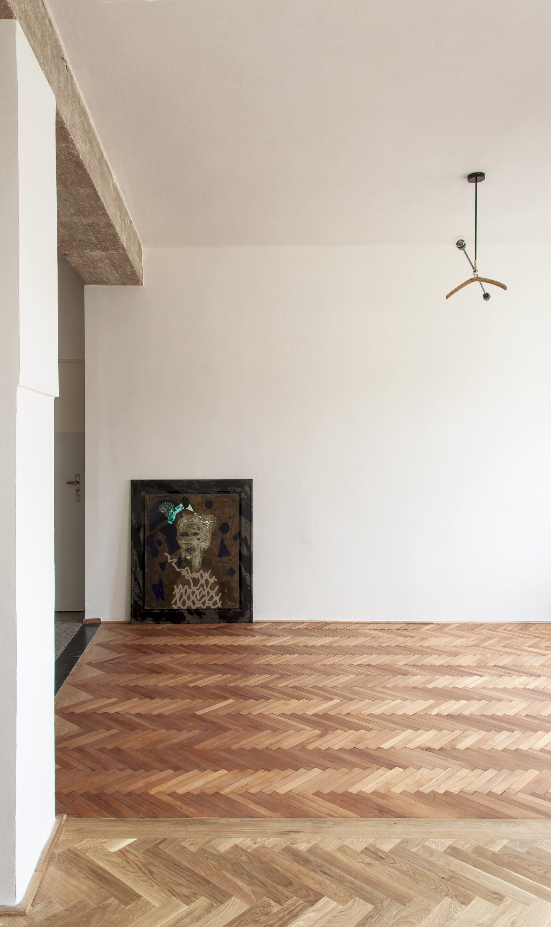 Úspešný repas pôvodných bukových parkiet a terazza, ktoré odolali nánosu nalepenej dlažby, alebo vinylu pomohli presvedčiť klienta k investícii do podobne trvanlivých materiálov. Projekt sa tak odklonil od počiatočnej voľby lacných materiálov do priestorov určených na prenájom, ako je laminát, alebo vinylové podlahy. Škáry v podlahe po vybúraných priečkach tak zacelili kamenné pásy, ktoré boli následne prebrúsené spoločne s terazzom. Pôvodné parené bukové parkety doplnili nové dubové vlysy, napojené na kameň prostredníctvom vložených trojuholníkov s vyfrézovaným zámkom. Výsledná kresba podporuje pocitové delenie interiéru na jednotlivé miestnosti a zóny.