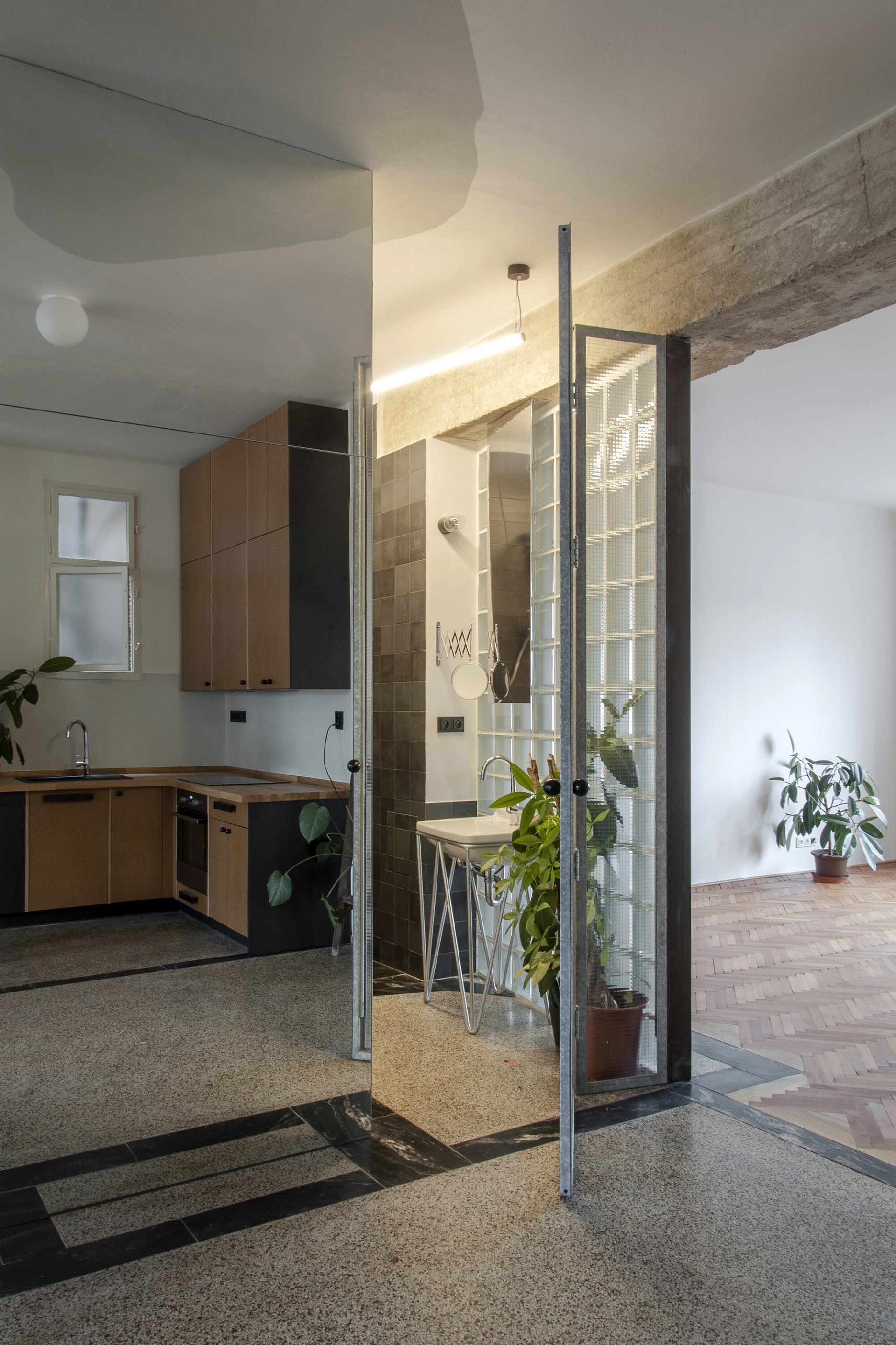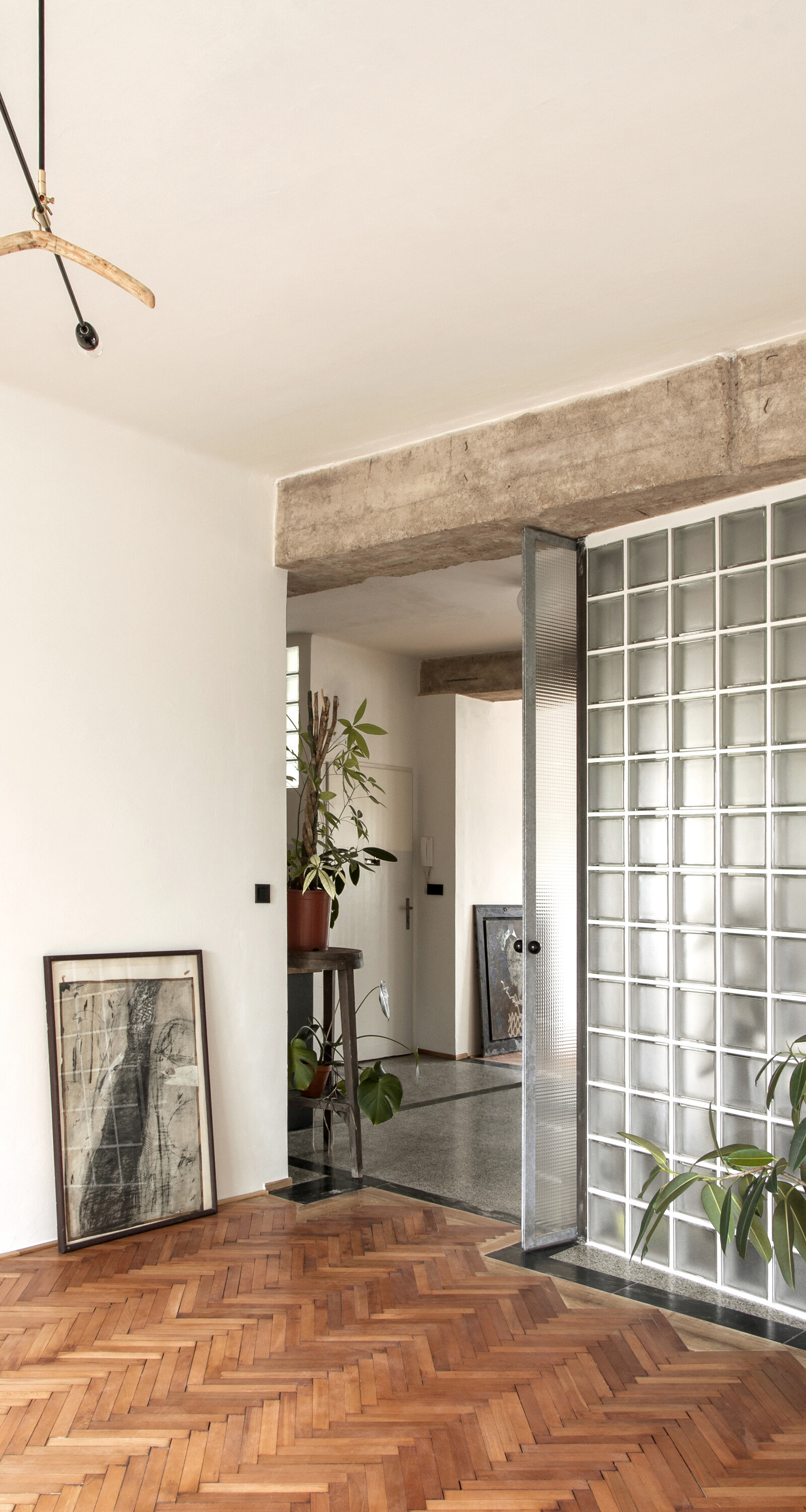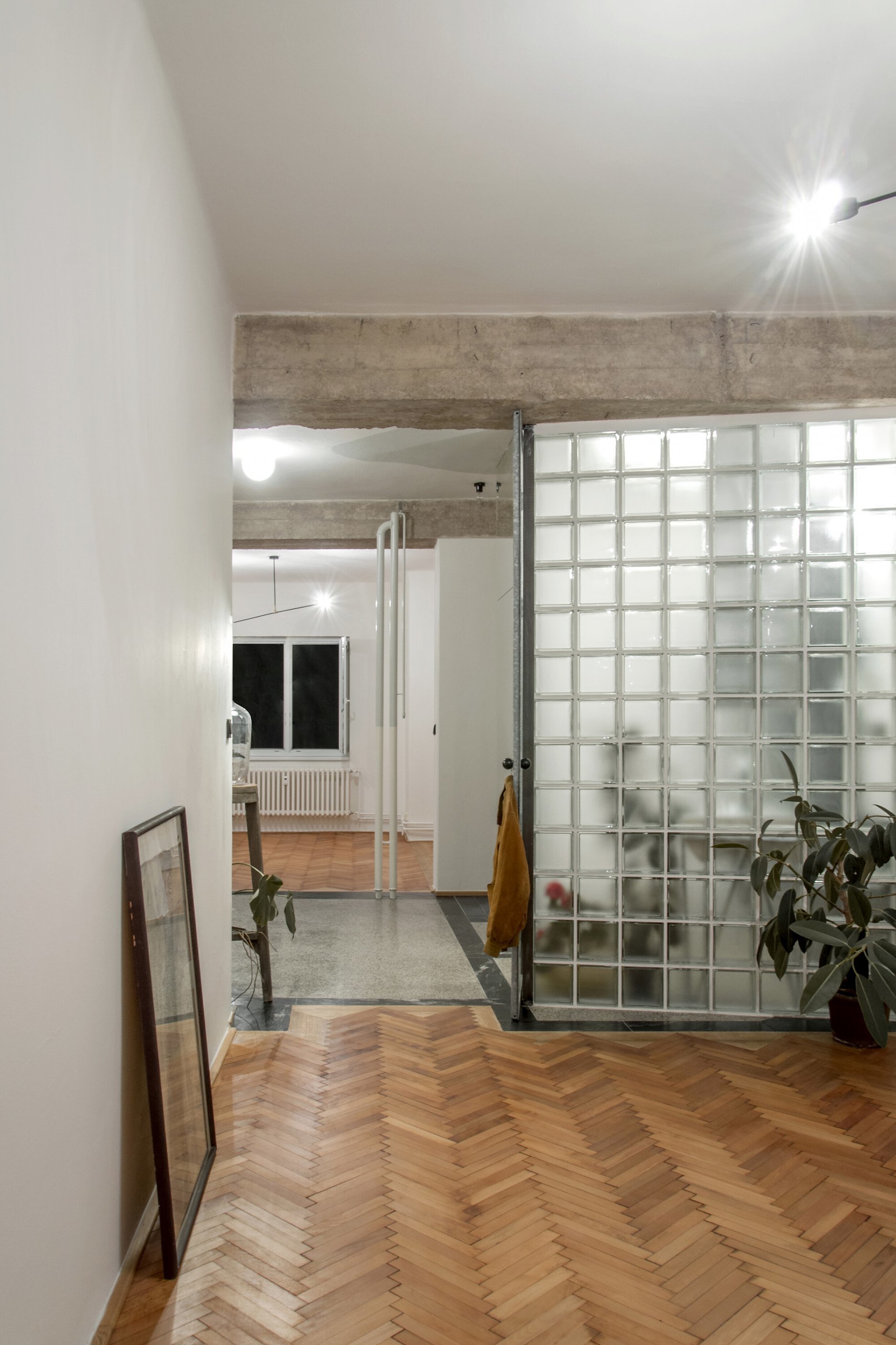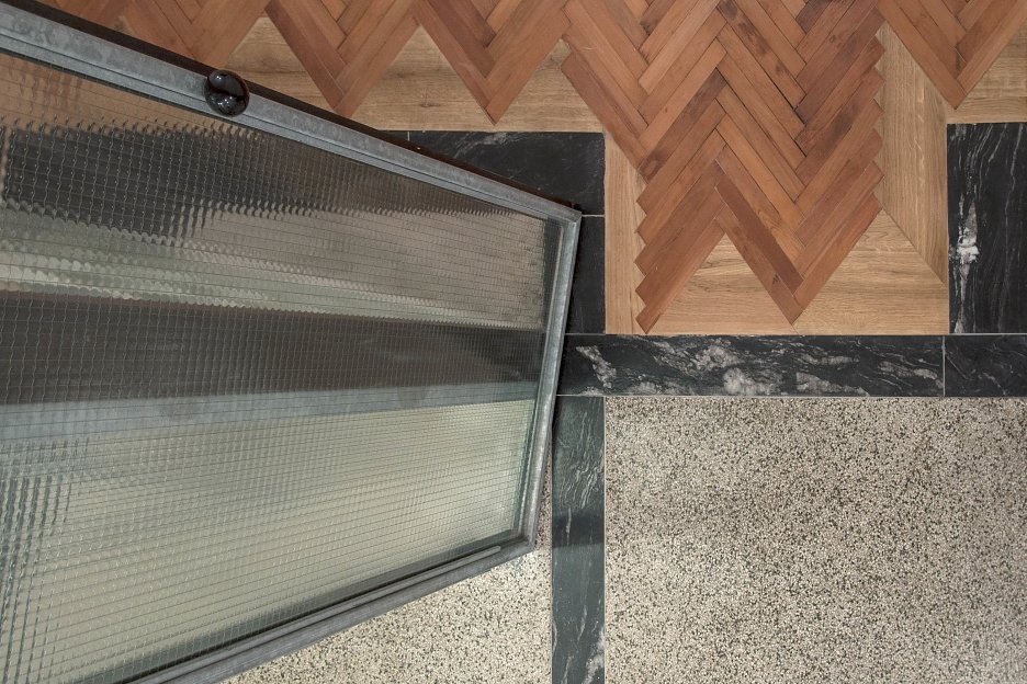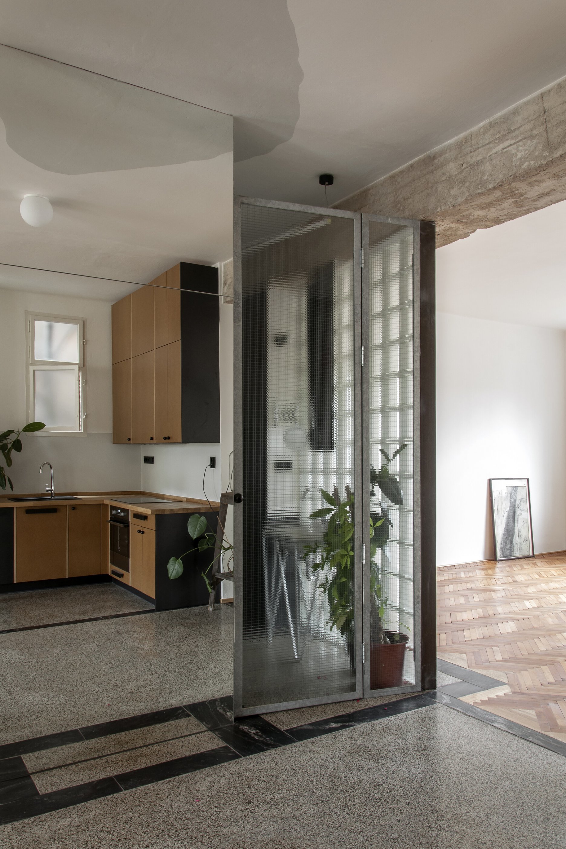 Úspešný repas pôvodných bukových parkiet a terazza, ktoré odolali nánosu nalepenej dlažby, alebo vinylu pomohli presvedčiť klienta k investícii do podobne trvanlivých materiálov. Projekt sa tak odklonil od počiatočnej voľby lacných materiálov do priestorov určených na prenájom, ako je laminát, alebo vinylové podlahy. Škáry v podlahe po vybúraných priečkach tak zacelili kamenné pásy, ktoré boli následne prebrúsené spoločne s terazzom. Pôvodné parené bukové parkety doplnili nové dubové vlysy, napojené na kameň prostredníctvom vložených trojuholníkov s vyfrézovaným zámkom. Výsledná kresba podporuje pocitové delenie interiéru na jednotlivé miestnosti a zóny.