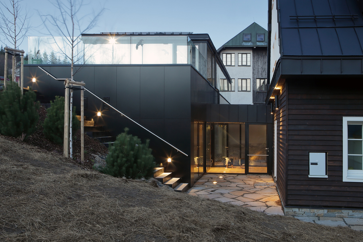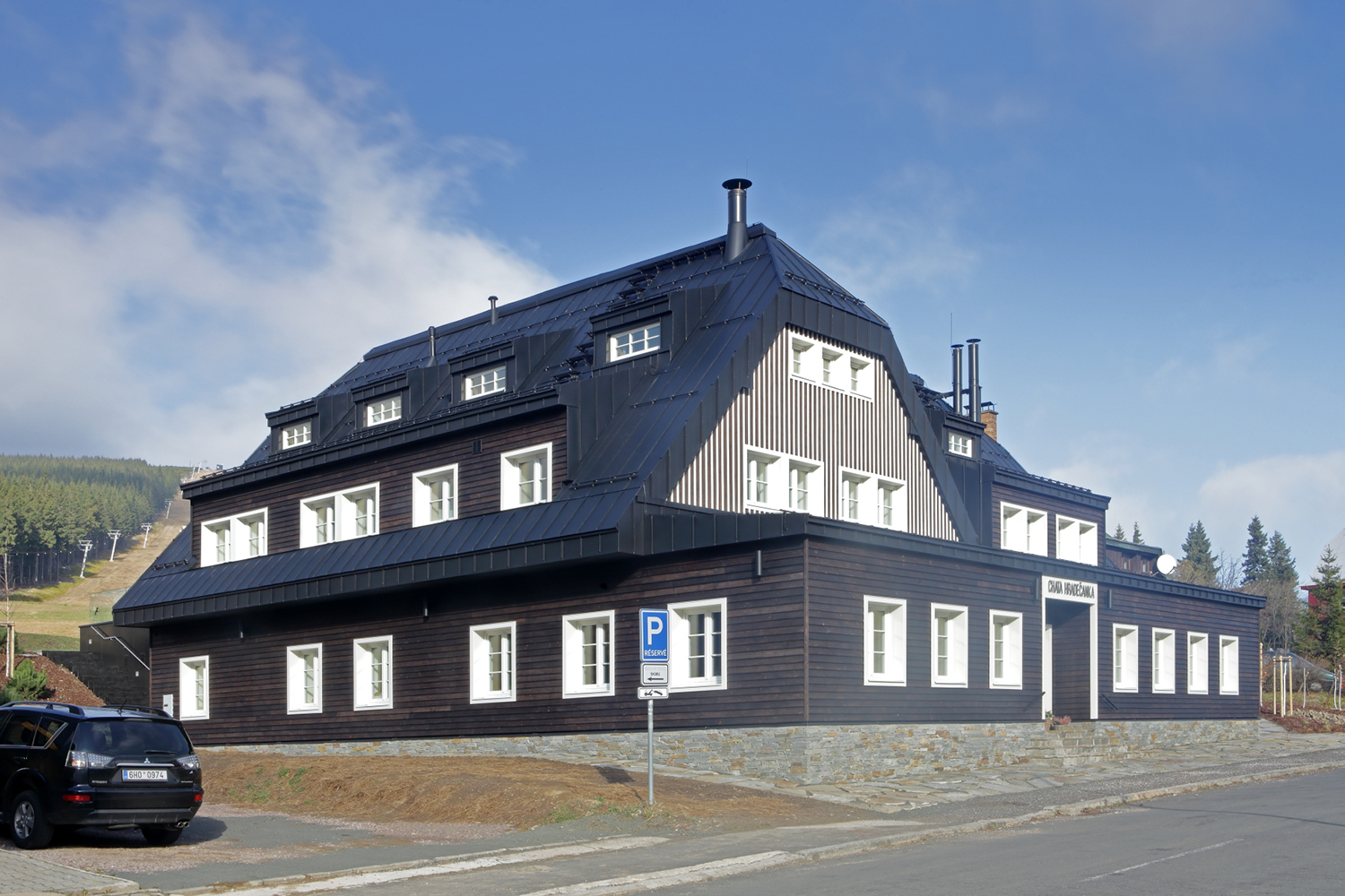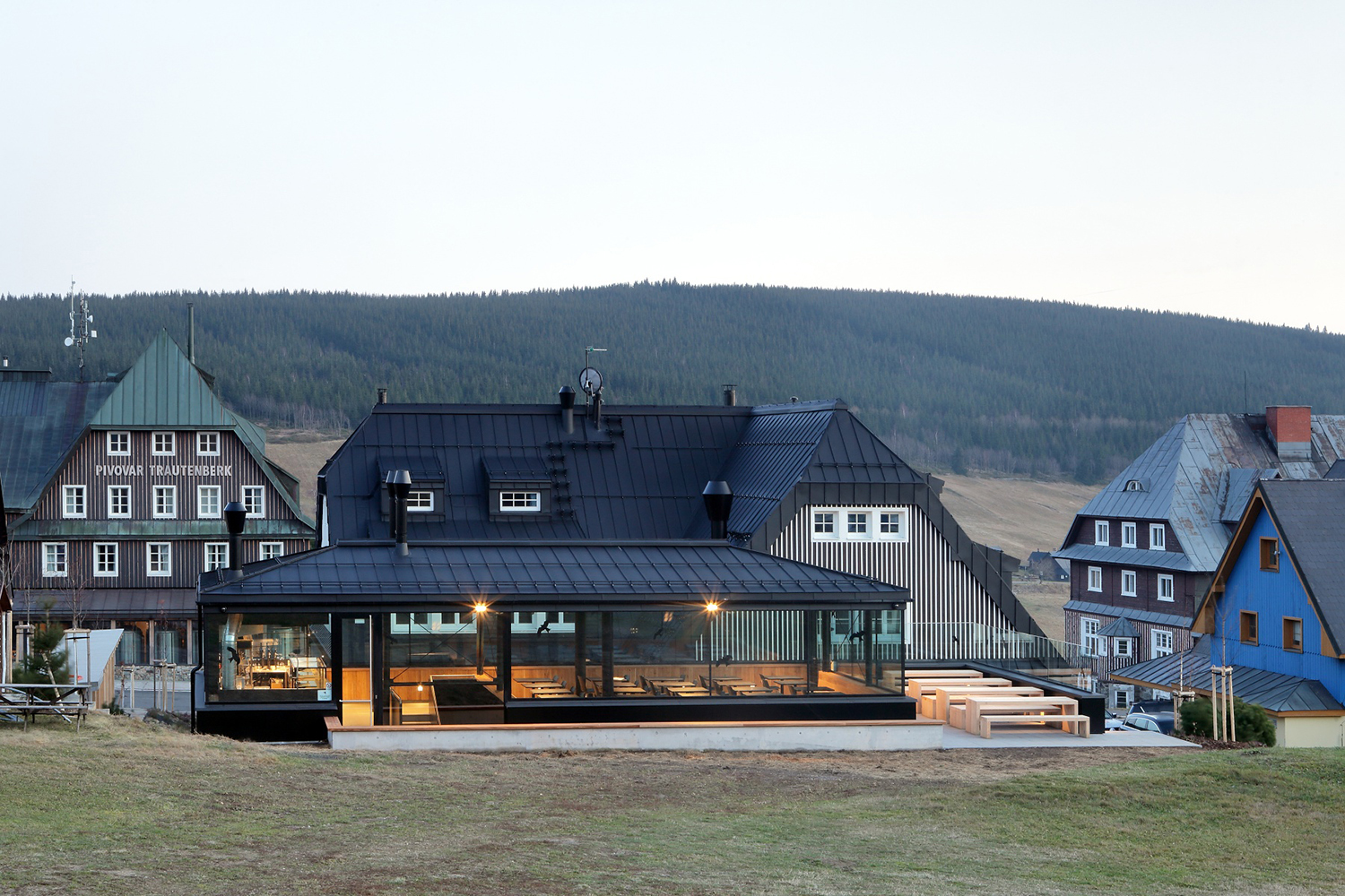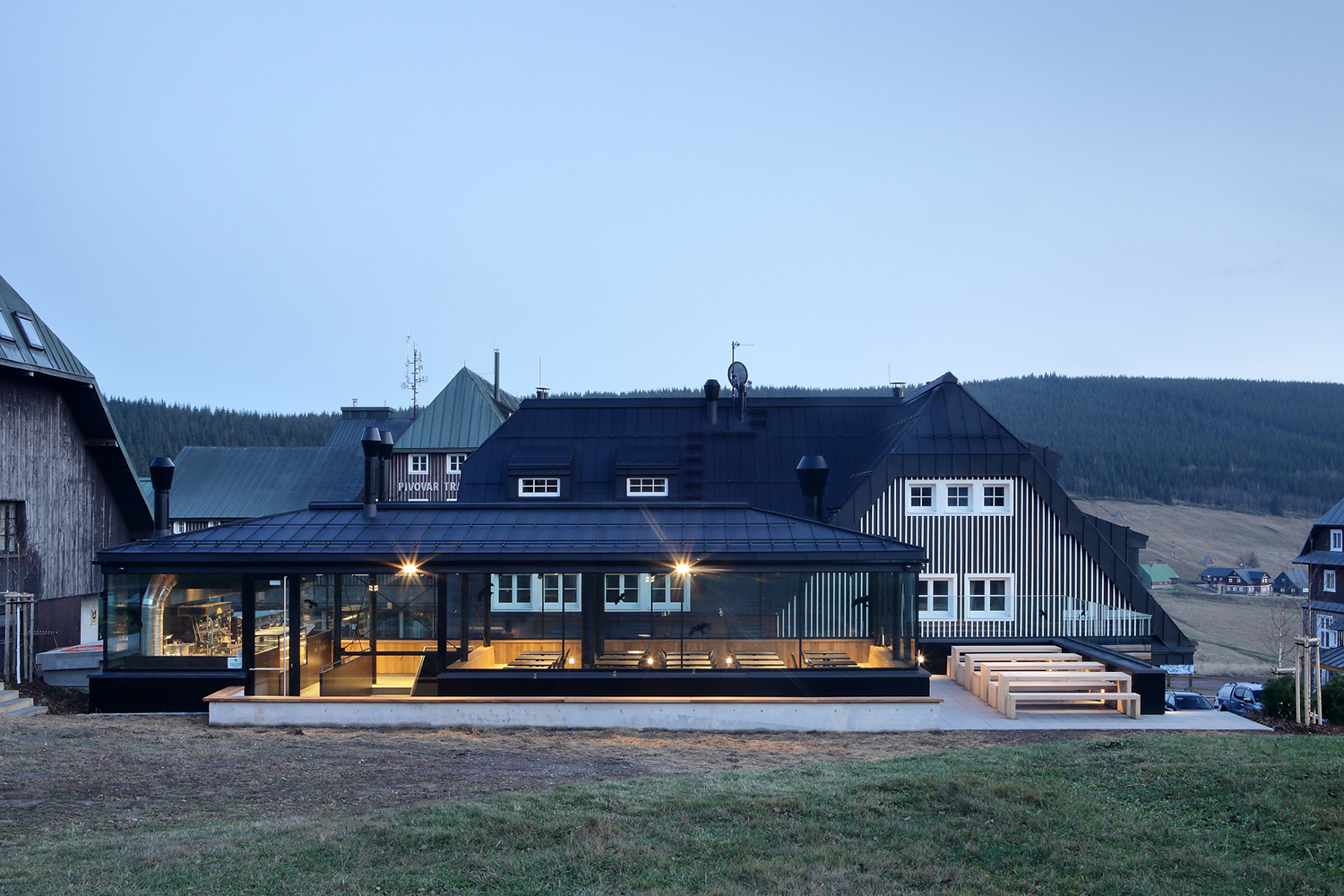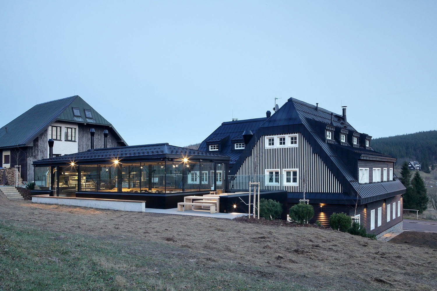 Pred časom sme predstavili Minipivovar Trautenberk v najvyššie položenej krkonošskej obci Horní Malá Úpa (1045 m n. m.). Realizácia ateliéru ADR bola ocenená titulom Finalista Českej ceny za architektúru, získala Cenu Agentúry ochrany prírody a krajiny ČR za “citlivú rekonštrukciu stavby v krajine.” Cez cestu, priamo oproti spomínanému minipivovaru bola dokončená ďalšia rekonštrukcia historického horského penziónu. Obnova sa aj tentokrát zaobišla bez výrazných zásahov do zovňajšku pôvodného objektu. Časť rozšíreného lokalitného programu našla svoje miesto v novej prístavbe, bezprostredne nadväzujúcej na svah lyžiarskeho areálu.