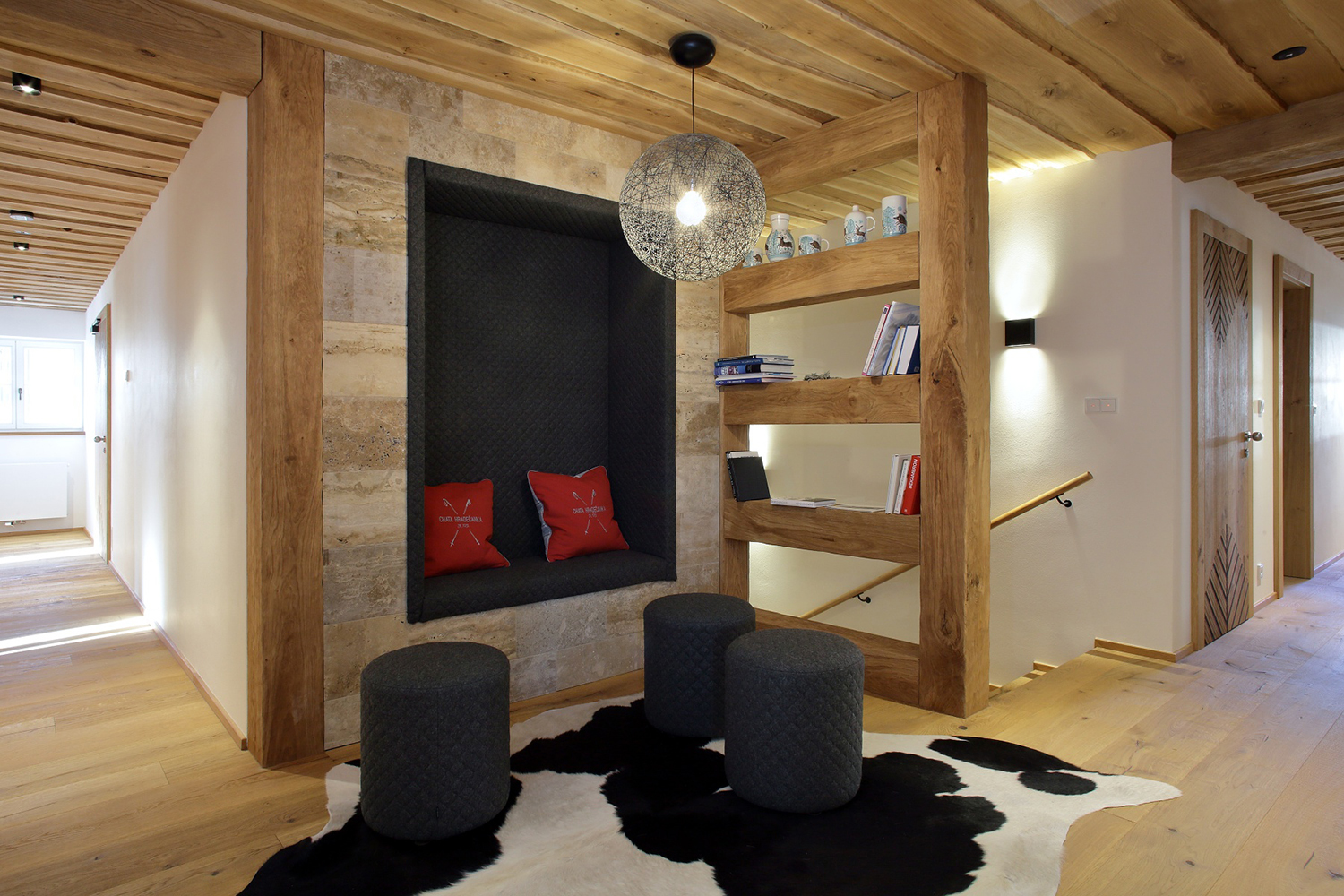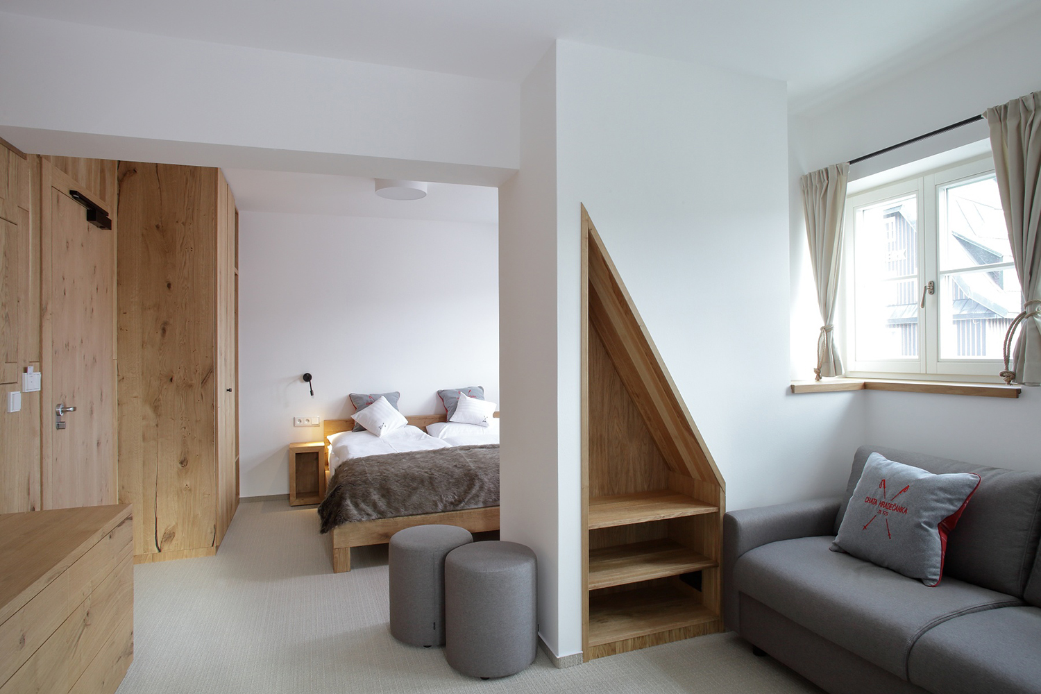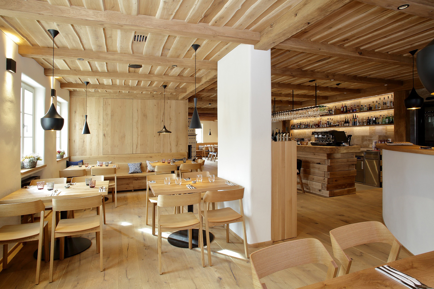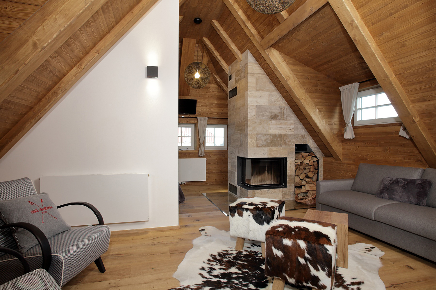 “Interiér je navržen v souladu s konceptem kontrastu dvou hmot - tradiční versus nové. V rekonstruovaném jsou použity tradiční materiály historických horských stavení. Zejména dřevo, kámen, ruční omítky, včetně dominantních kachlových kamen. Do nového se propisuje strohé řešení podtrhující celkové vyznění domu,” približuje koncept Luděk Rýzner. Priestory sú súčasne previazané zhodnými materiálmi, ktoré sa však odlišujú rozdielnym spracovaním či povrchovou úpravou. Napríklad pôvodná fasáda z opaľovaného dreva je parafrázovaná v podhľade aprés-ski baru.