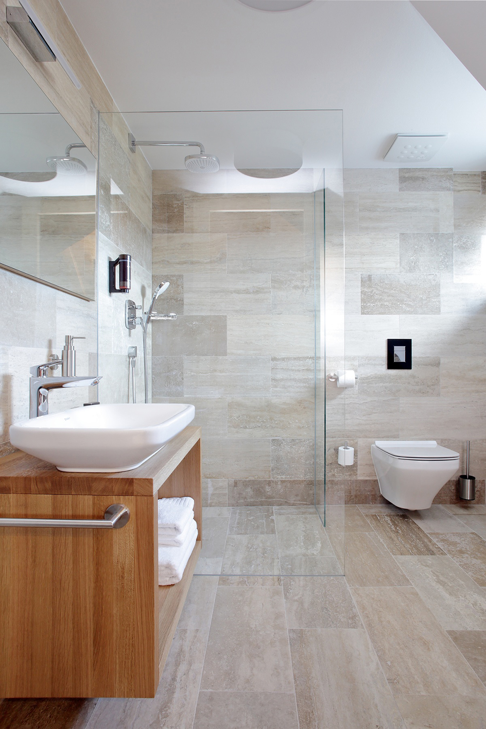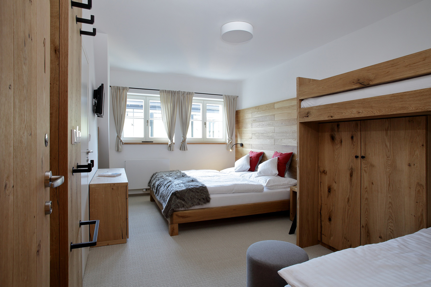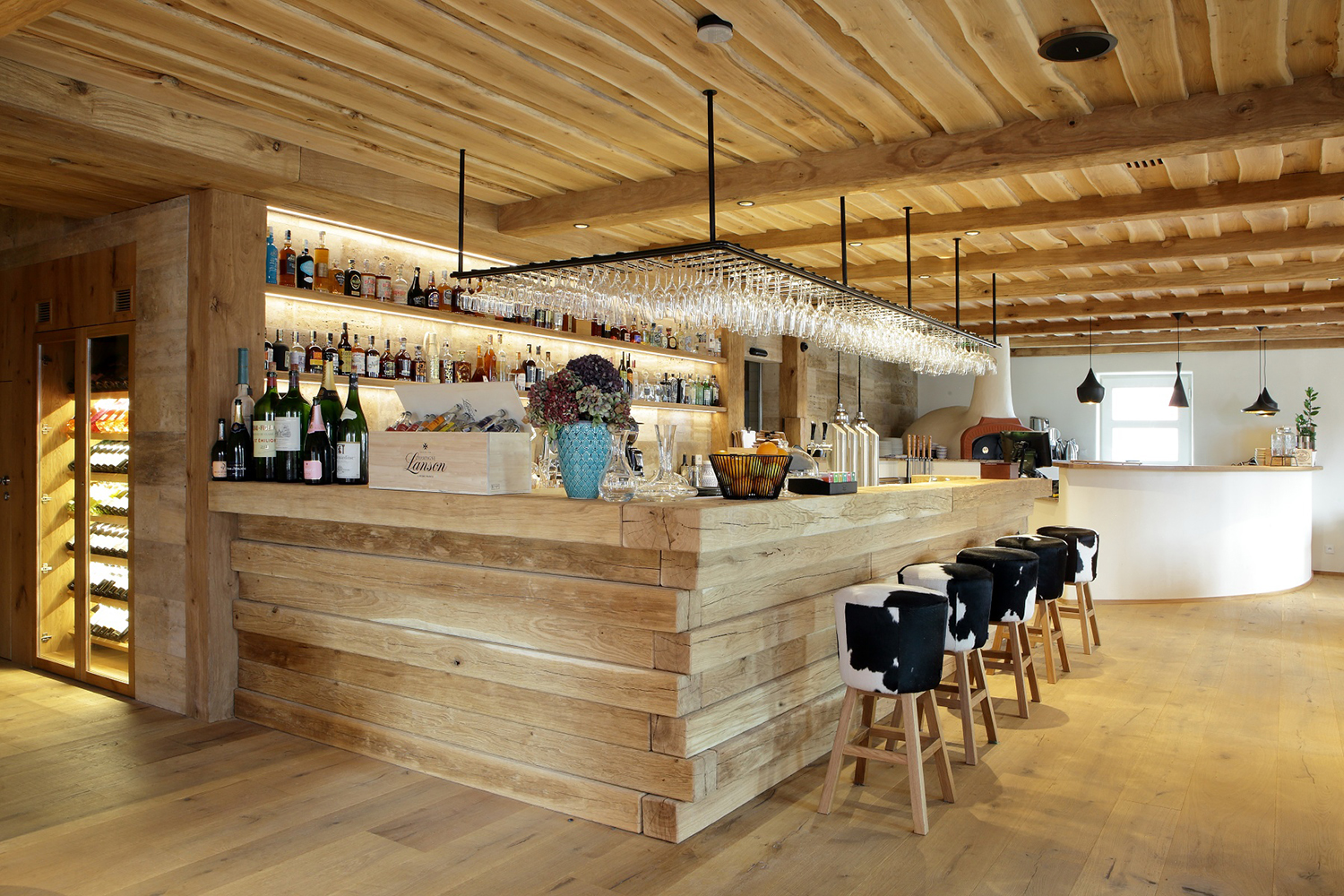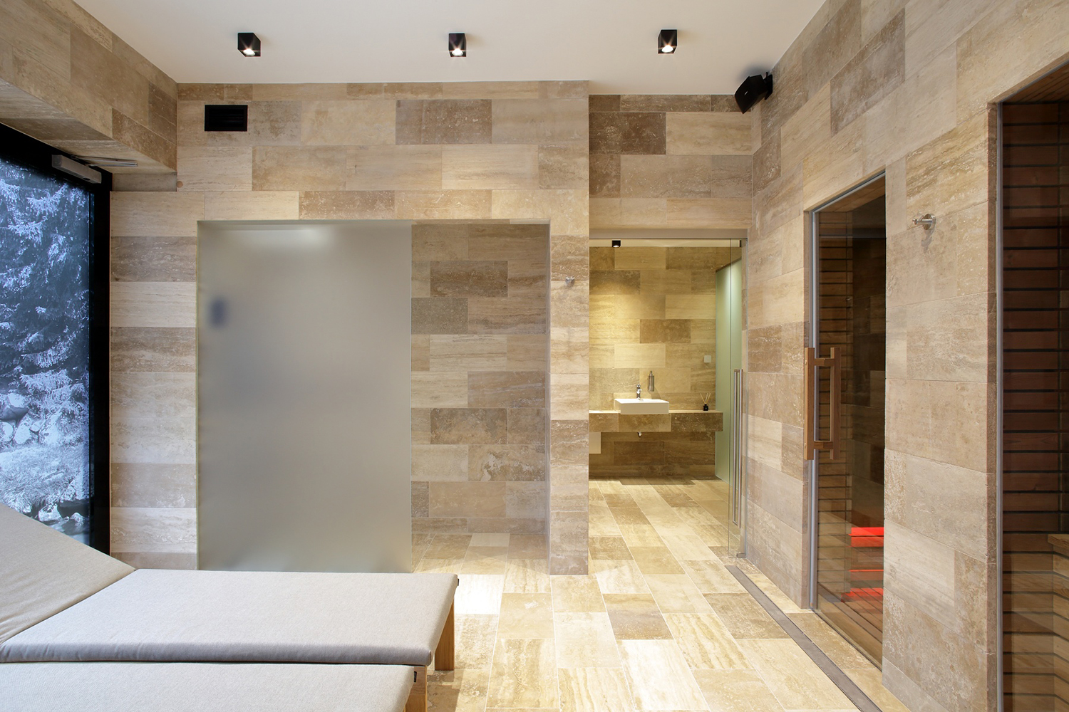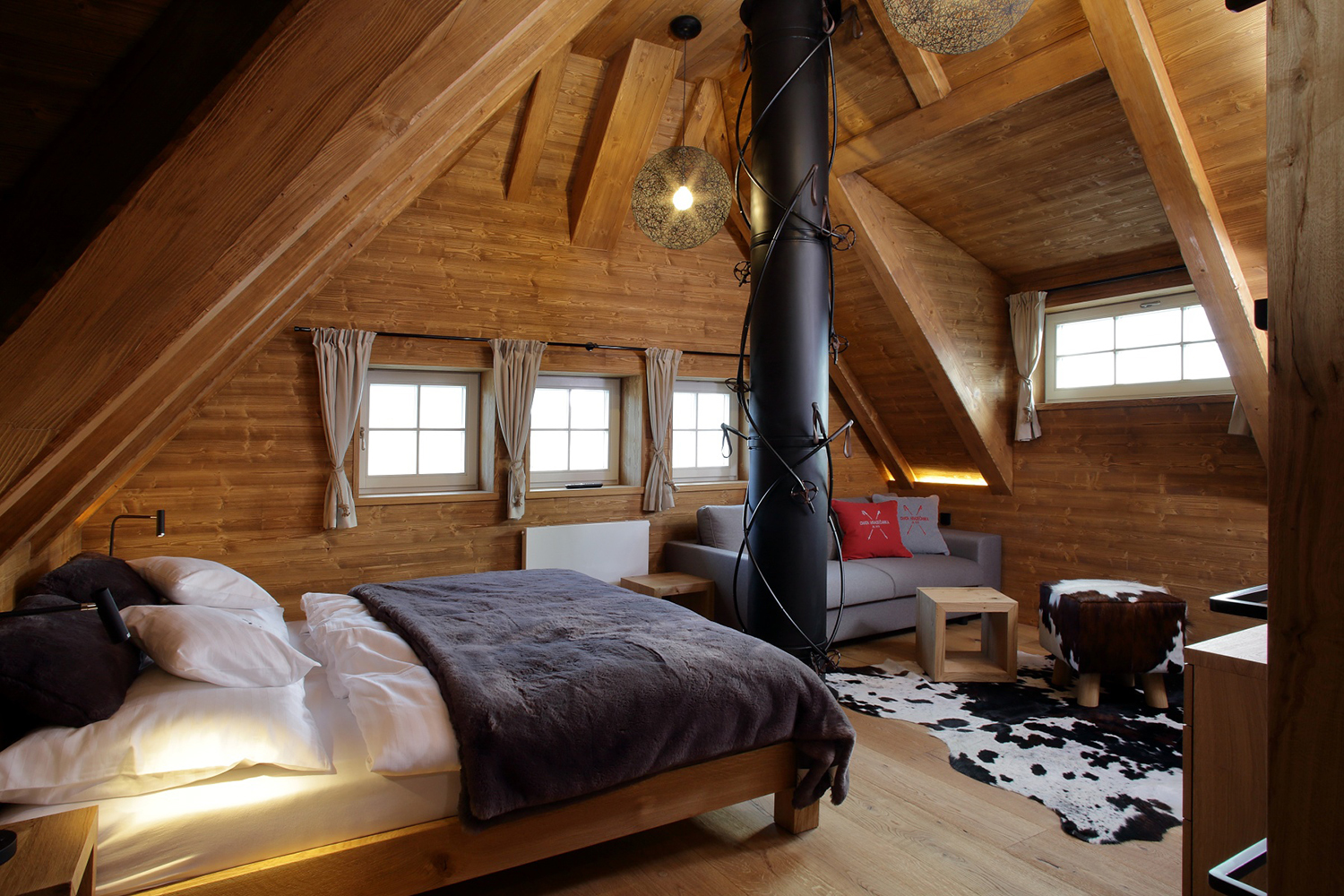 “Interiér je navržen v souladu s konceptem kontrastu dvou hmot - tradiční versus nové. V rekonstruovaném jsou použity tradiční materiály historických horských stavení. Zejména dřevo, kámen, ruční omítky, včetně dominantních kachlových kamen. Do nového se propisuje strohé řešení podtrhující celkové vyznění domu,” približuje koncept Luděk Rýzner. Priestory sú súčasne previazané zhodnými materiálmi, ktoré sa však odlišujú rozdielnym spracovaním či povrchovou úpravou. Napríklad pôvodná fasáda z opaľovaného dreva je parafrázovaná v podhľade aprés-ski baru.