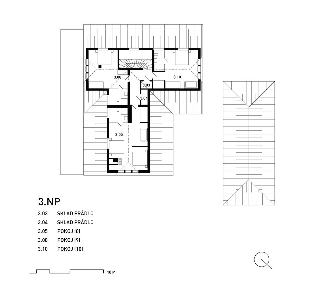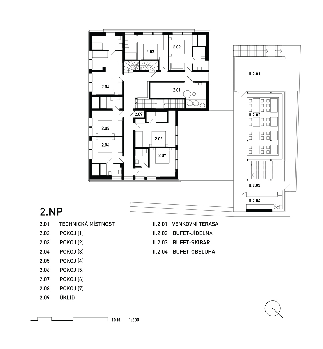 Nový objekt je s pôvodným penziónom prepojený na úrovni prvého nadzemného podlažia. Vznikajú tak dve malé átriá.