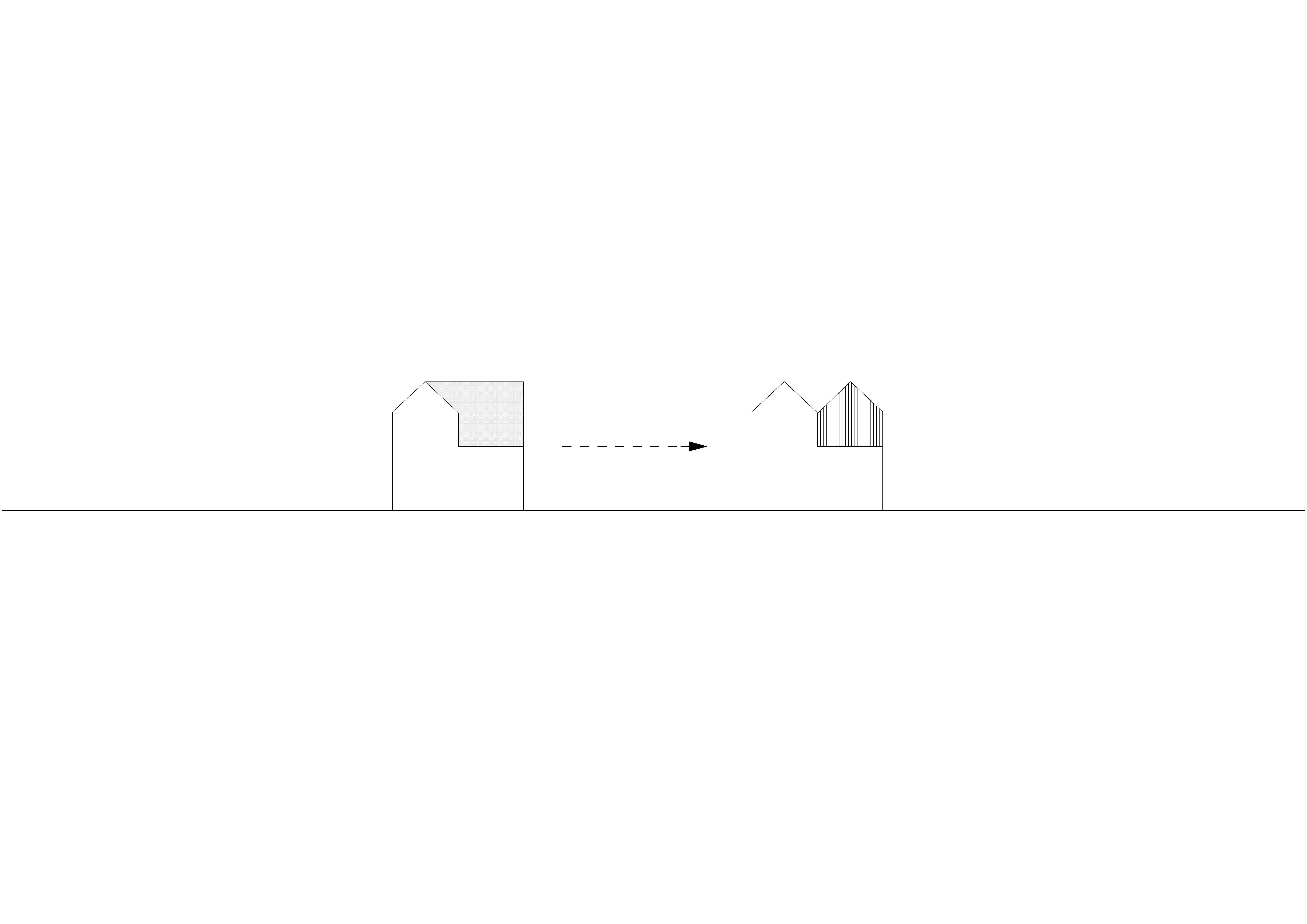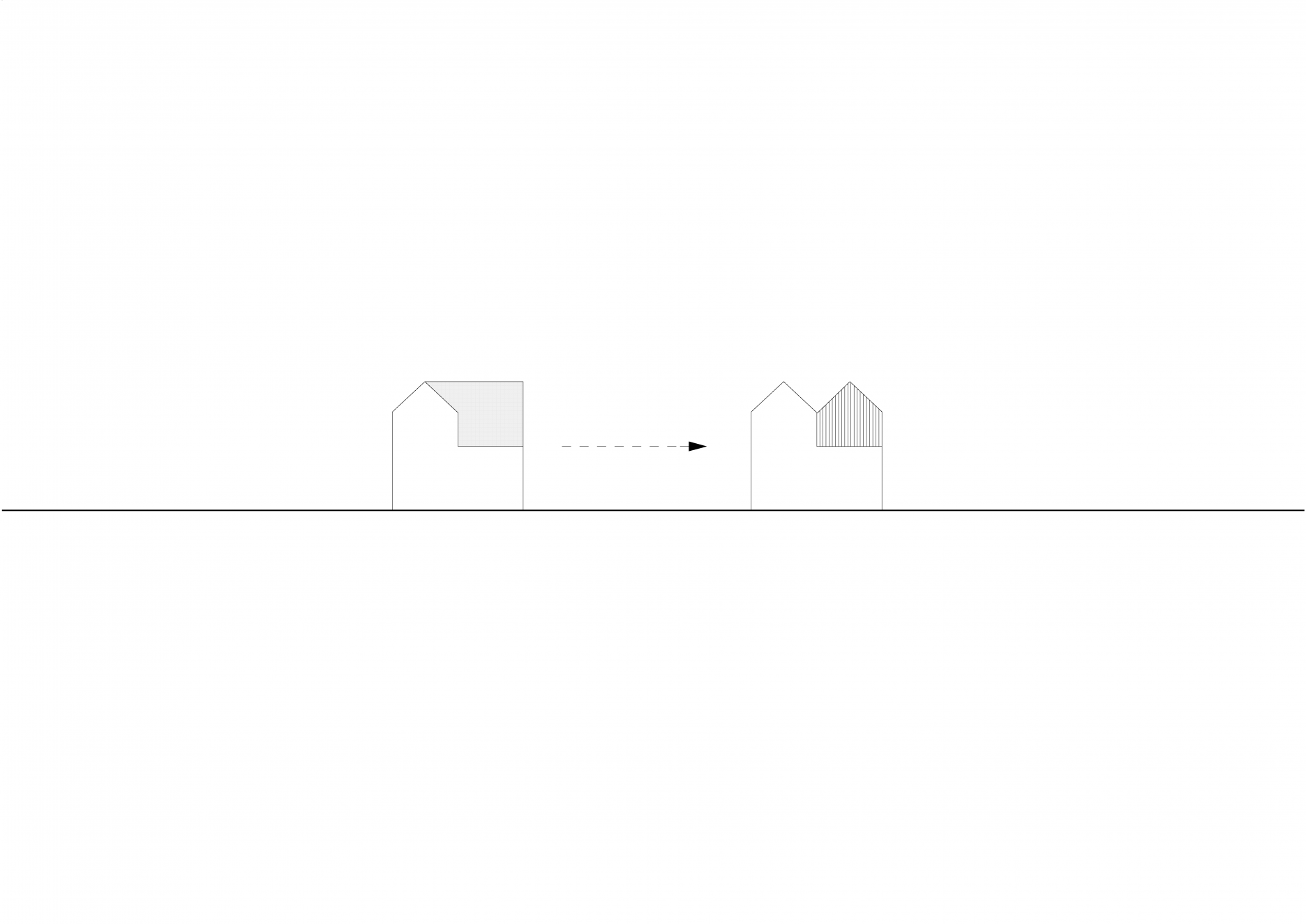 Návrh reaguje na potreby a požiadavky klientov, pričom sa snaží zbytočne nezväčšovať pôvodný objem stavby. Architekti vstúpili do projektu súčasnou vrstvou ktorá pracuje s archetypálnymi prvkami štítov a sedlových striech. “Nový tvar pak nabízí, jak zajímavý a uměřený exteriér, tak prostorově různorodý a velkorysý interiér, který pracuje s různými výškovými úrovněmi dřevěnými mezipatry a otevřením do krovu,” dopĺňajú autori.