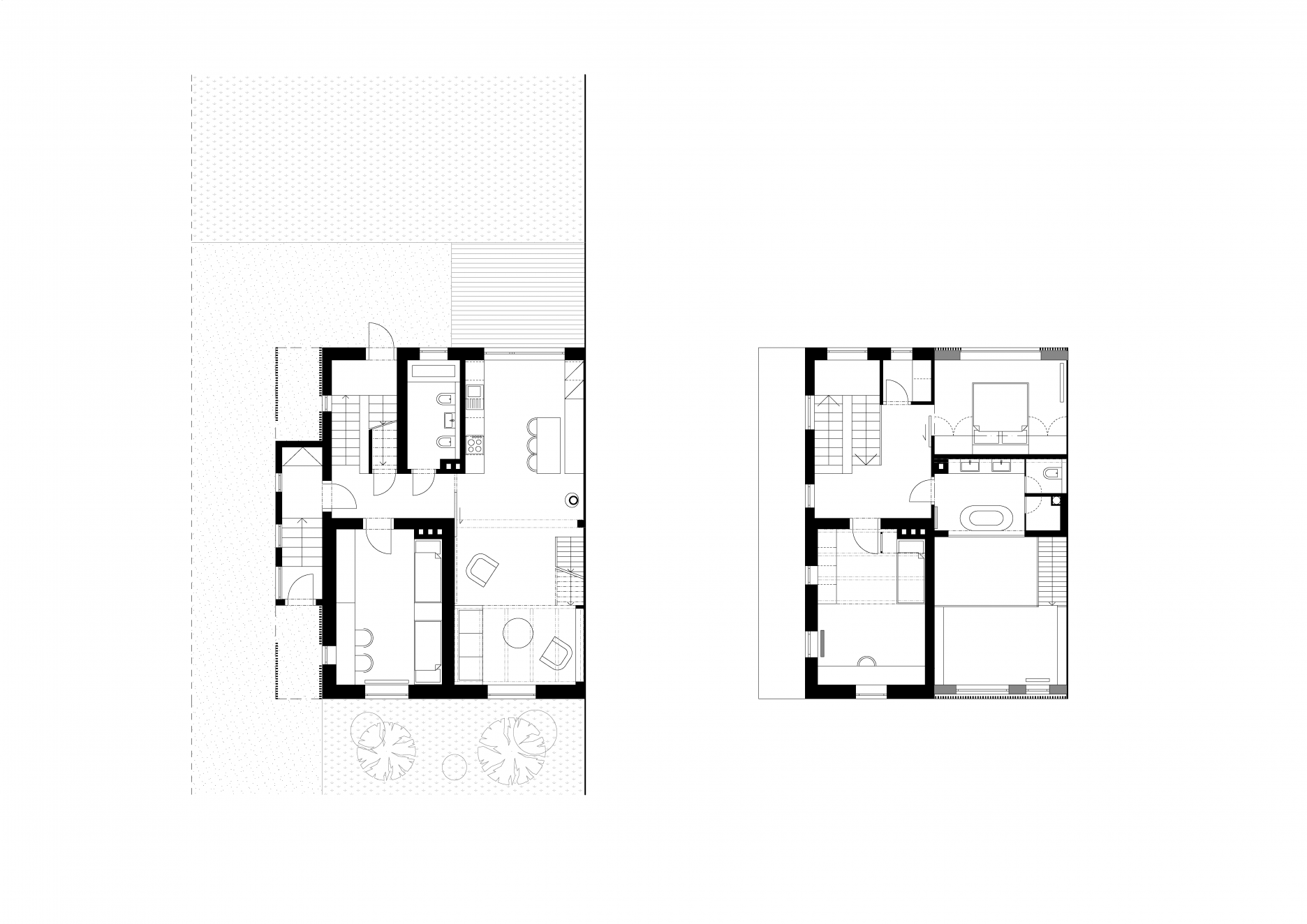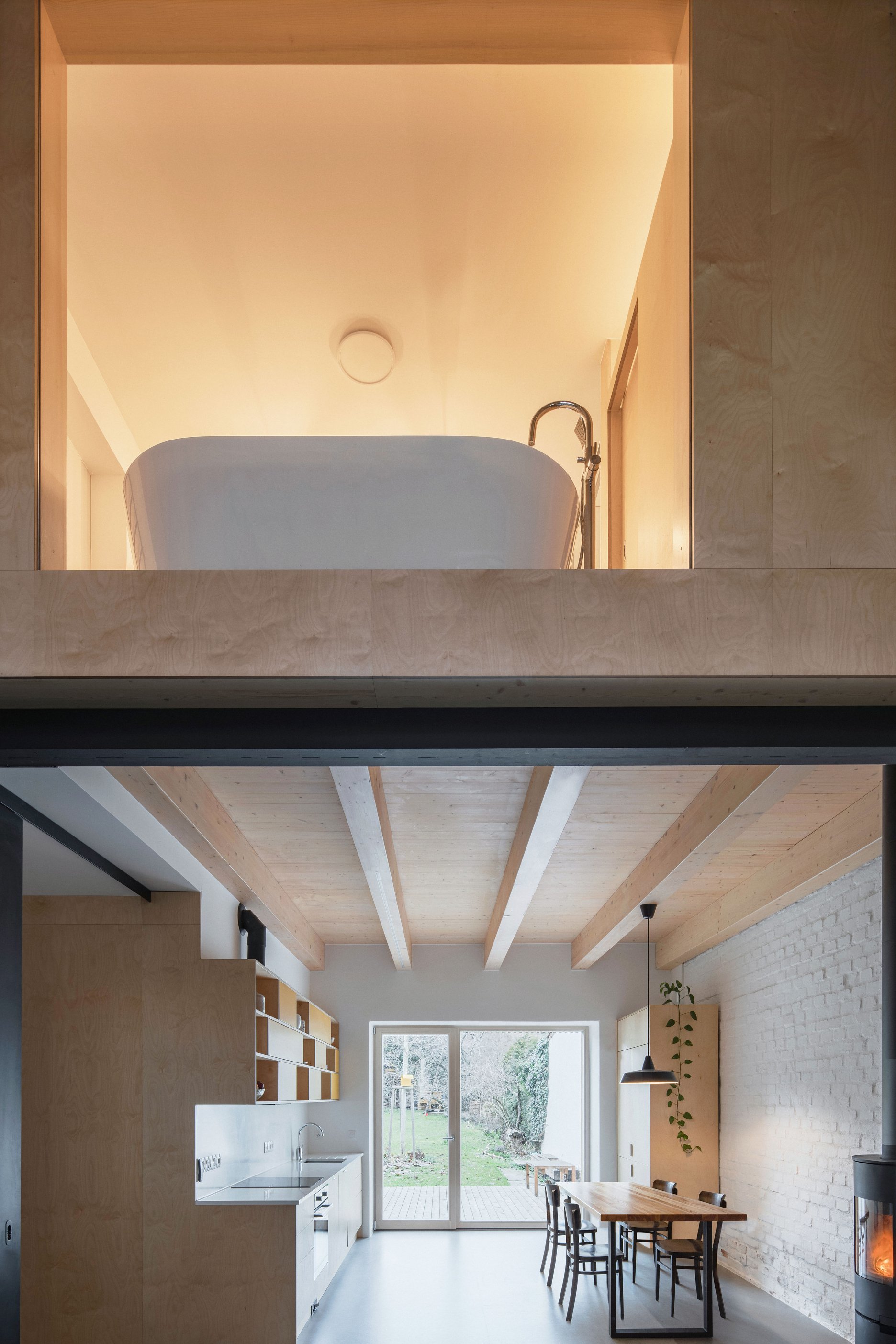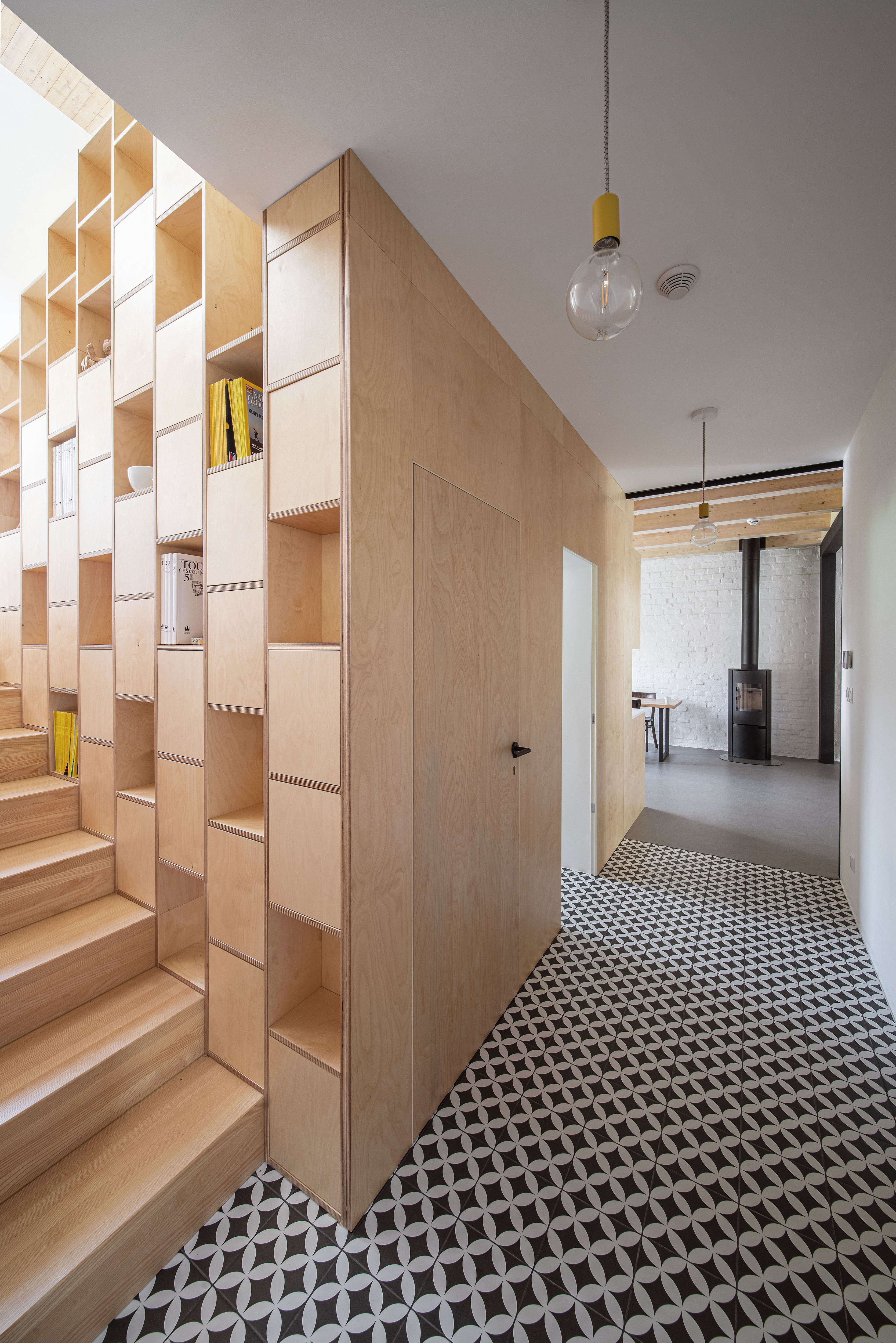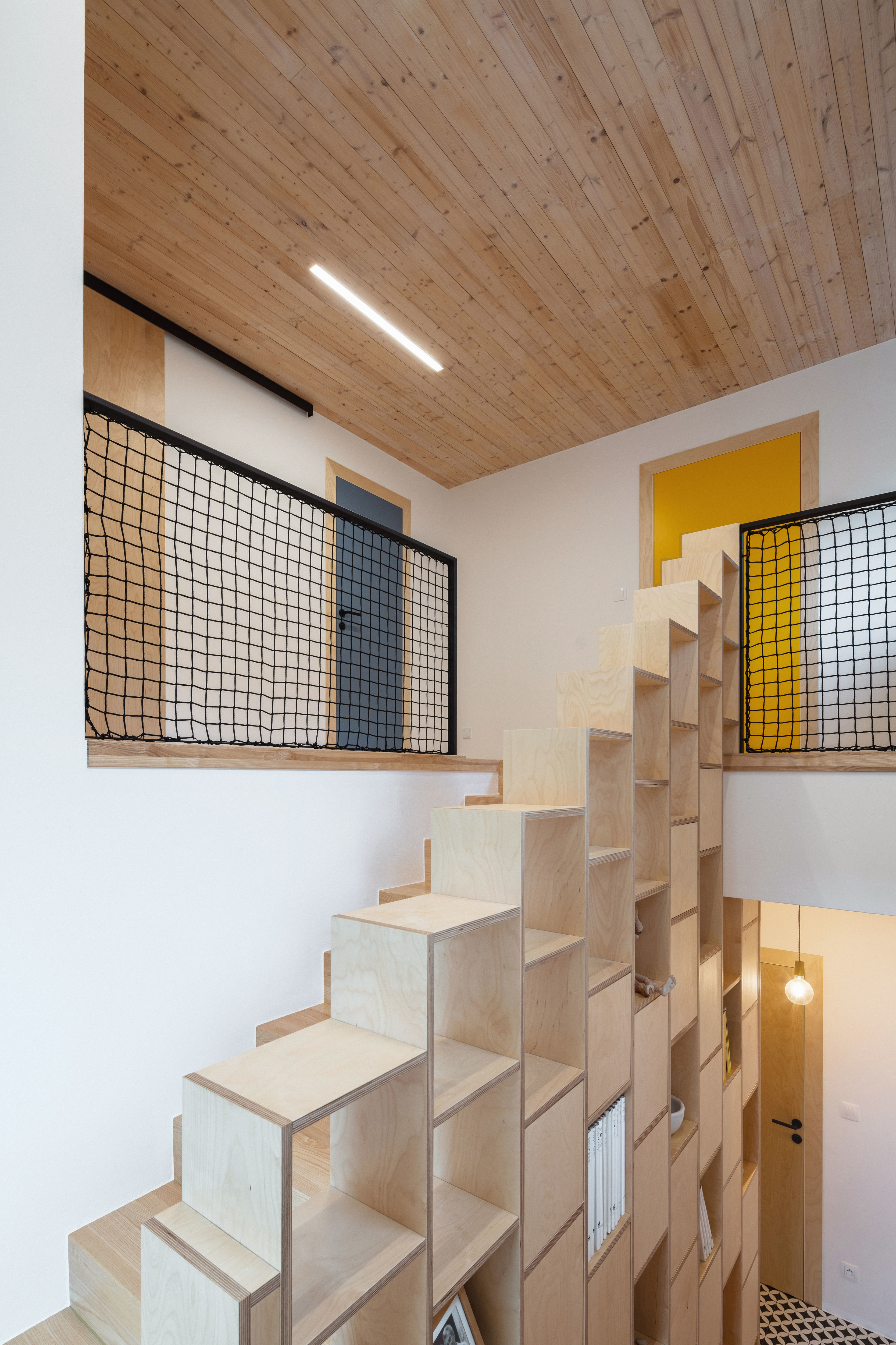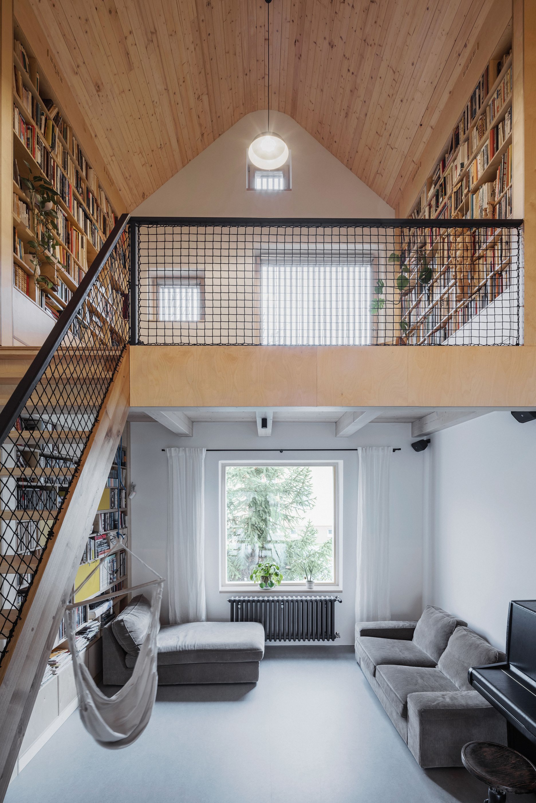 Na prízemí sa nachádza jedna detská izba, kúpeľňa a obývacia izba prepojená so záhradou, ktorá vznikla prepojením dvoch miestností. Priestor, otvorený cez dve podlažia zahŕňa tiež knižnicu s čitárňou. Priestorové prepojenie umožňuje presvetlenie kúpeľne na poschodí. O úroveň vyššie situovali architekti rodičovskú spálňu a druhú detskú izbu s využiteľnou plochou medziposchodia.