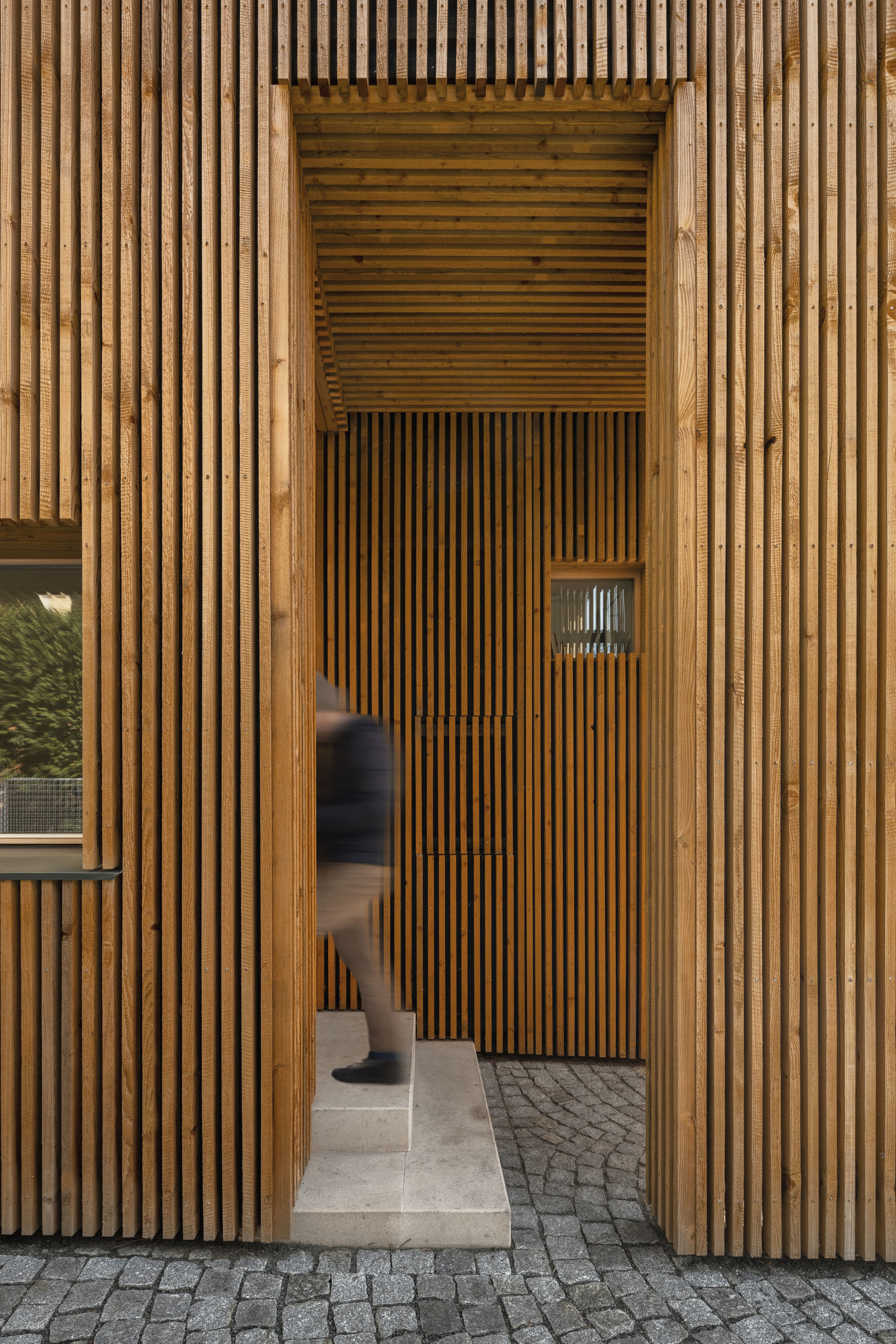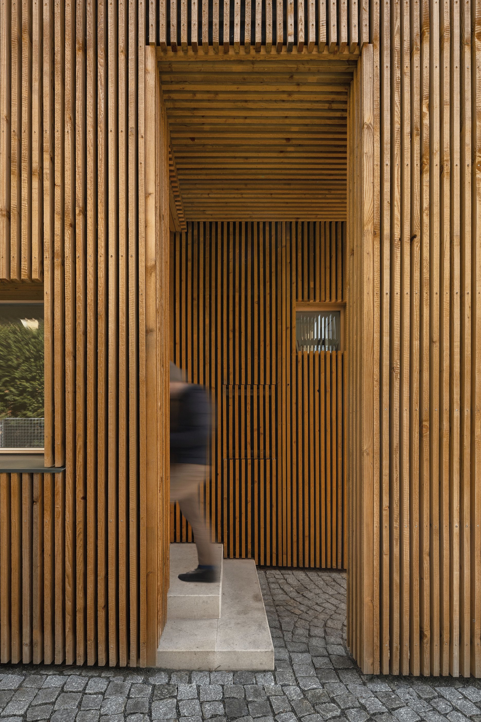 Členenie uličnej fasády aj pôvodné šambrány architekti hrdo zachovávajú a prezentujú. Nové plochy zasklenia však tvoria jednoliate fixné alebo otváravé výplne. Pristavaný štít, smerujúci do dvora, charakterizuje fasáda z vertikálnych drevených lát. Rovnaký obklad použili autori aj na zádverí, ktoré nahradilo pôvodný prístavok.