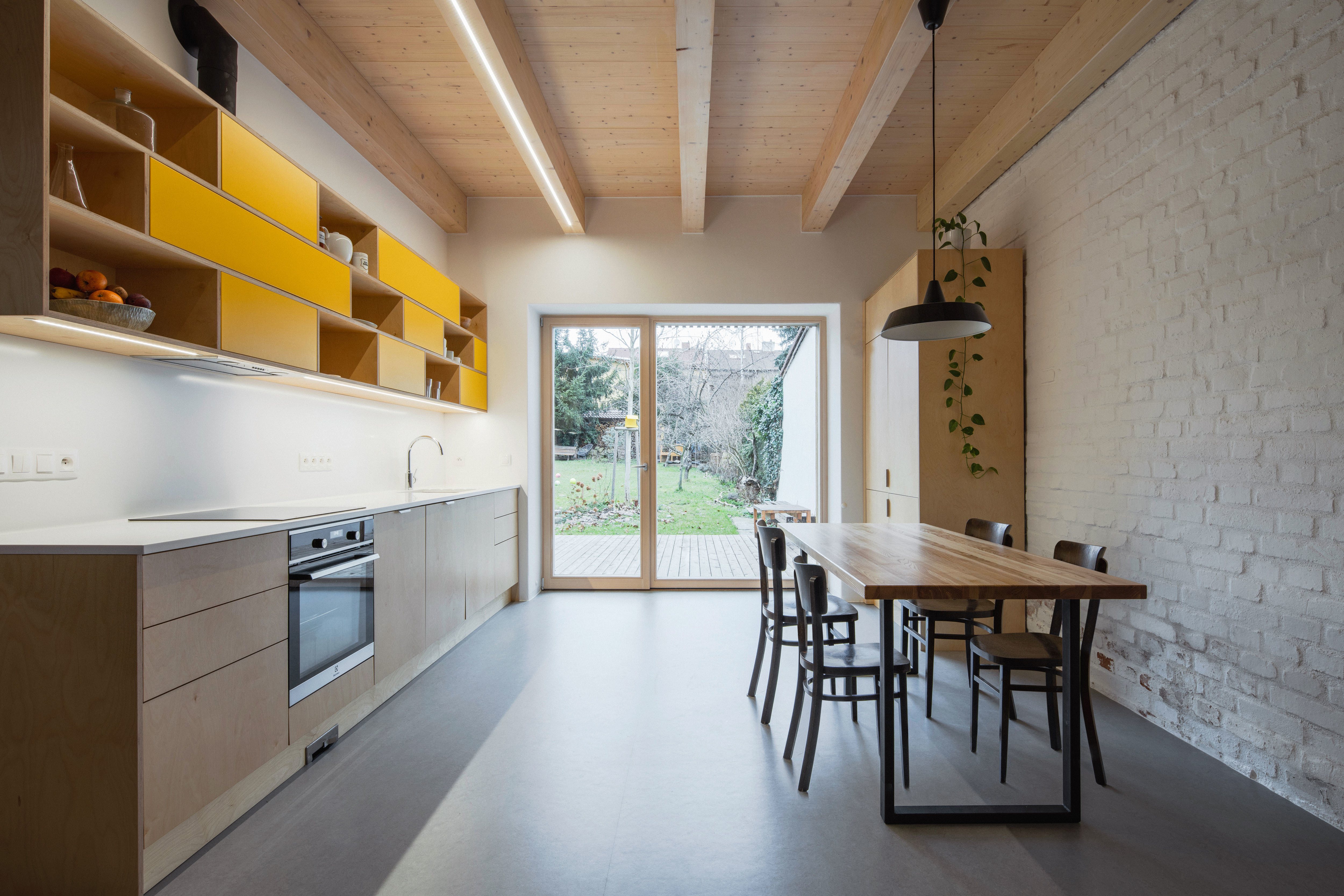 “Při rekonstrukci řadového rodinného domu v Plzni jsme se snažili přinést novou prostorovou kvalitu při respektování měřítka stávající zástavby. Staré prvky jsme očistili a zachovali, u nových prvků jsme přiznali soudobý výraz,” vysvetľujú svoj prístup architekti.