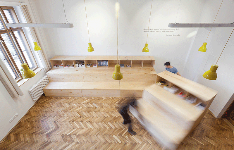 Dôležitým prvkom v priestore knižnice je mobilné pobytové schodisko, ktoré má vo svojich stupňoch zabudovaný úložný priestor pre stoly a stoličky. Stupne sú konštrukčne rozdelené na 4 pohyblivé segmenty. Spolu s pracovnými stolmi vytvára miesto pre prácu a oddych študentov, ktorí si môžu vybrať, aký spôsob sedenia im práve vyhovuje. Schody sa stávajú neformálnou čitárňou, zabezpečujú veľkú variabilitu priestoru.