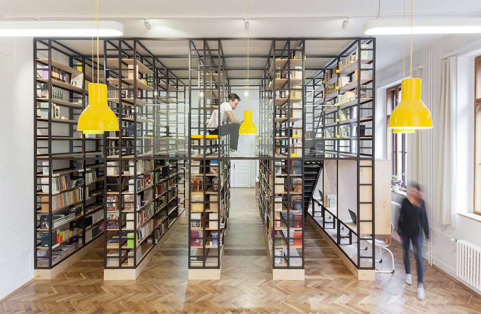 Prístup do vrchného poschodia knižnice je zaistený dvoma schodiskami, ktoré sú súčasťou konštrukcie. Celá knižnica sa tak stáva prístupnou (a priechodnou) nielen pre knihovníka, ale aj pre študentov. Dostatok svetla medzi modulmi zabezpečuje transparentná podlaha z bezpečnostného skla.