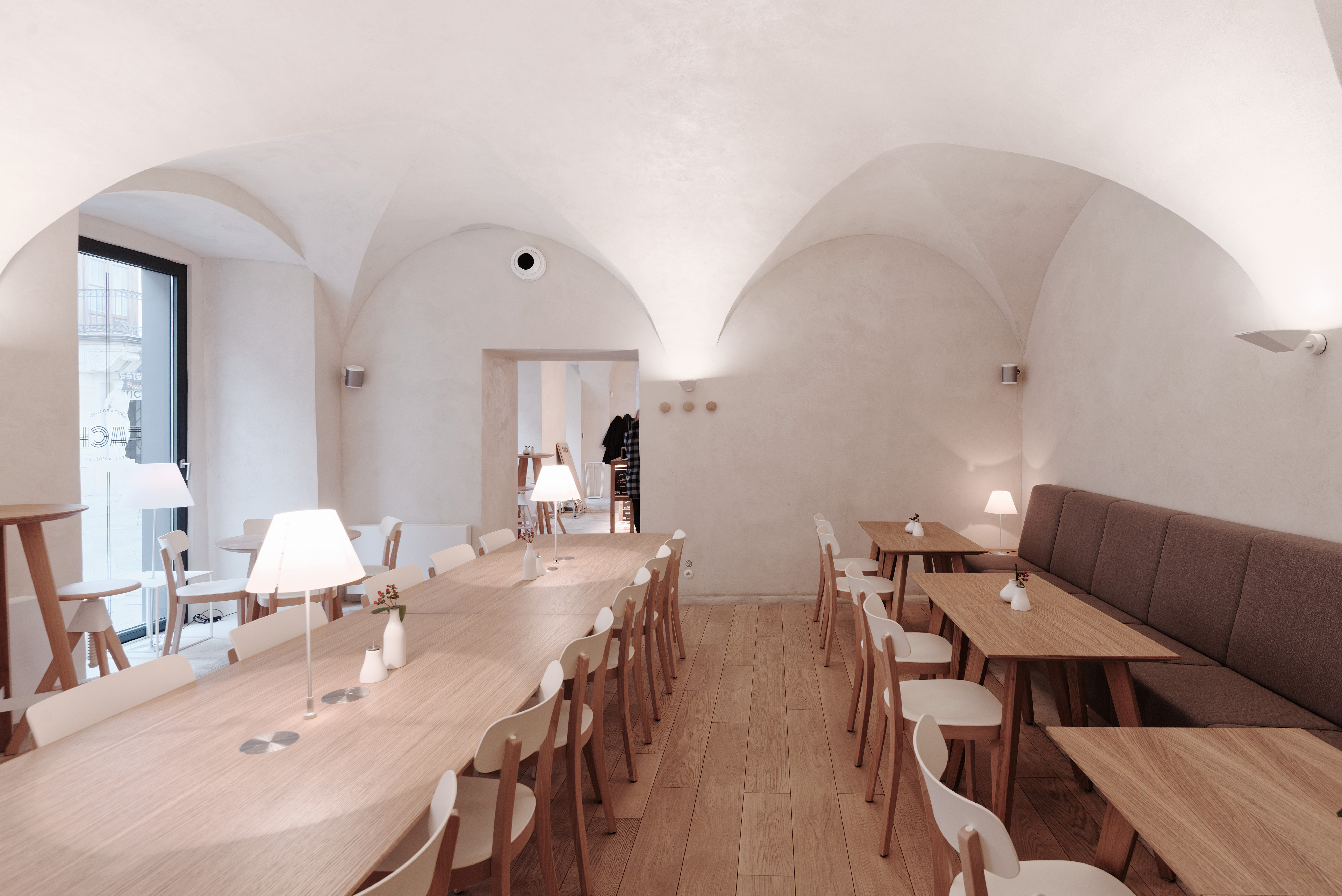 Atypické prvky zabudovaného nábytku a stolov sa doplnili sedacím nábytkom a svietidlami s dôrazom na udržanie celistvosti materiálového a farebného konceptu. Keďže názov Fach odkazuje na remeslo majstrov vznikla požiadavka na odraz tohto názvu vo výrazových prostriedkoch interiéru.