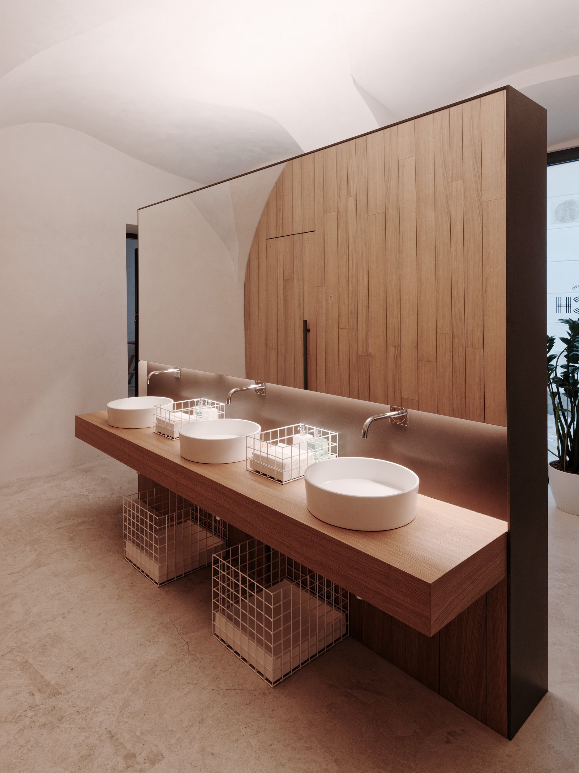 Do takto vytvoreného sceľujúceho backgroundu potom vstupujú viac-menej solitérne prvky zabudovaných nábytkov a mobiliáru. Tie sú v jednotlivých prevádzkach materiálovo resp. farebne odlíšené, aby dávali jednotlivým častiam určujúcu tvár. Prevádzka Juice shopu bola doplnená bieleným drevom, aby vynikla farebnosť produktov, ovocia a zeleniny. Kaviarenská prevádzka Bread and coffee bola postavená na prírodnej farbe dubu ako charakteristické pozadie pre výrobky domácej pekárne Fachu. Bar a reštaurácia boli najprv navrhované v tmavom dymovom vyhotovení dubovej dyhy. S postupným vývojom konceptu bolo drevo v bare a reštaurácii nahradené patinovanou oceľou.